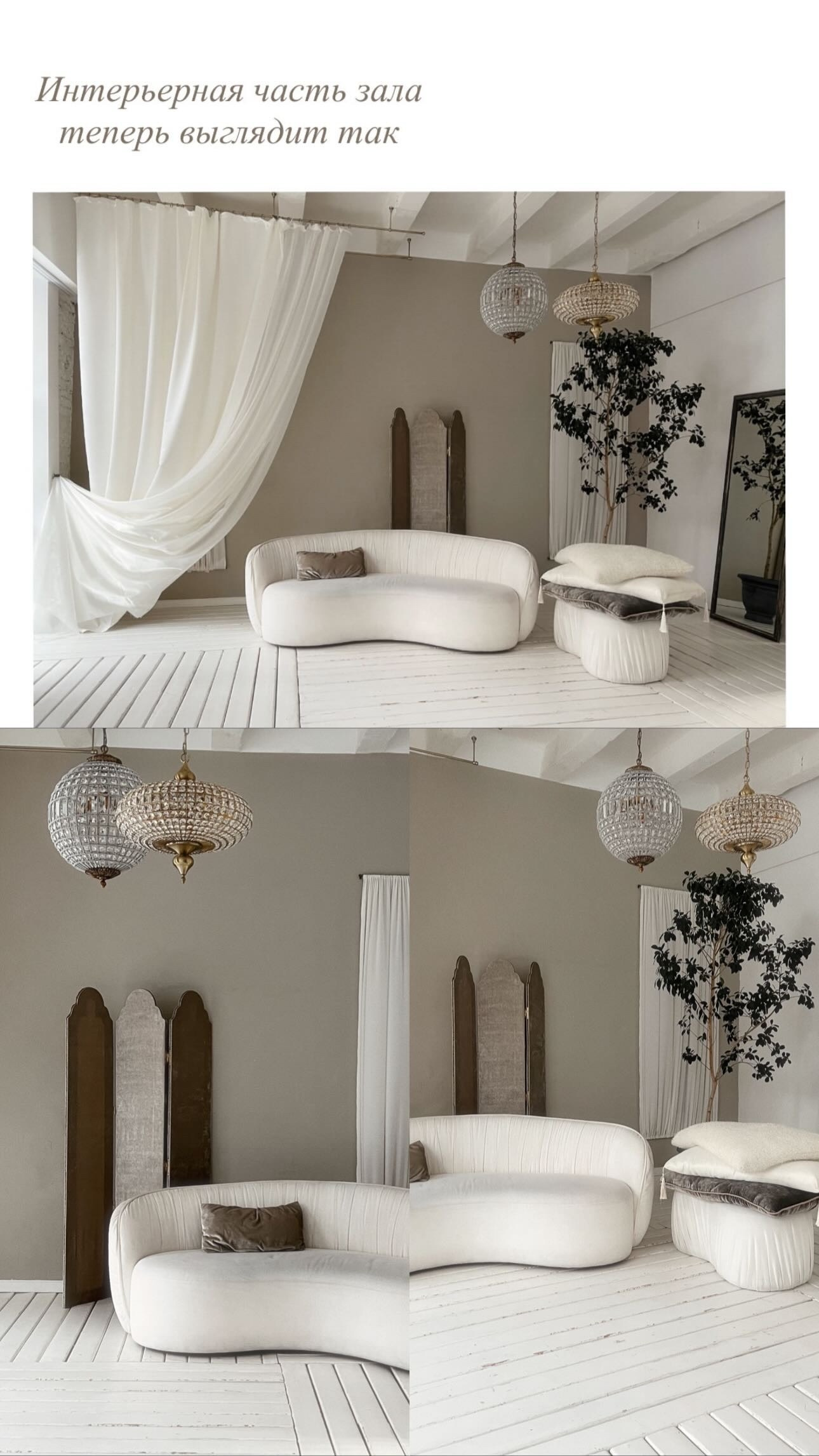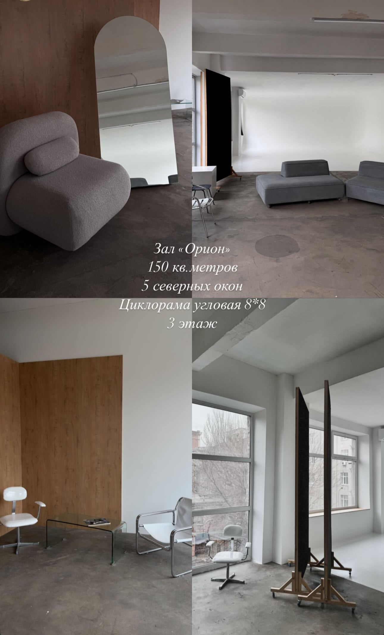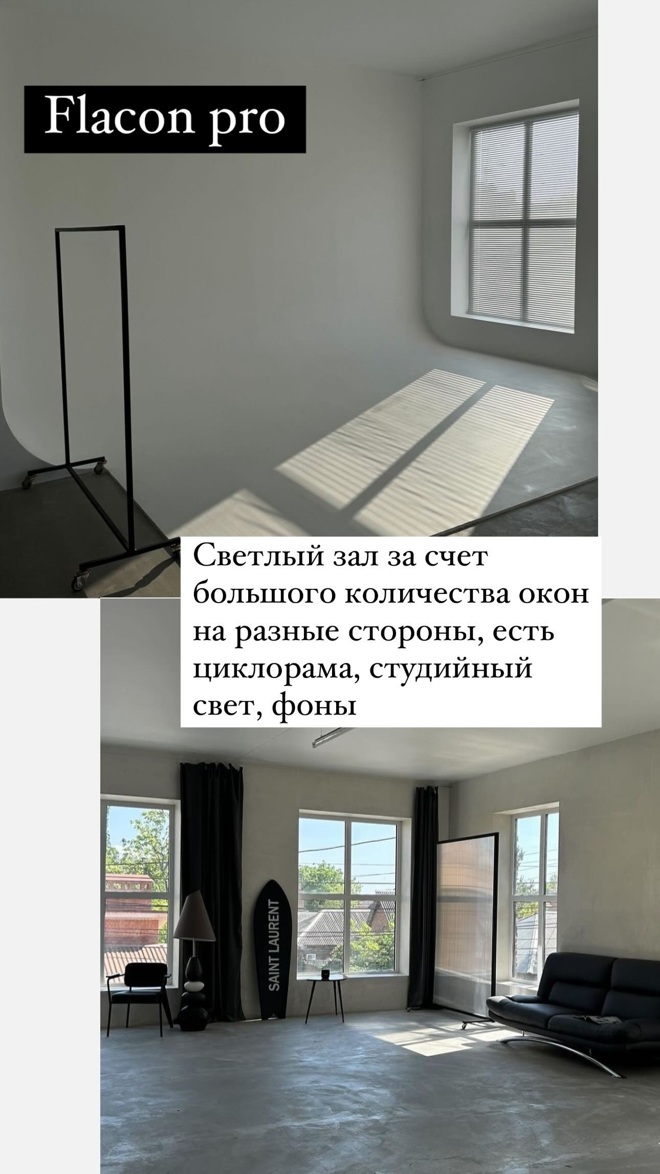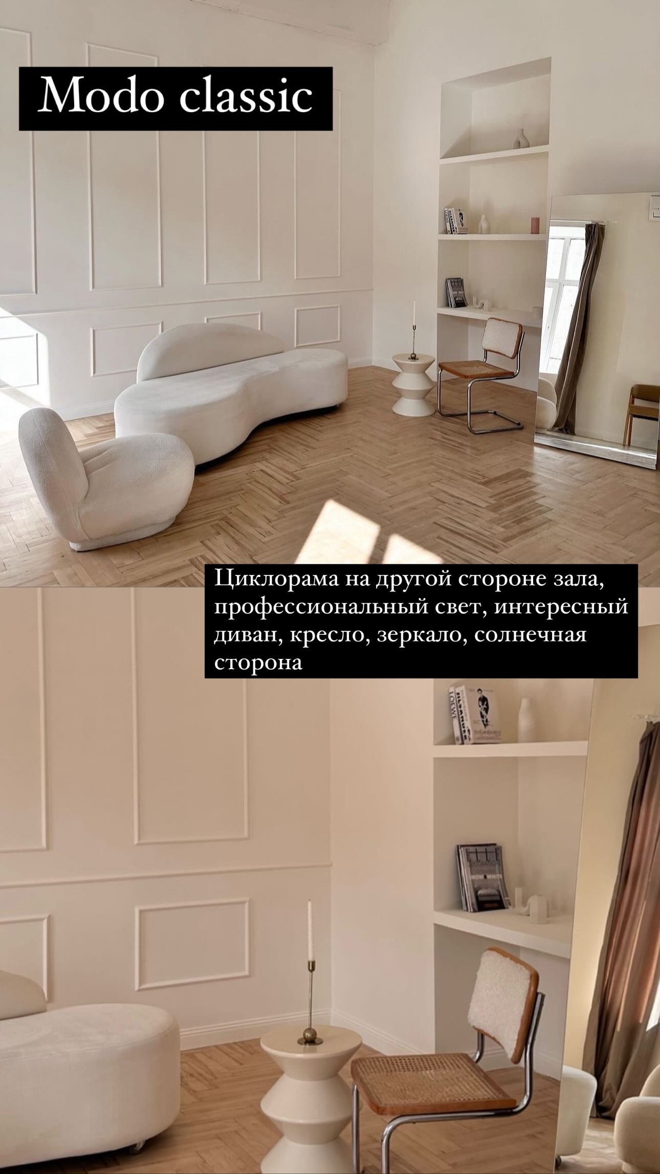 Чаще всего я работаю в этих залах. Циклорама это белая стена с изгибом, которая переходит в пол. За счет профессионального света она может быть белой, серой, а также с лучом. При выборе студии обратите вниманиие на мебель и стены в интерьерной зоне