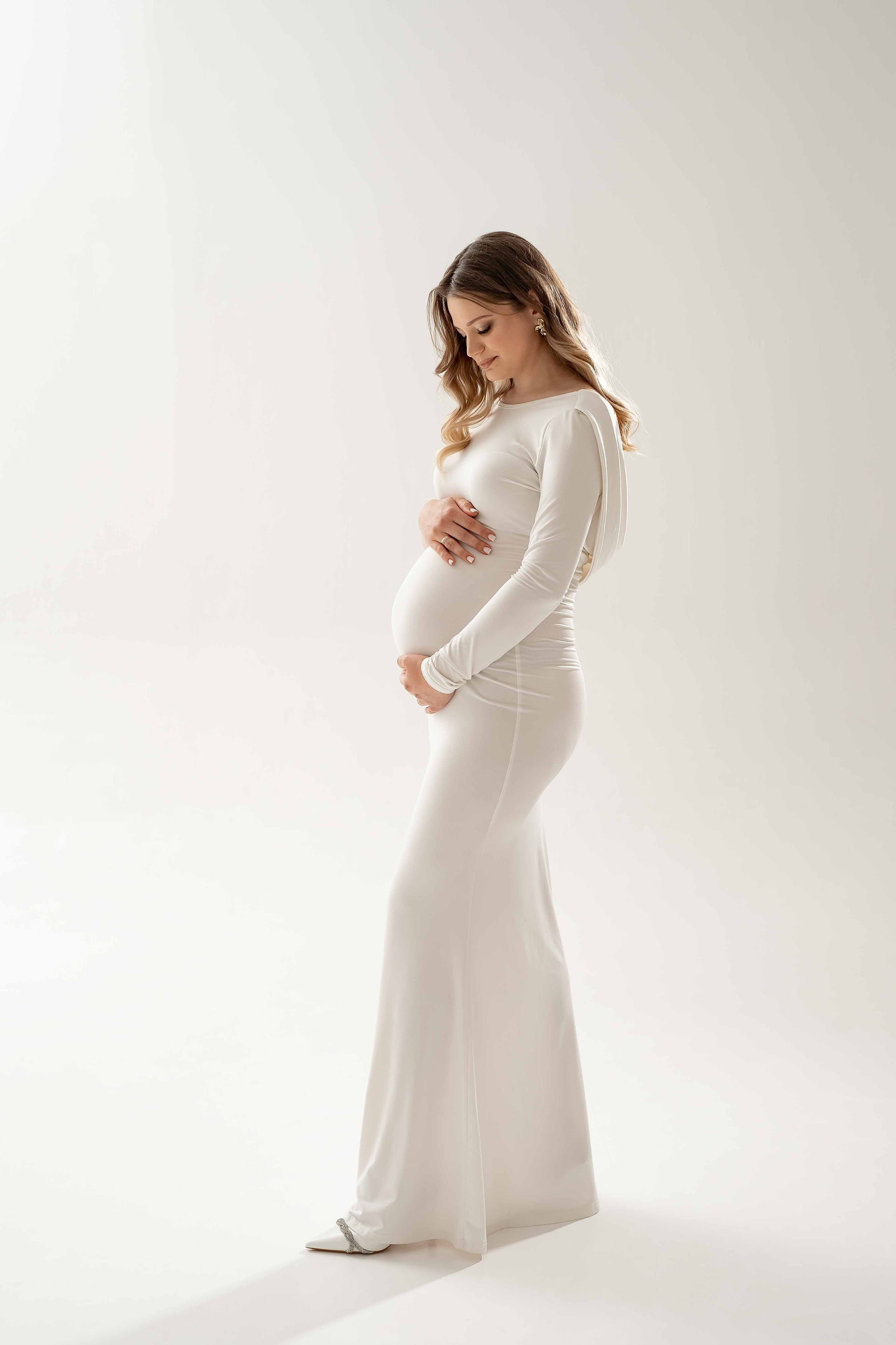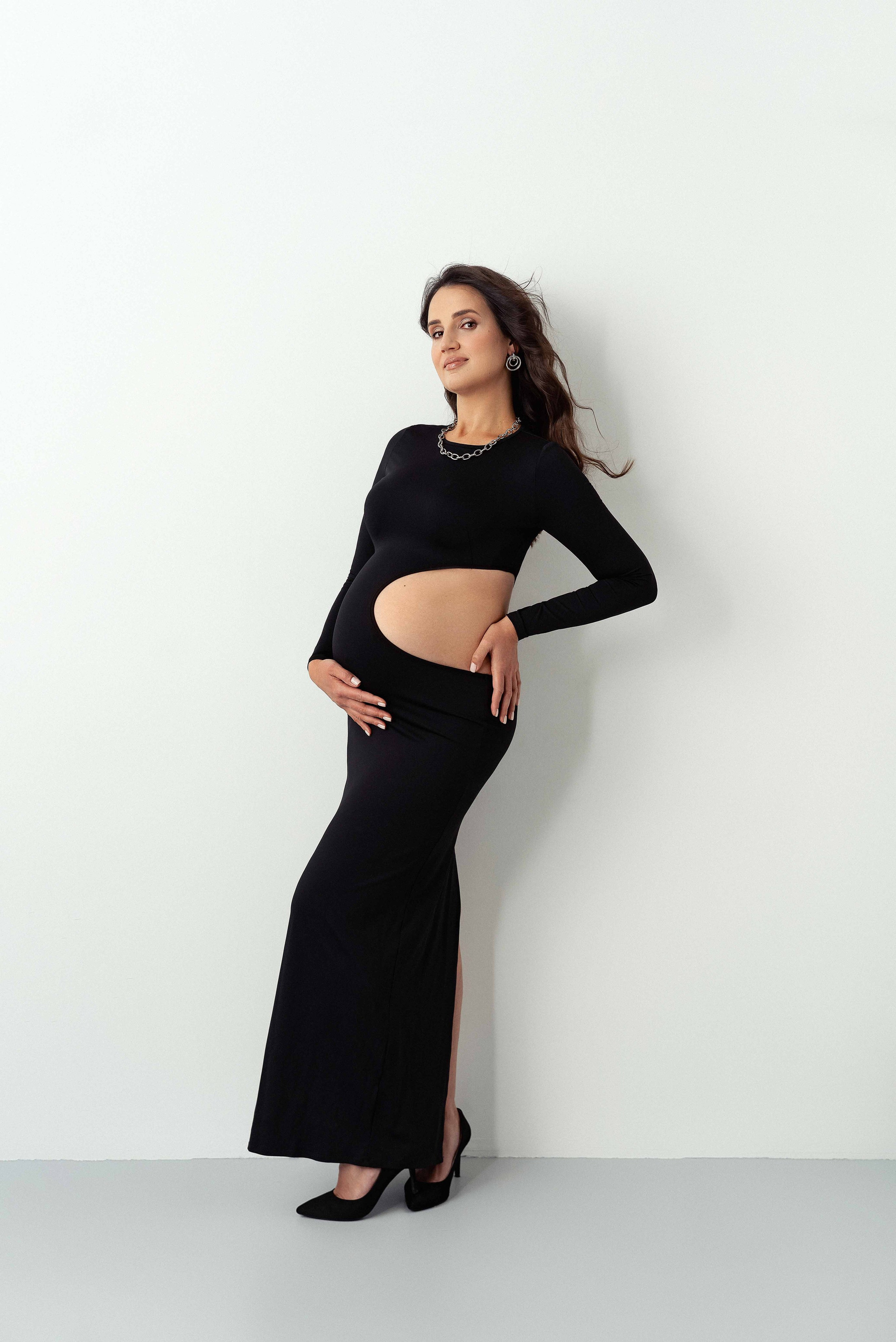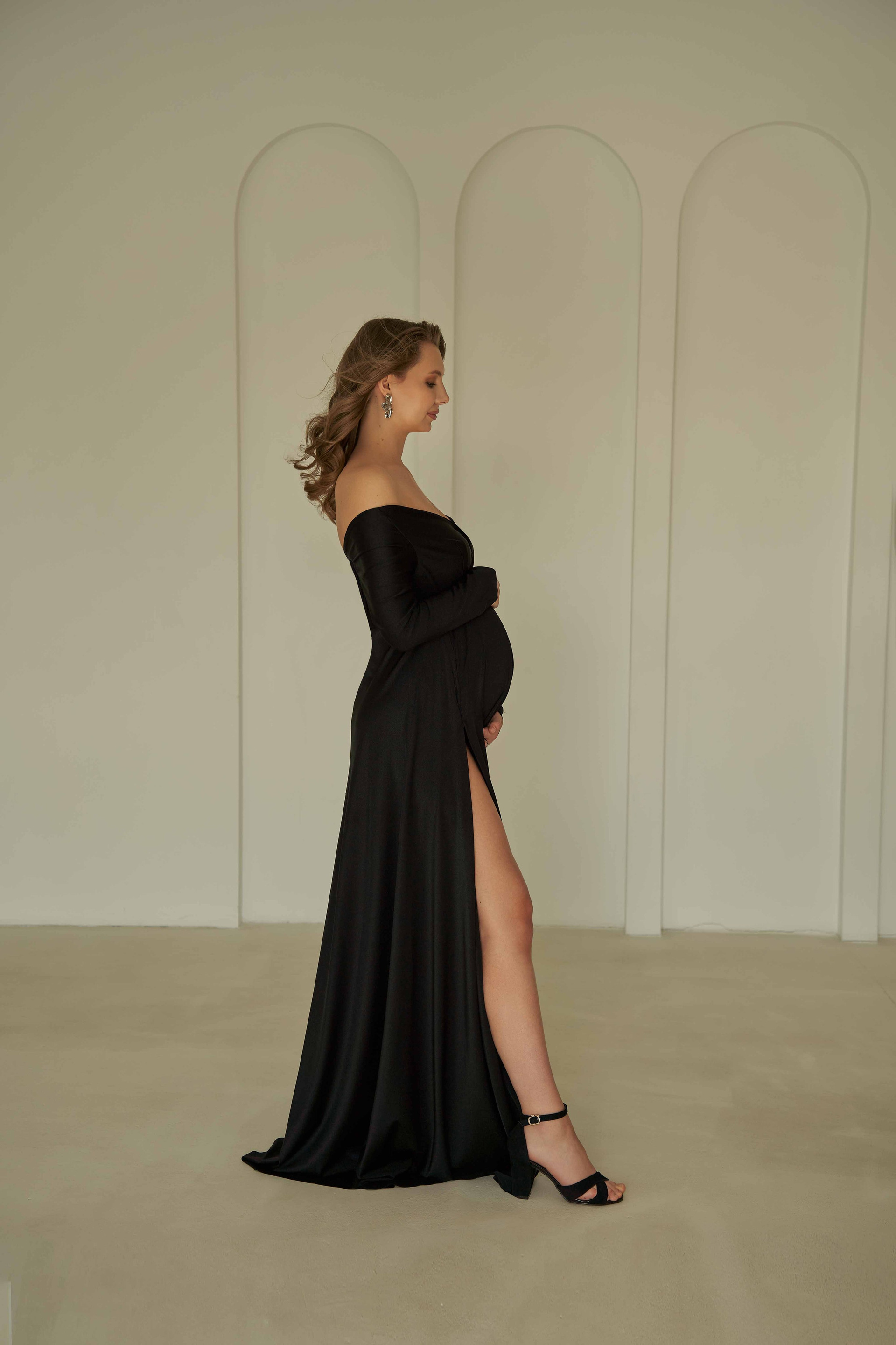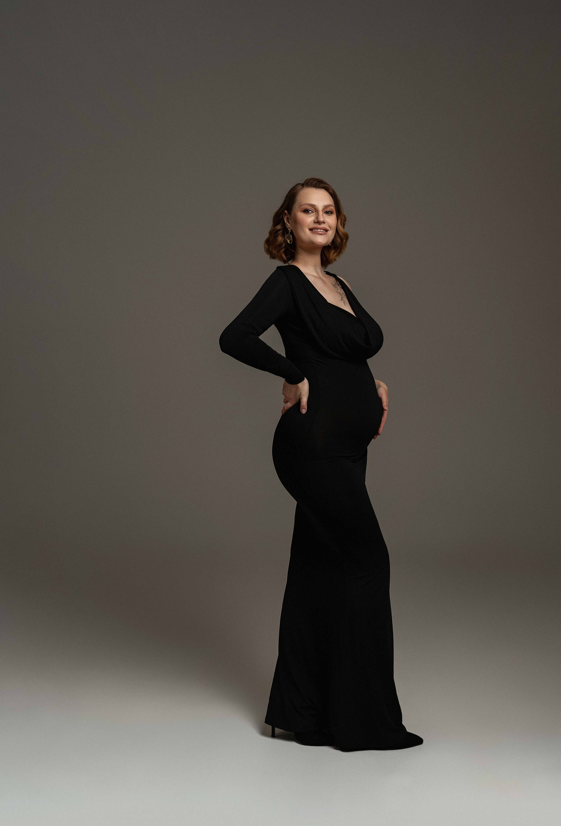 Длинное обтягивающее платье в пол, которое красиво подчёркивает беременный животик и формирует утончённый силуэт.