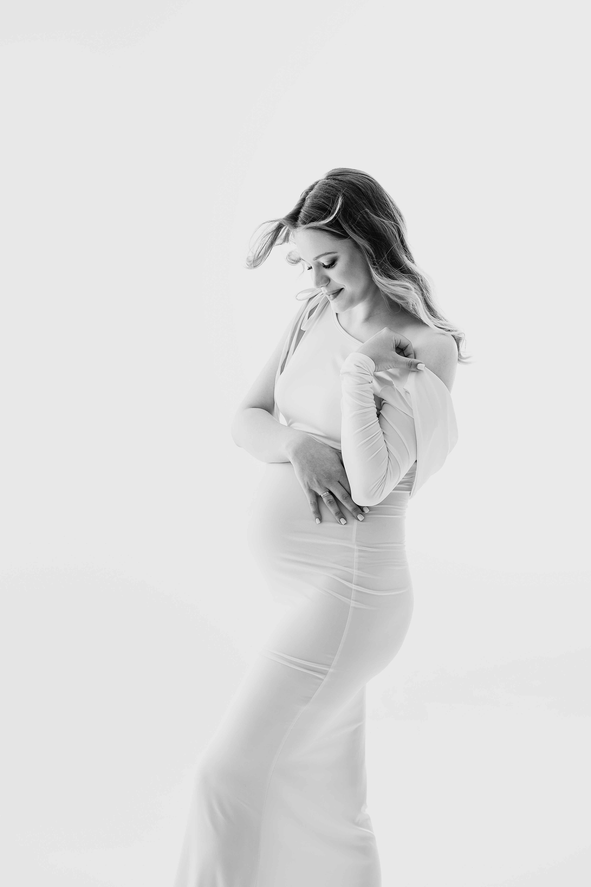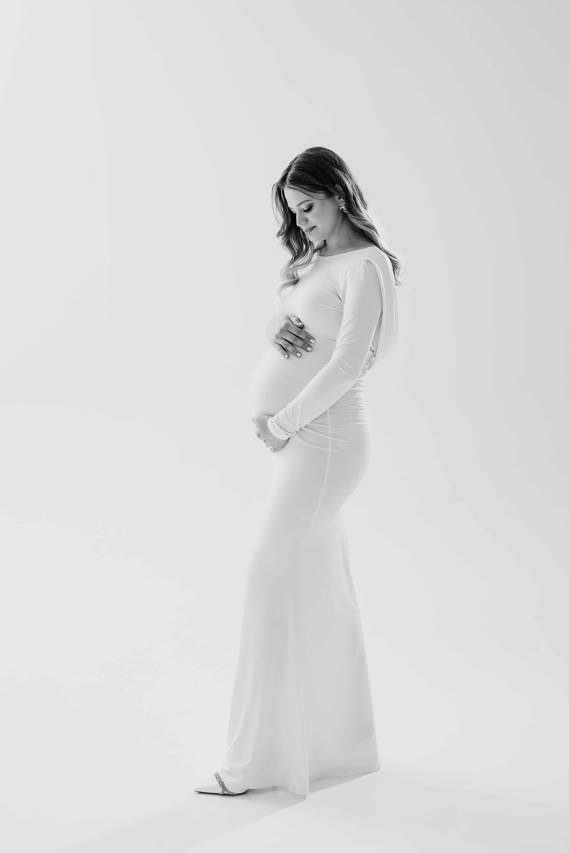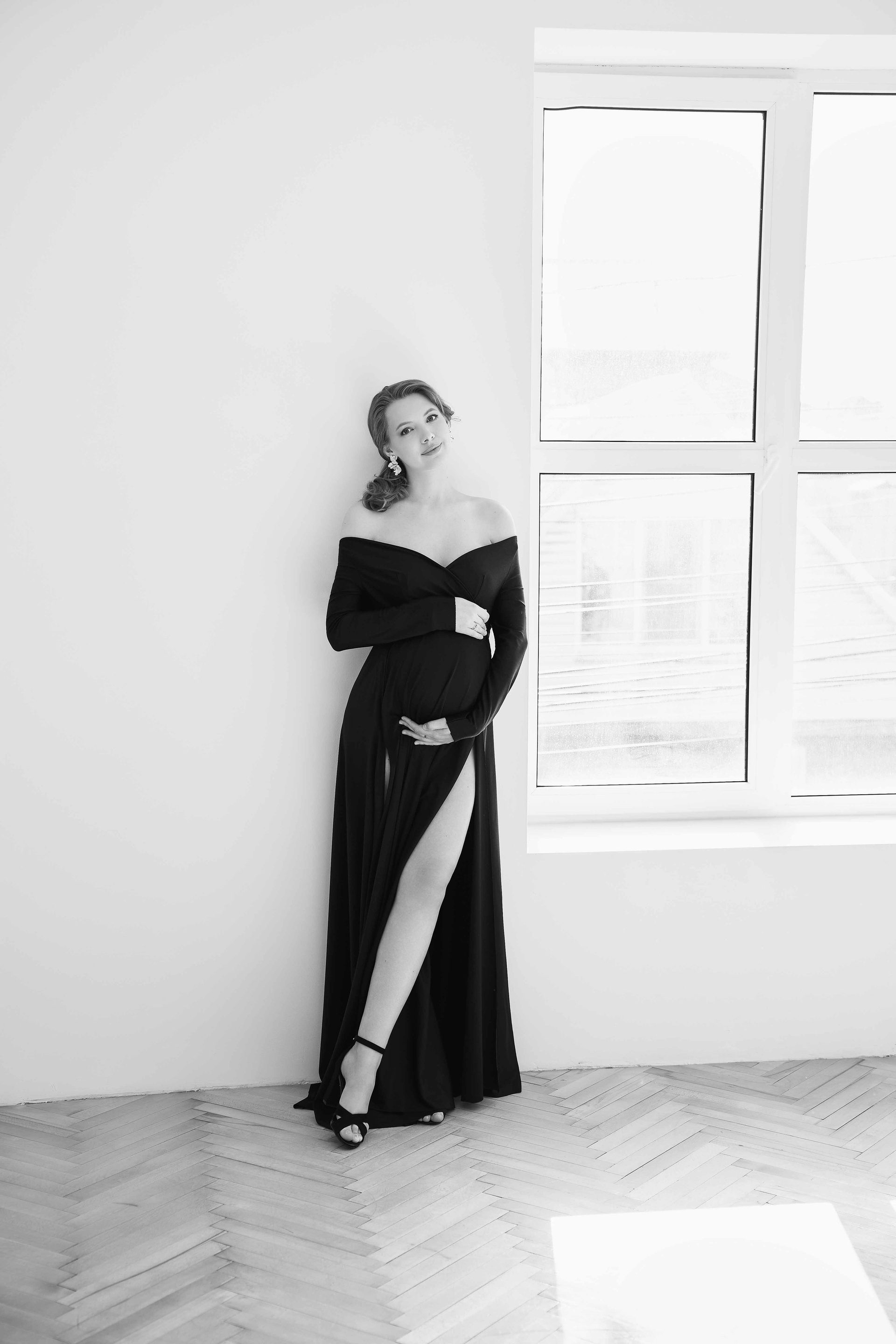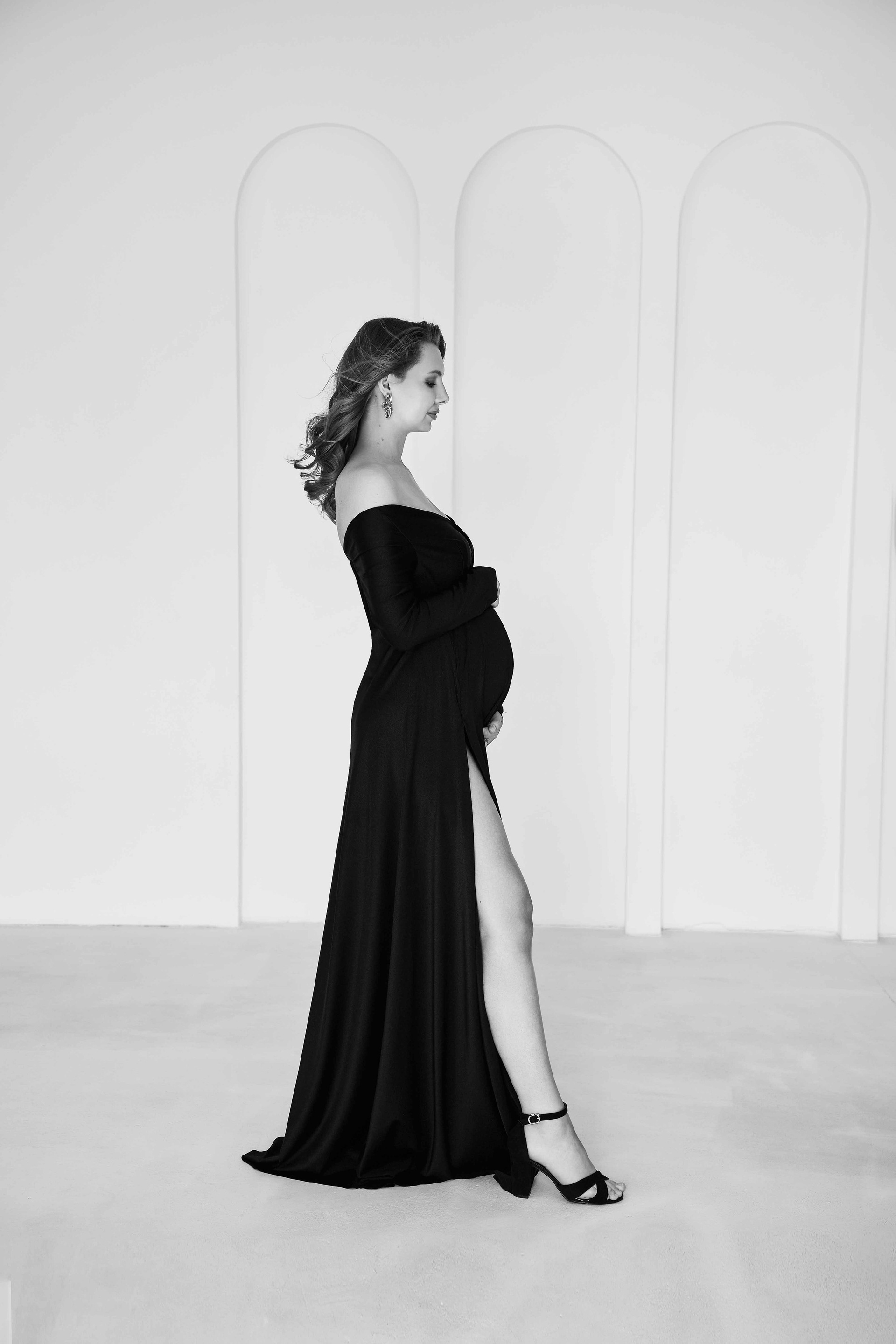 Длинное обтягивающее платье в пол, которое красиво подчёркивает беременный животик и формирует утончённый силуэт.