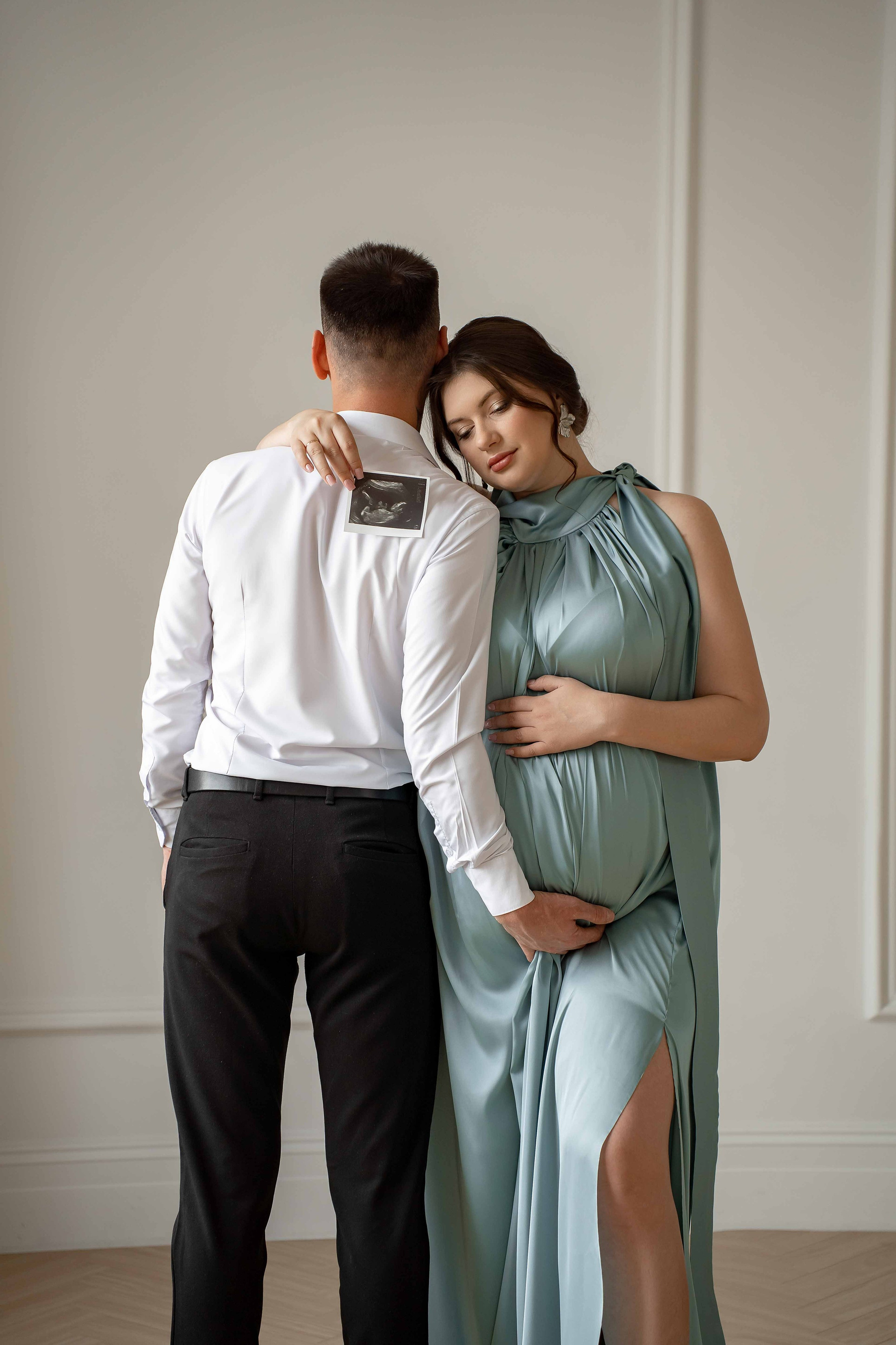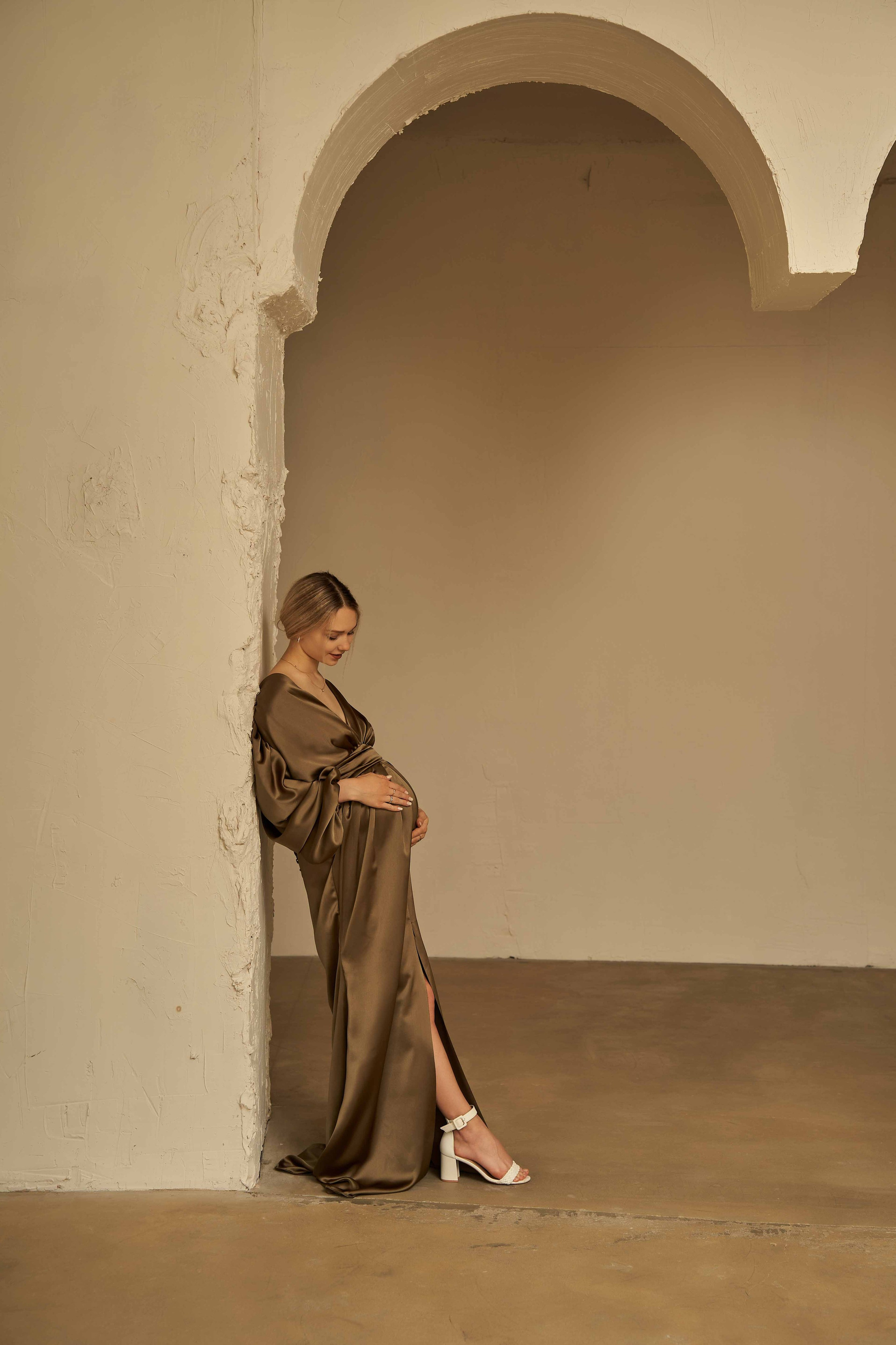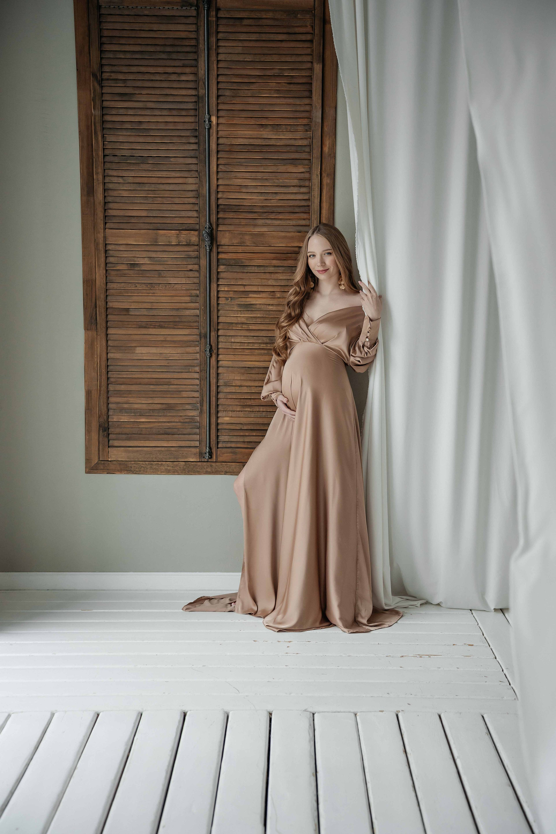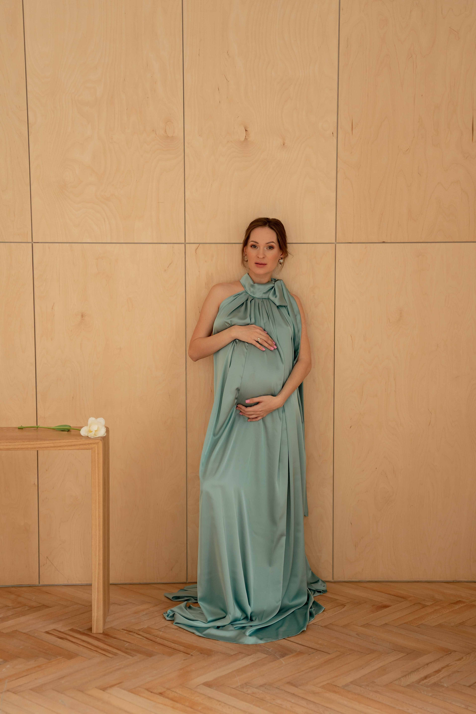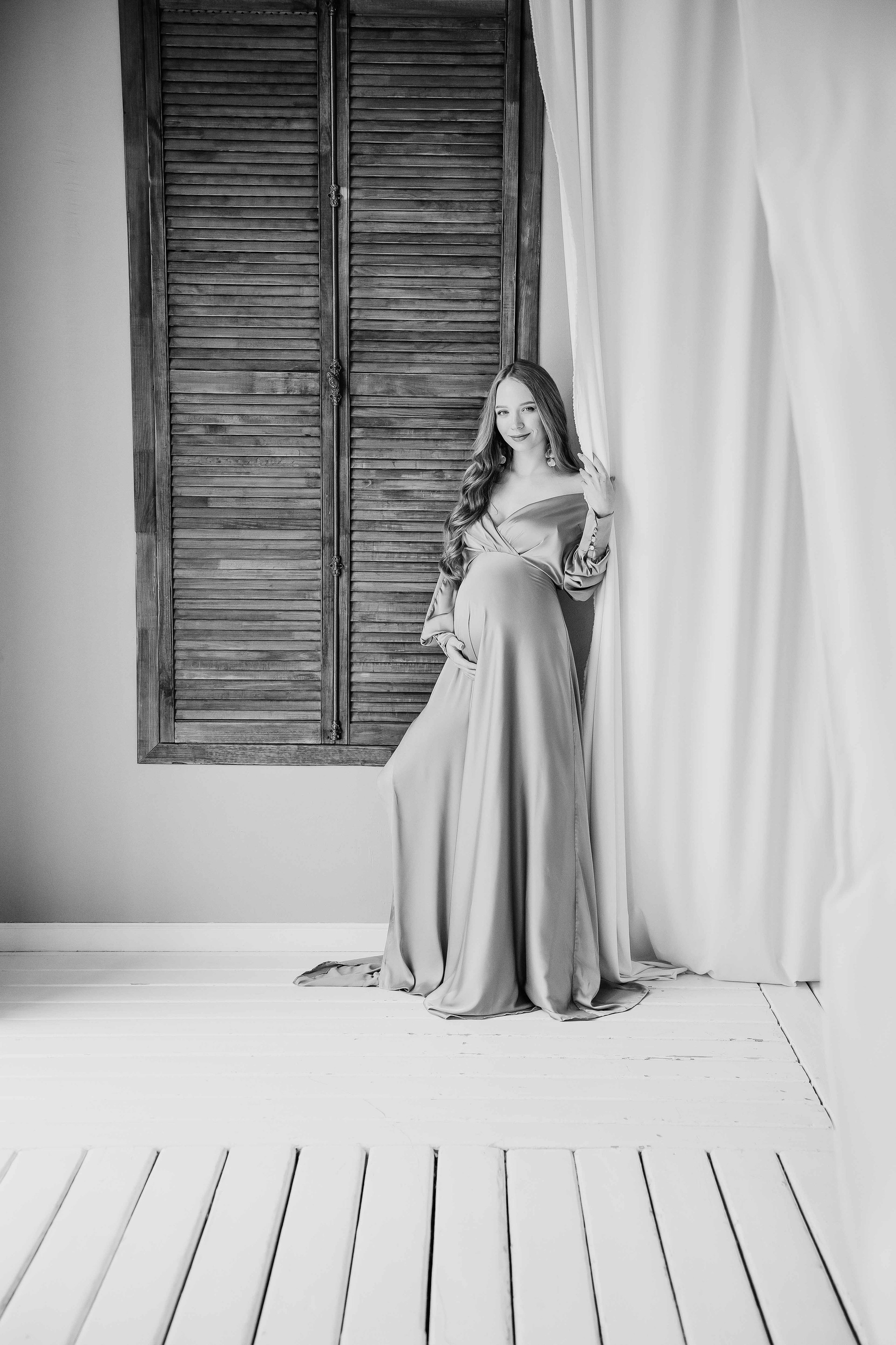 Модель под горло красиво формирует фигуру и подчёркивает беременный животик, а пояс, который можно завязывать на бёдрах, добавляет образу изящный акцент. Ткань с мягким переливом делает кадры особенно эффектными и глубокими. Платье подходит до 46 размера.