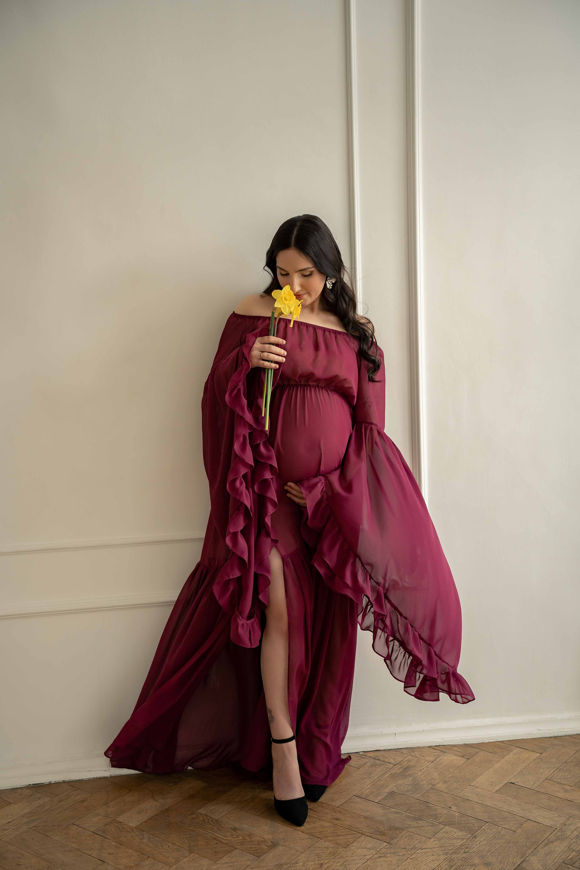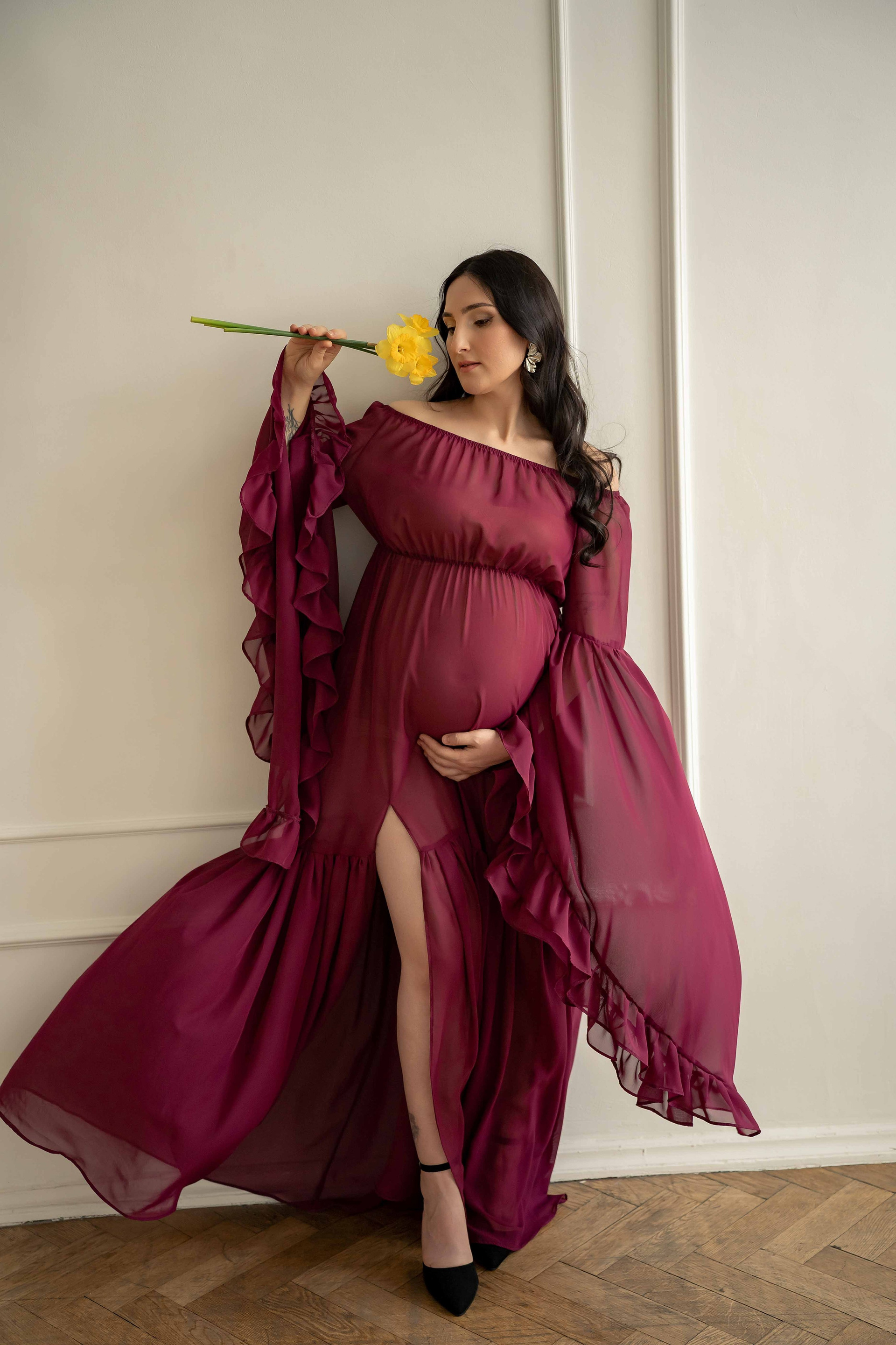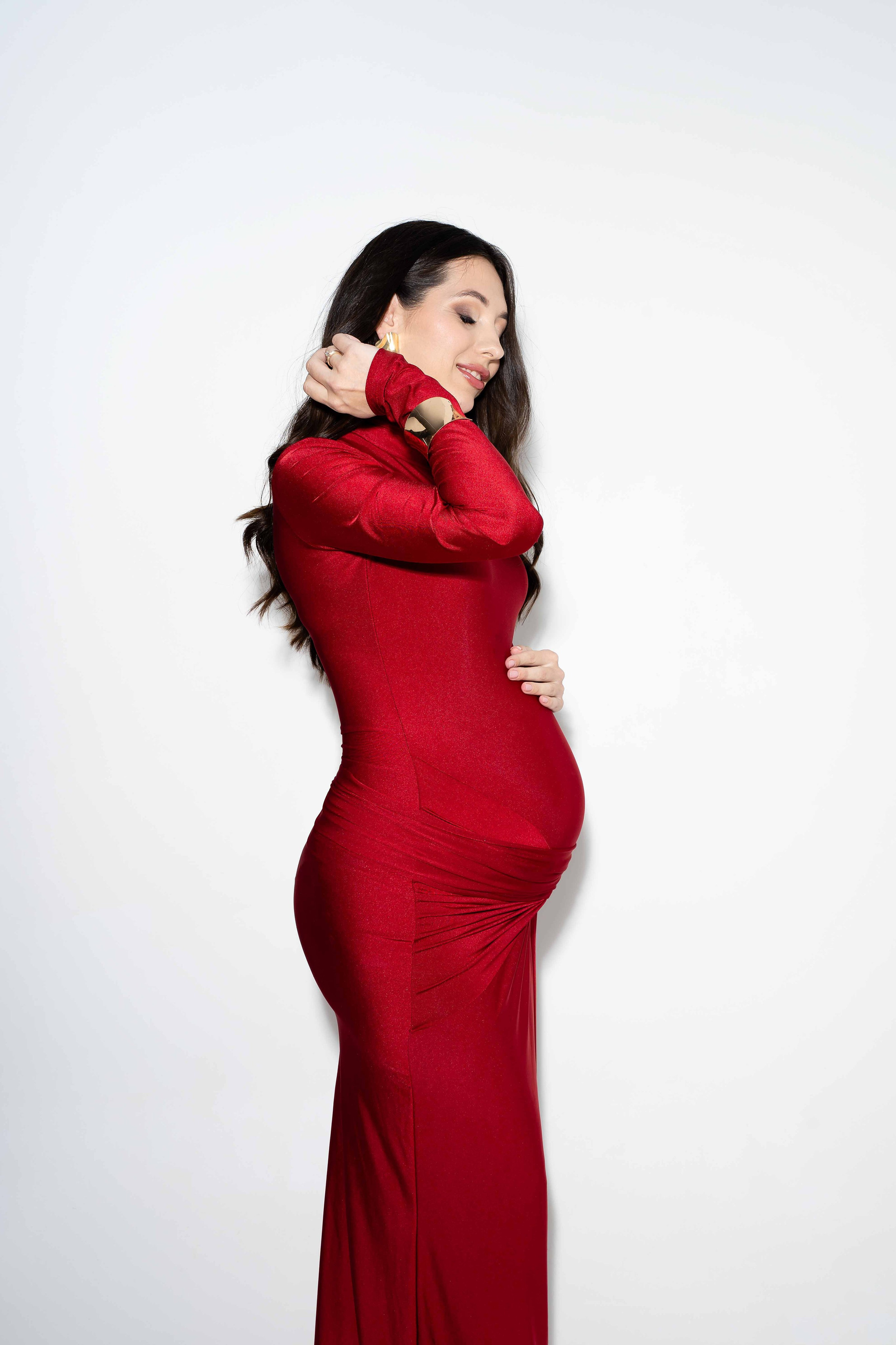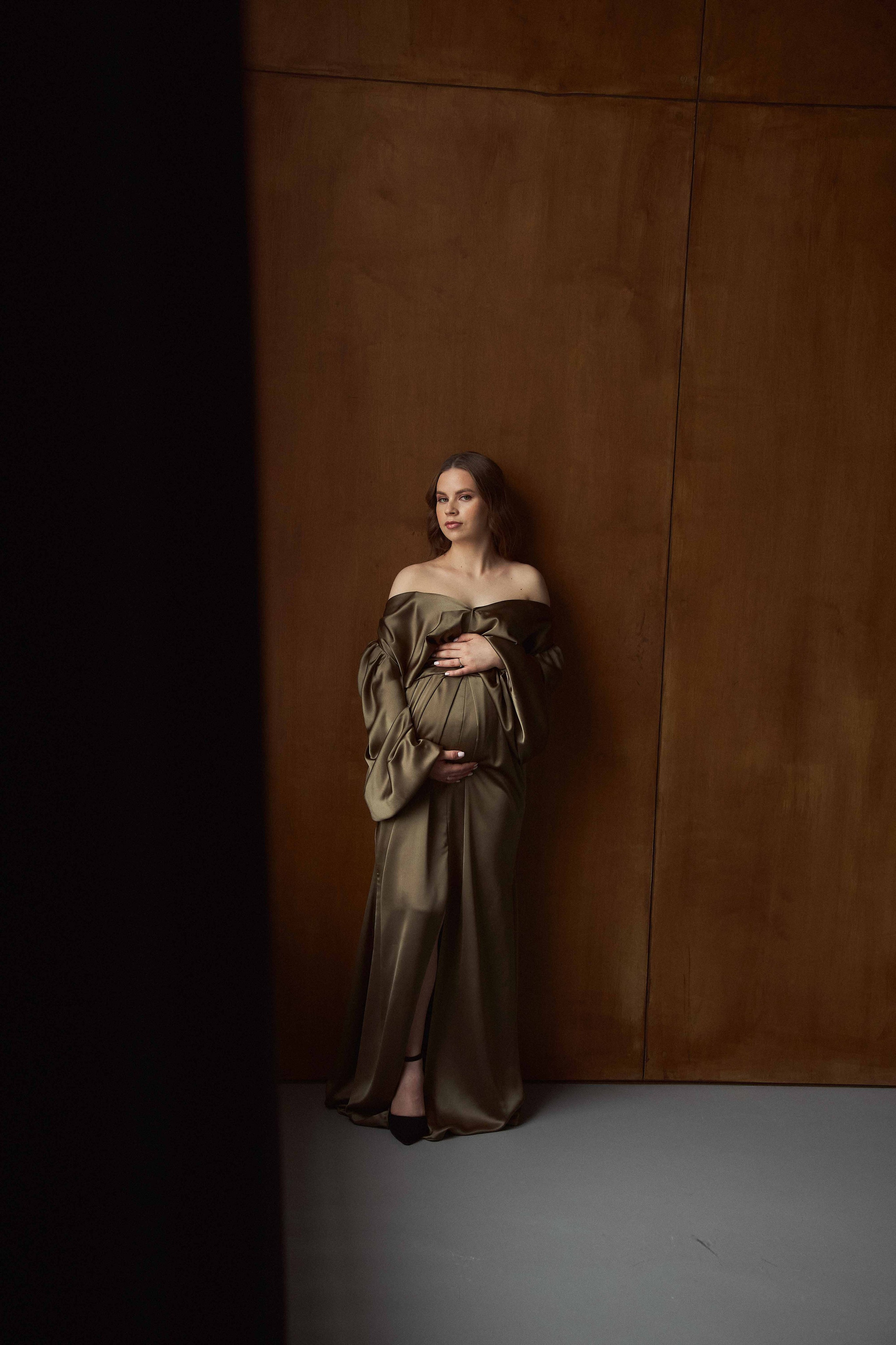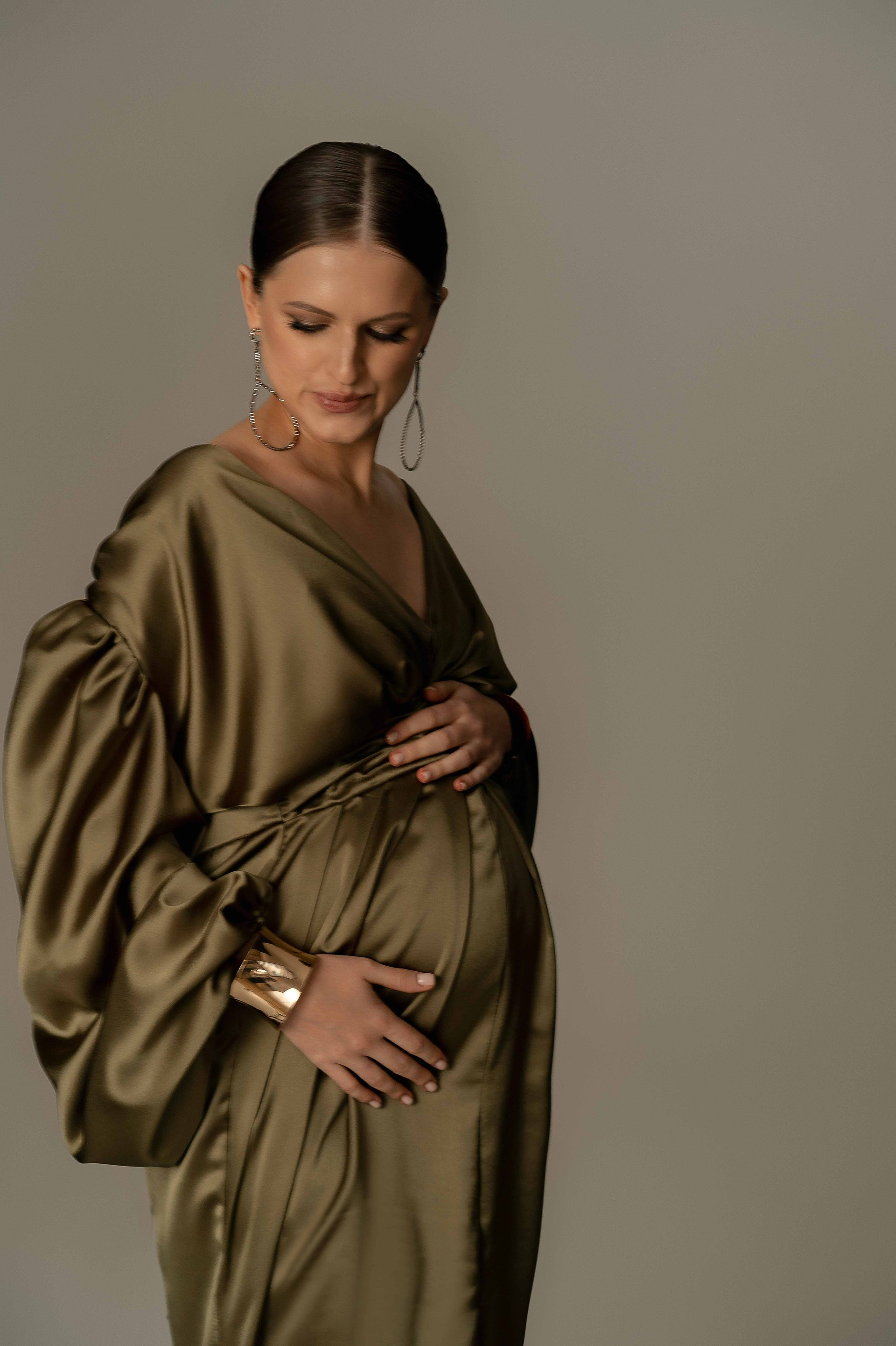 Модель под горло красиво формирует фигуру и подчёркивает беременный животик, а пояс, который можно завязывать на бёдрах, добавляет образу изящный акцент. Ткань с мягким переливом делает кадры особенно эффектными и глубокими. Платье подходит до 46 размера.