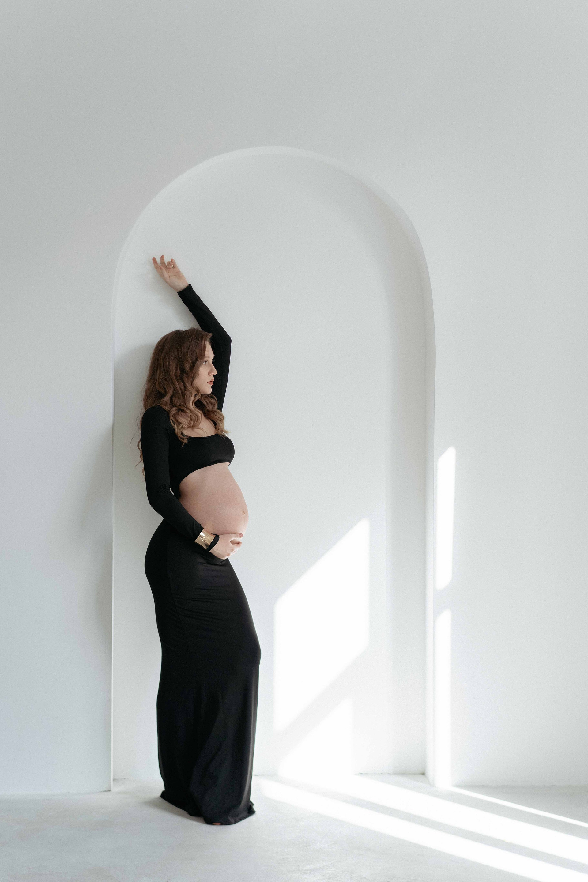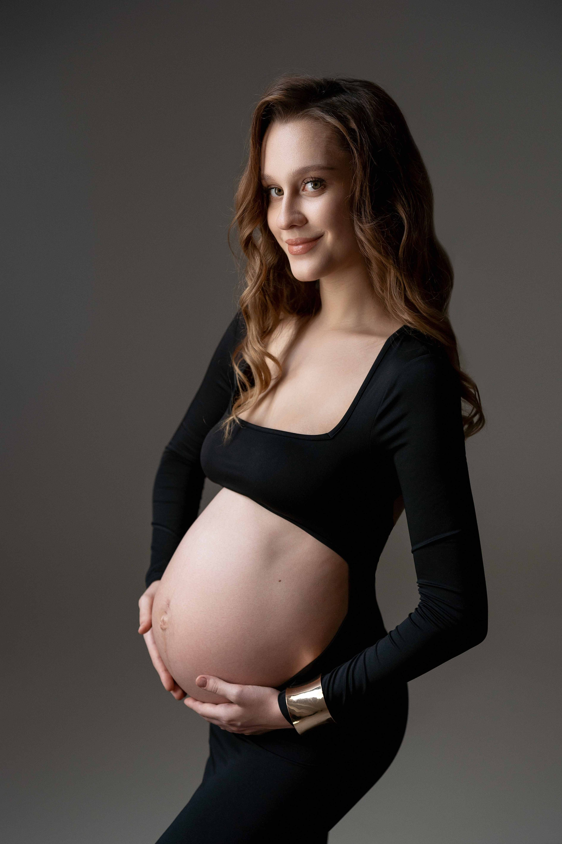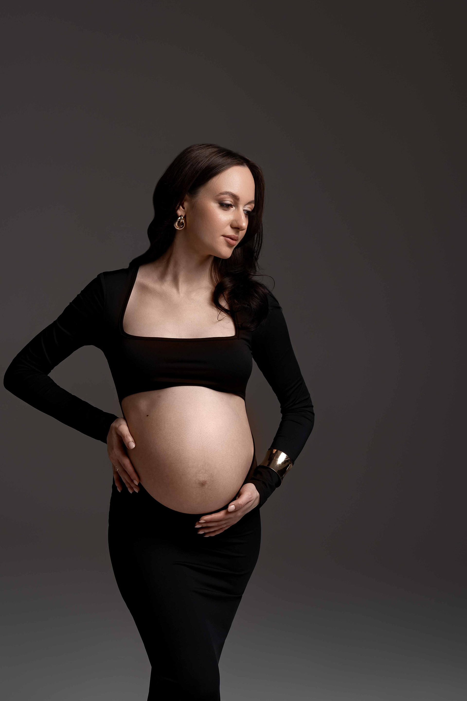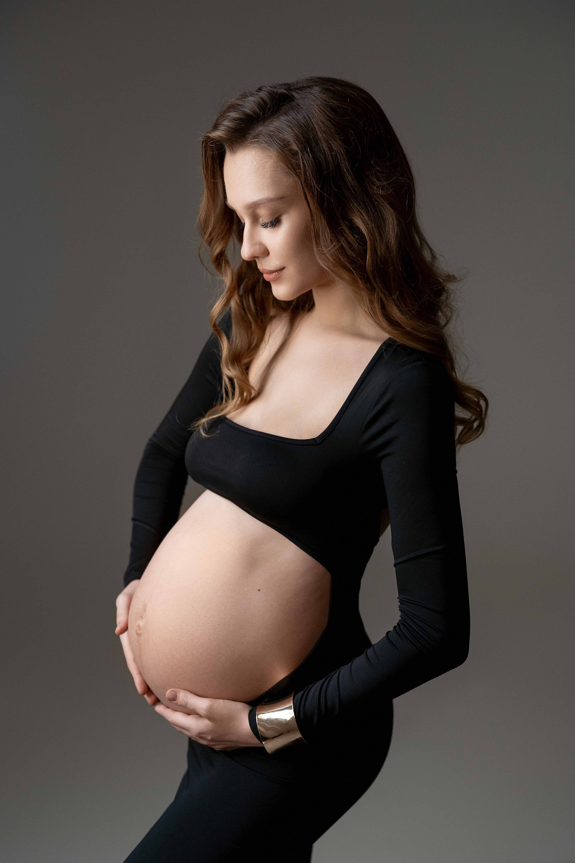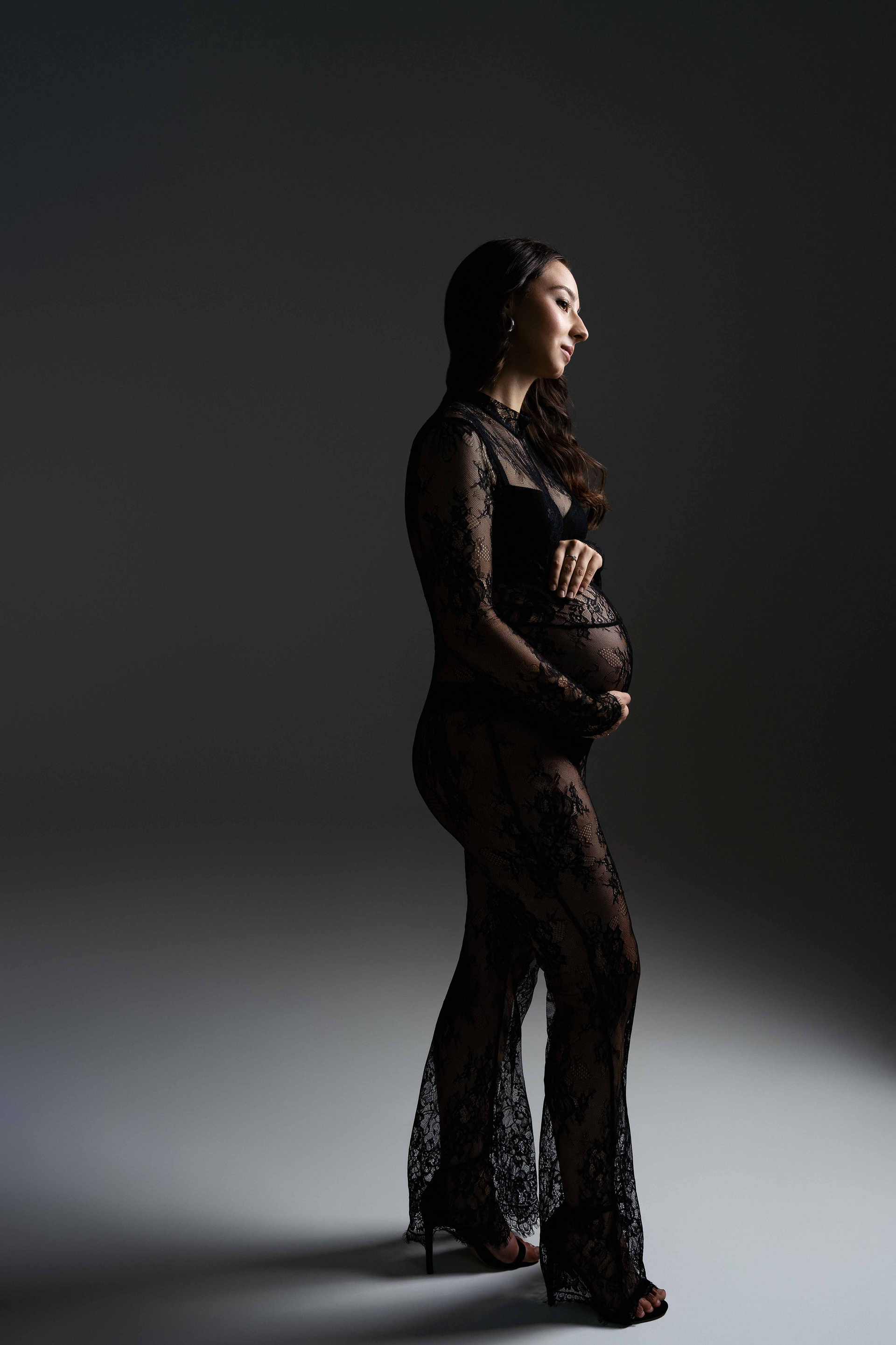 Эффектный чёрный кружевной комбинезон, который подчёркивает форму беременного животика и создаёт выразительный, женственный образ в студийной съёмке.