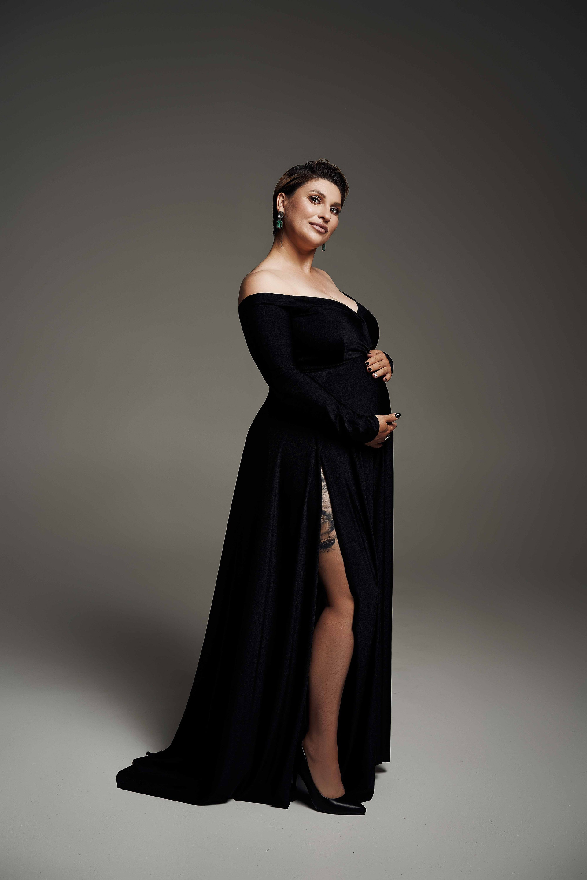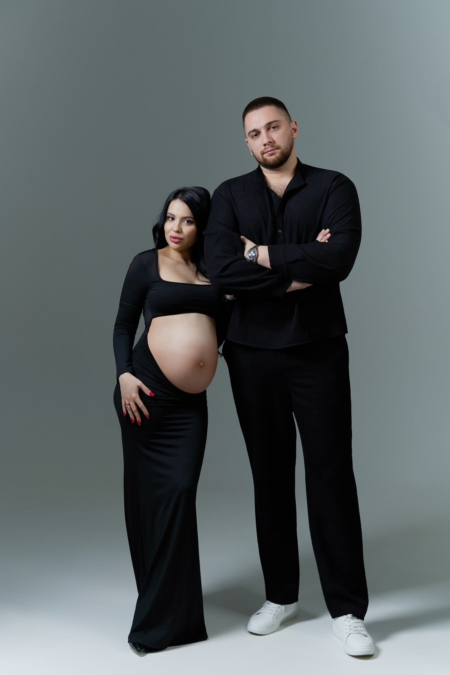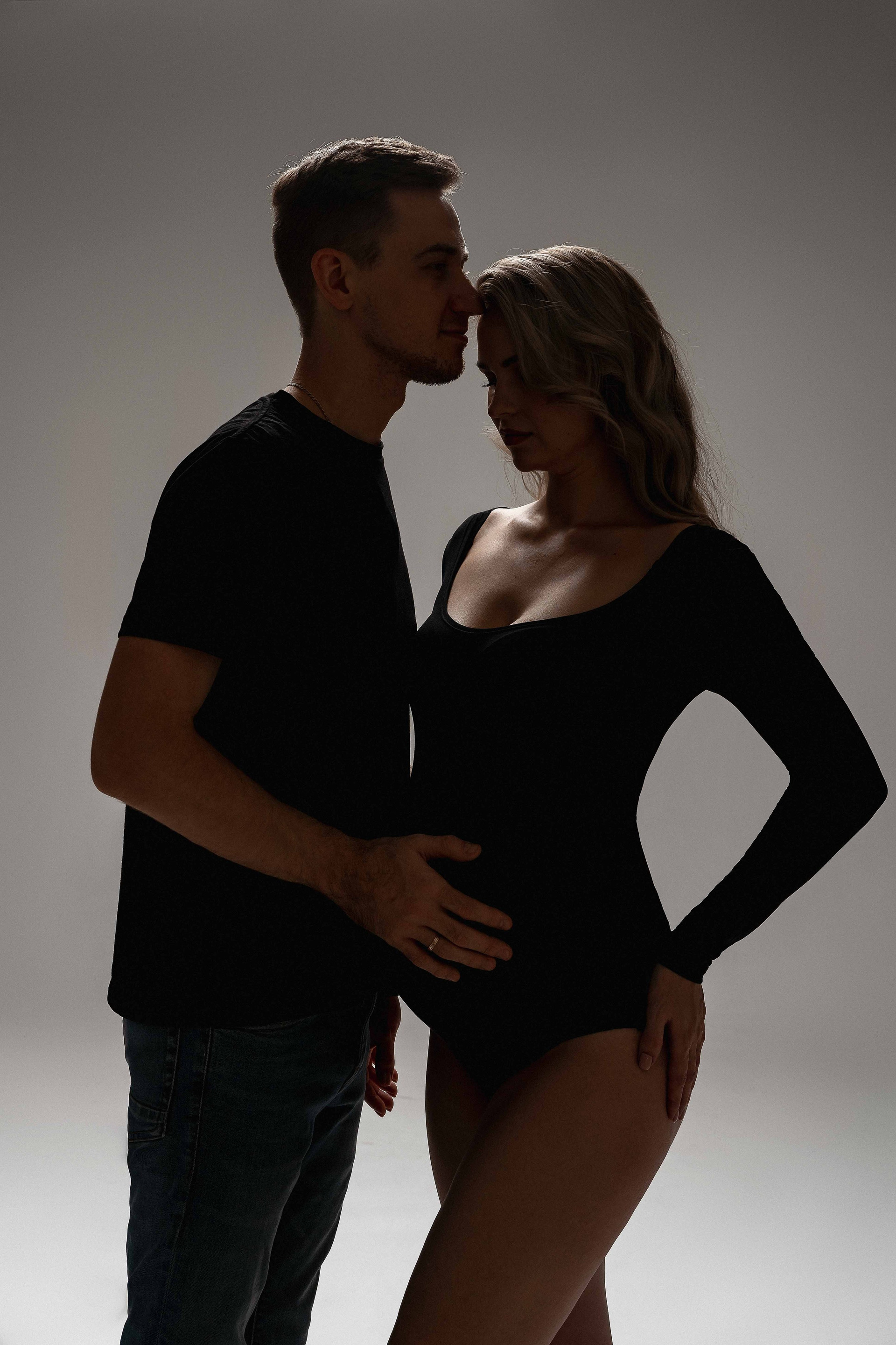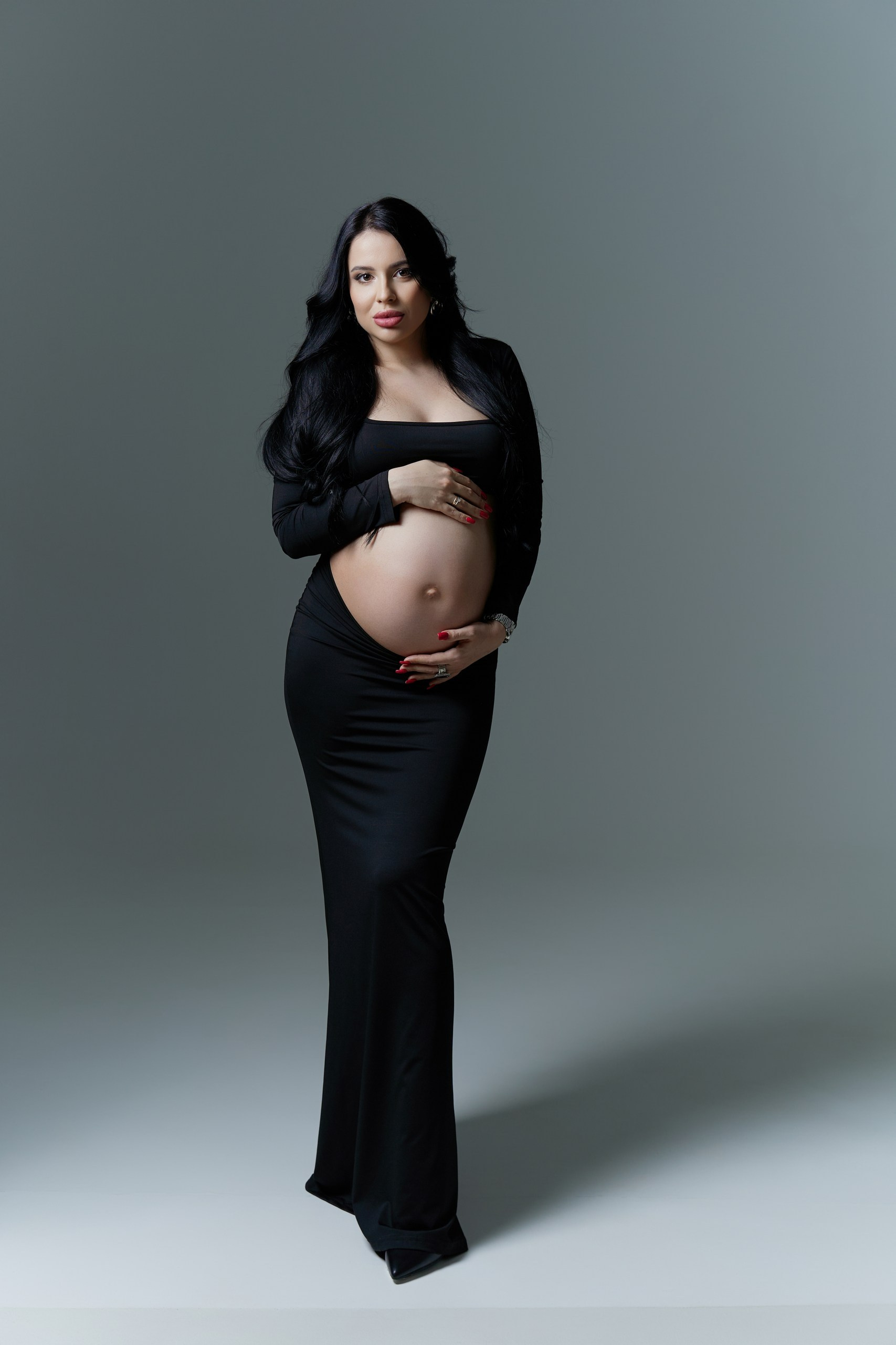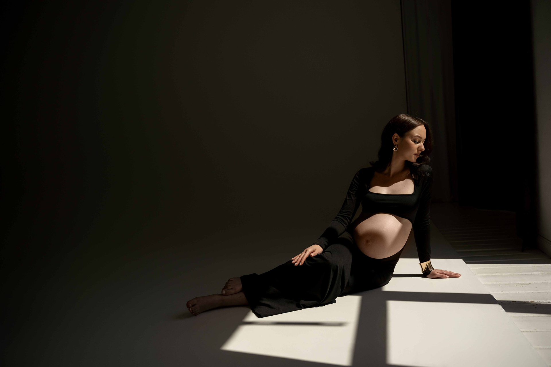 Эффектный чёрный кружевной комбинезон, который подчёркивает форму беременного животика и создаёт выразительный, женственный образ в студийной съёмке.
