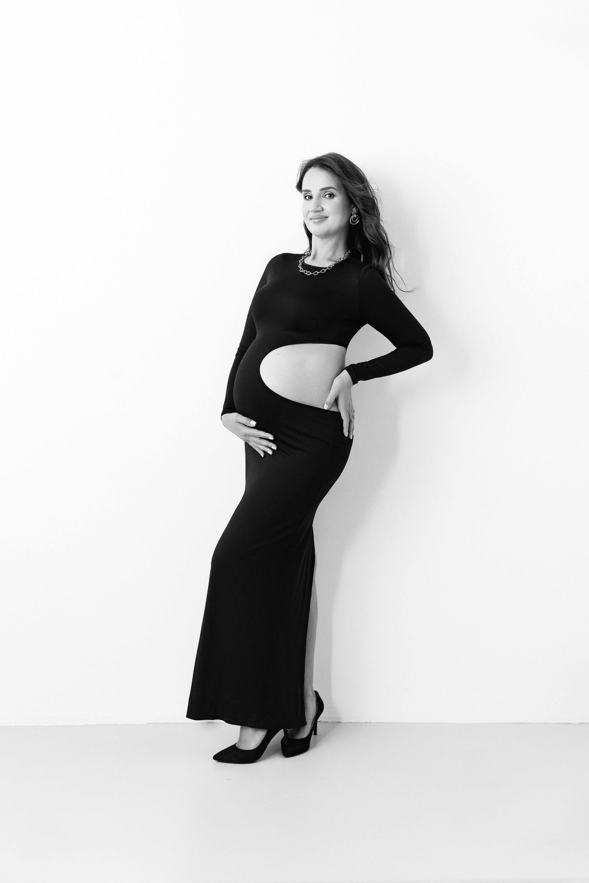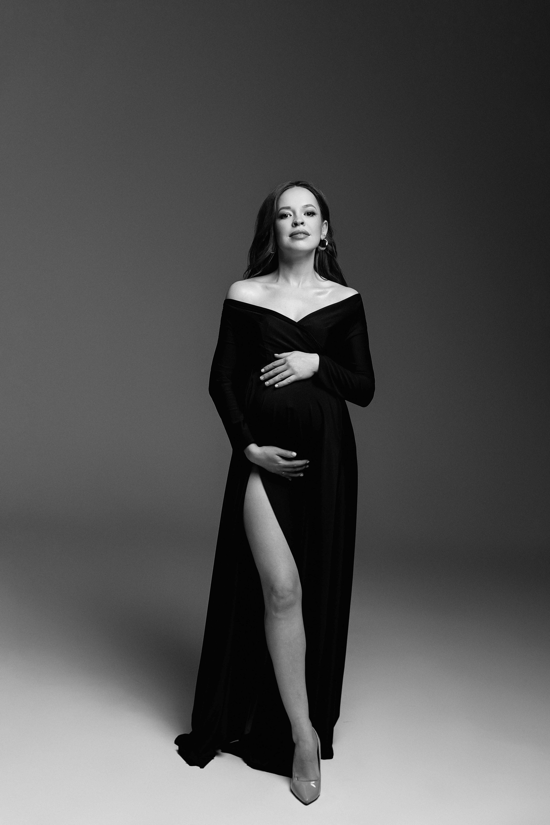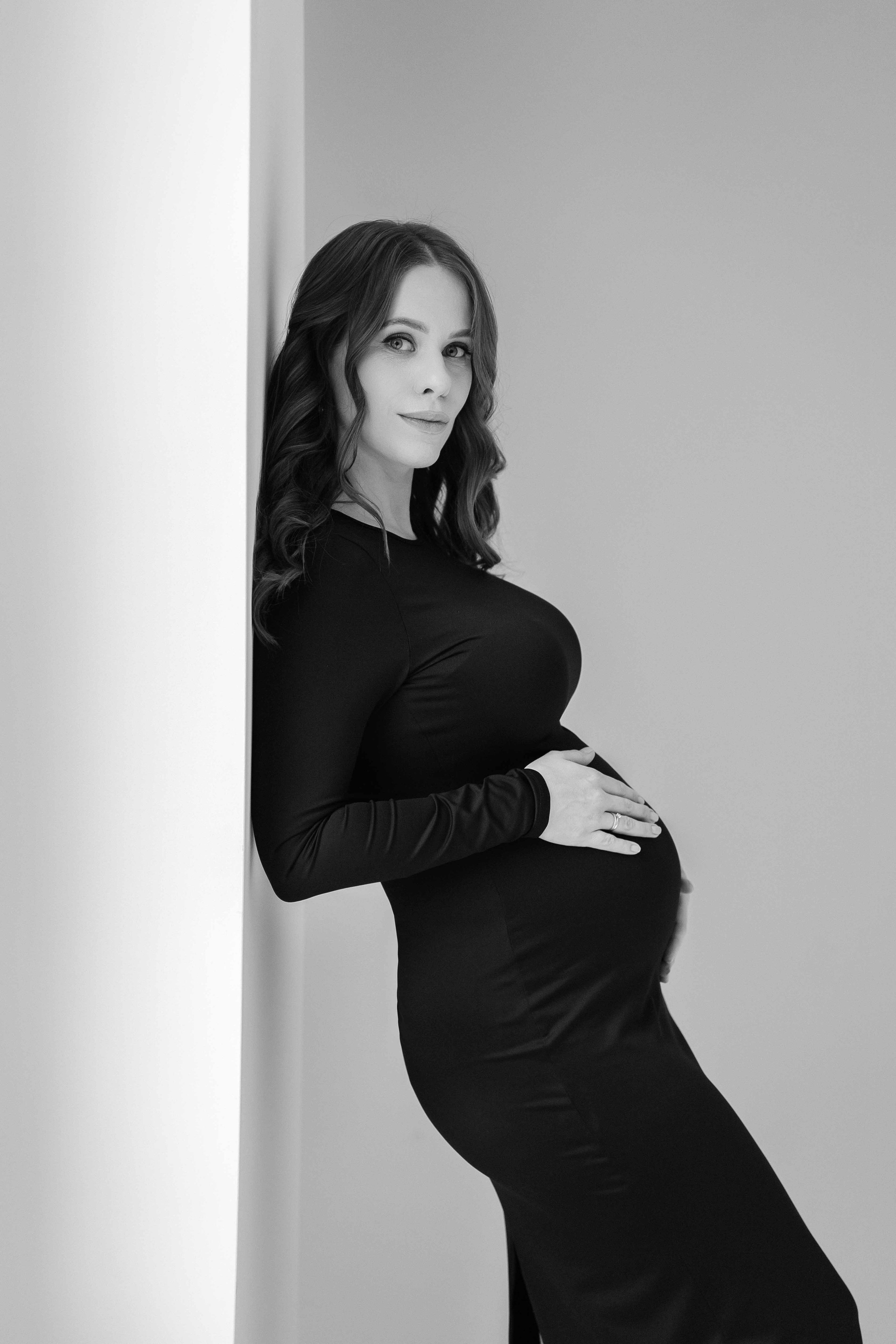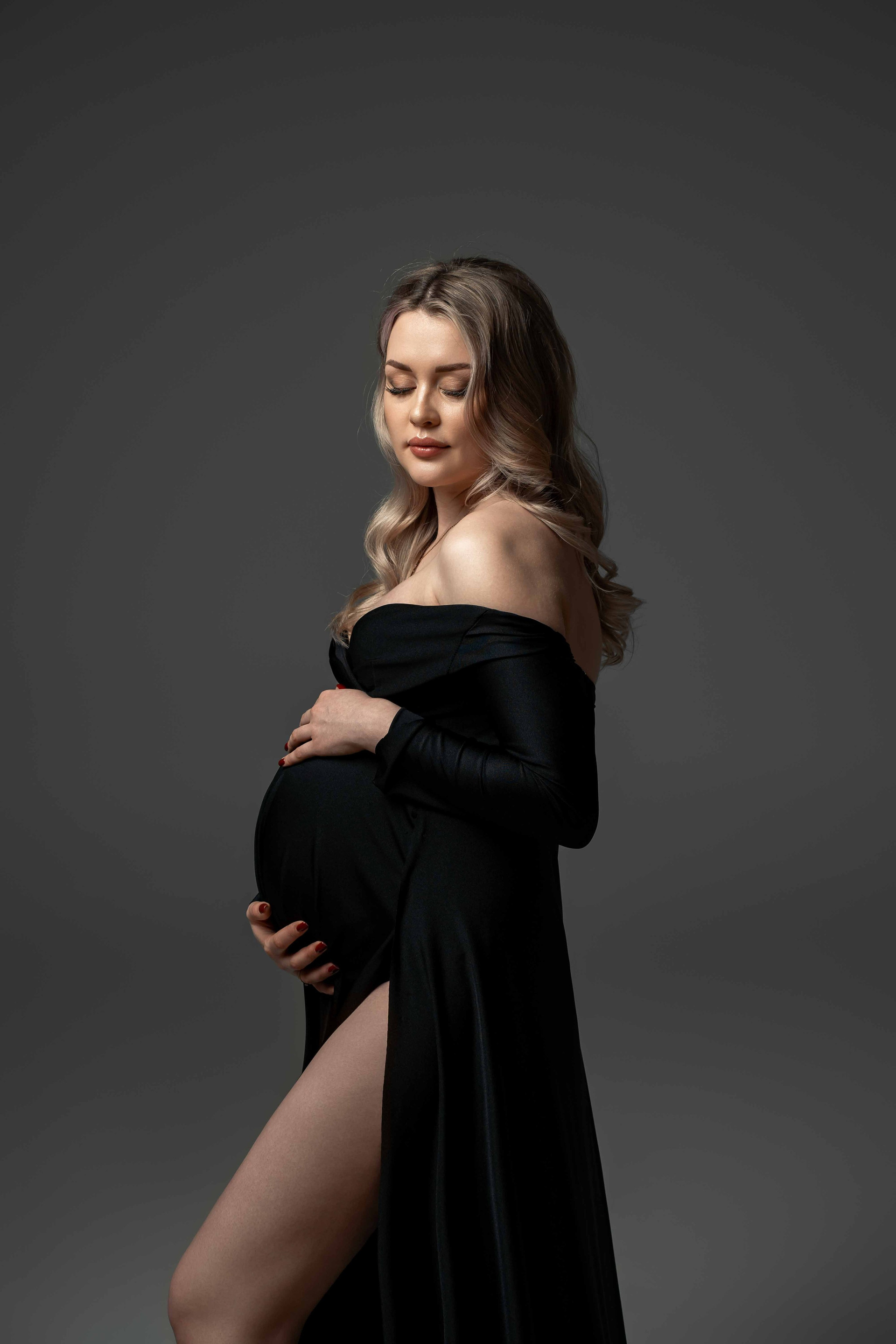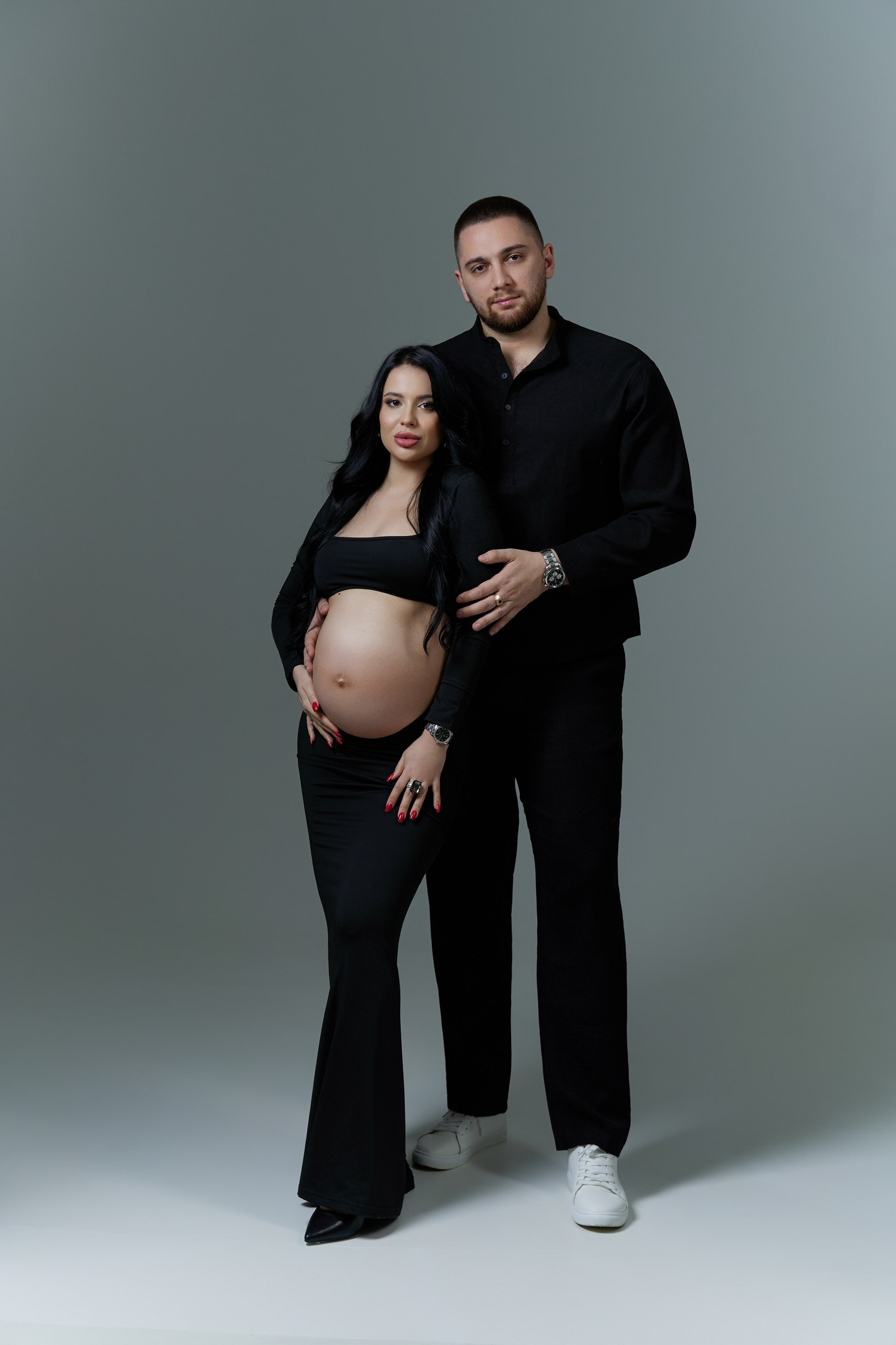 Эффектный чёрный кружевной комбинезон, который подчёркивает форму беременного животика и создаёт выразительный, женственный образ в студийной съёмке.