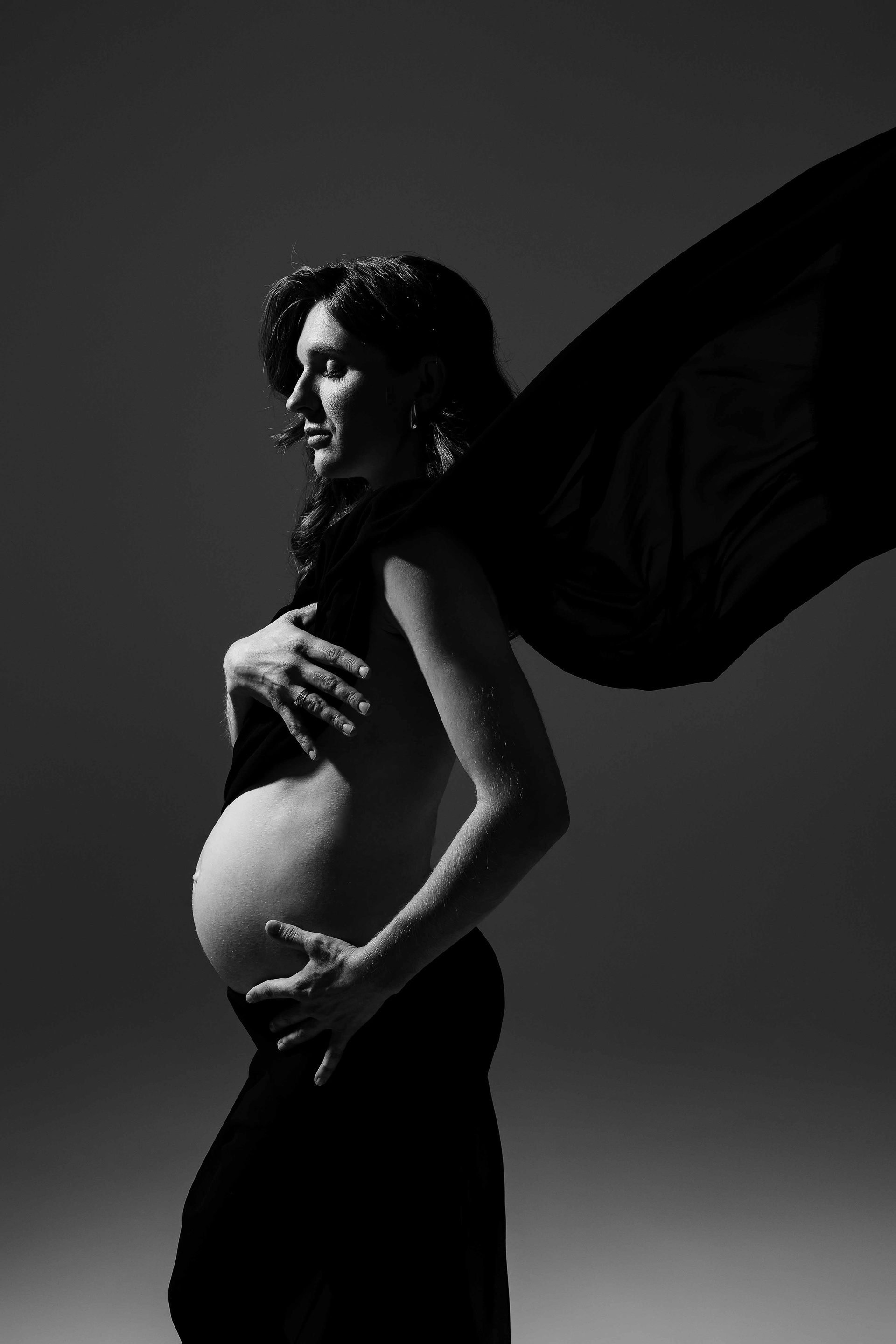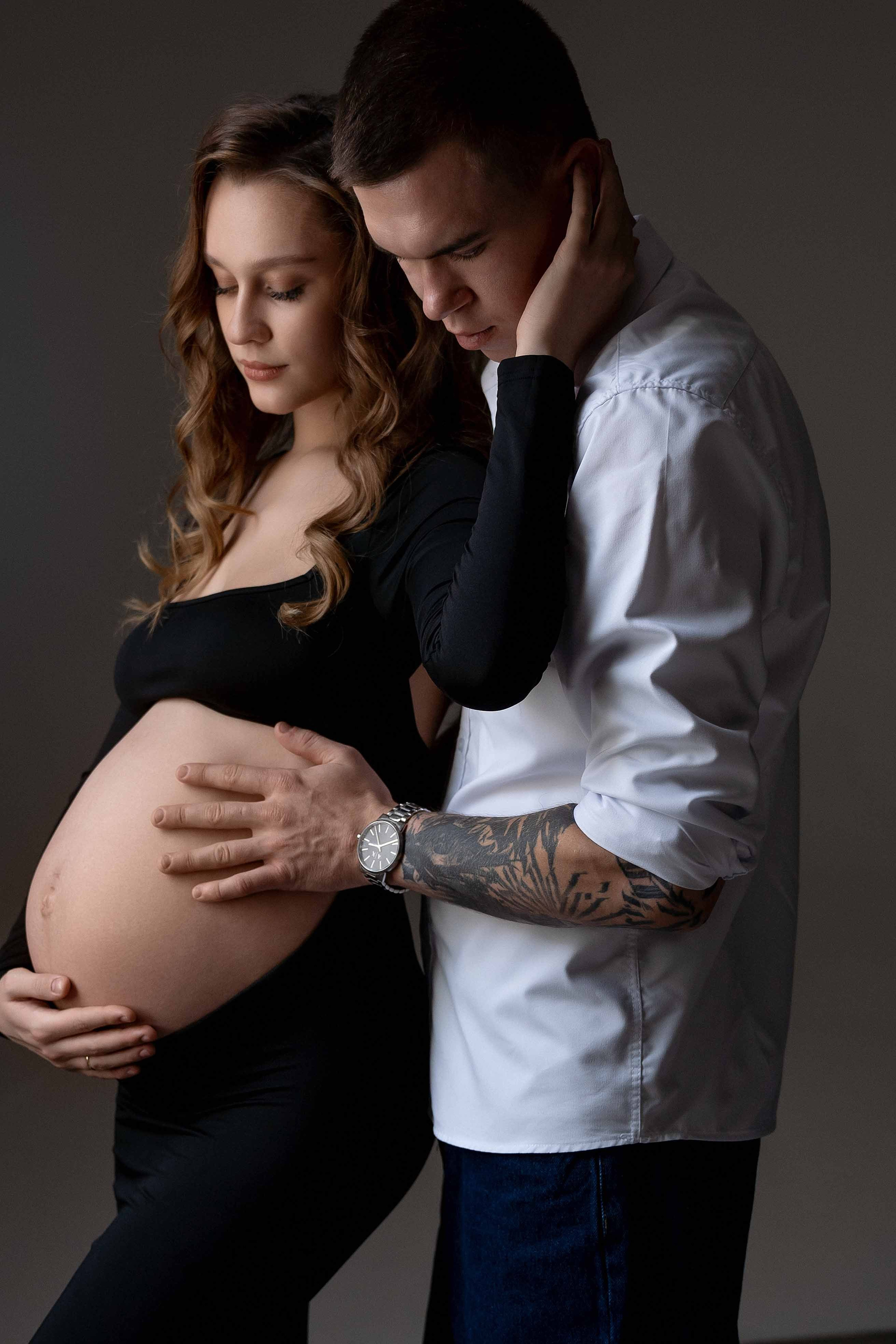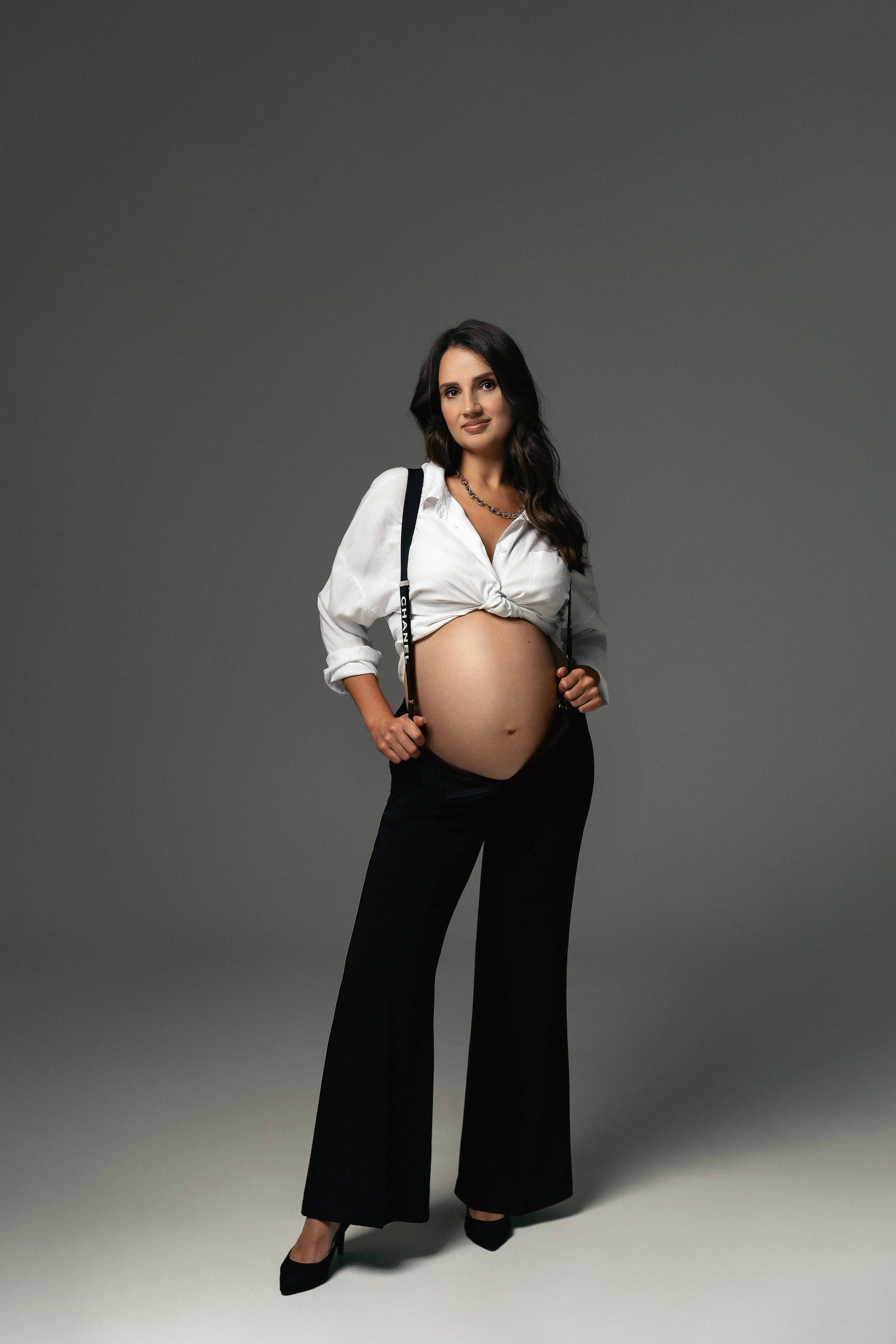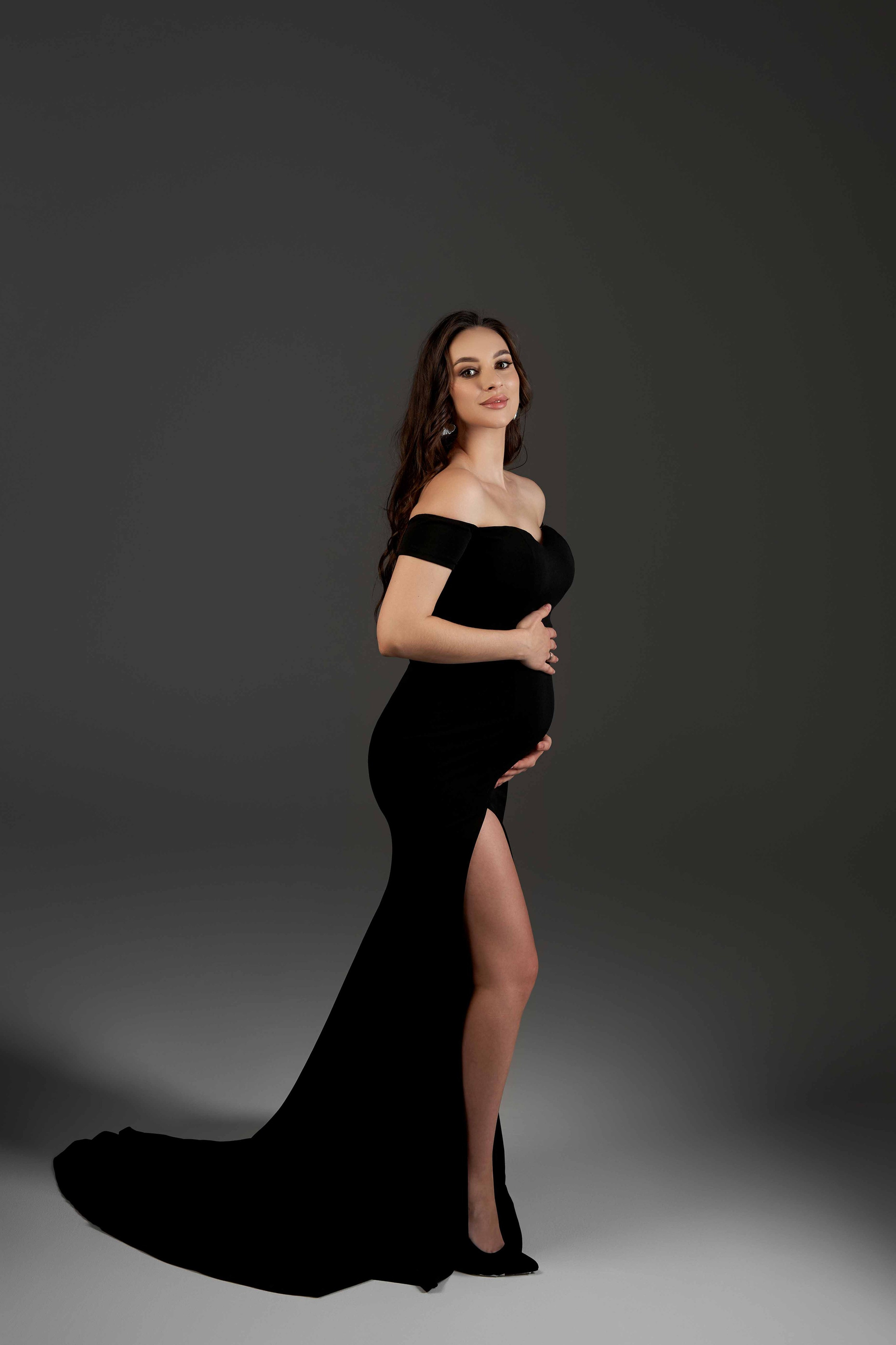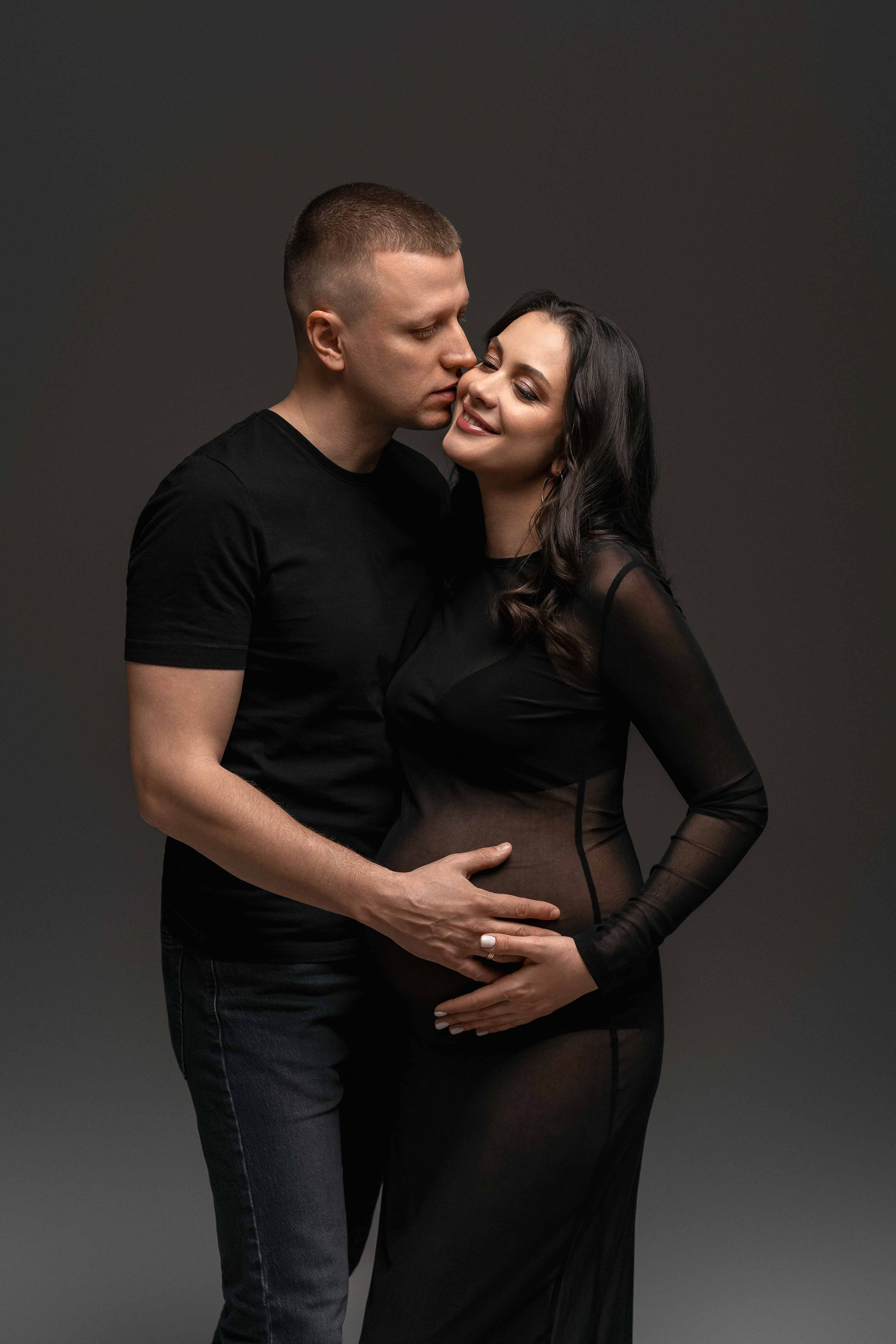 Эффектный чёрный кружевной комбинезон, который подчёркивает форму беременного животика и создаёт выразительный, женственный образ в студийной съёмке.