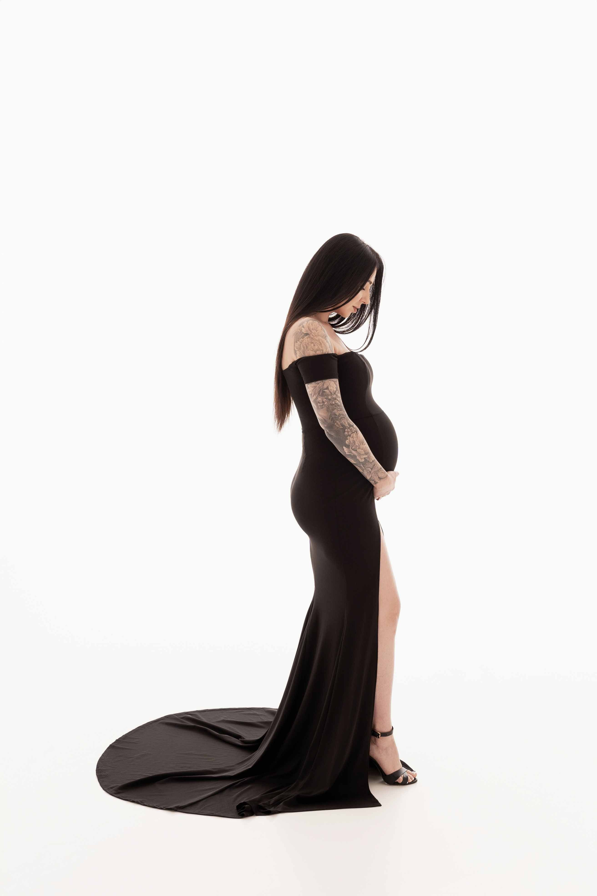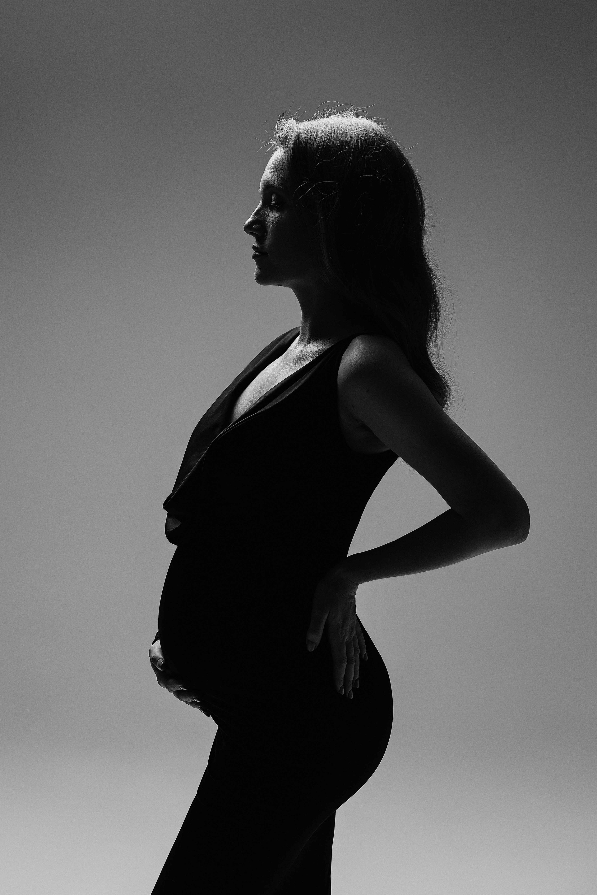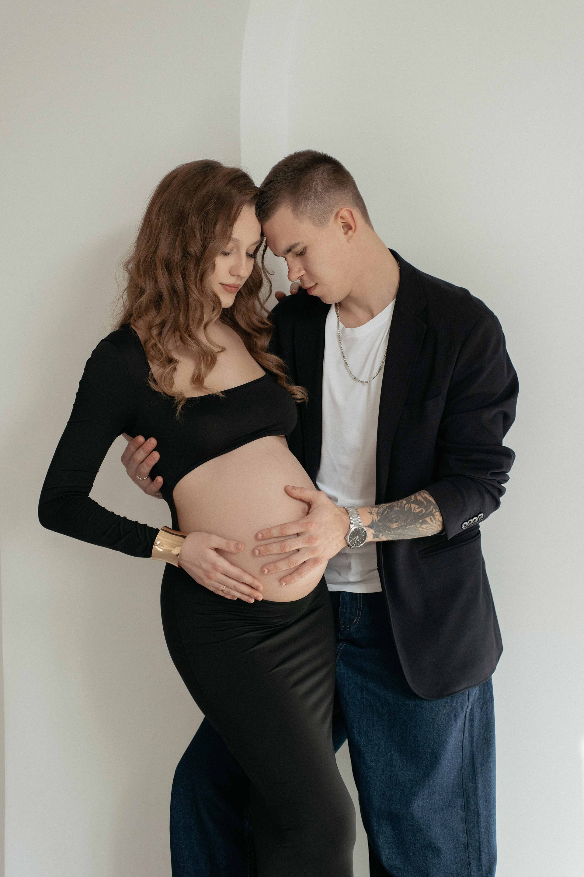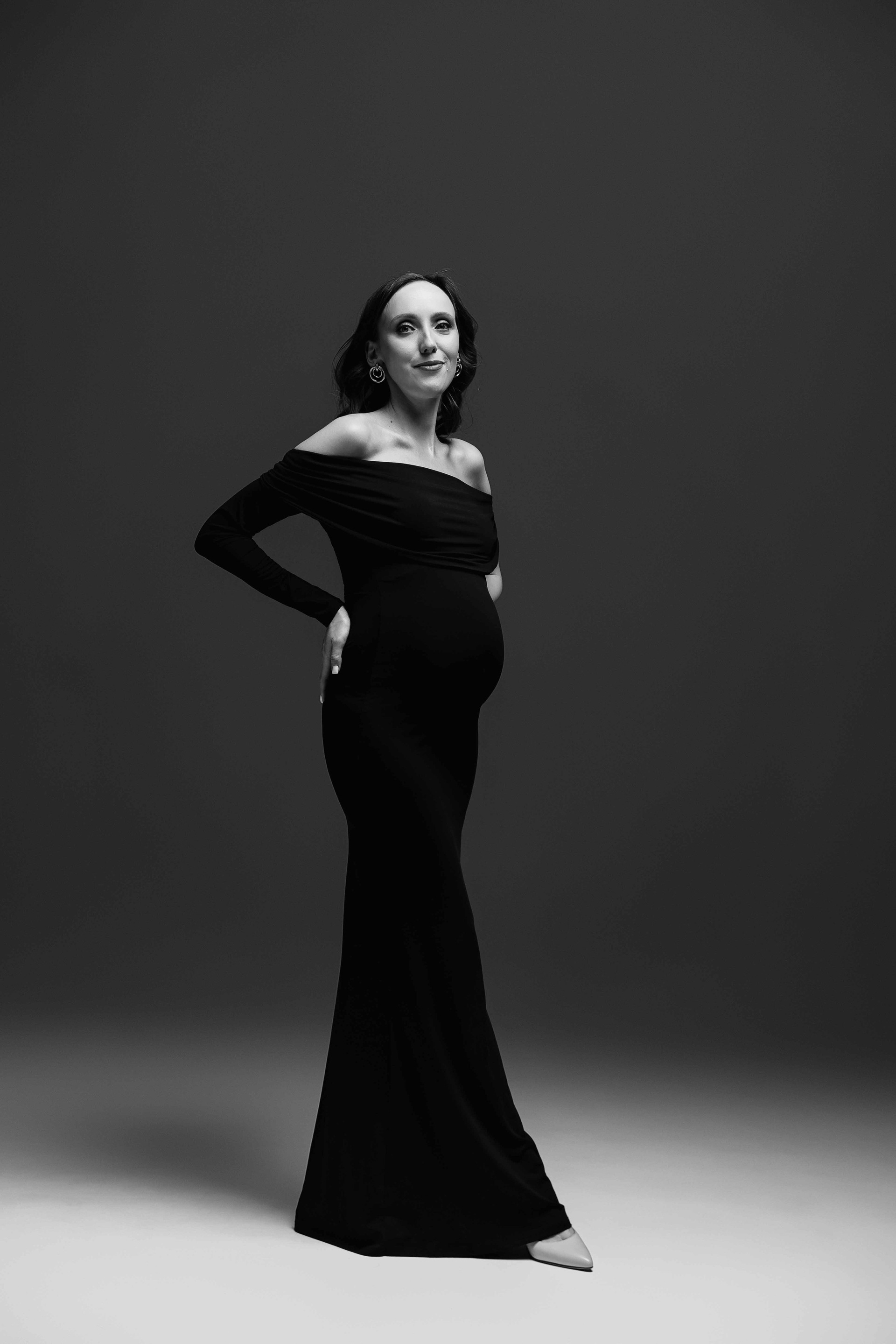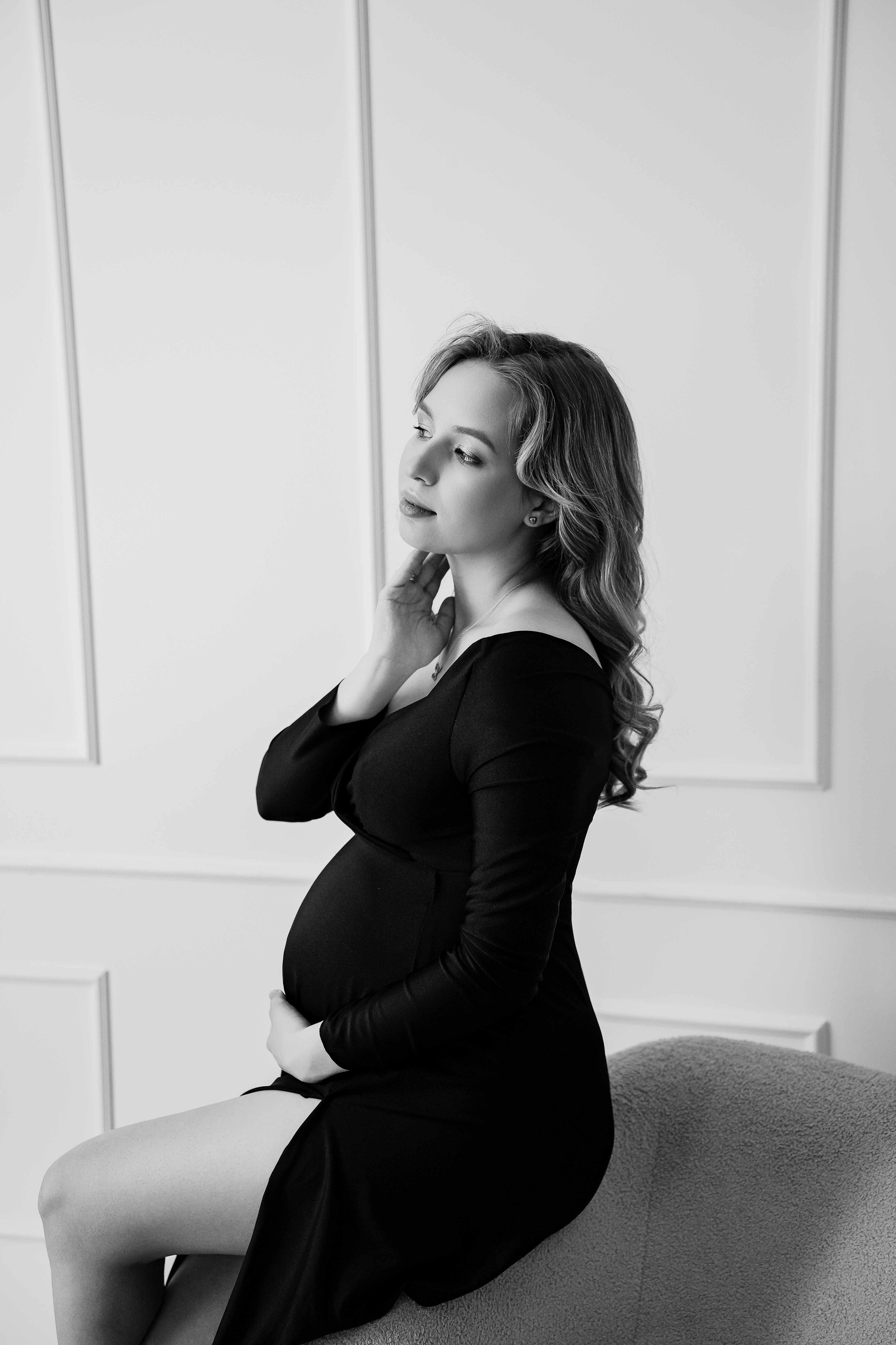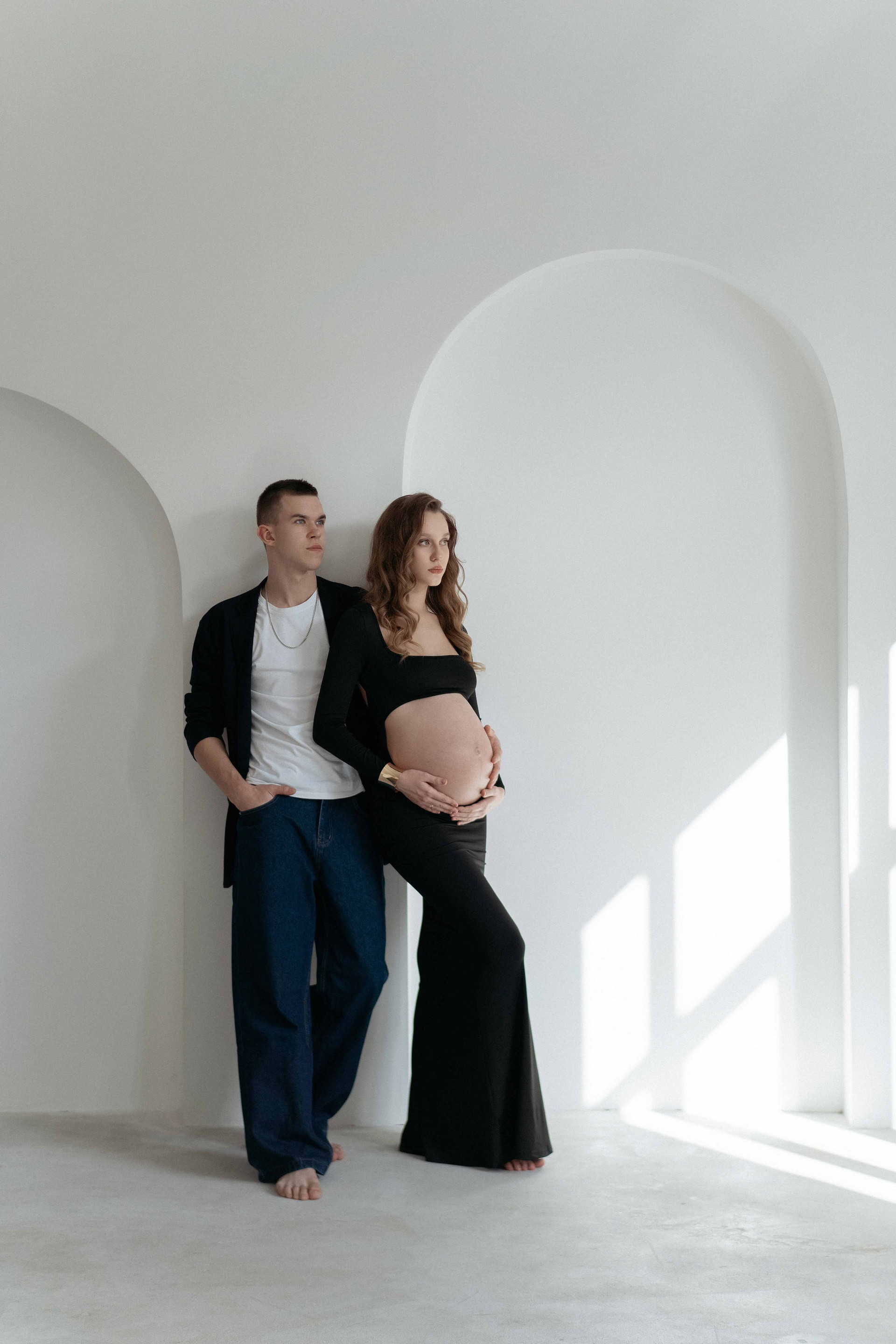 Эффектный чёрный кружевной комбинезон, который подчёркивает форму беременного животика и создаёт выразительный, женственный образ в студийной съёмке.