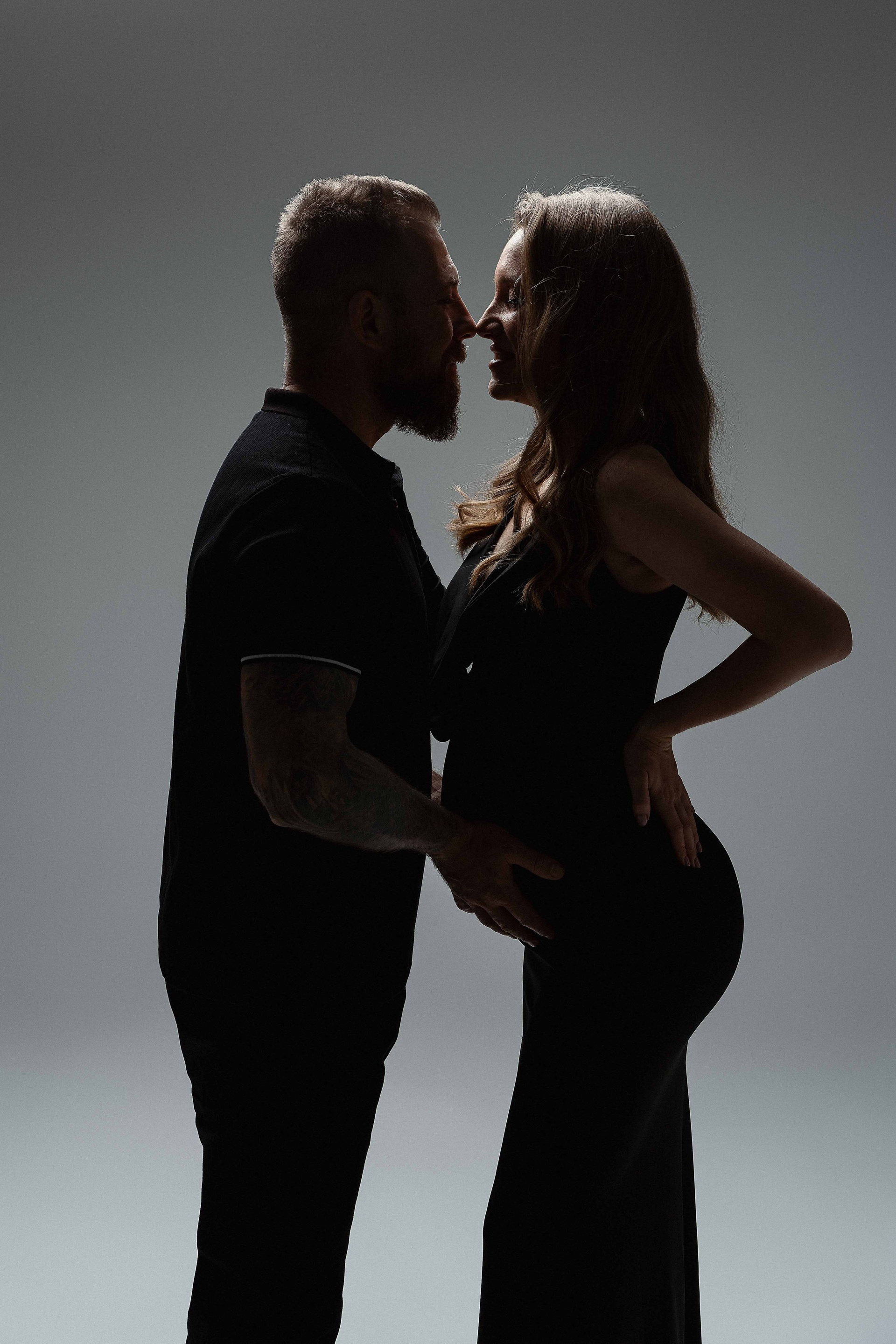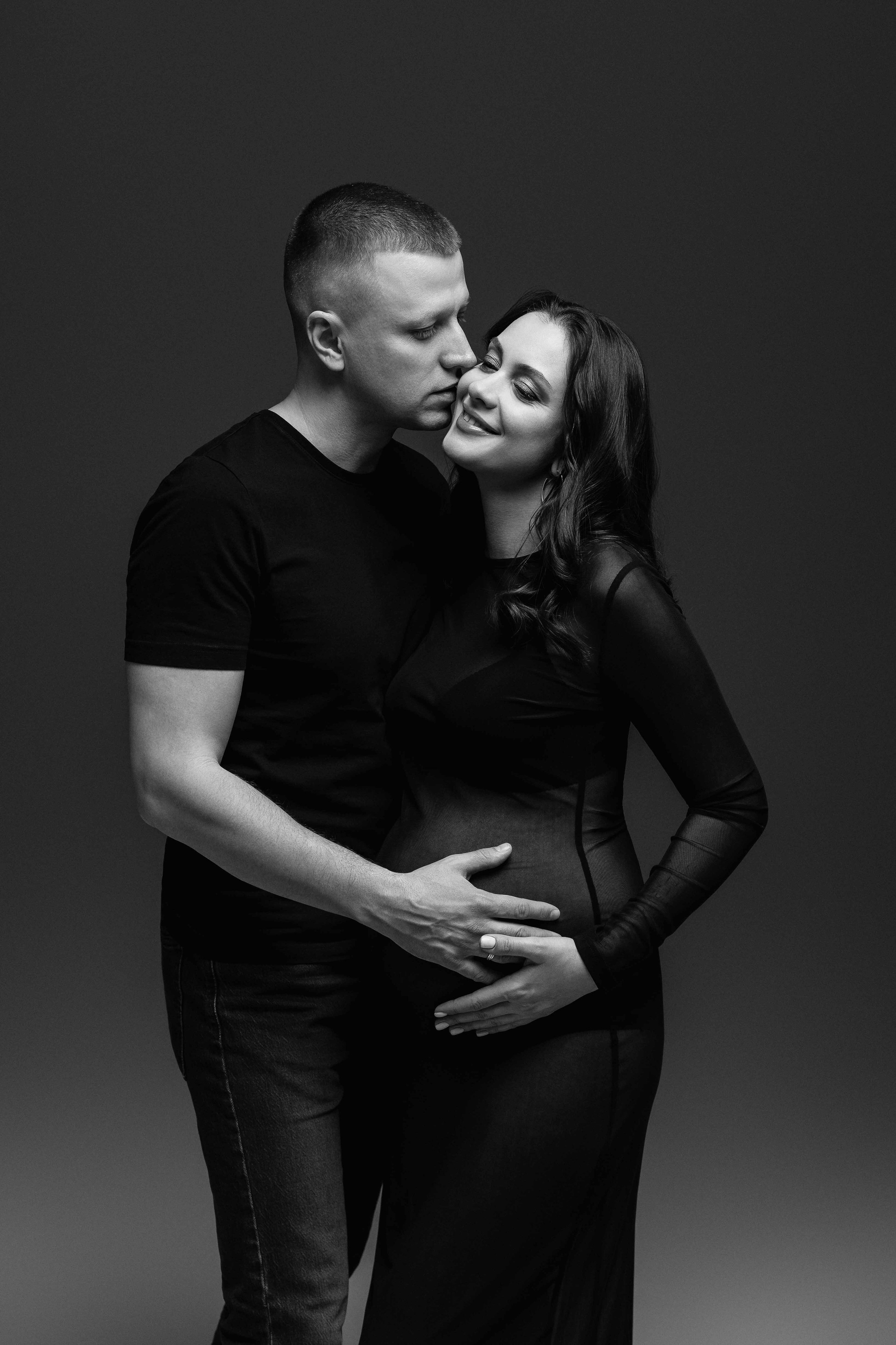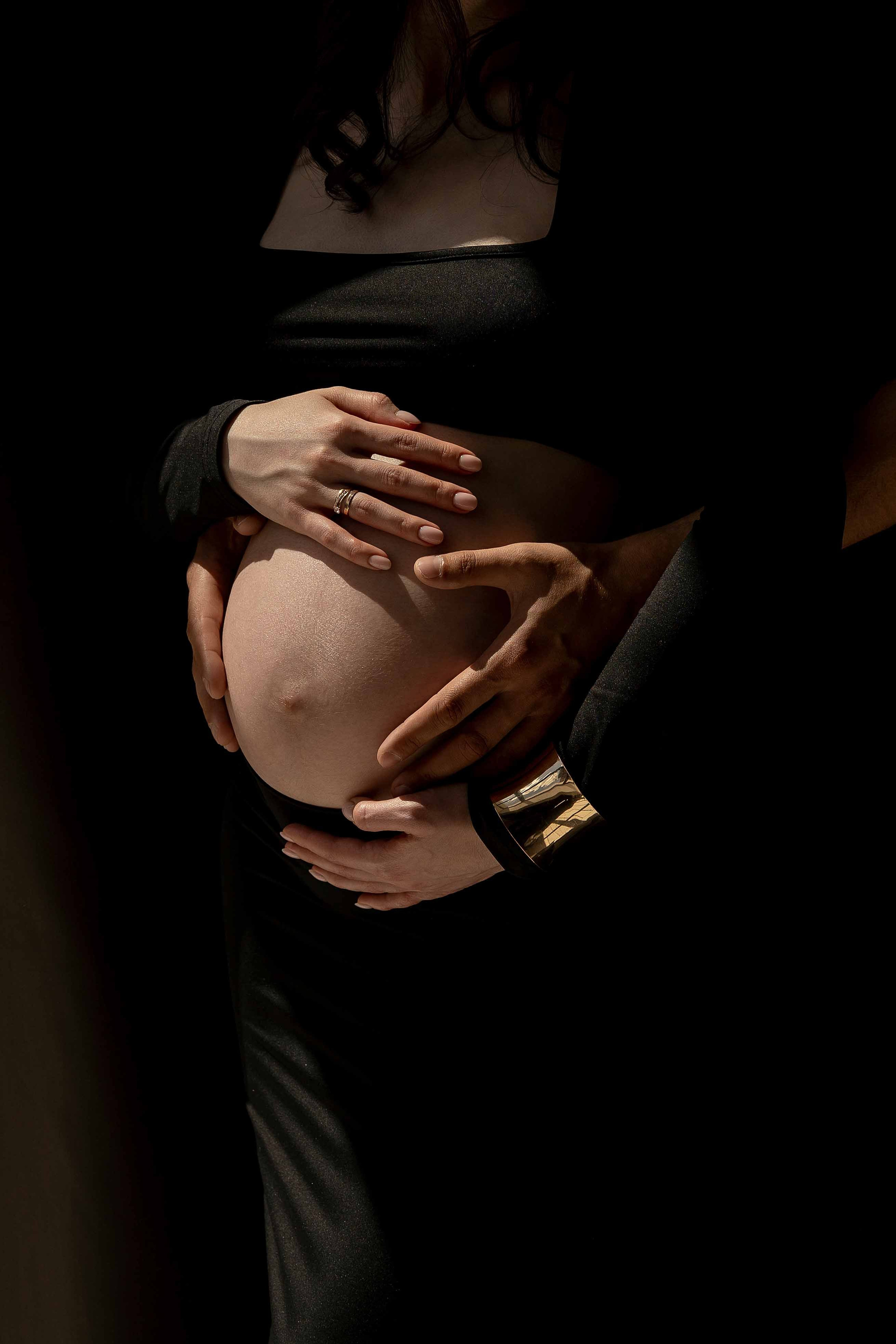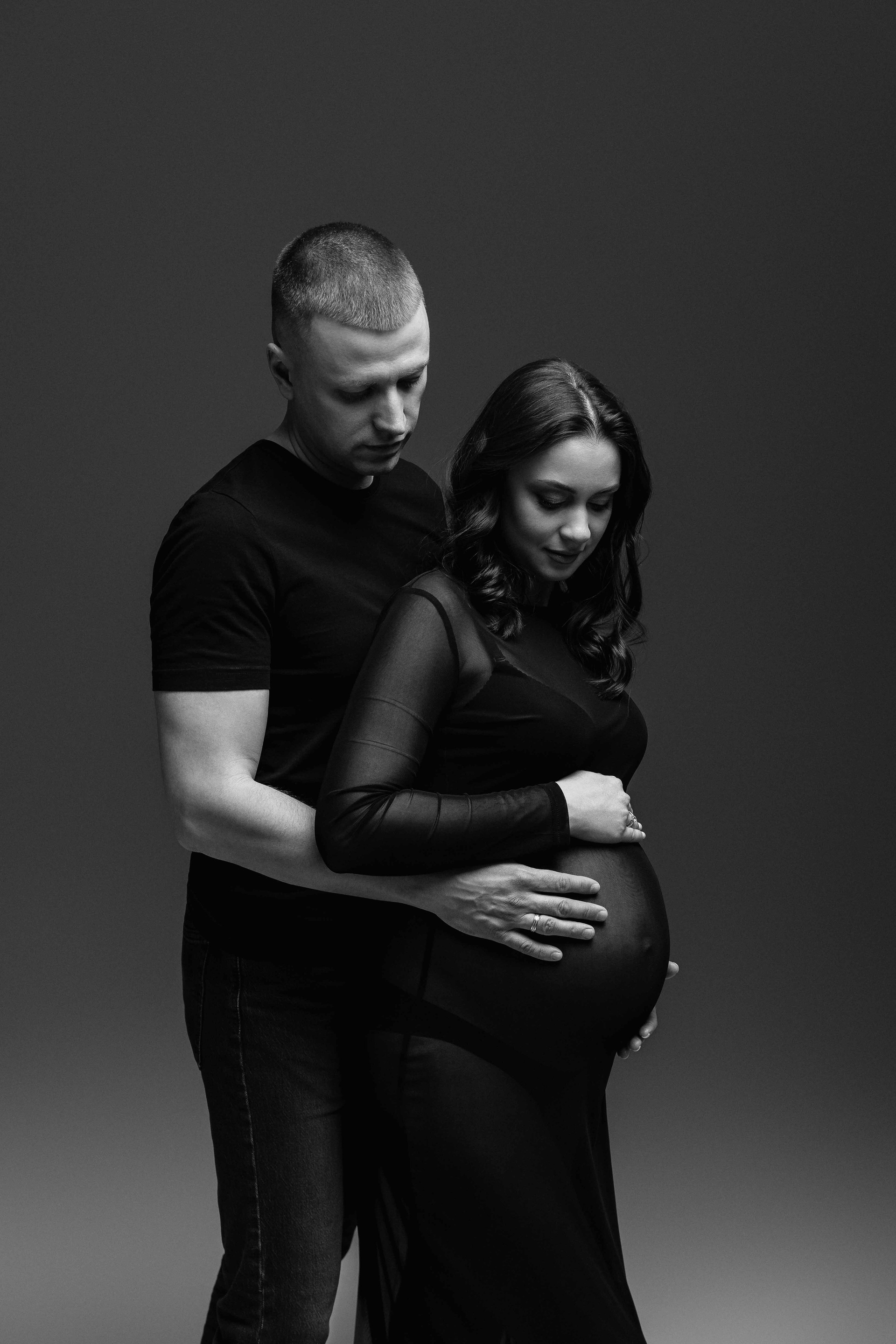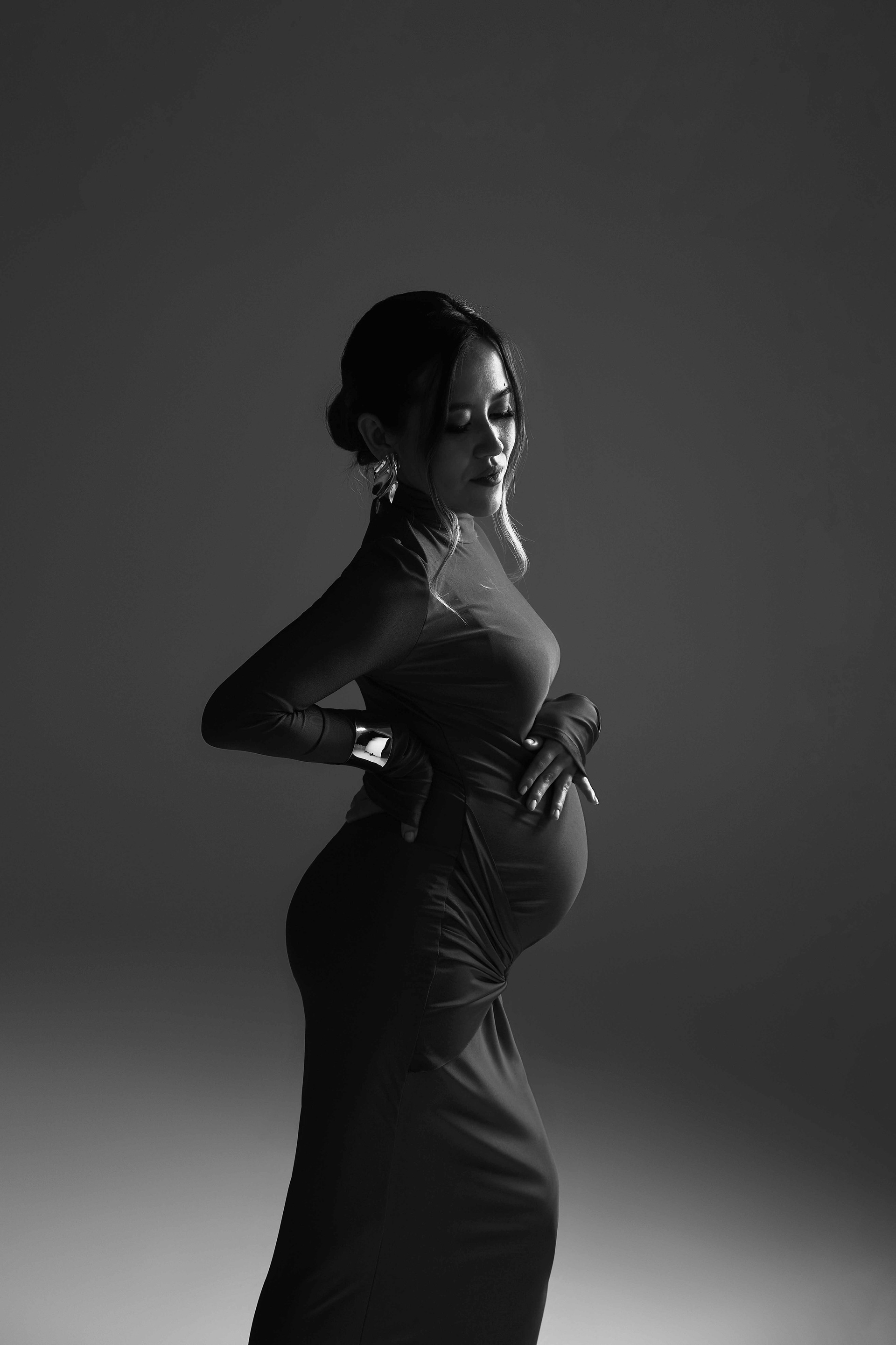 Эффектный чёрный кружевной комбинезон, который подчёркивает форму беременного животика и создаёт выразительный, женственный образ в студийной съёмке.