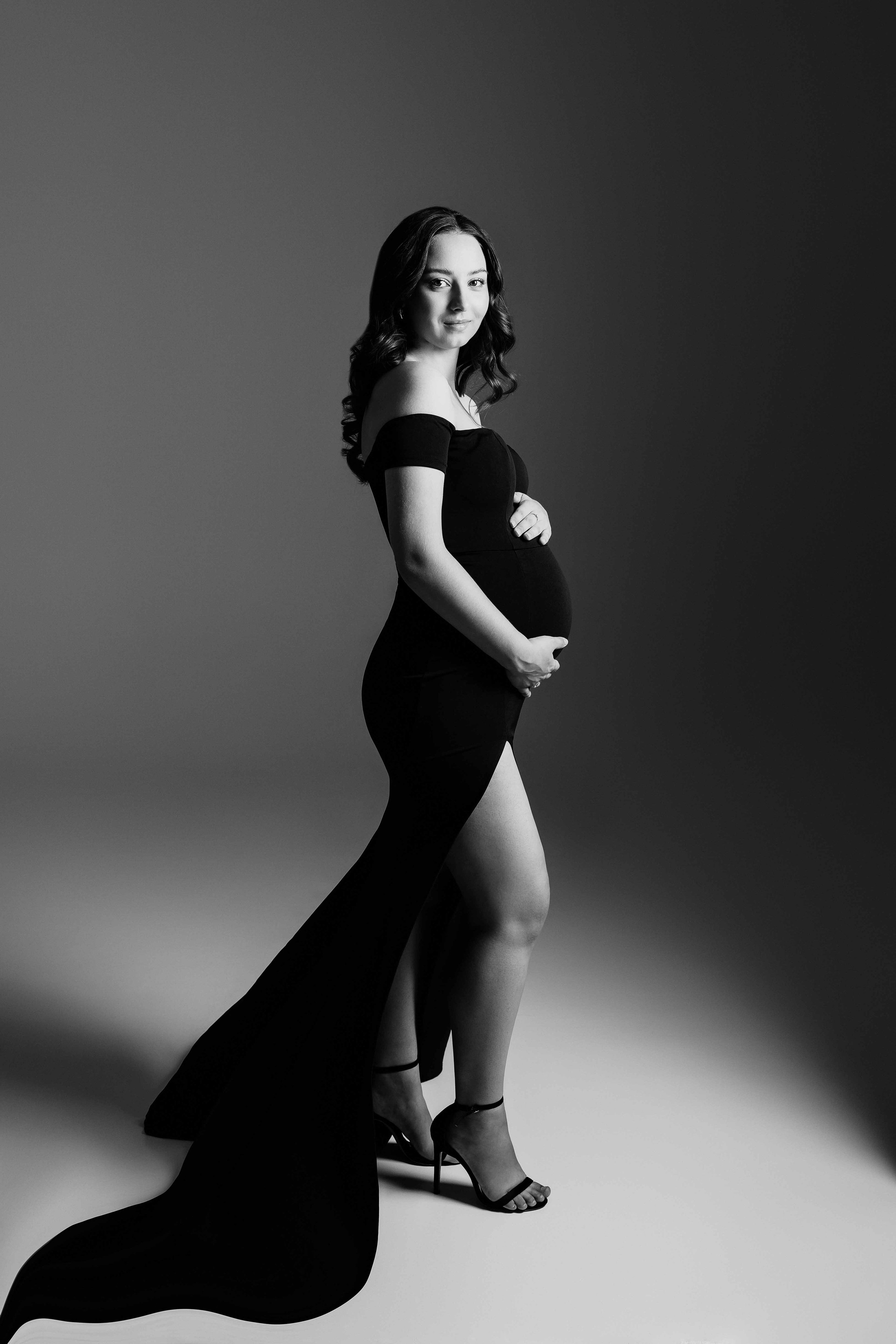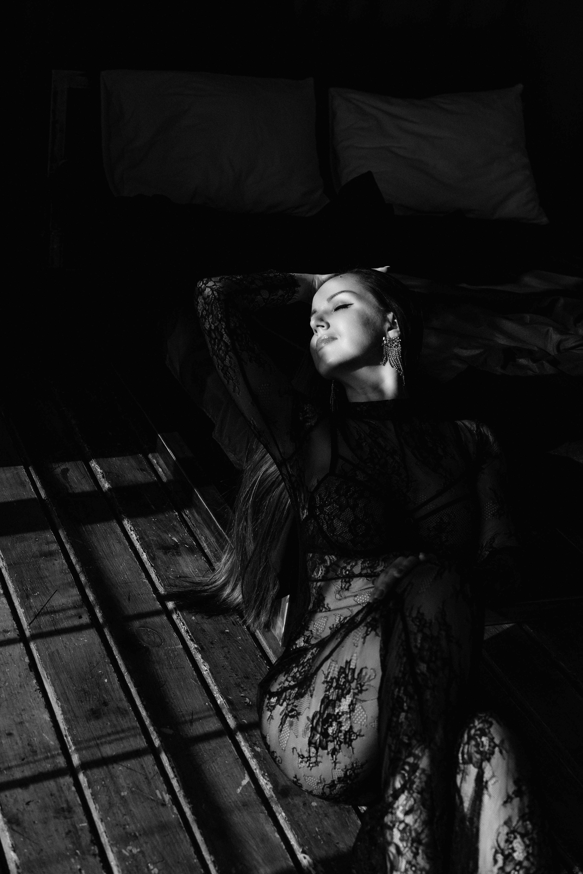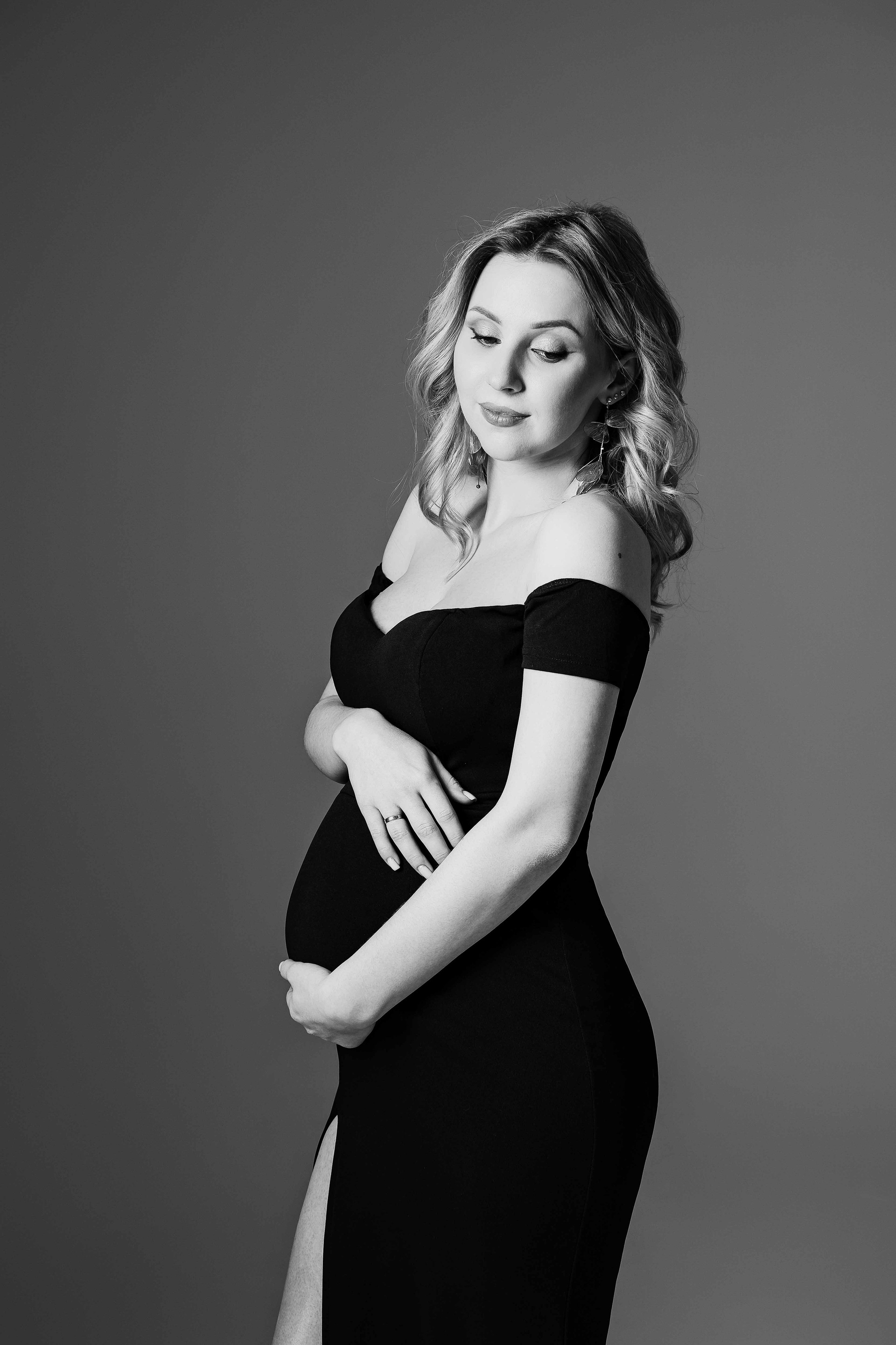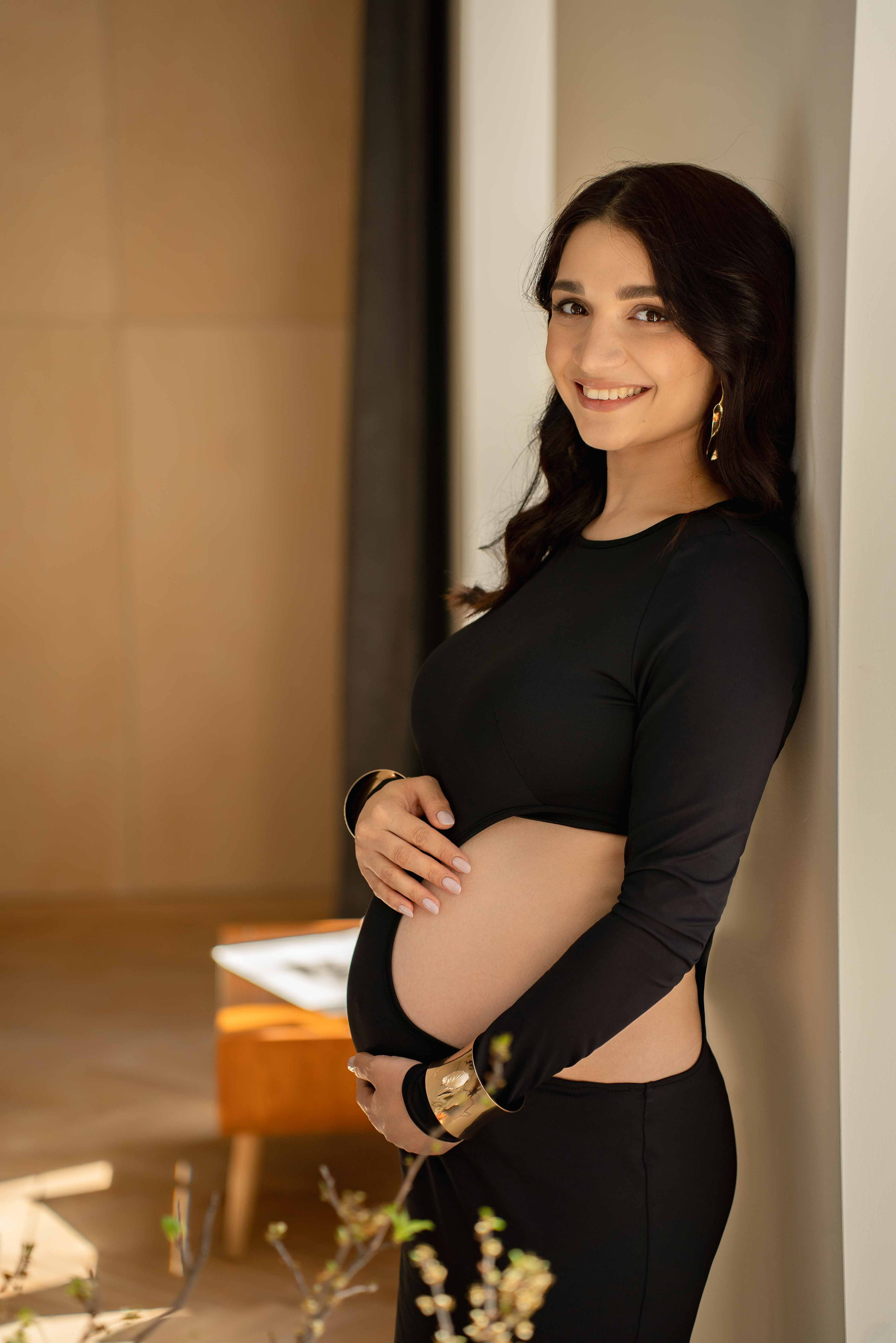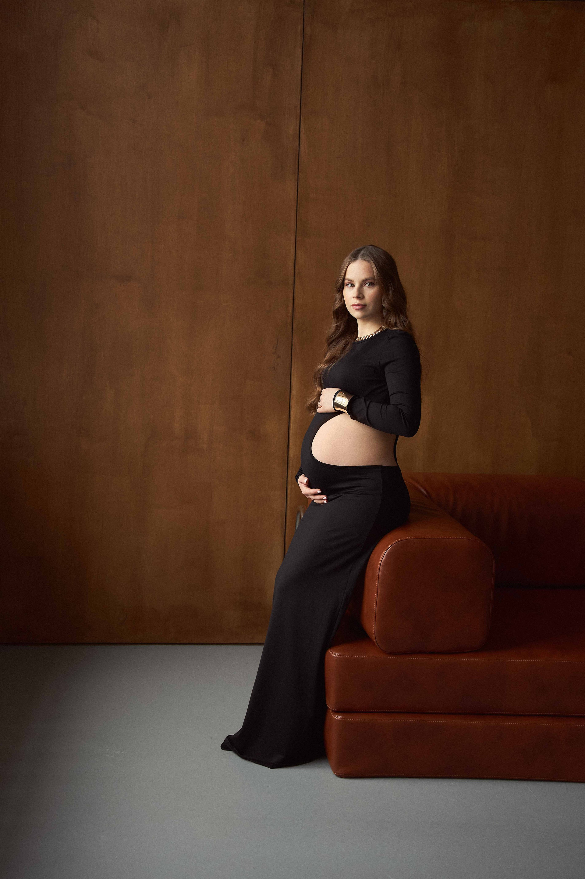 Эффектный чёрный кружевной комбинезон, который подчёркивает форму беременного животика и создаёт выразительный, женственный образ в студийной съёмке.