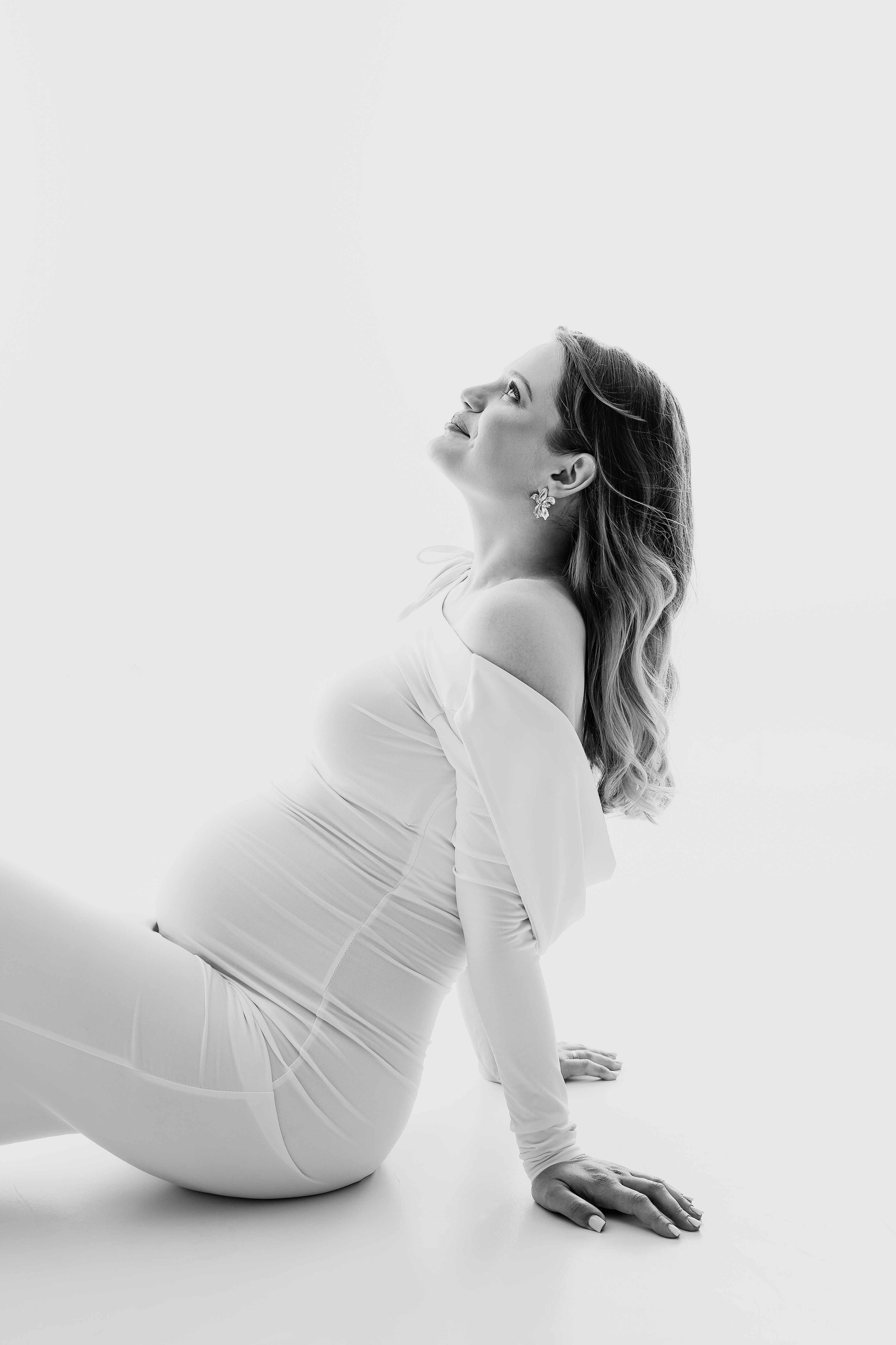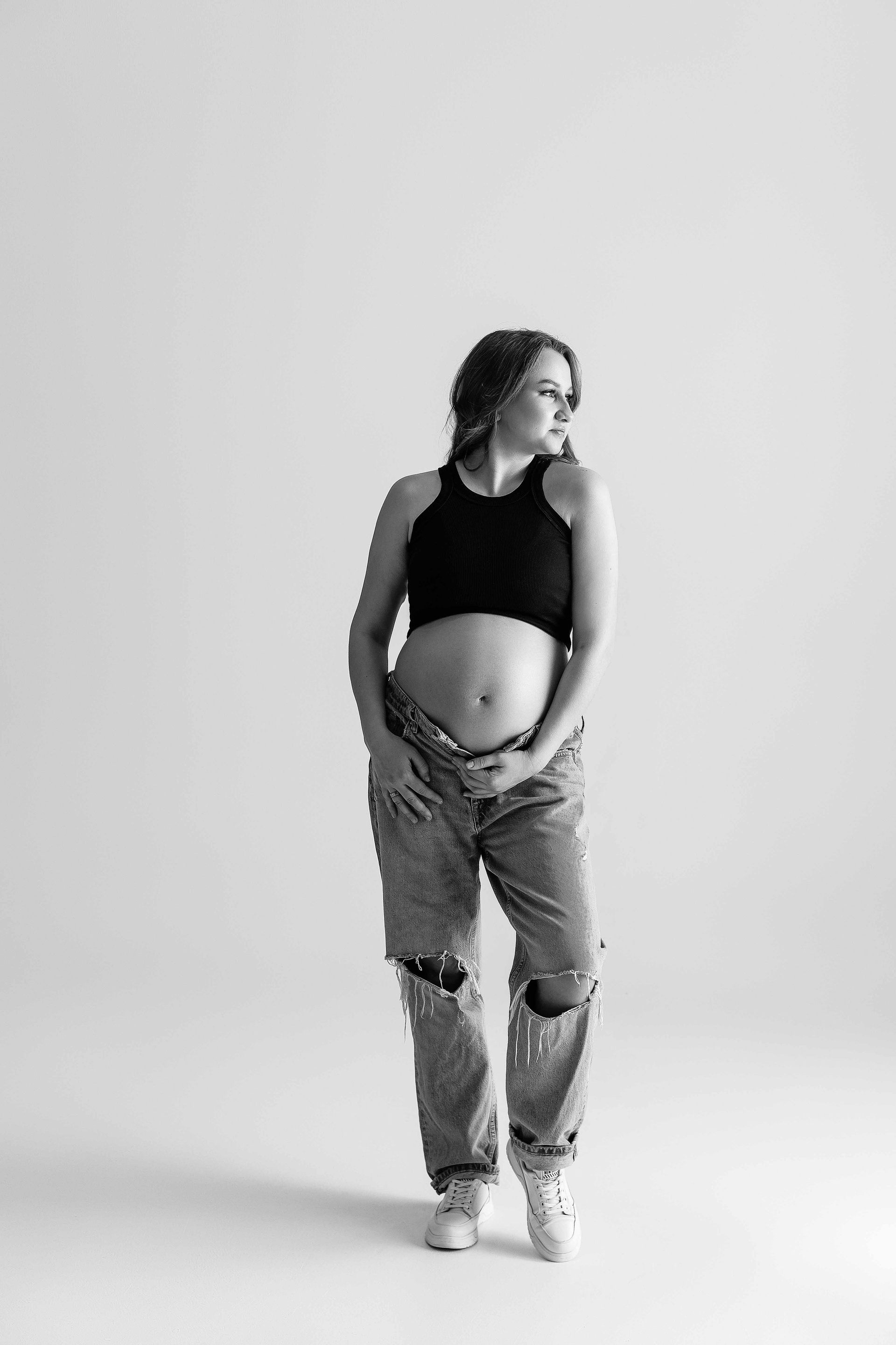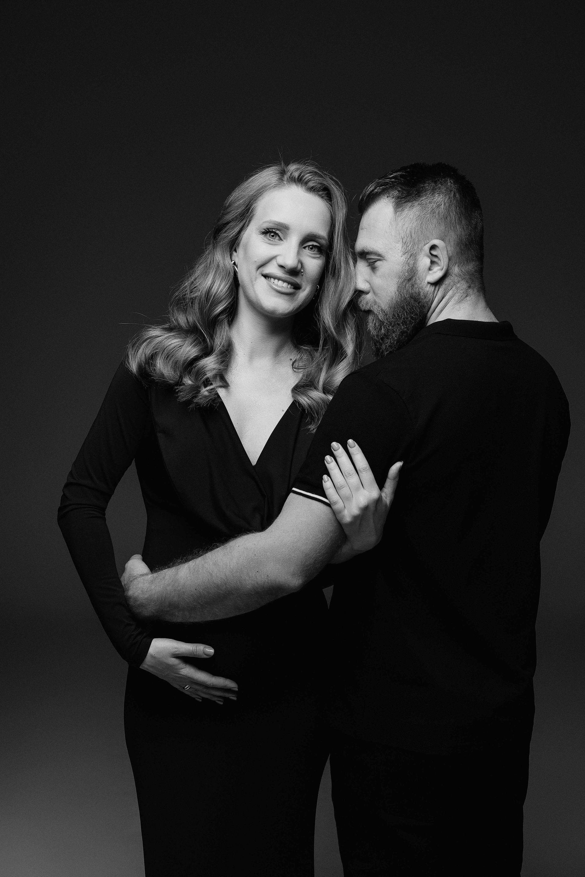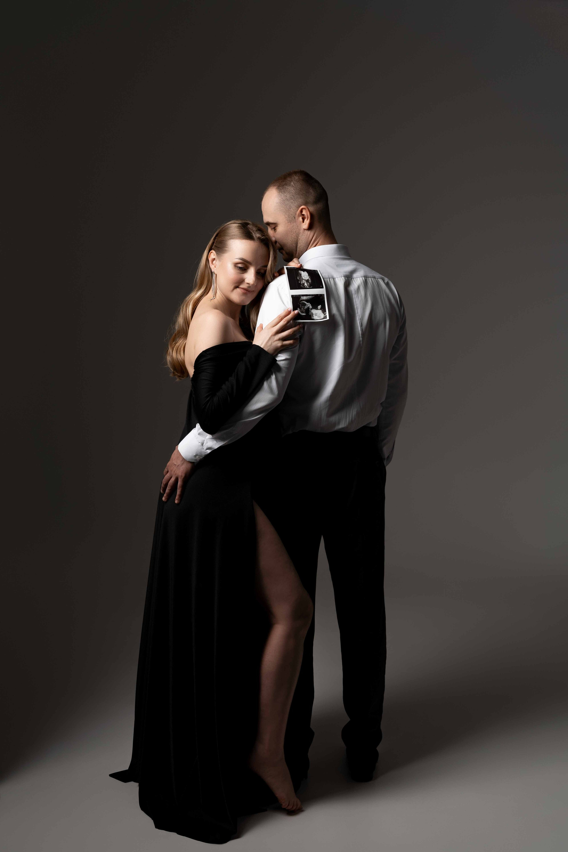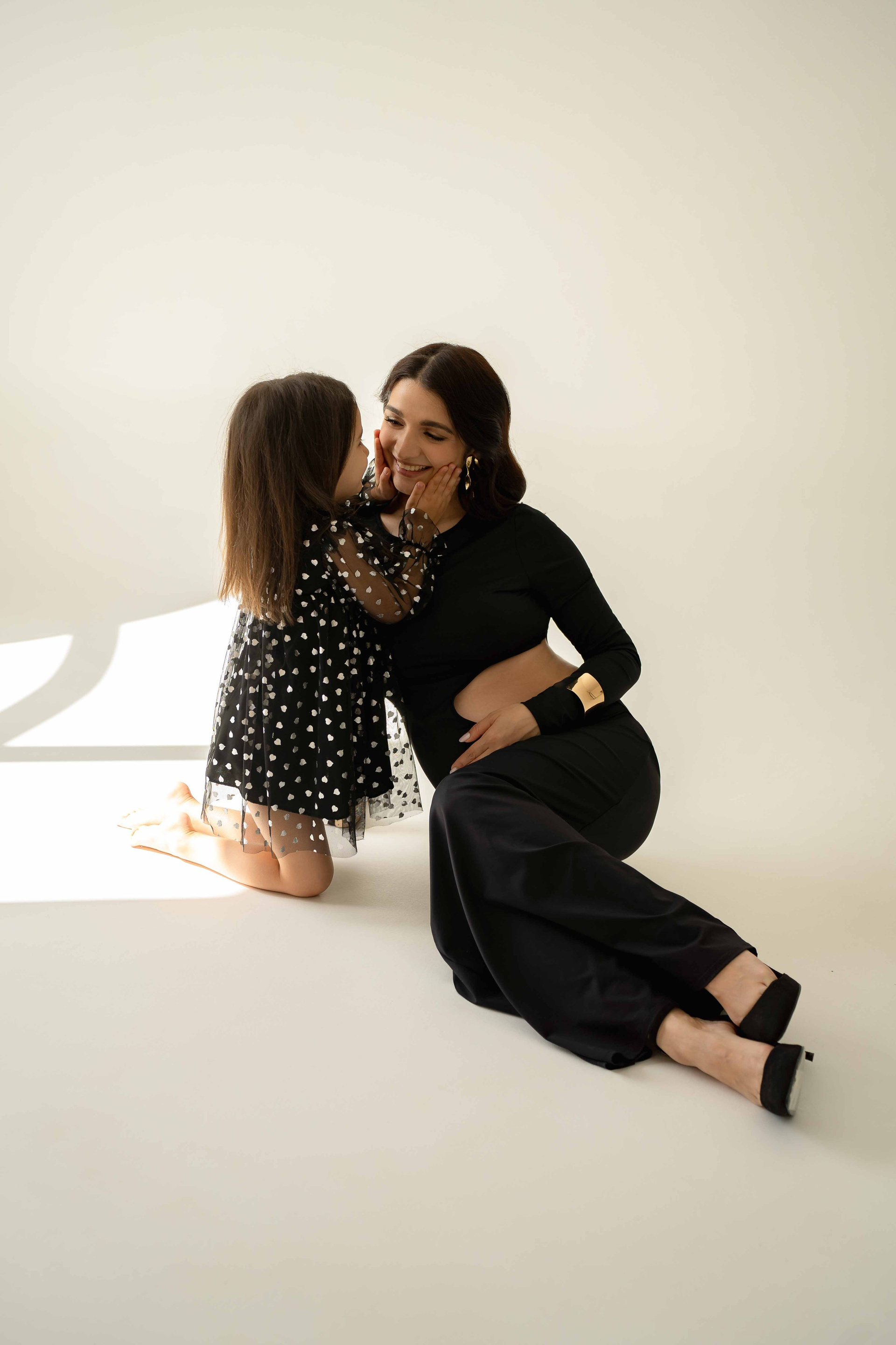 Эффектный чёрный кружевной комбинезон, который подчёркивает форму беременного животика и создаёт выразительный, женственный образ в студийной съёмке.