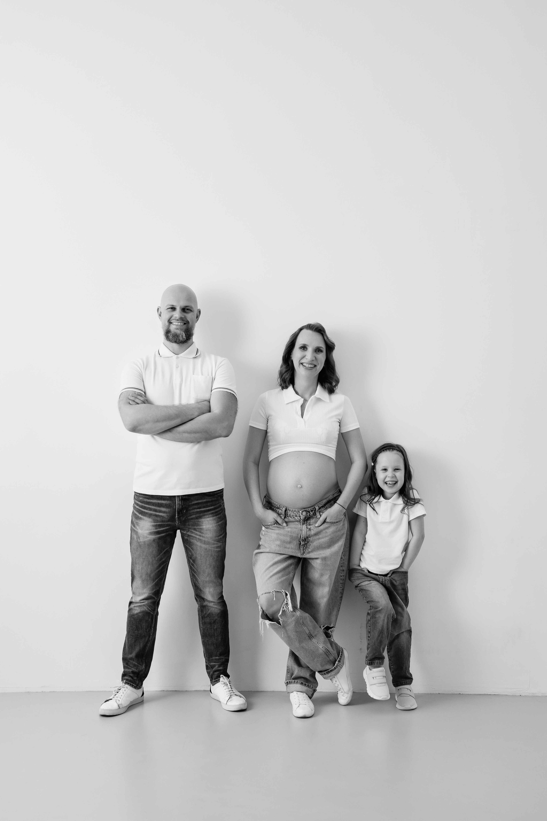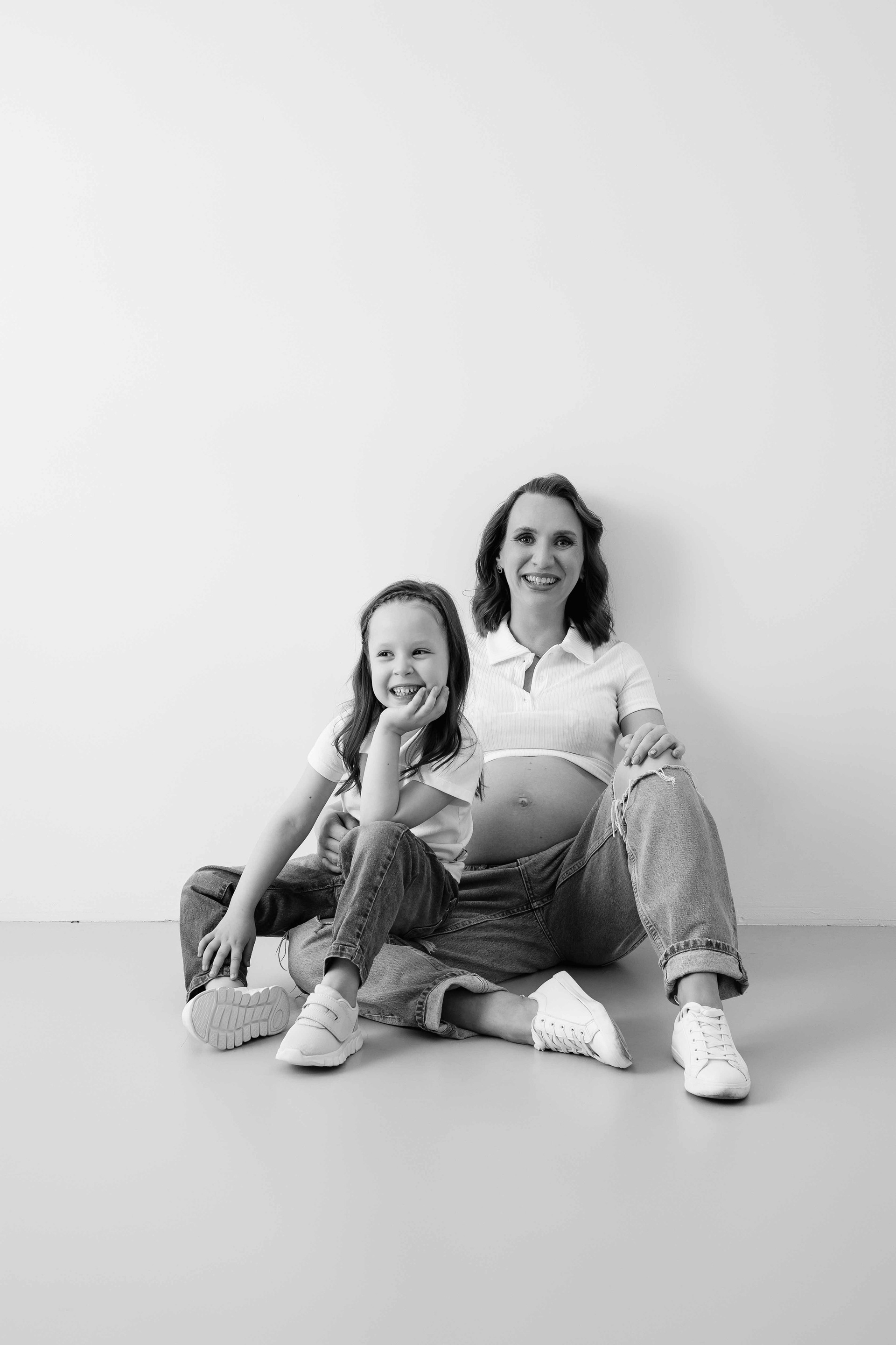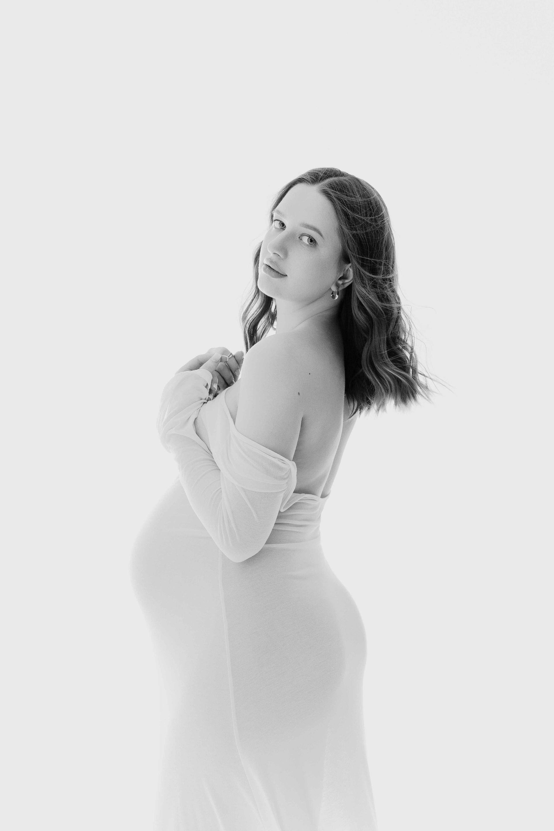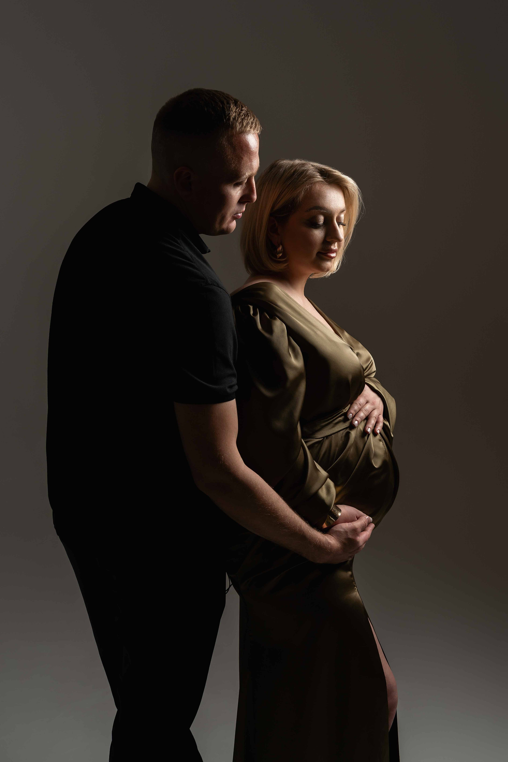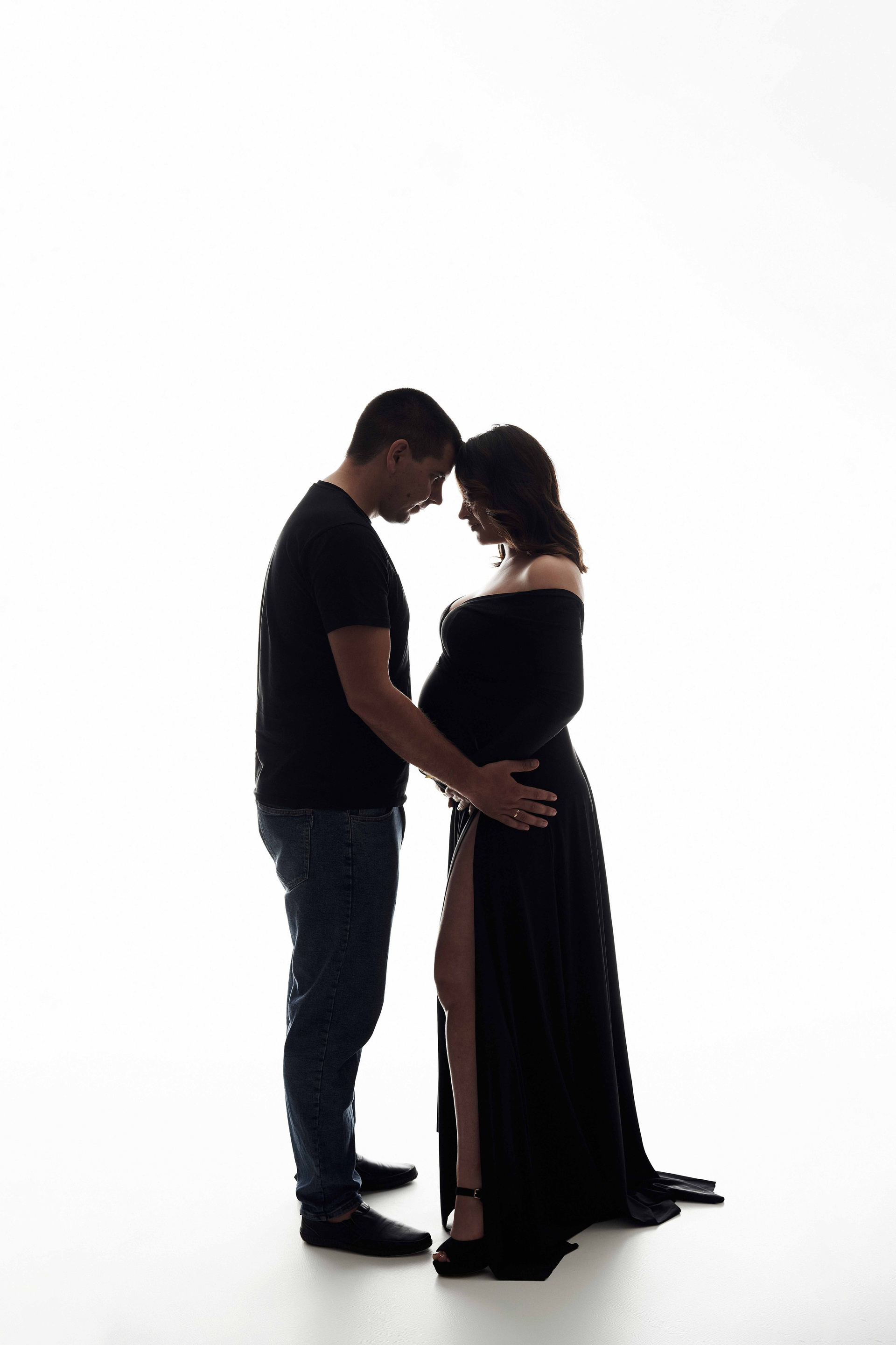 Эффектный чёрный кружевной комбинезон, который подчёркивает форму беременного животика и создаёт выразительный, женственный образ в студийной съёмке.