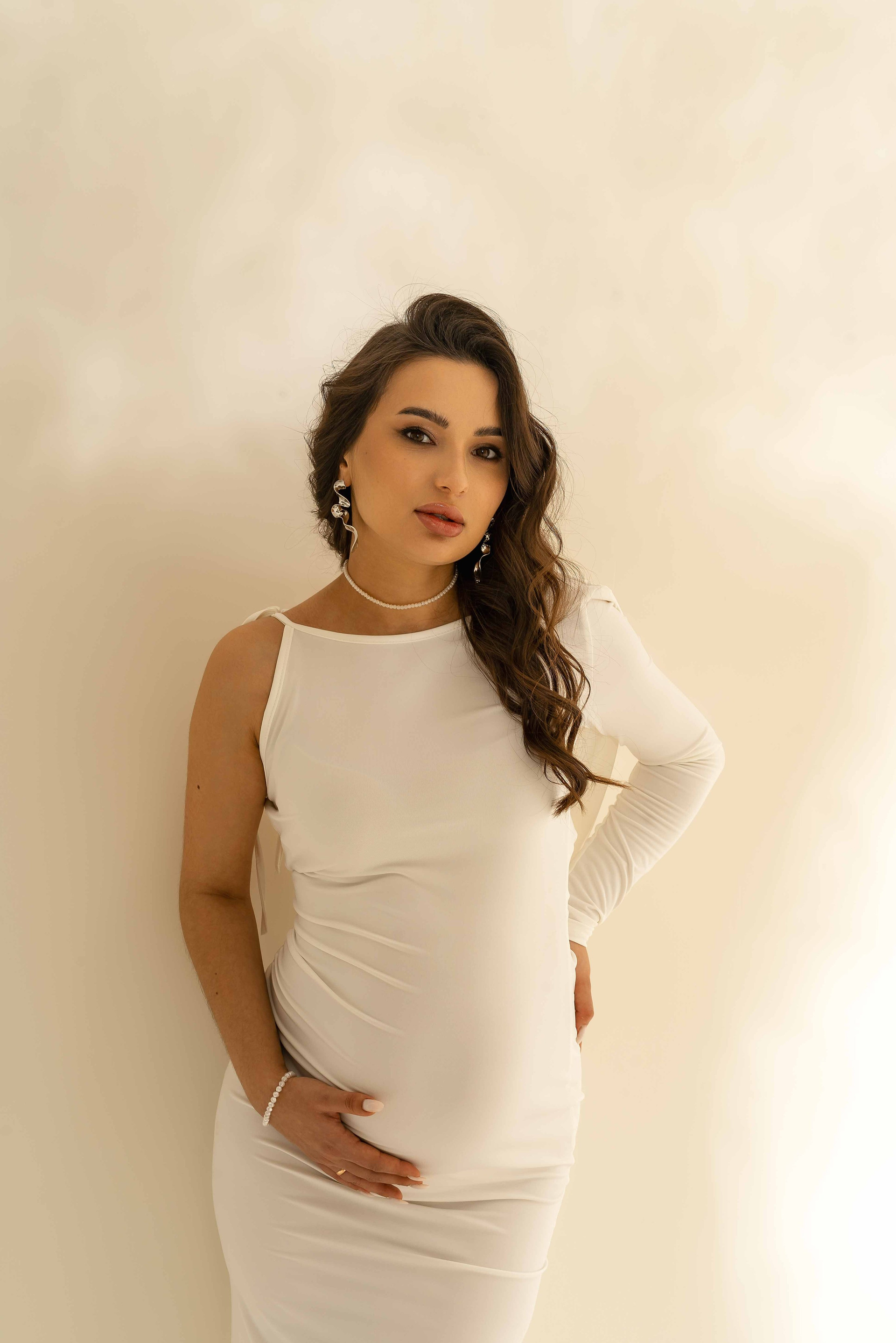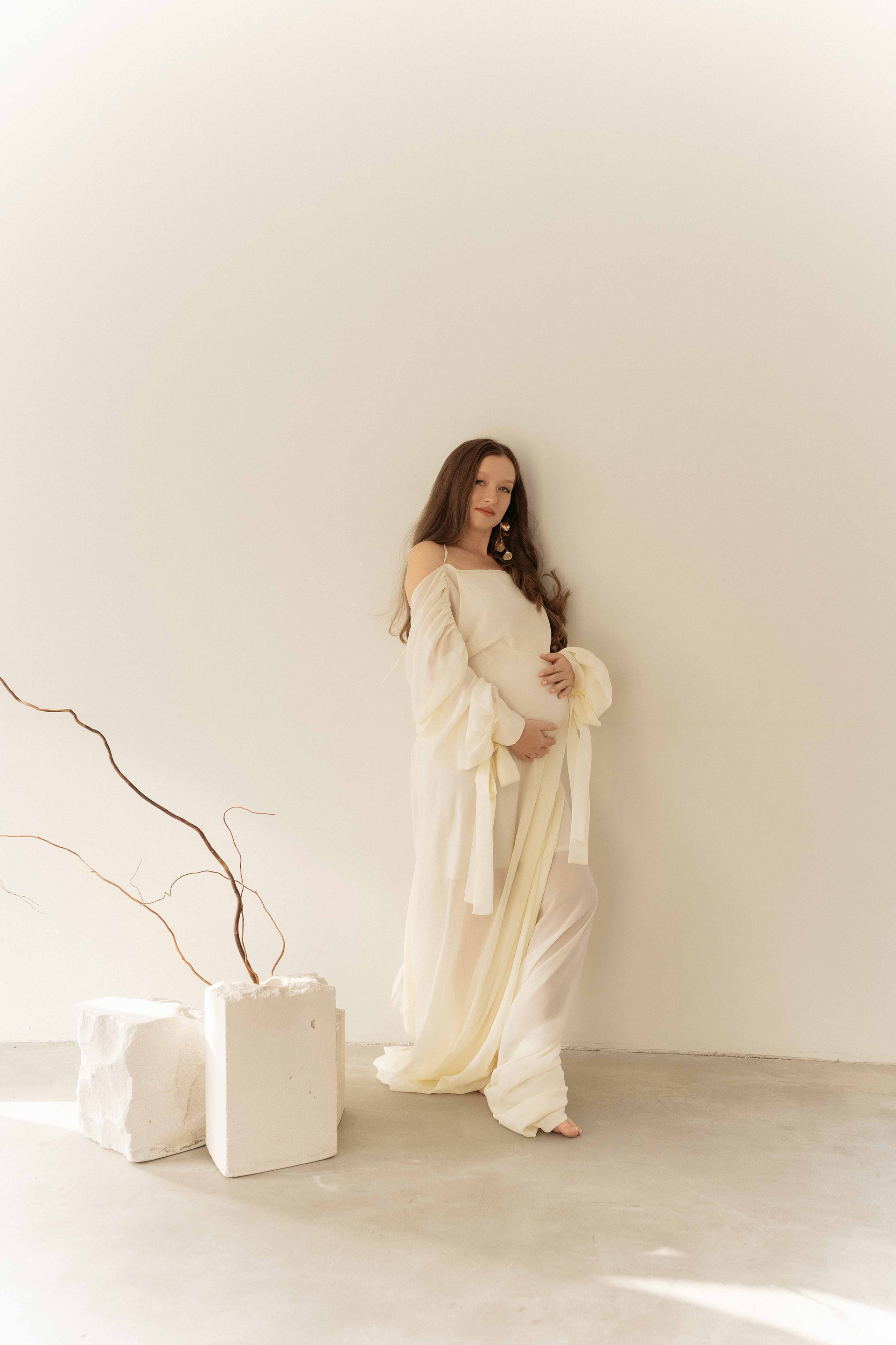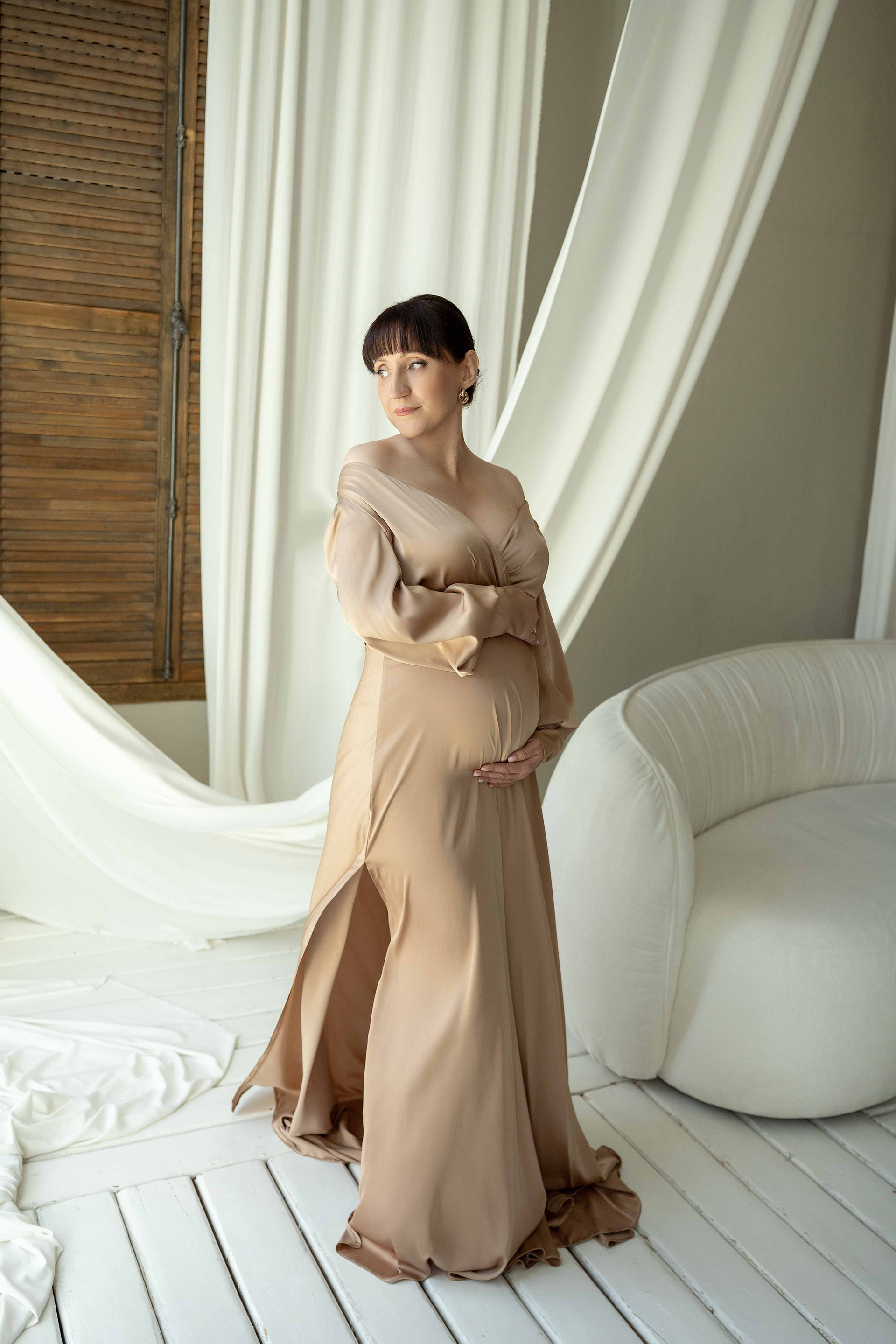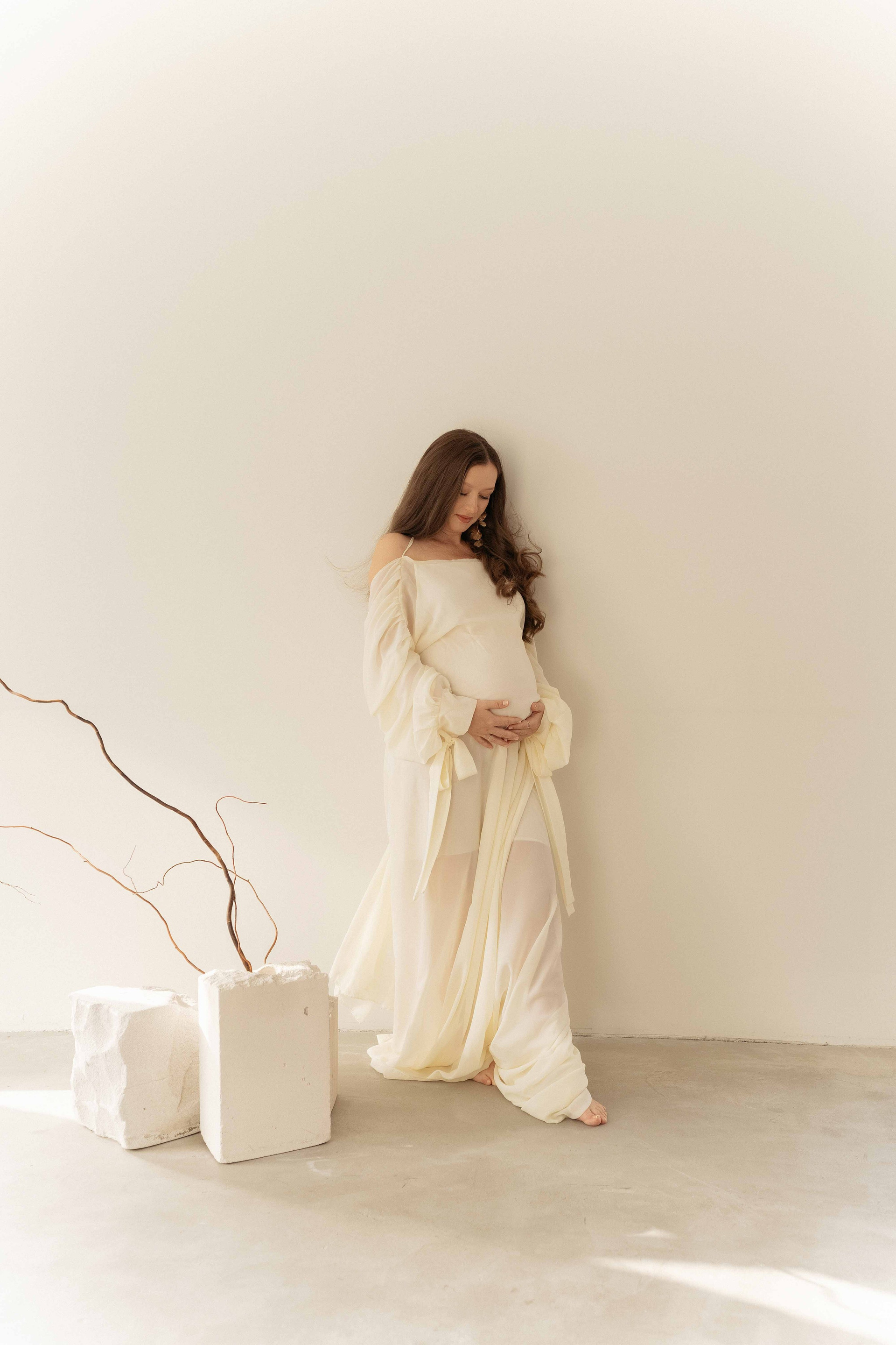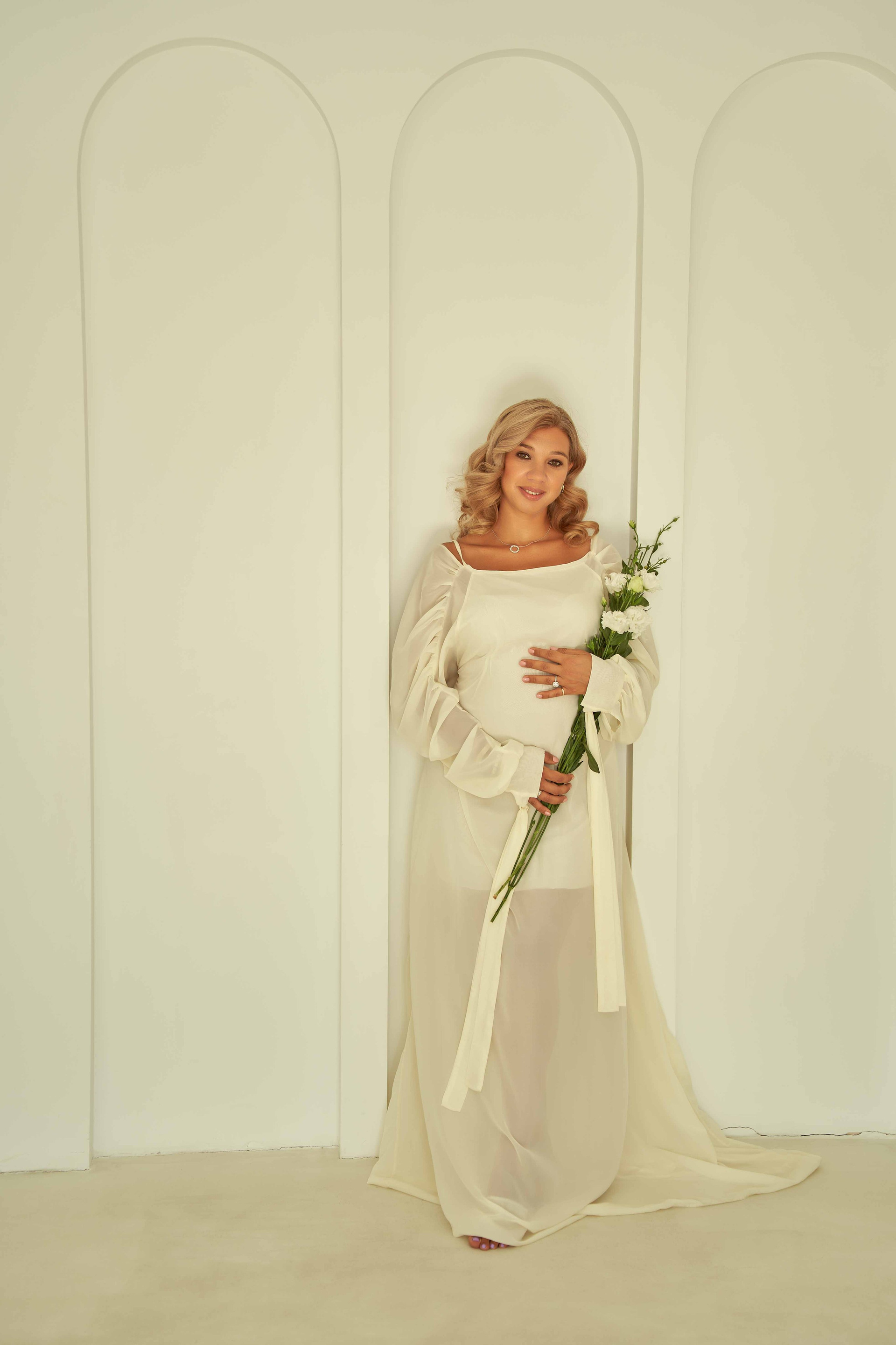 Модель one size, с асимметрией рукавов: один рукав открыт, другой — закрыт, что делает образ особенно мягким и выразительным. При поддержке животика в кадре получаются очень нежные, трогательные фотографии.