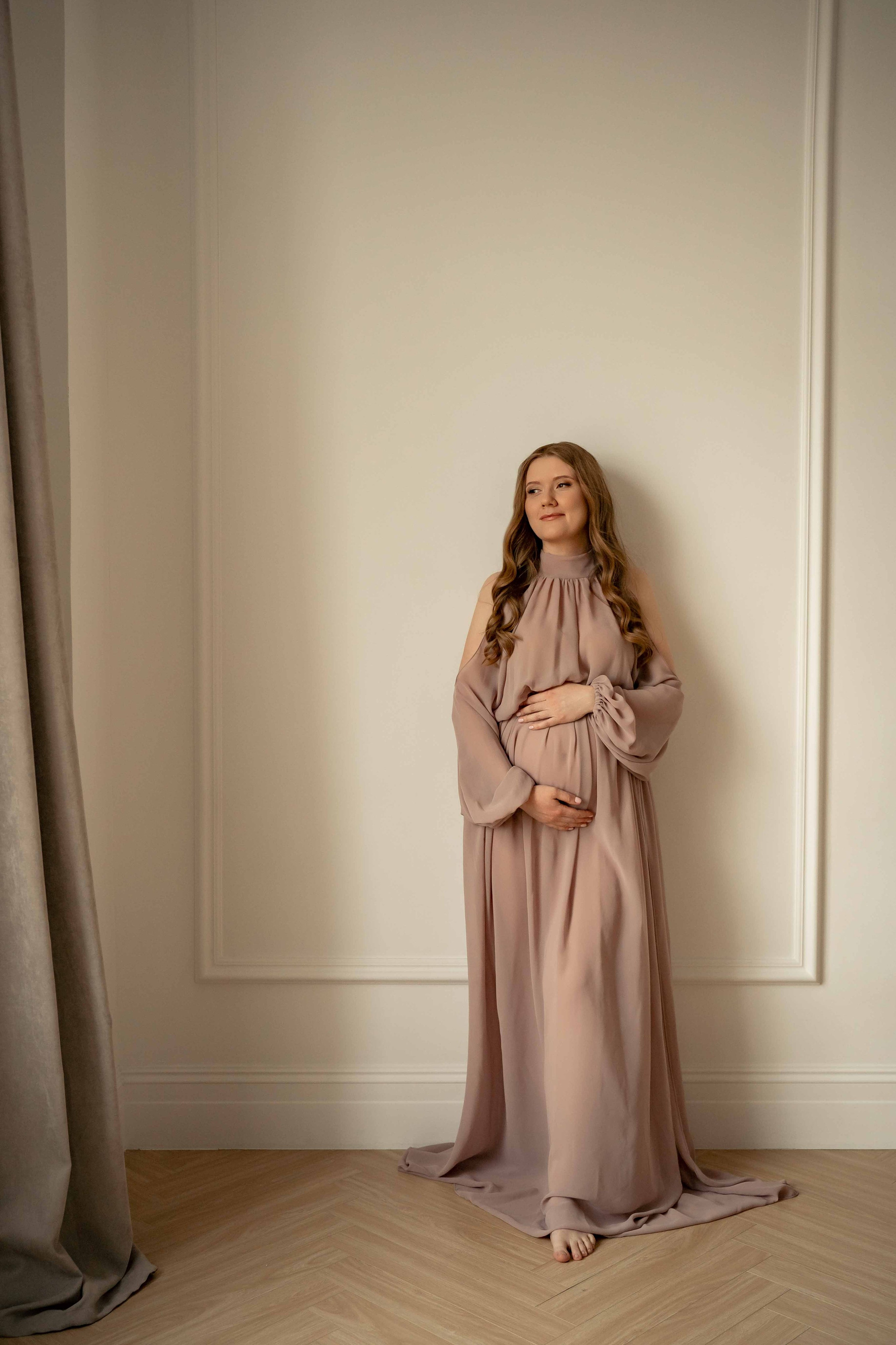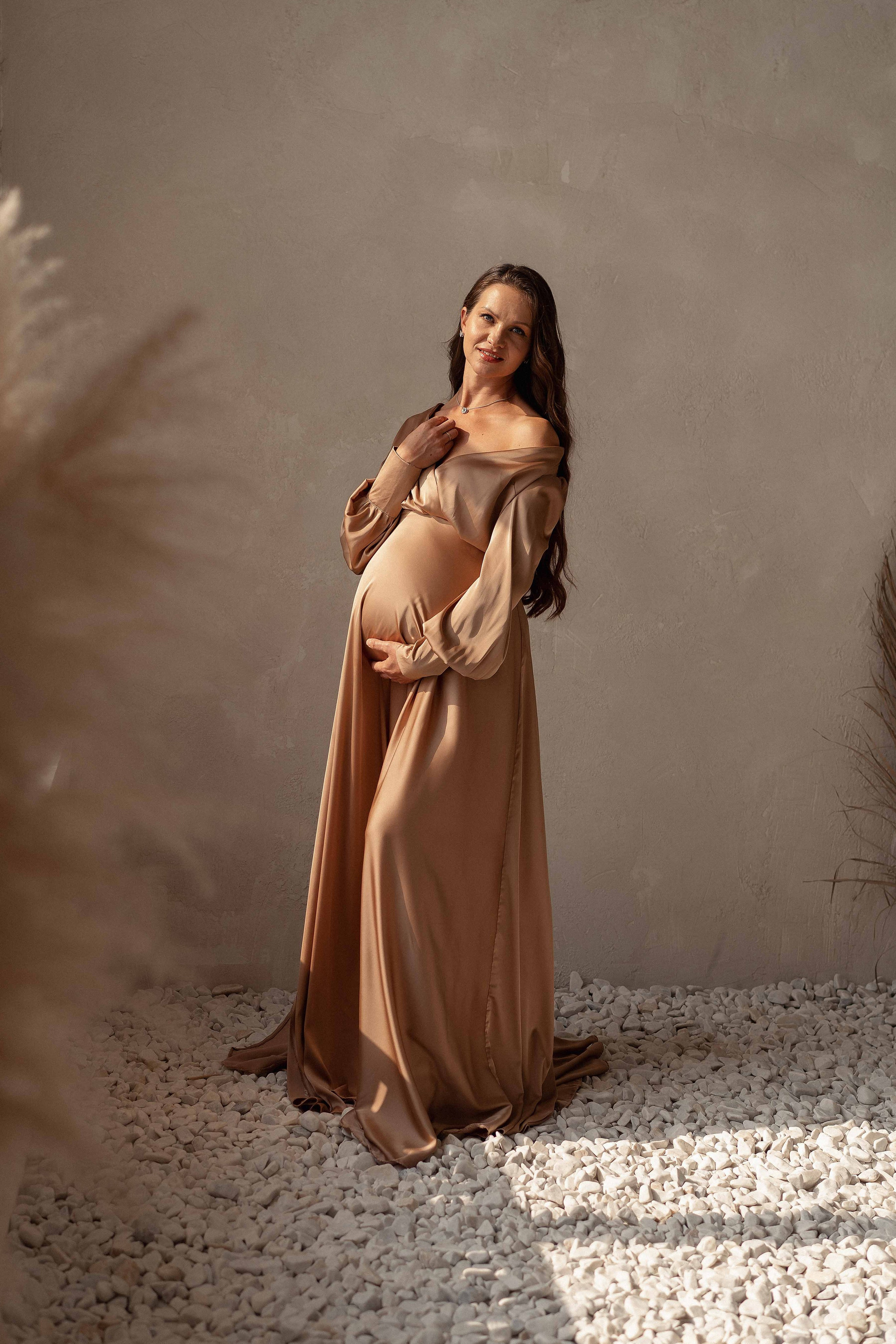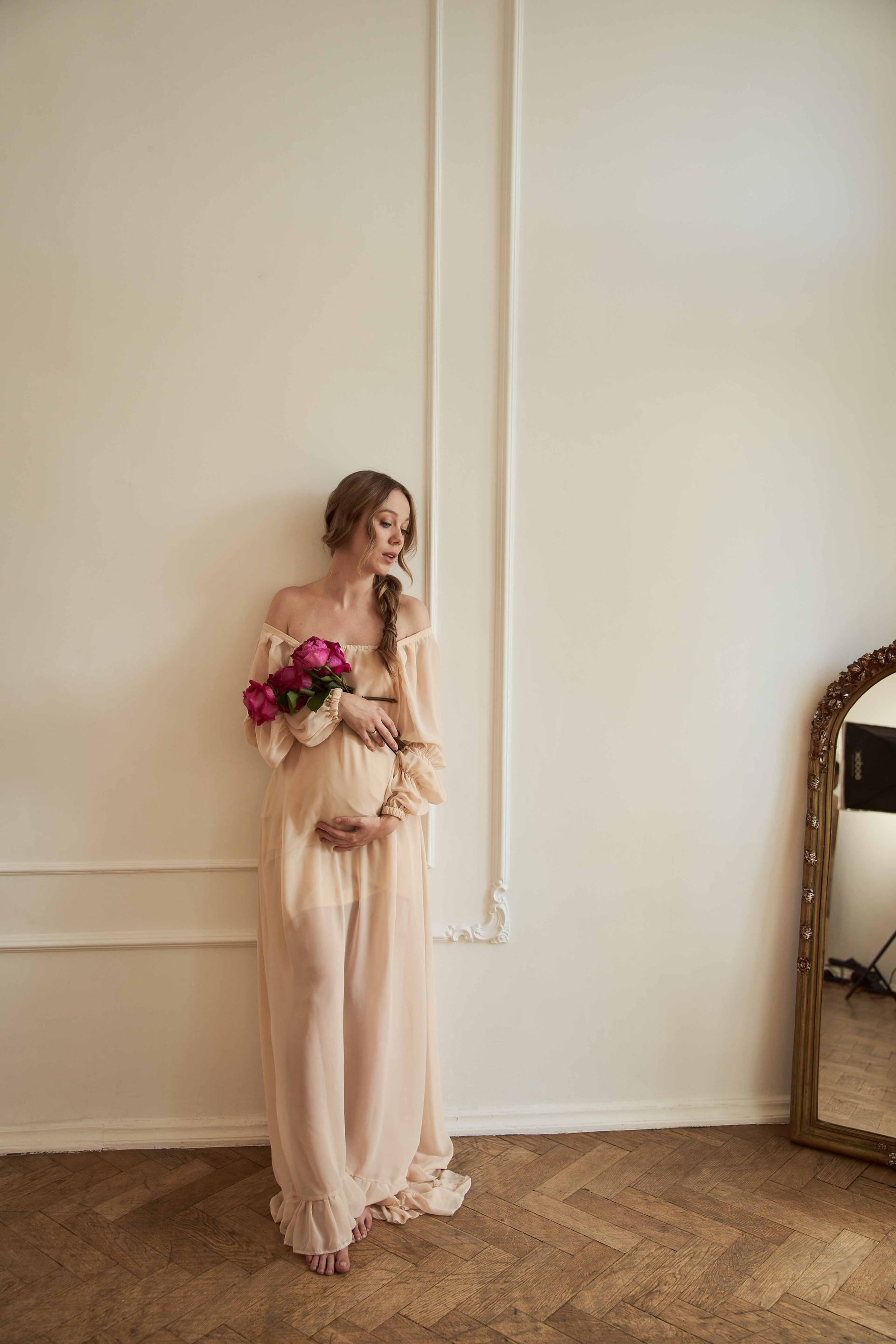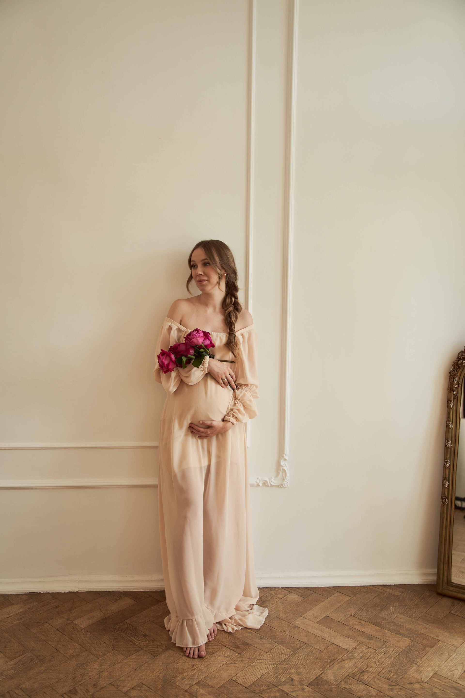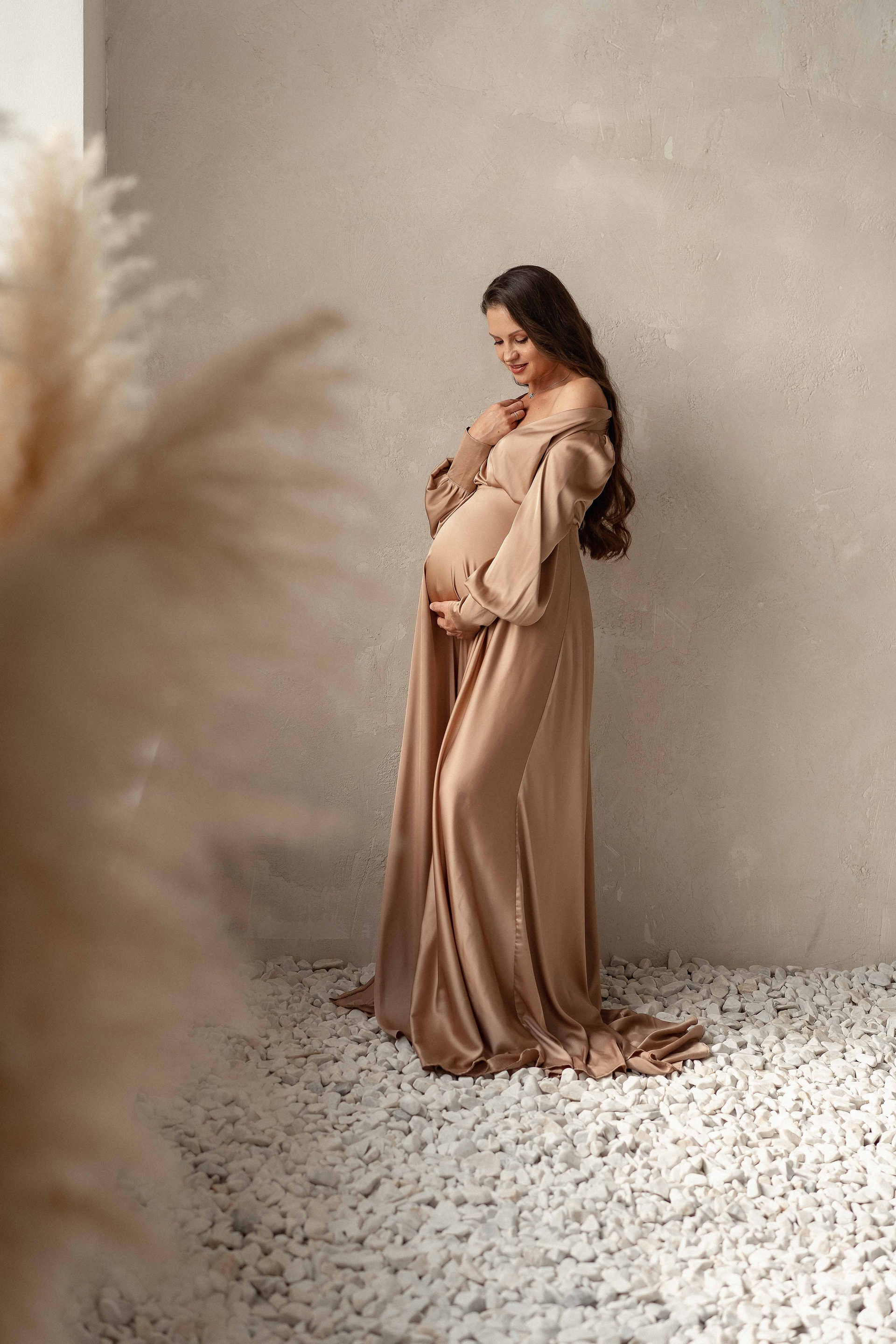 Модель one size, с асимметрией рукавов: один рукав открыт, другой — закрыт, что делает образ особенно мягким и выразительным. При поддержке животика в кадре получаются очень нежные, трогательные фотографии.