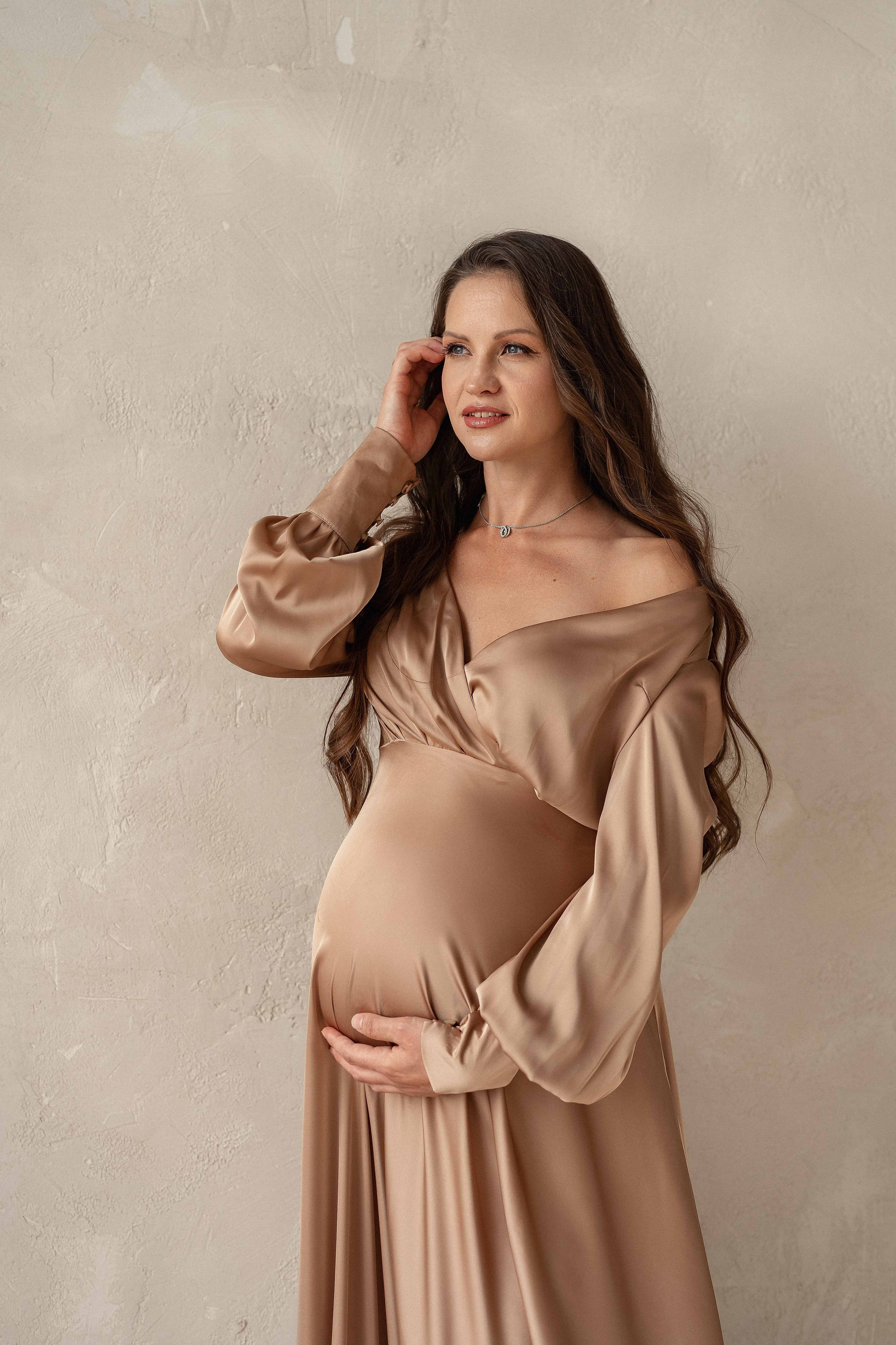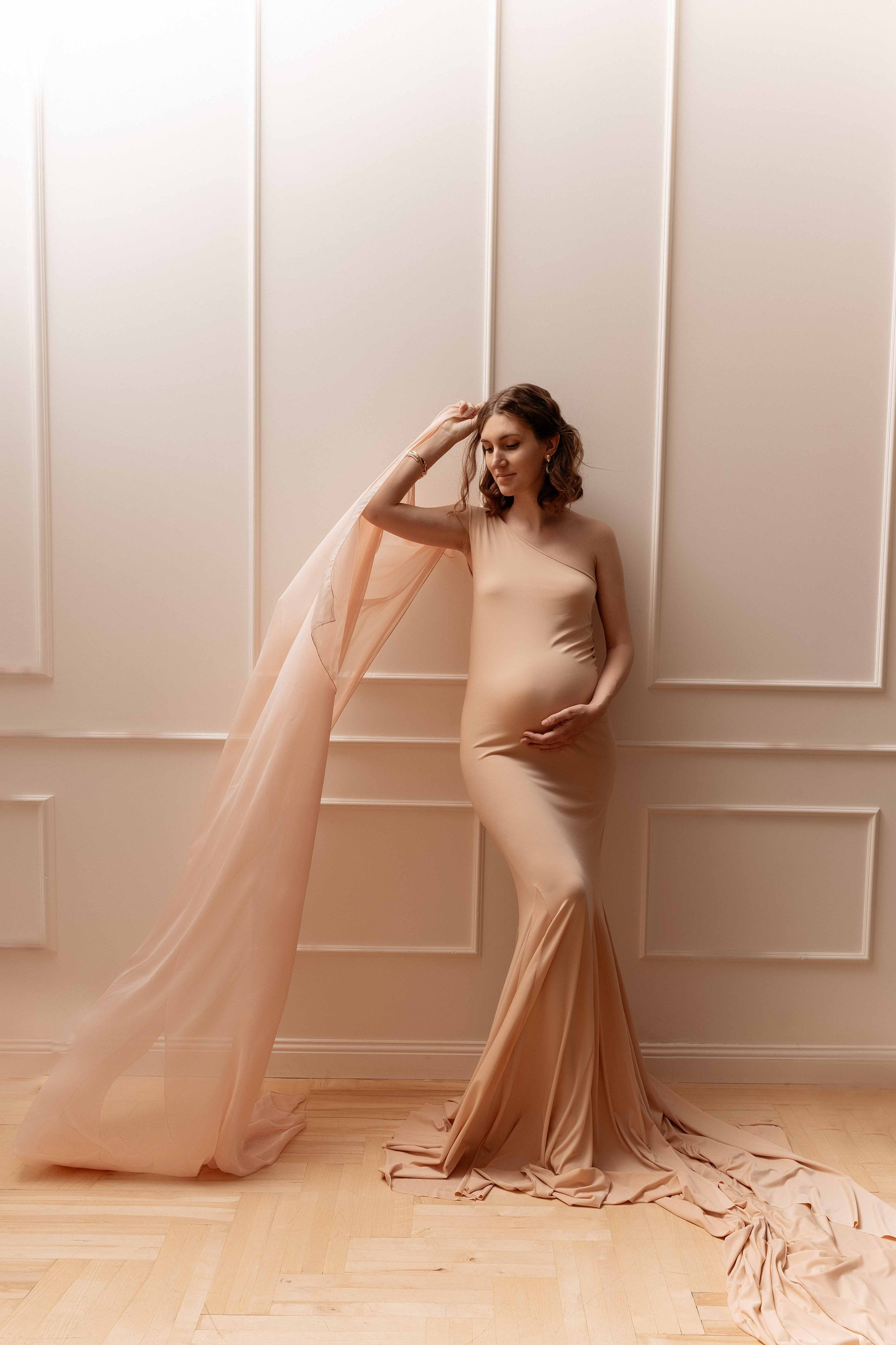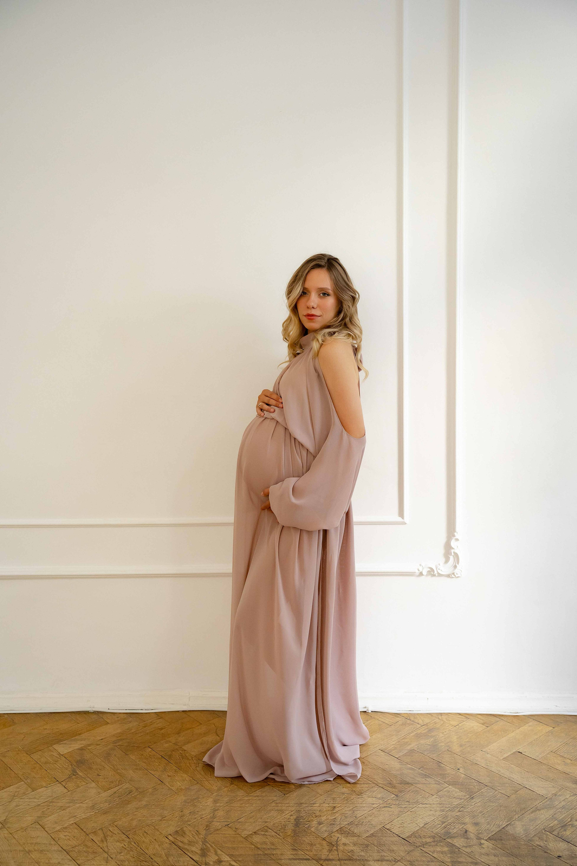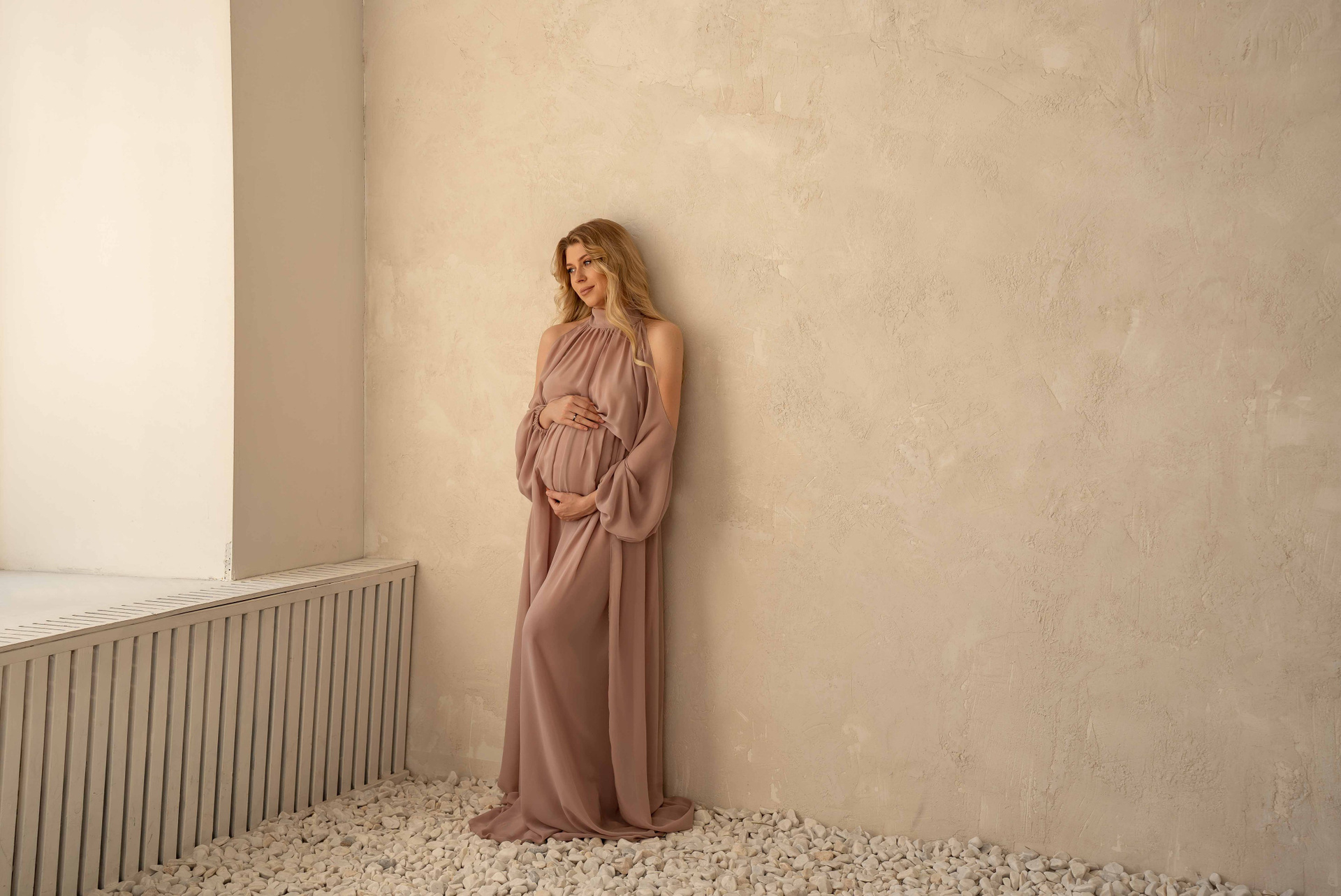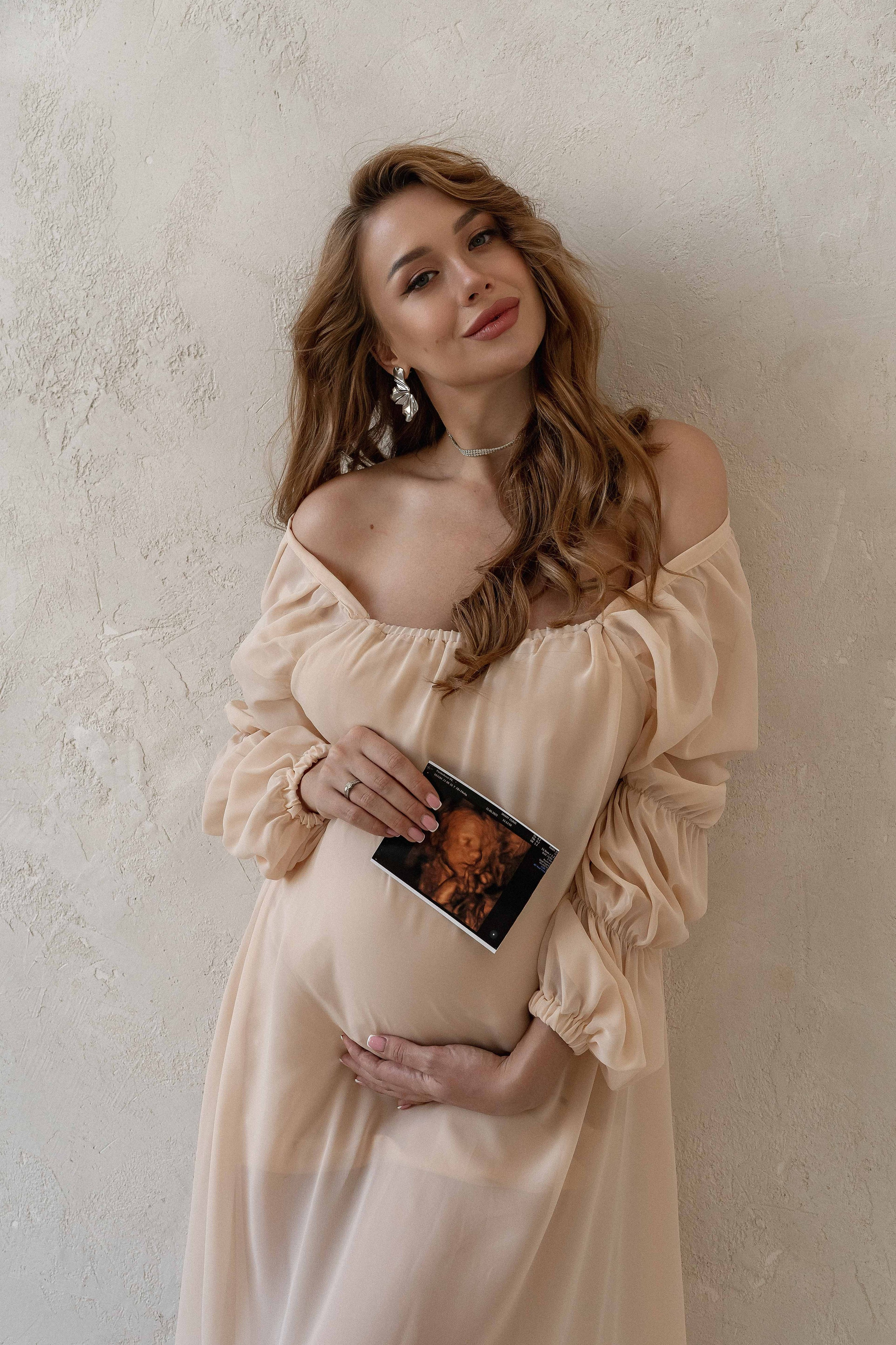 Модель one size, с асимметрией рукавов: один рукав открыт, другой — закрыт, что делает образ особенно мягким и выразительным. При поддержке животика в кадре получаются очень нежные, трогательные фотографии.