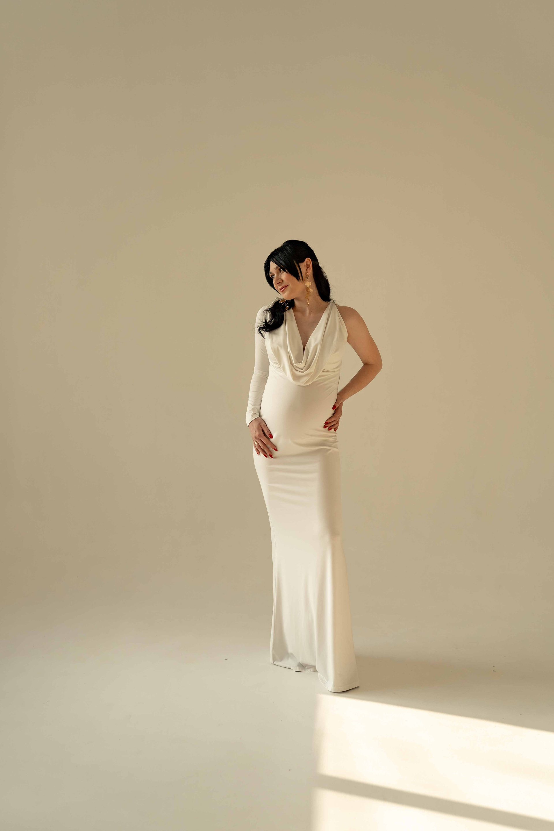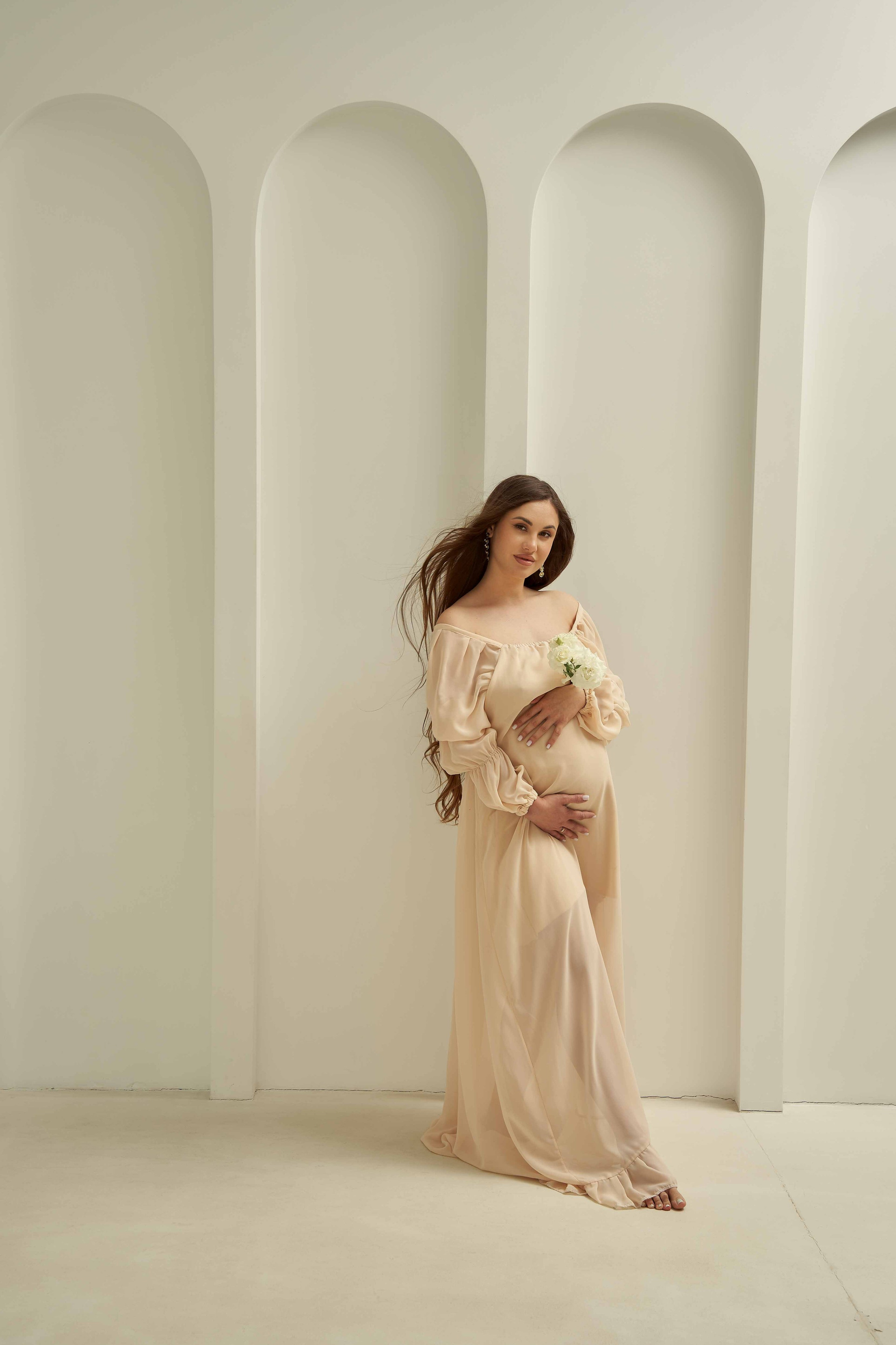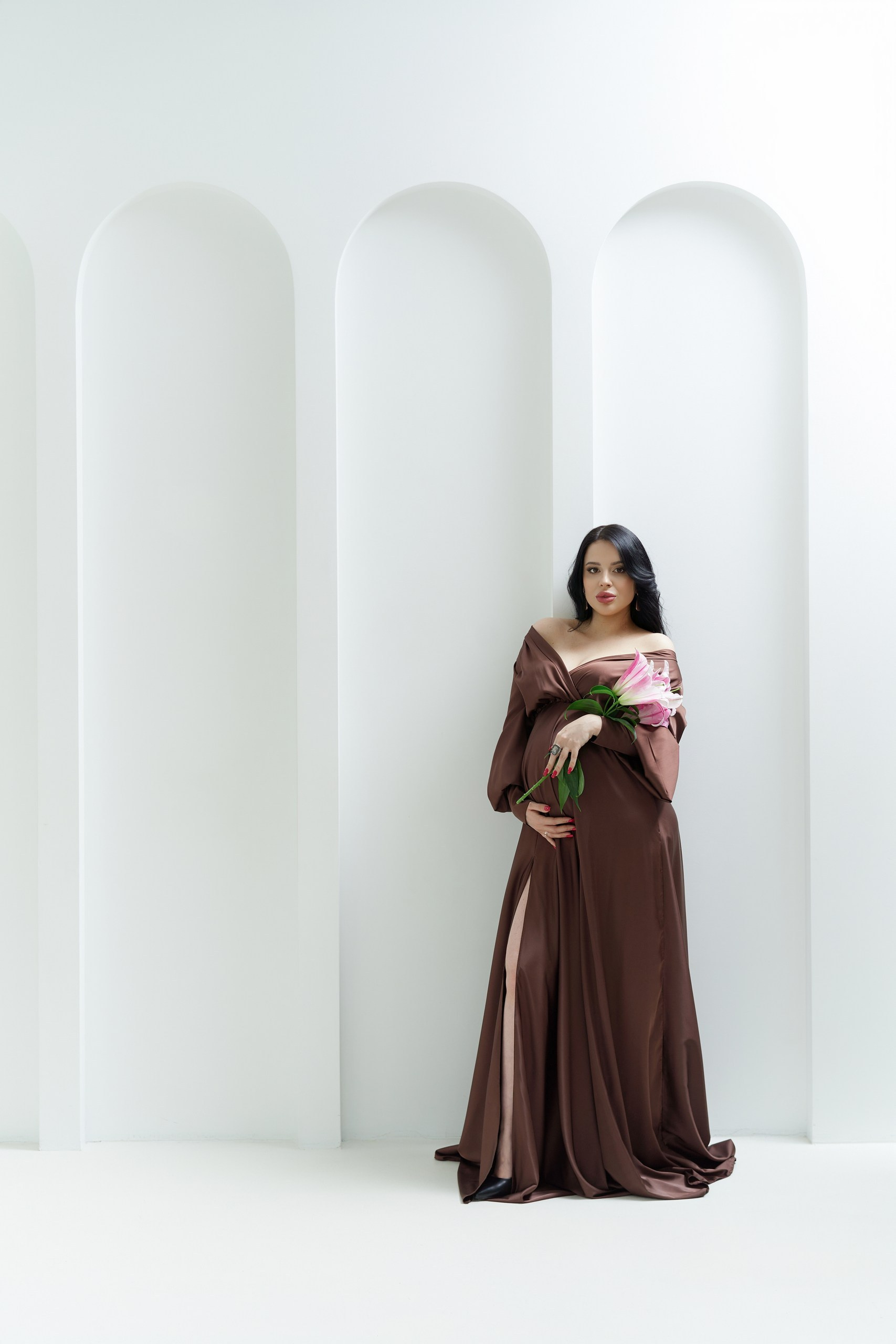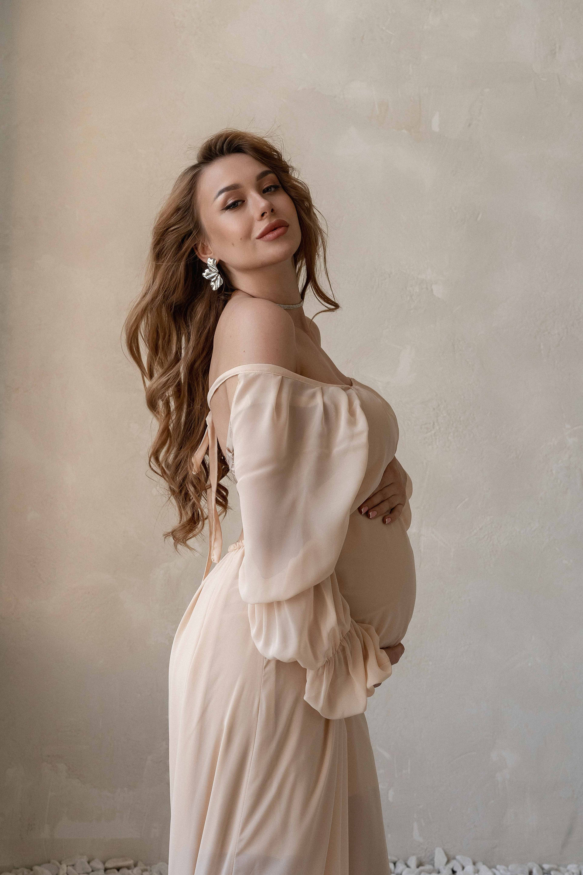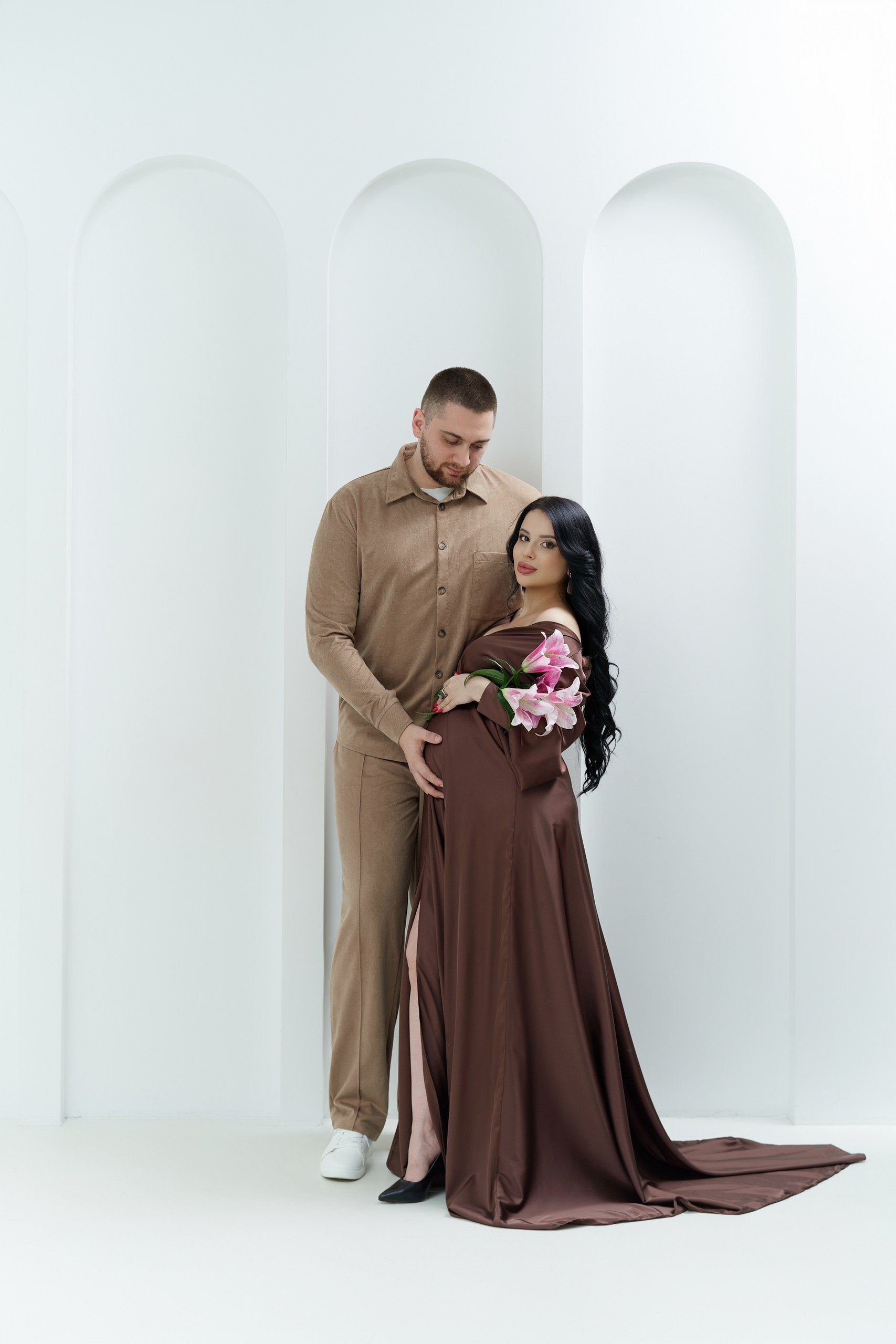 Модель one size, с асимметрией рукавов: один рукав открыт, другой — закрыт, что делает образ особенно мягким и выразительным. При поддержке животика в кадре получаются очень нежные, трогательные фотографии.