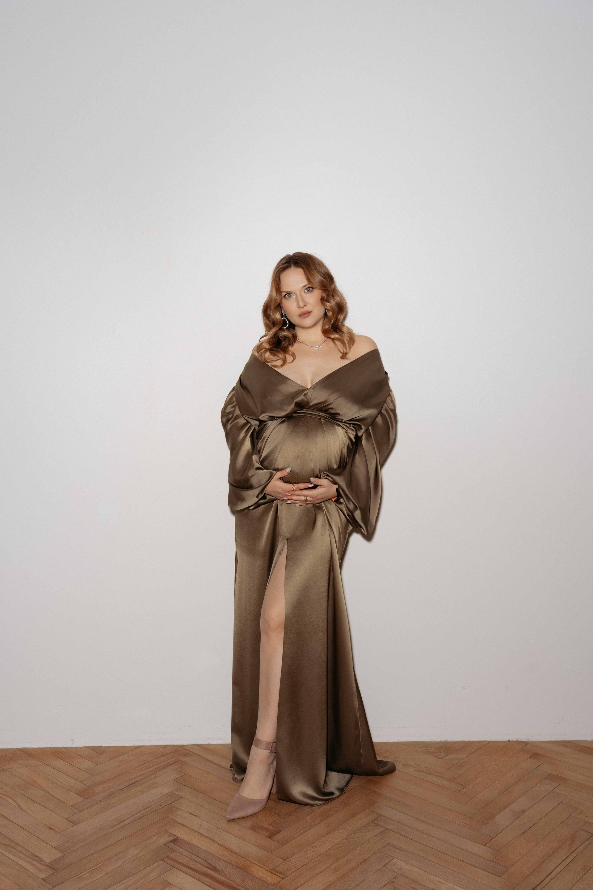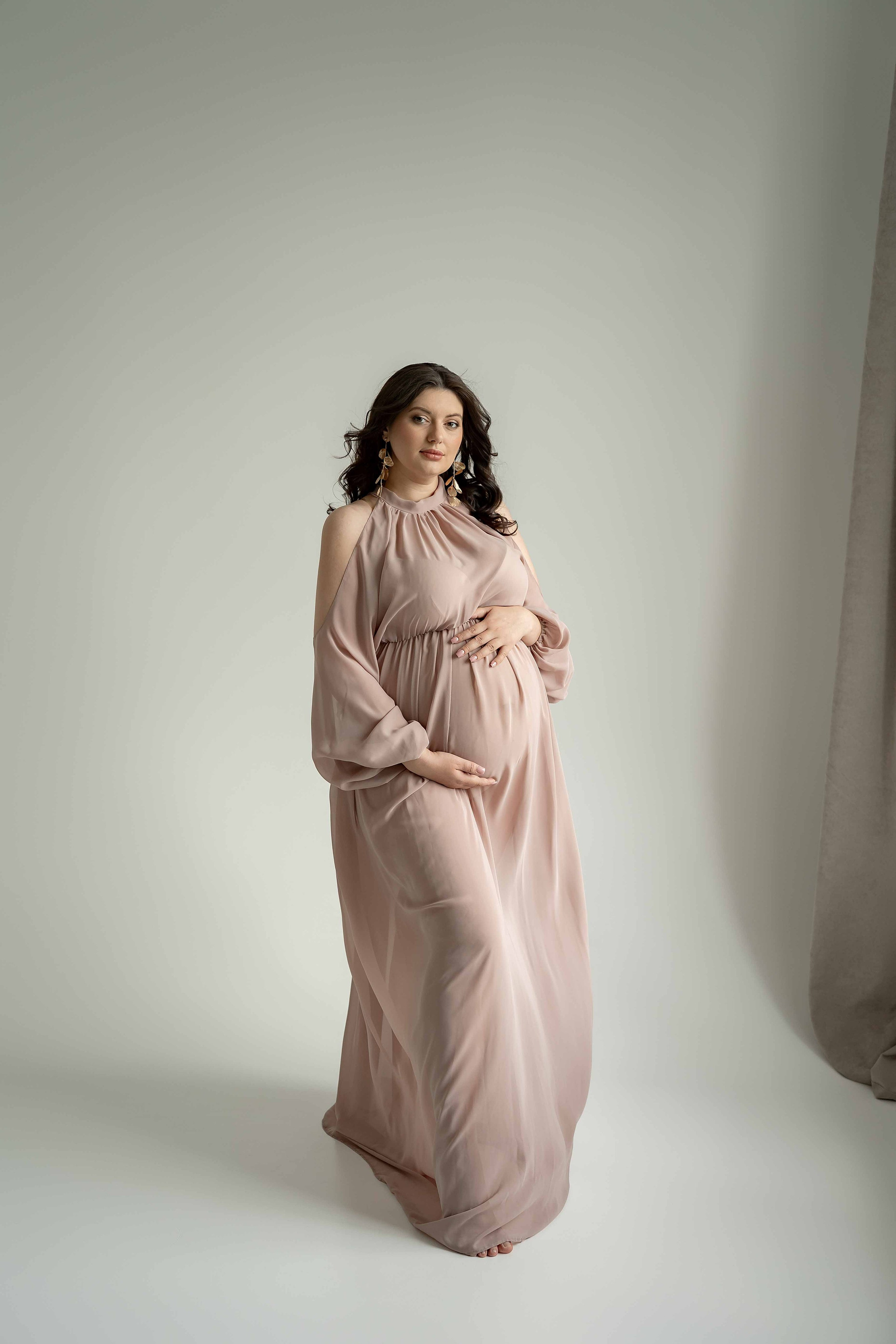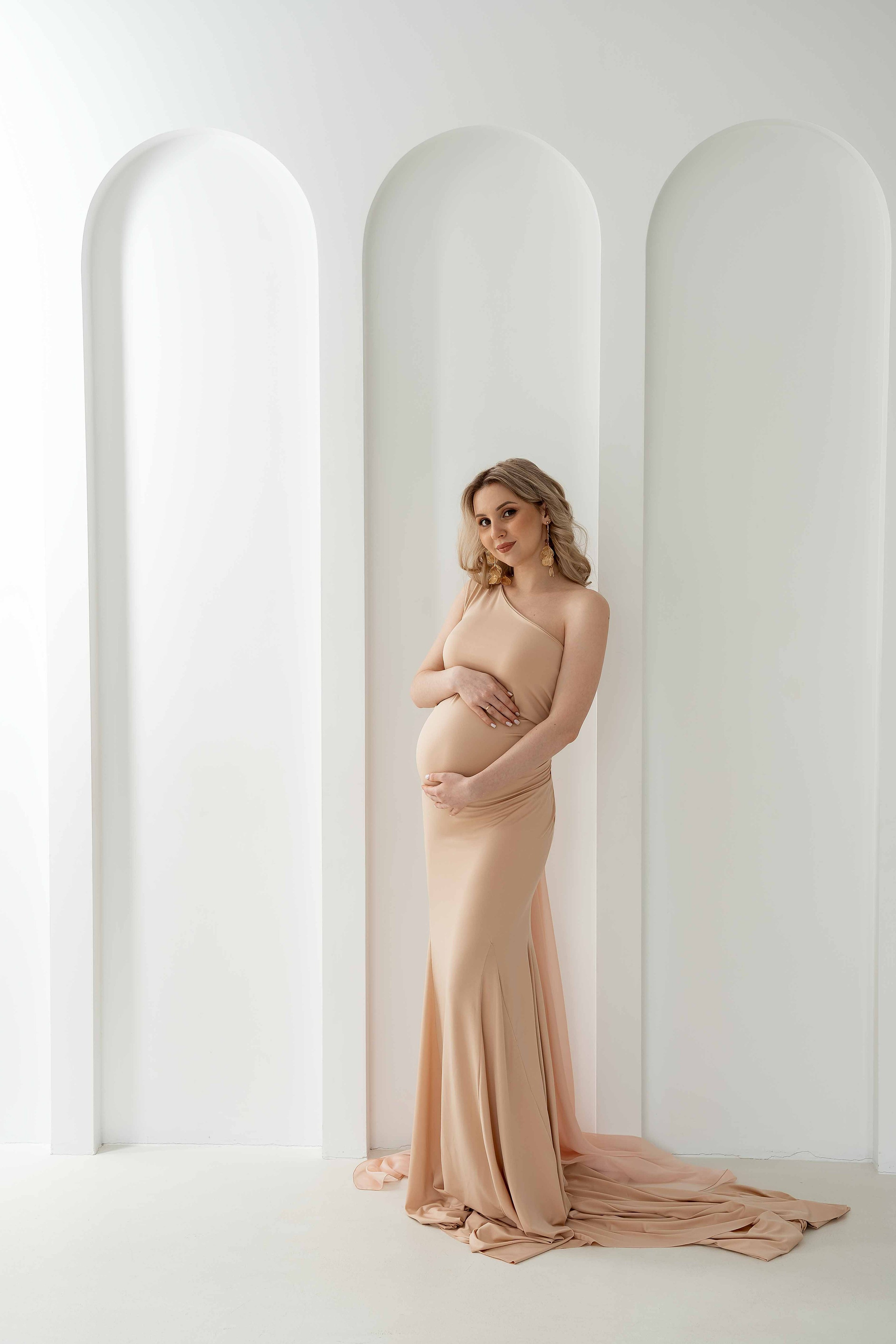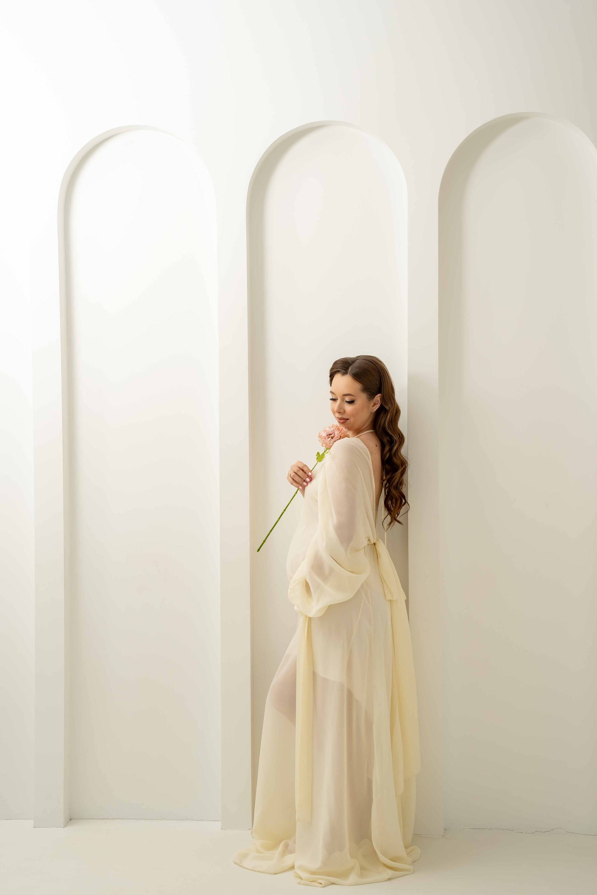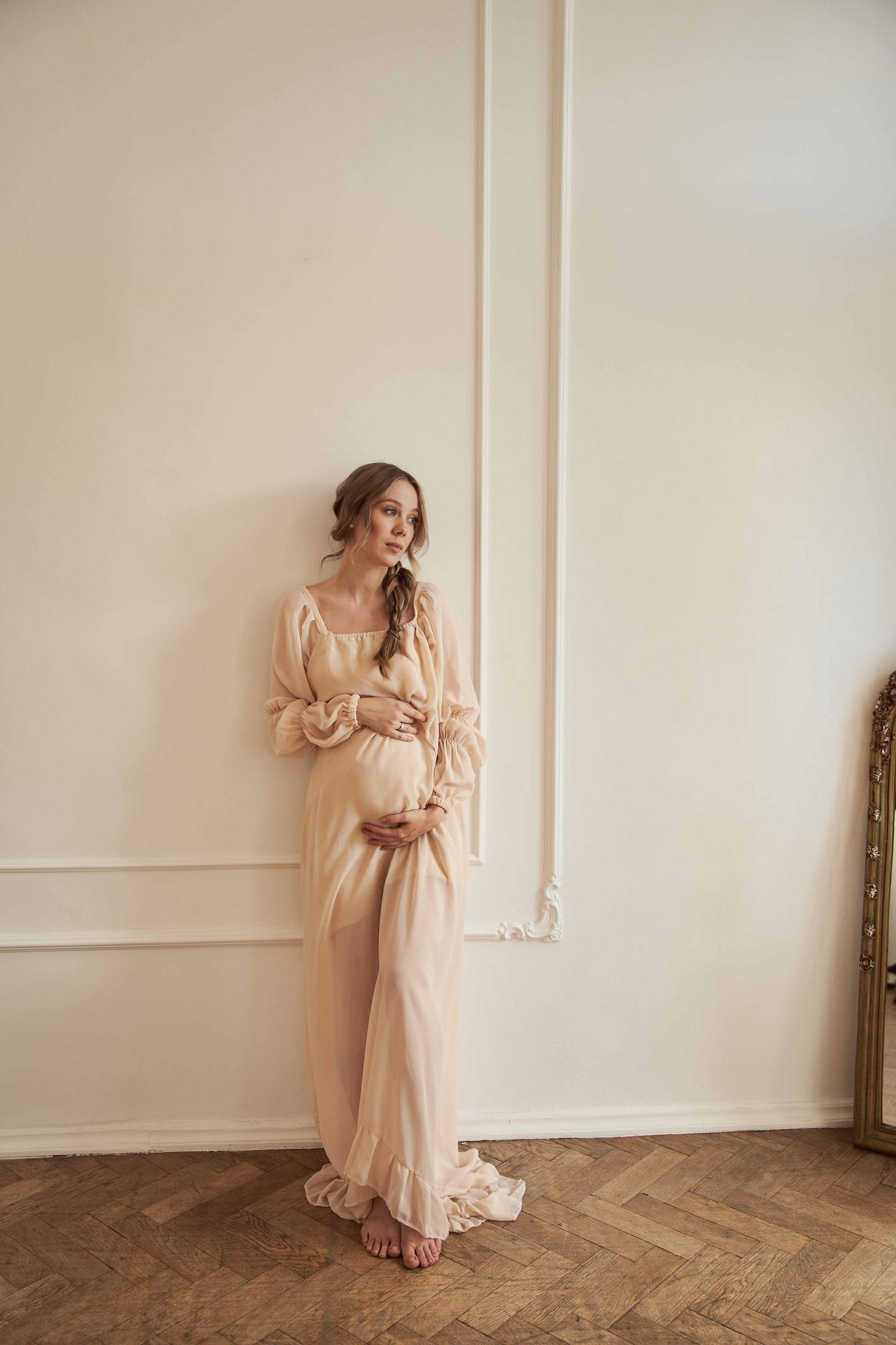 Модель one size, с асимметрией рукавов: один рукав открыт, другой — закрыт, что делает образ особенно мягким и выразительным. При поддержке животика в кадре получаются очень нежные, трогательные фотографии.