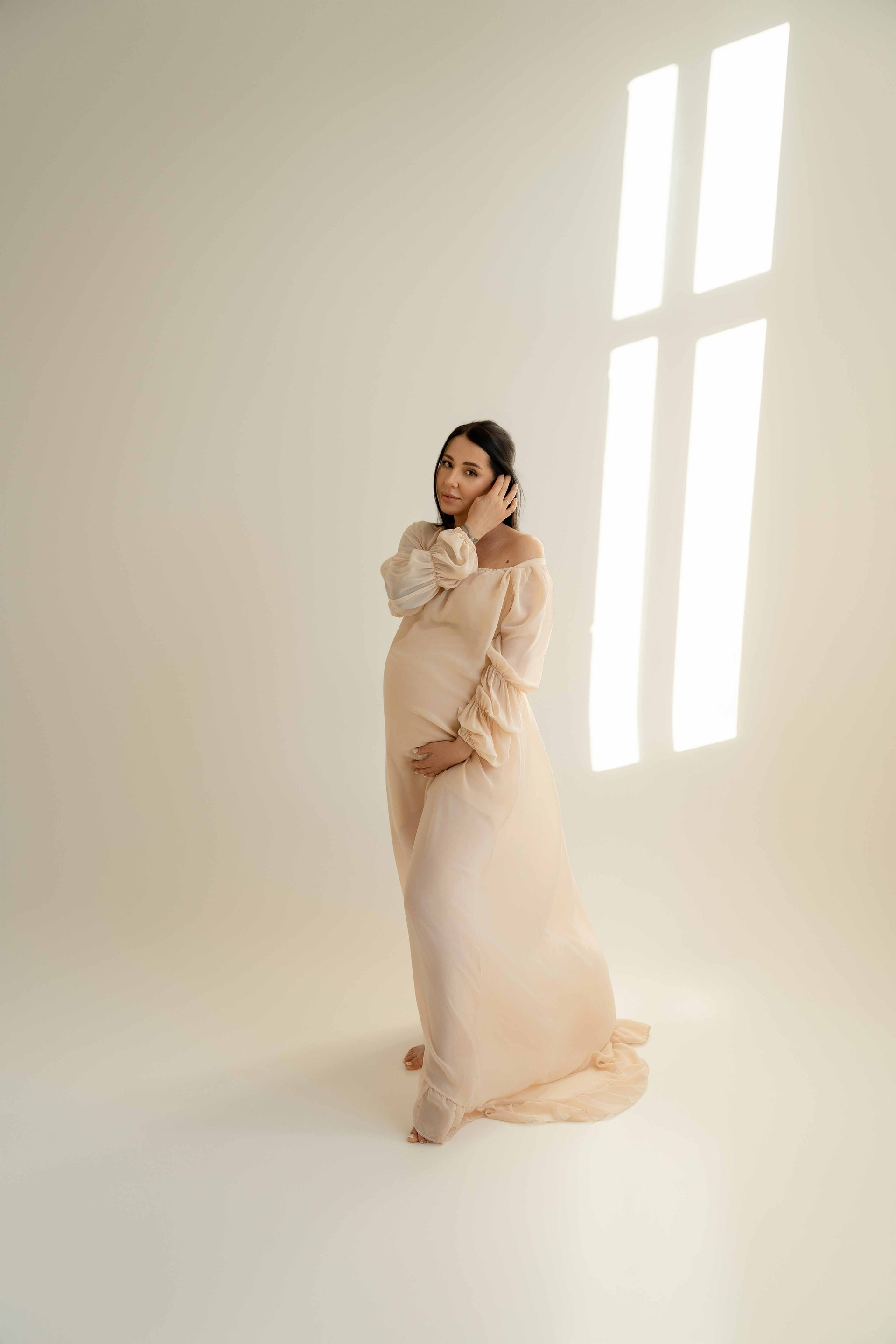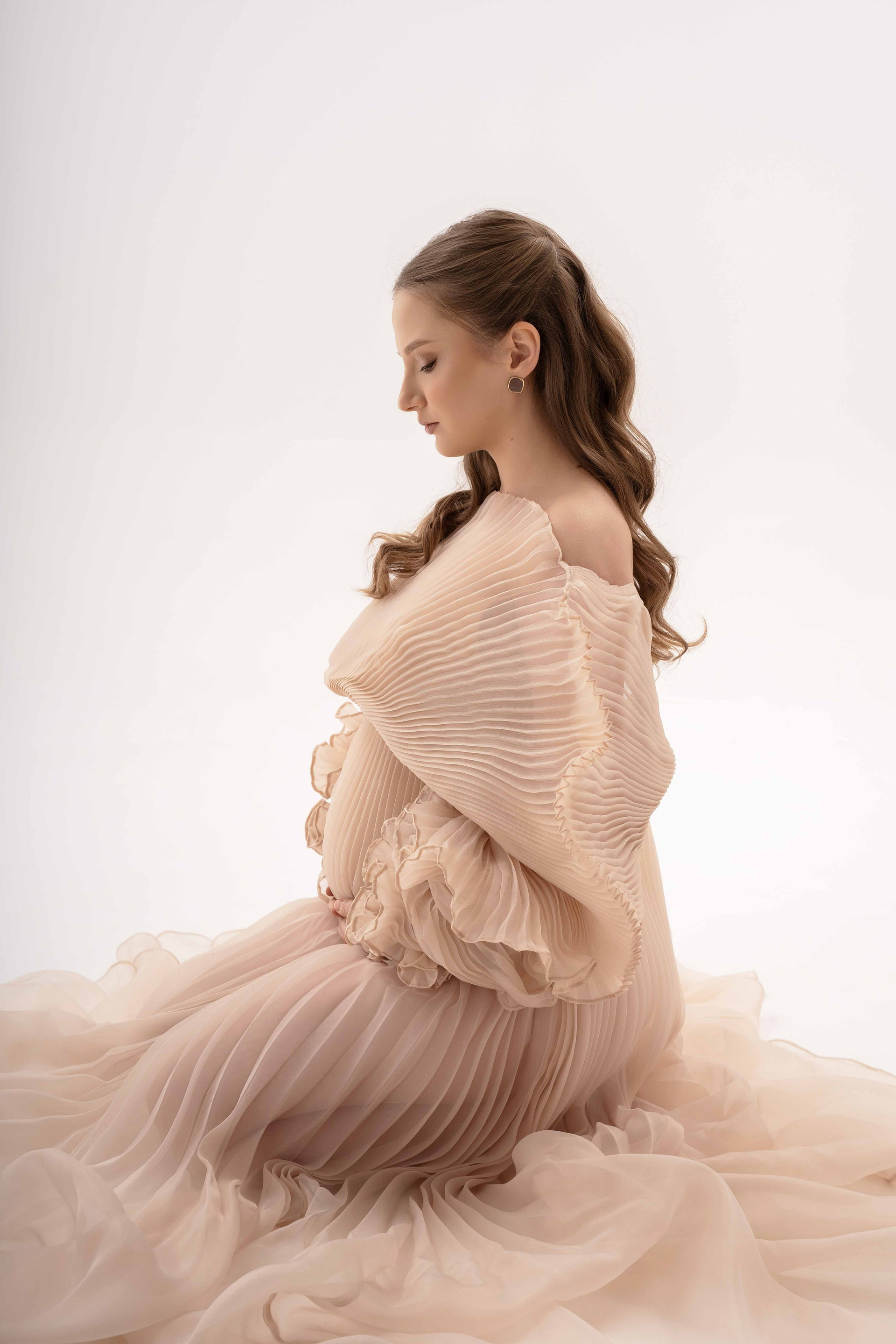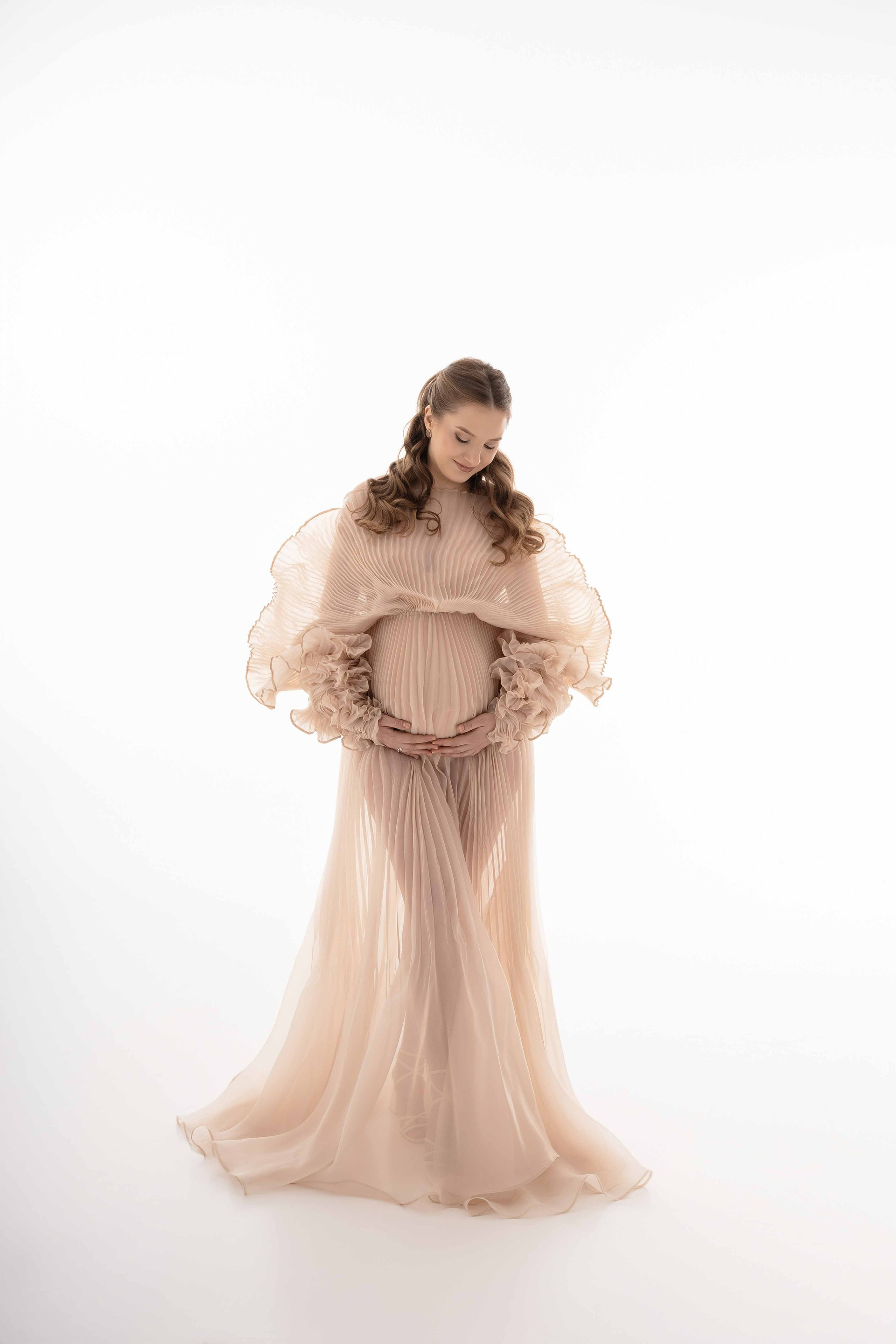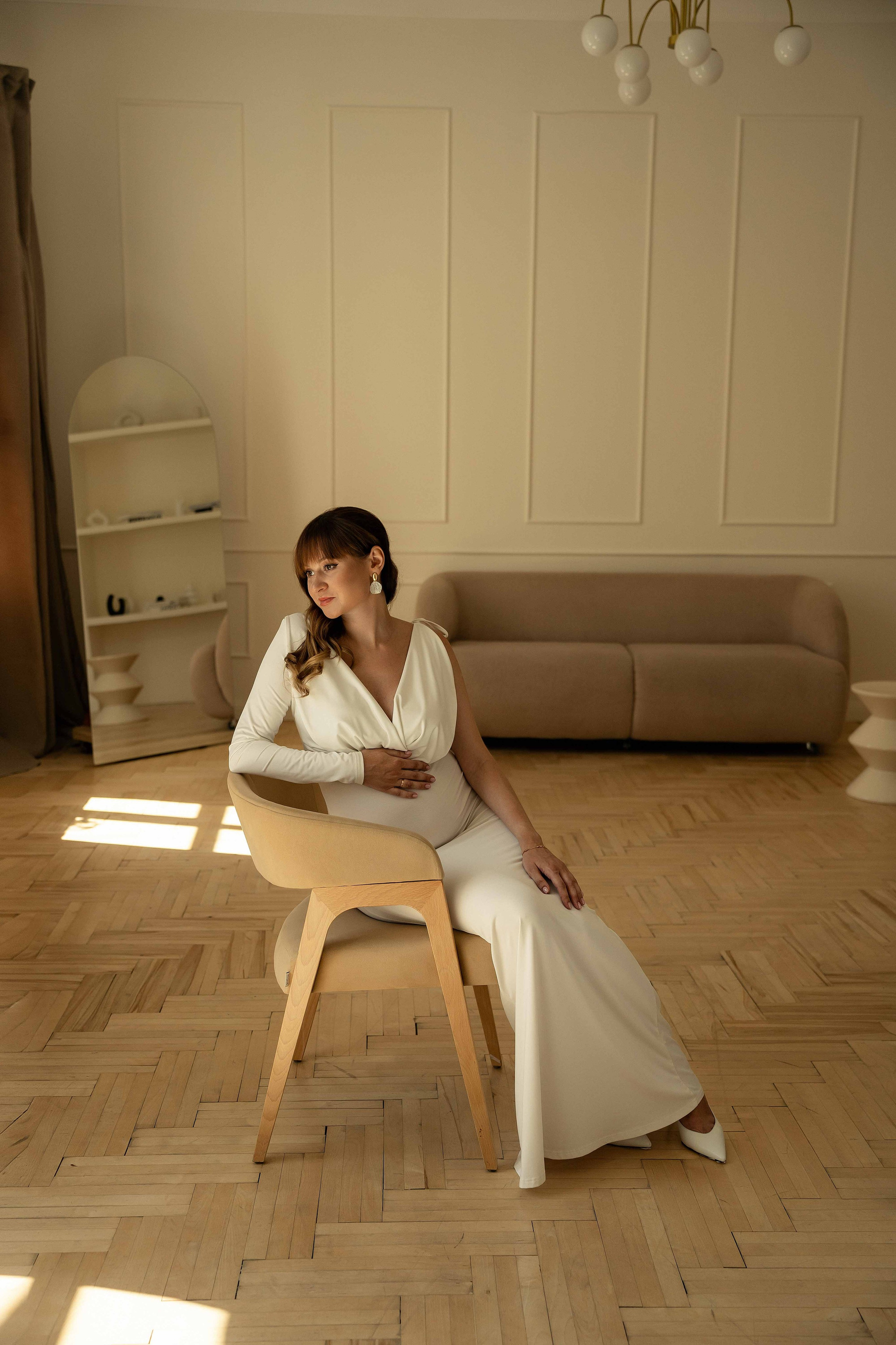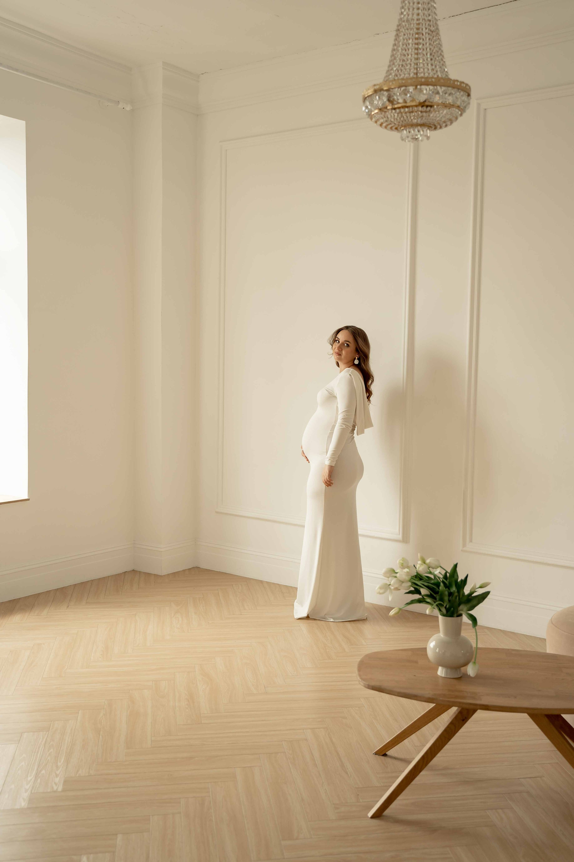 Модель one size, с асимметрией рукавов: один рукав открыт, другой — закрыт, что делает образ особенно мягким и выразительным. При поддержке животика в кадре получаются очень нежные, трогательные фотографии.