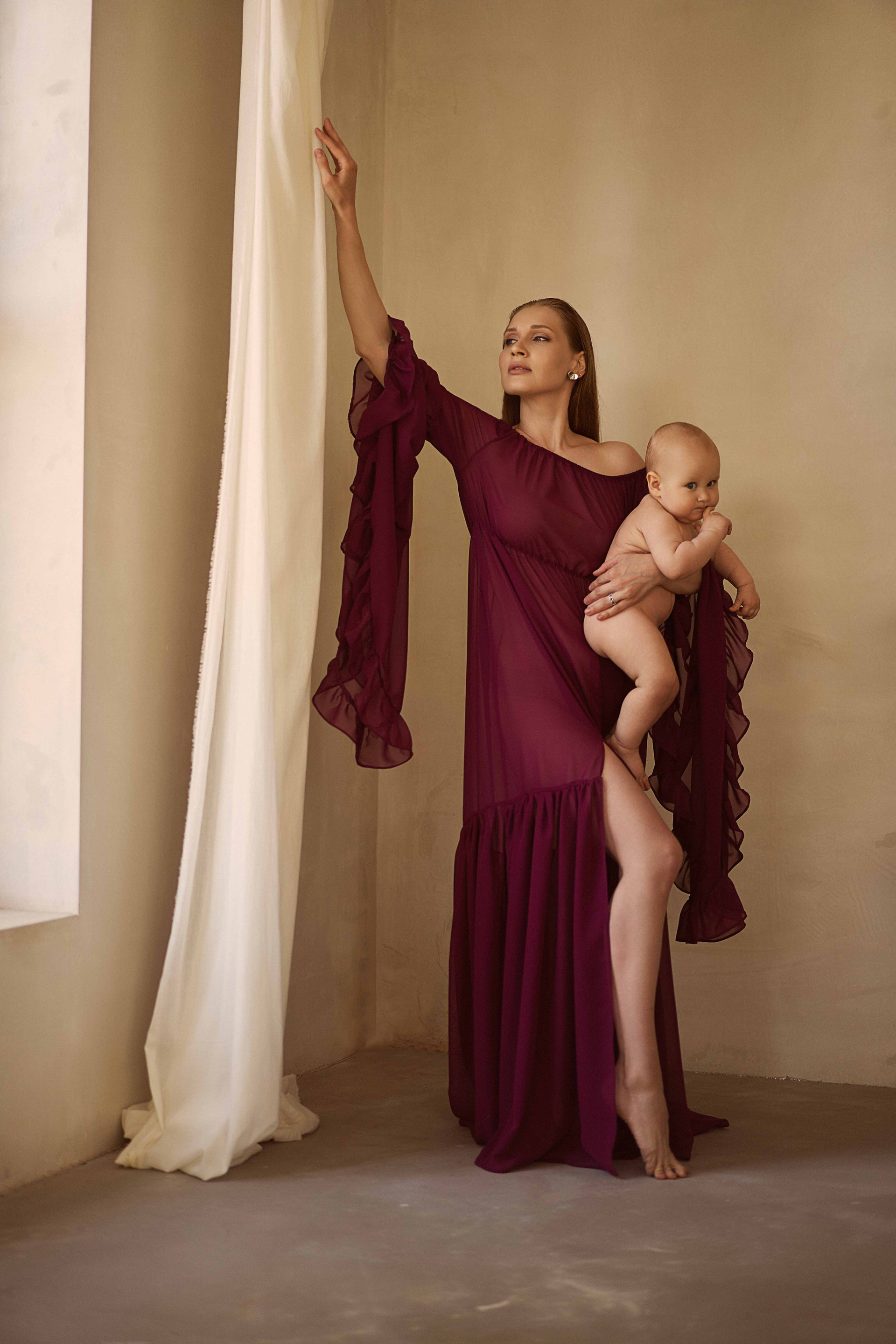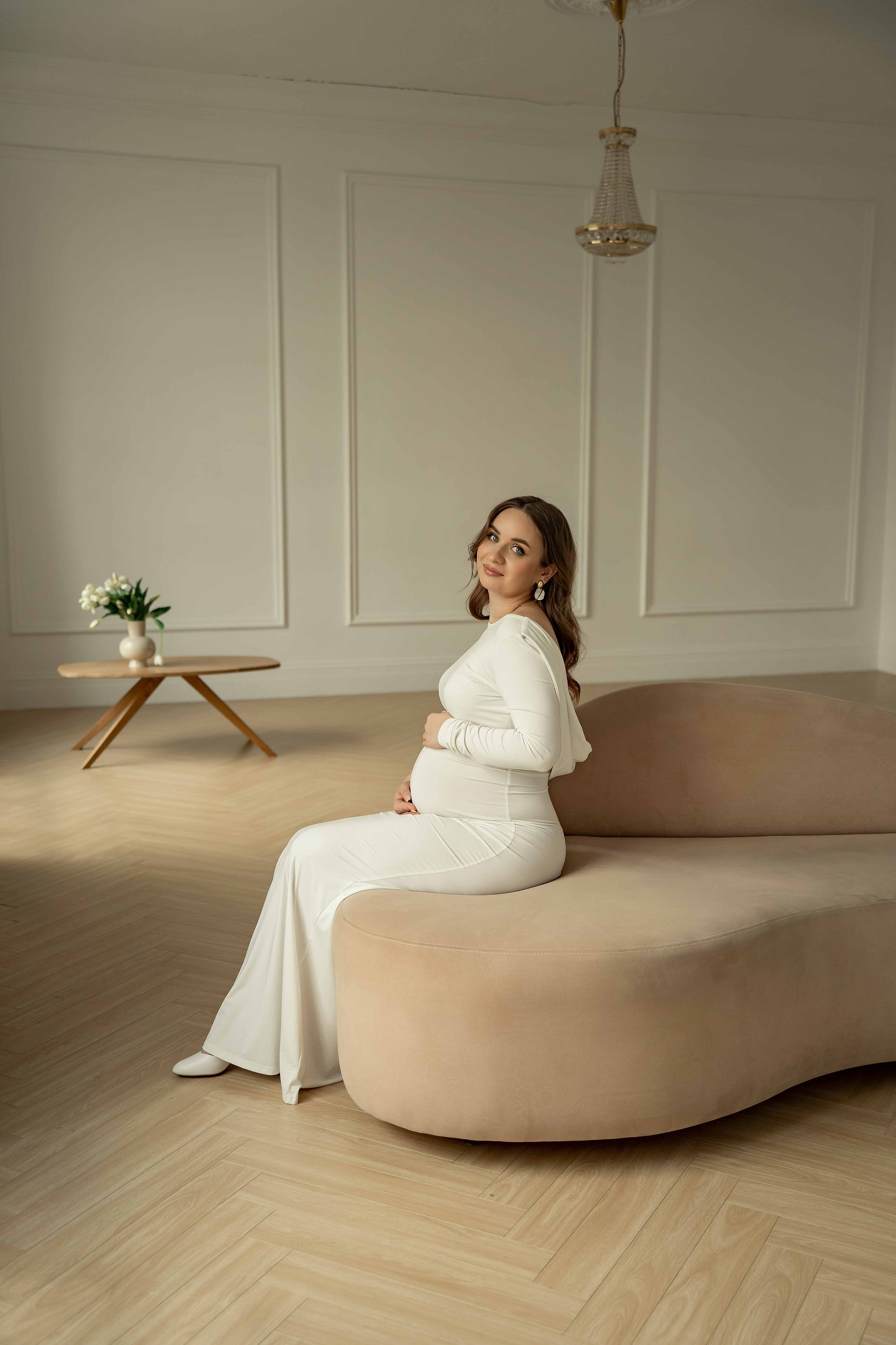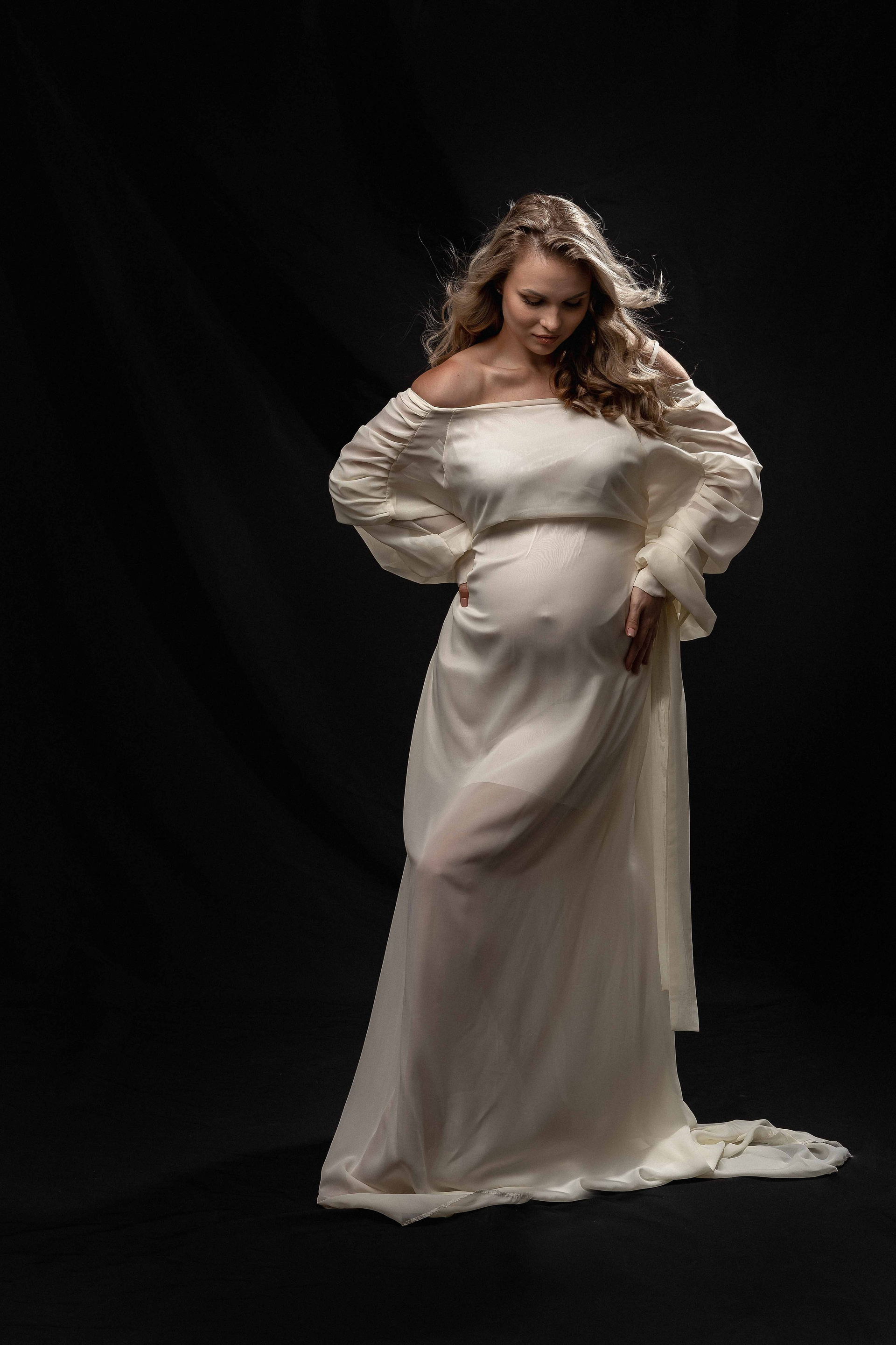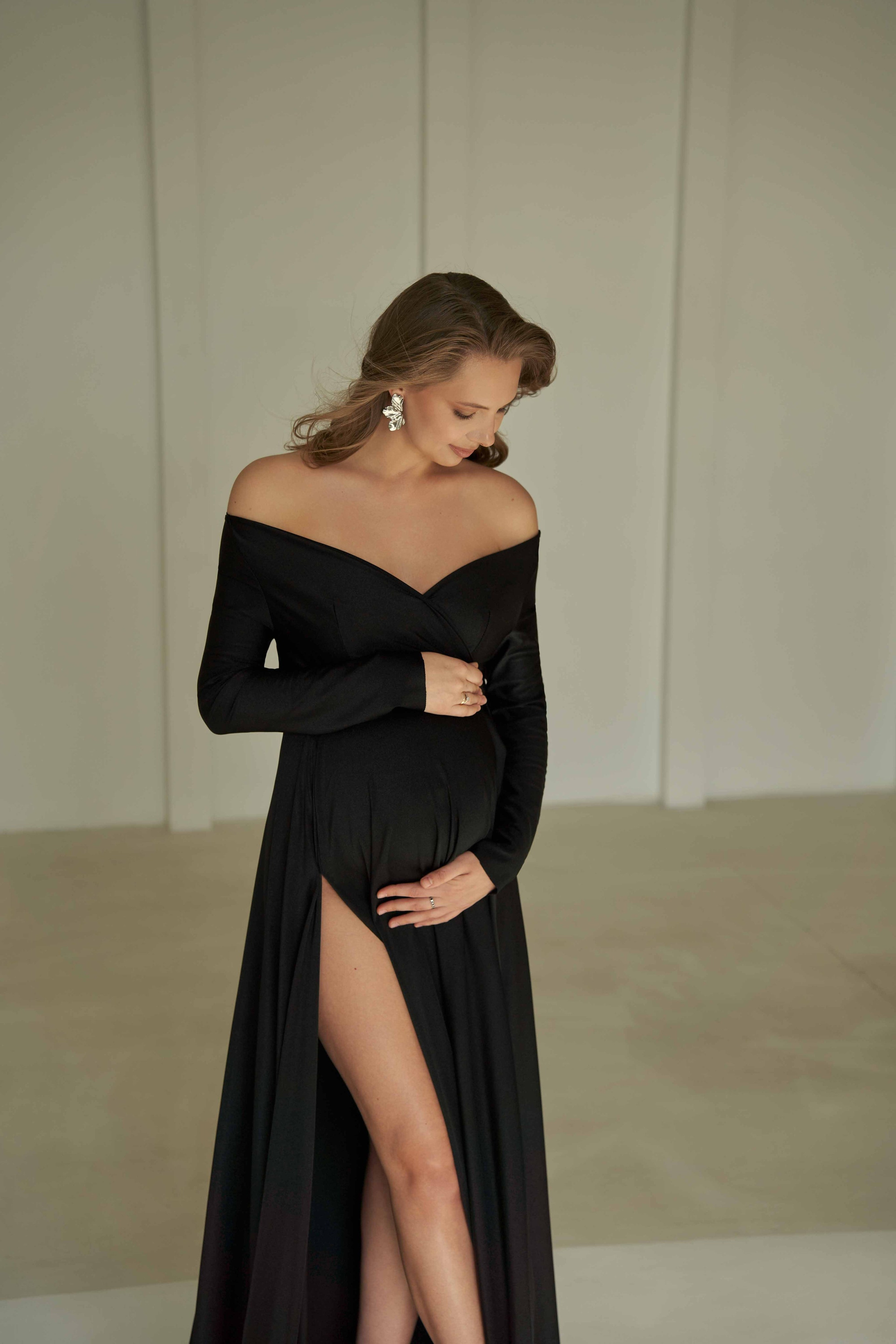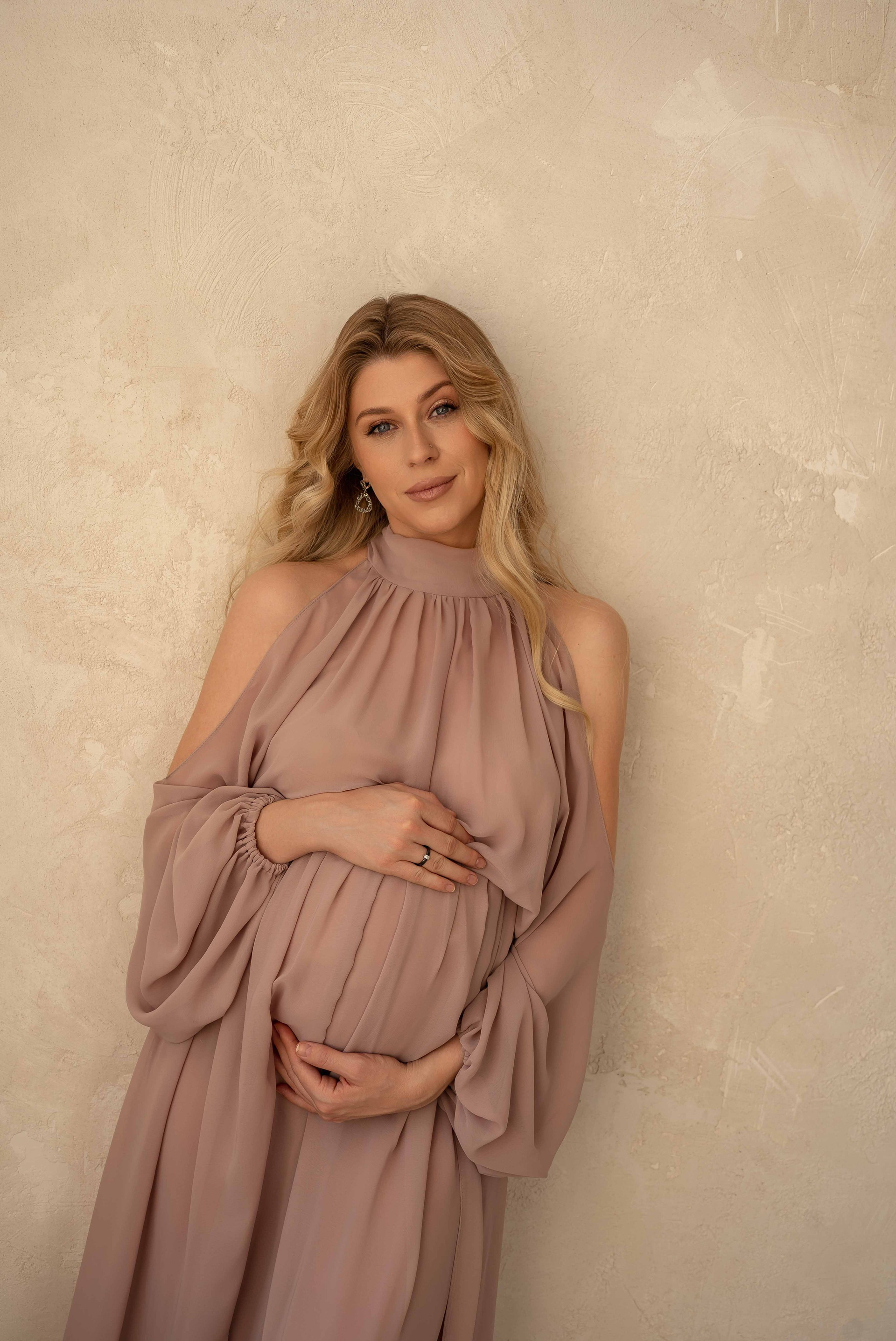 Модель one size, с асимметрией рукавов: один рукав открыт, другой — закрыт, что делает образ особенно мягким и выразительным. При поддержке животика в кадре получаются очень нежные, трогательные фотографии.