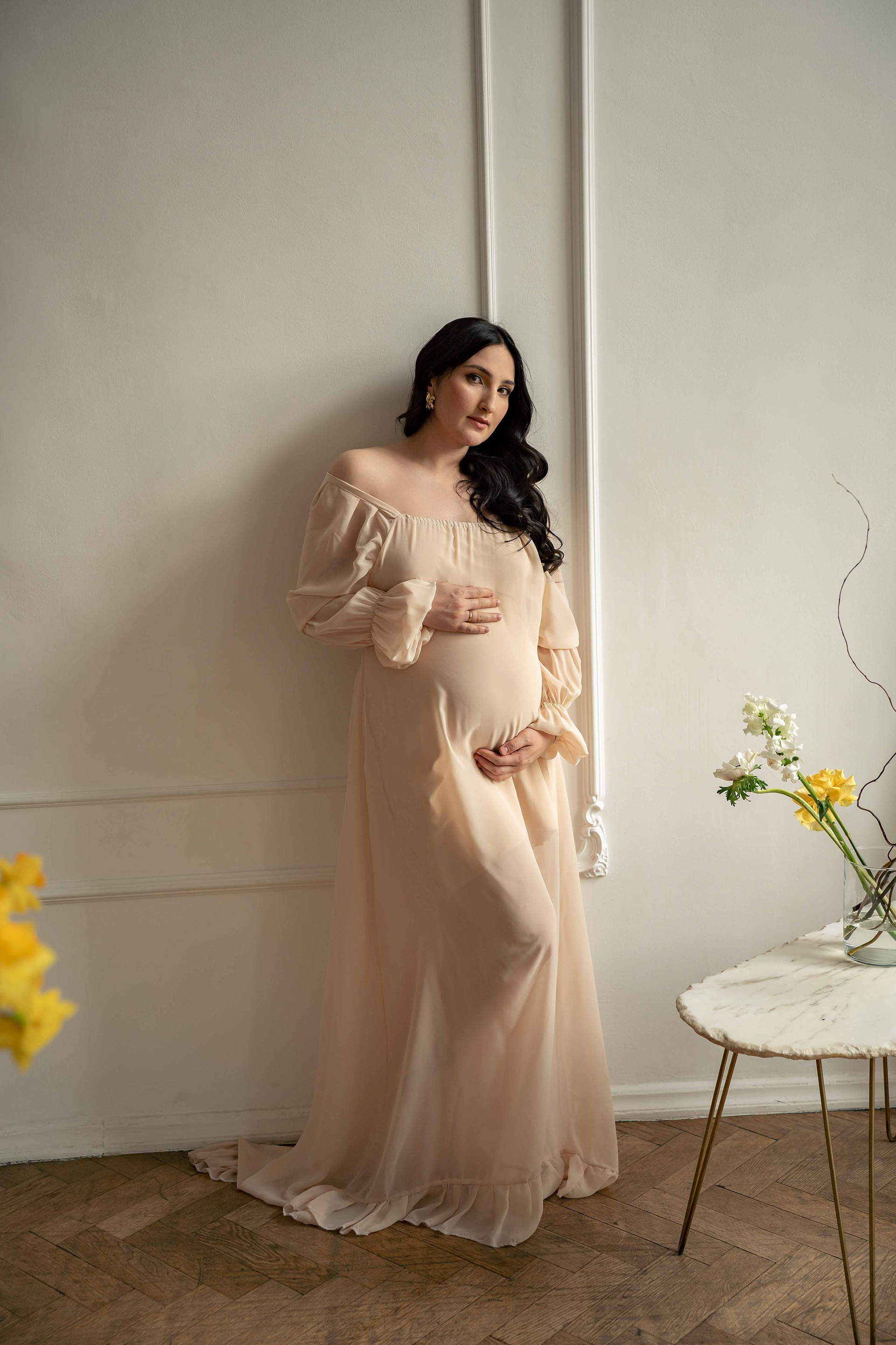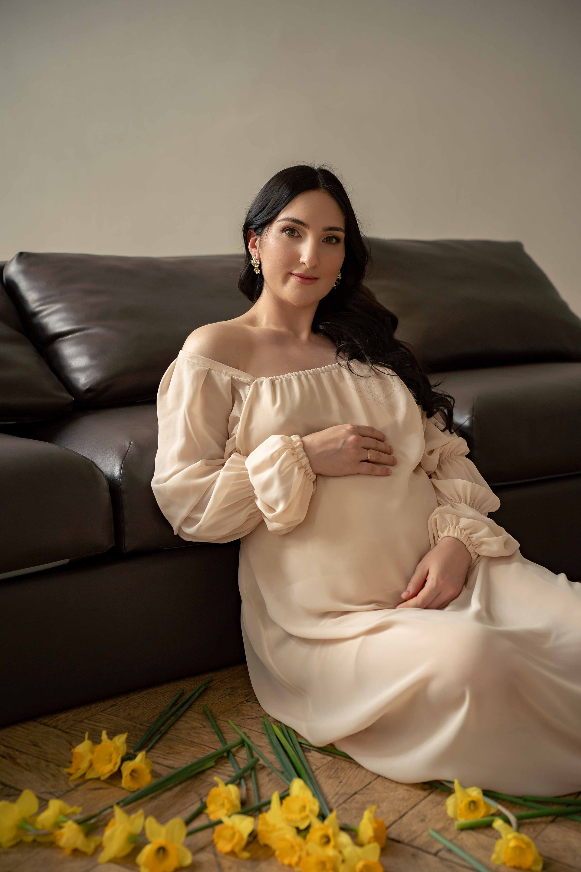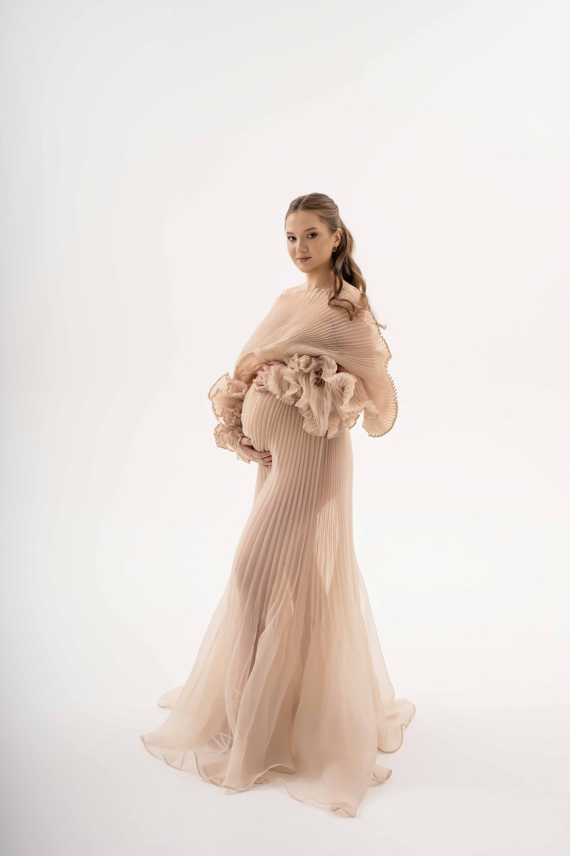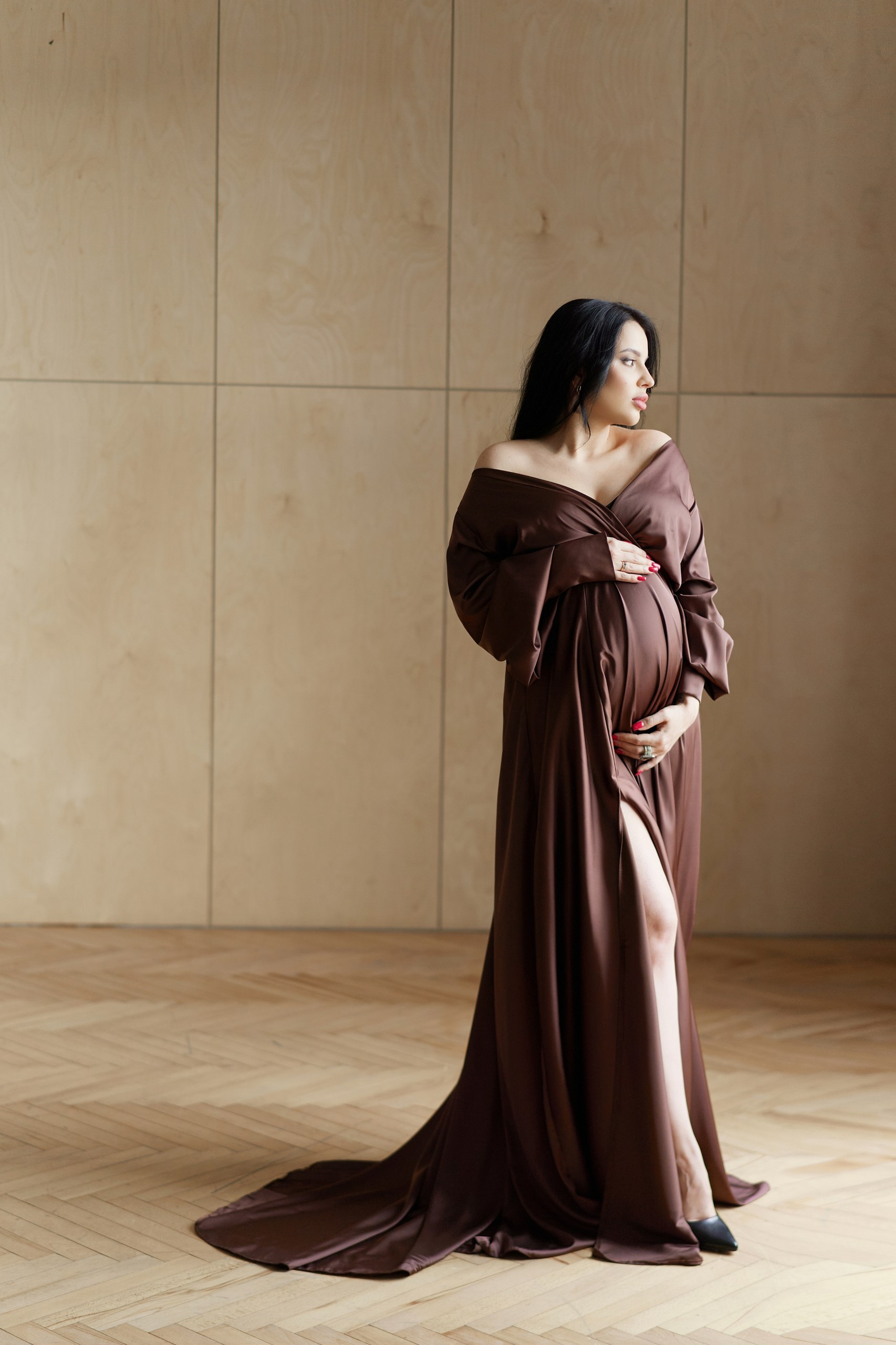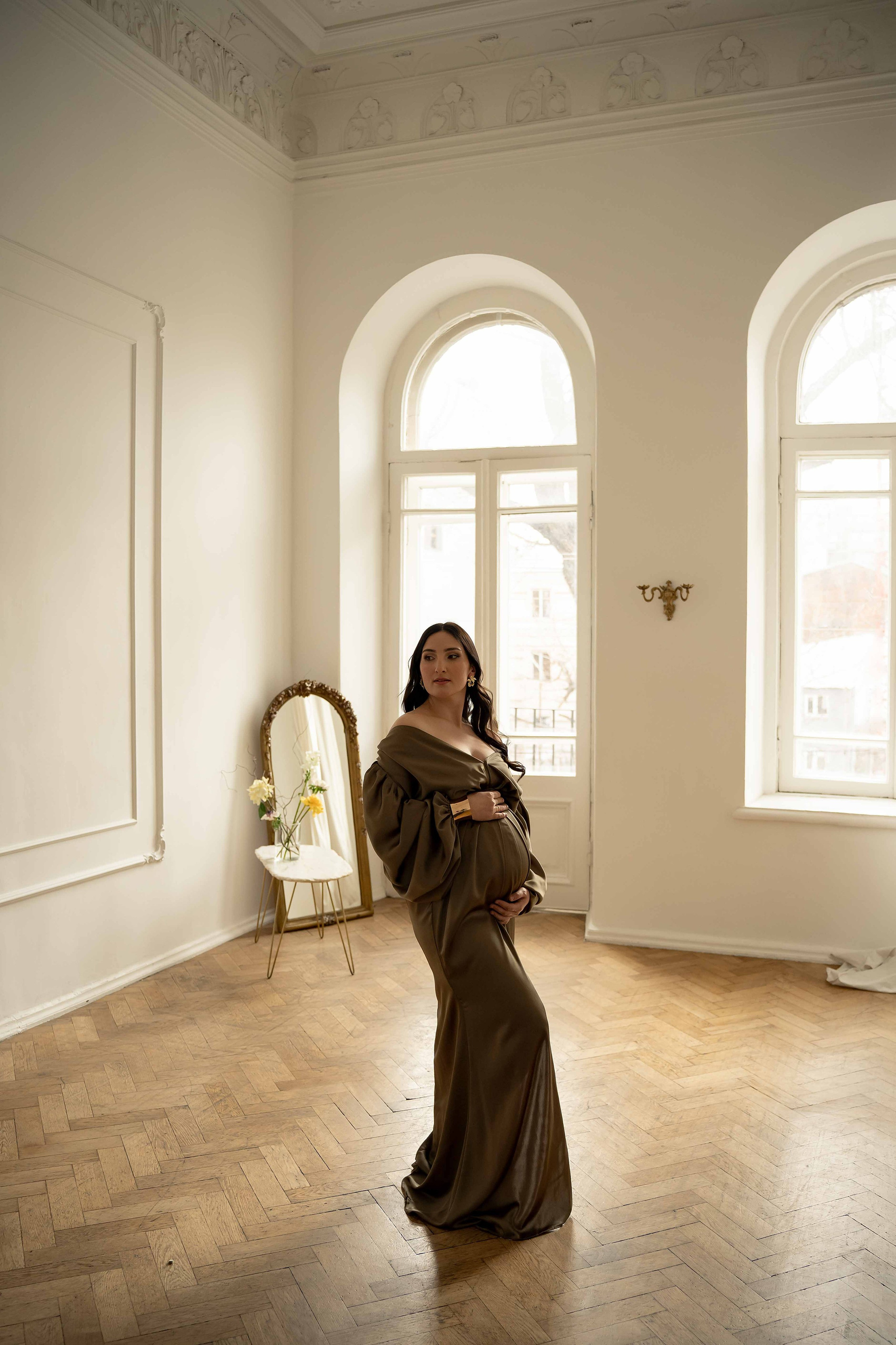 Модель one size, с асимметрией рукавов: один рукав открыт, другой — закрыт, что делает образ особенно мягким и выразительным. При поддержке животика в кадре получаются очень нежные, трогательные фотографии.