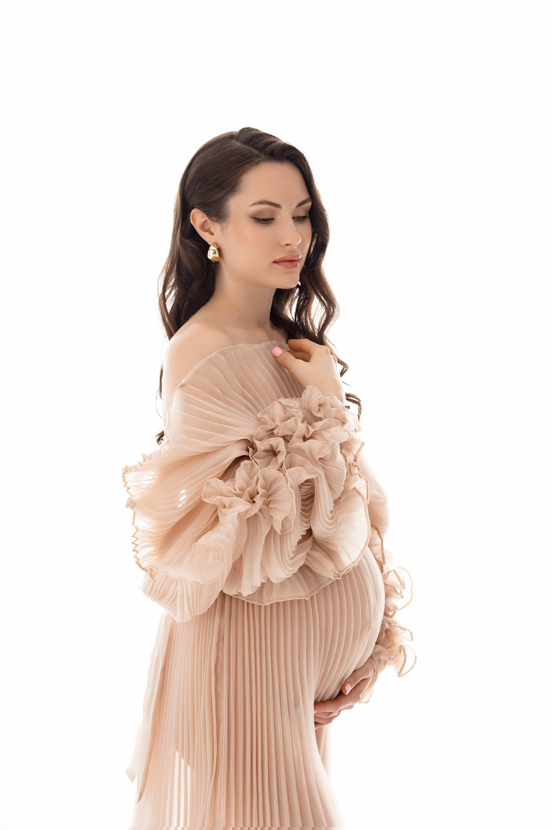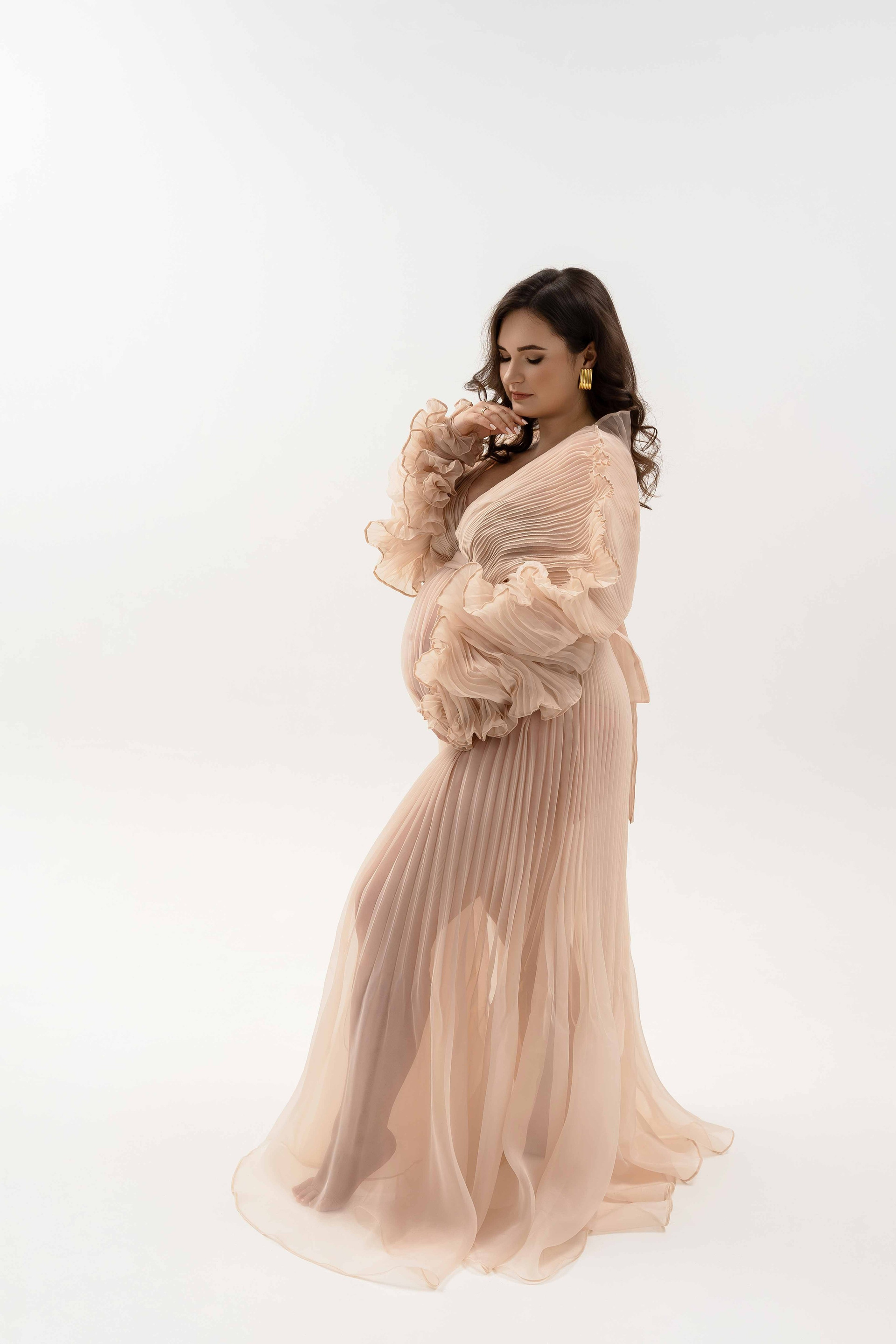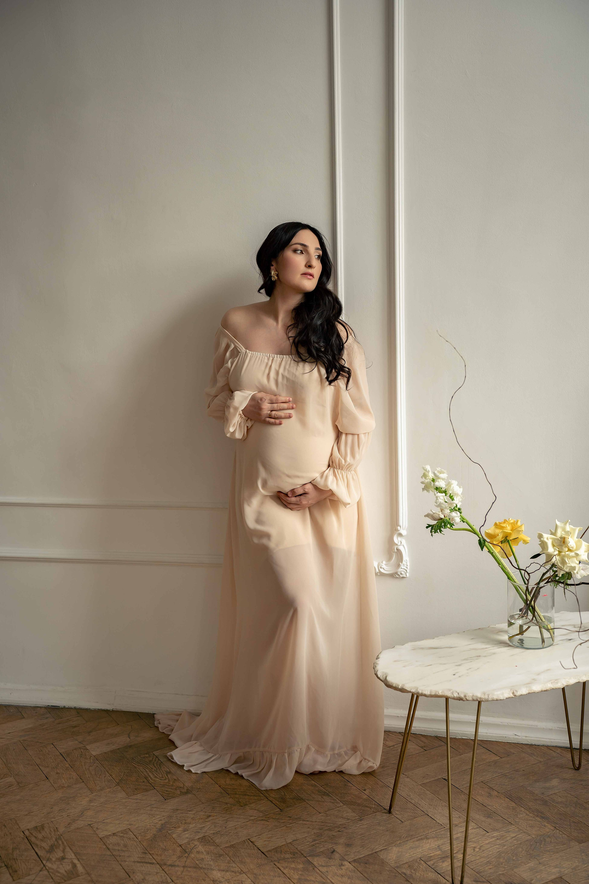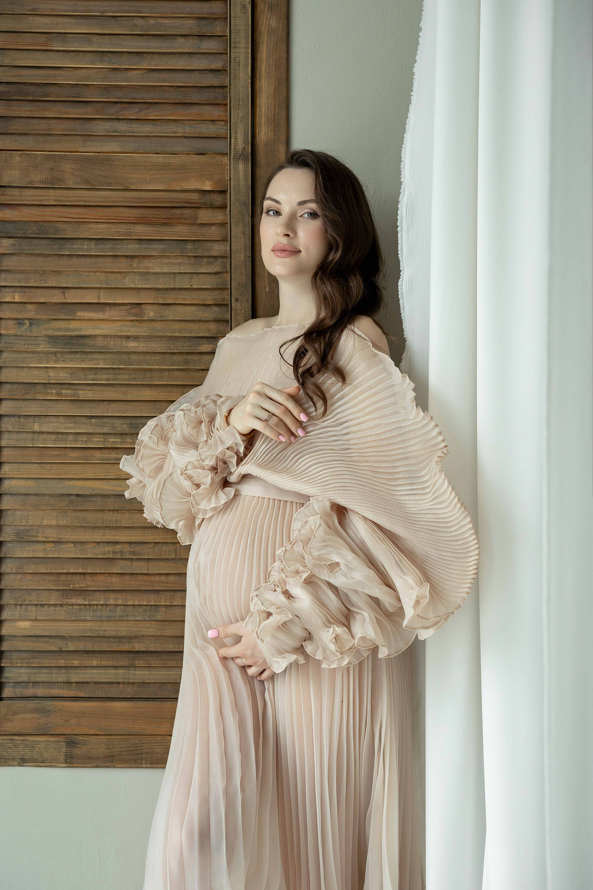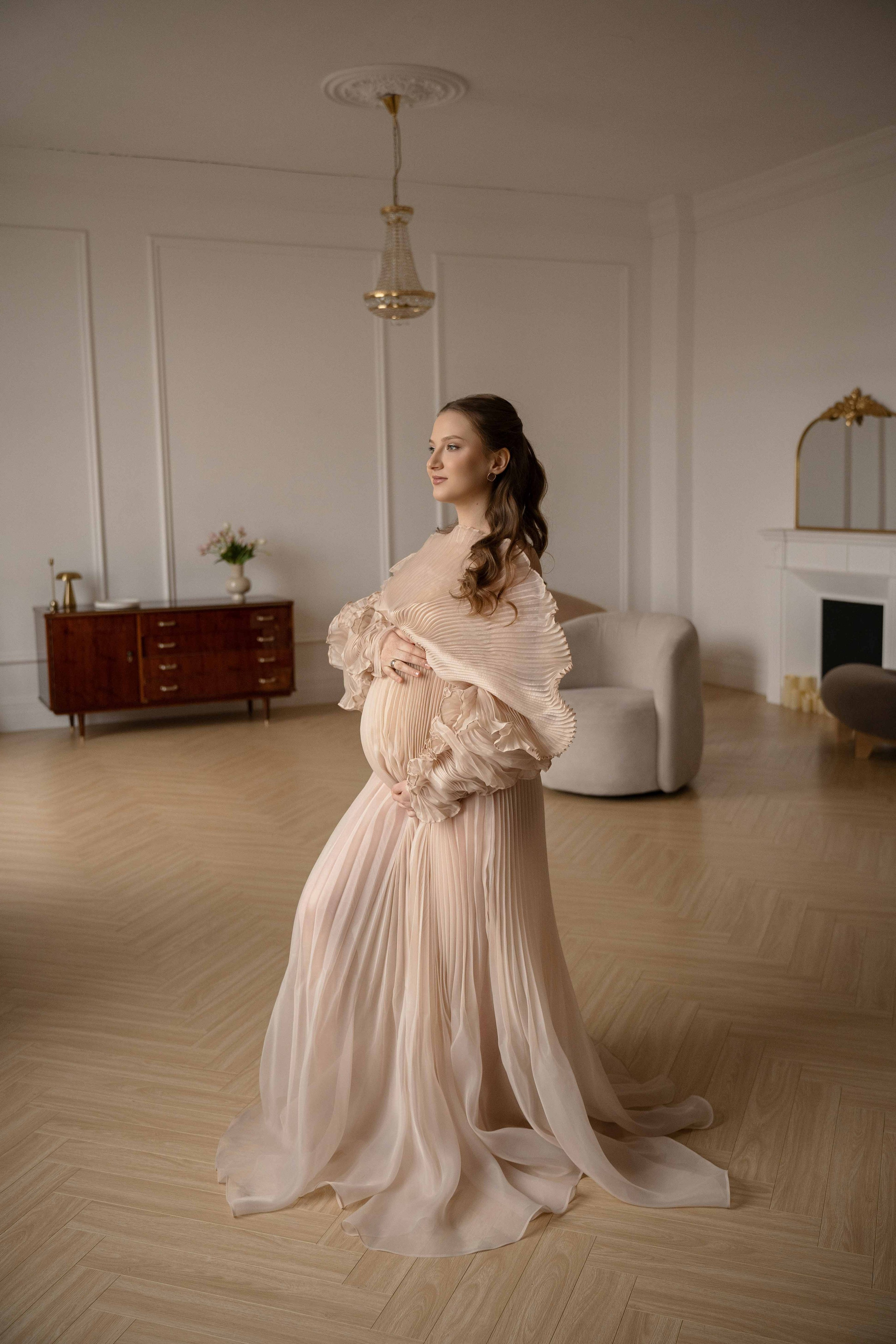 Модель one size, с асимметрией рукавов: один рукав открыт, другой — закрыт, что делает образ особенно мягким и выразительным. При поддержке животика в кадре получаются очень нежные, трогательные фотографии.