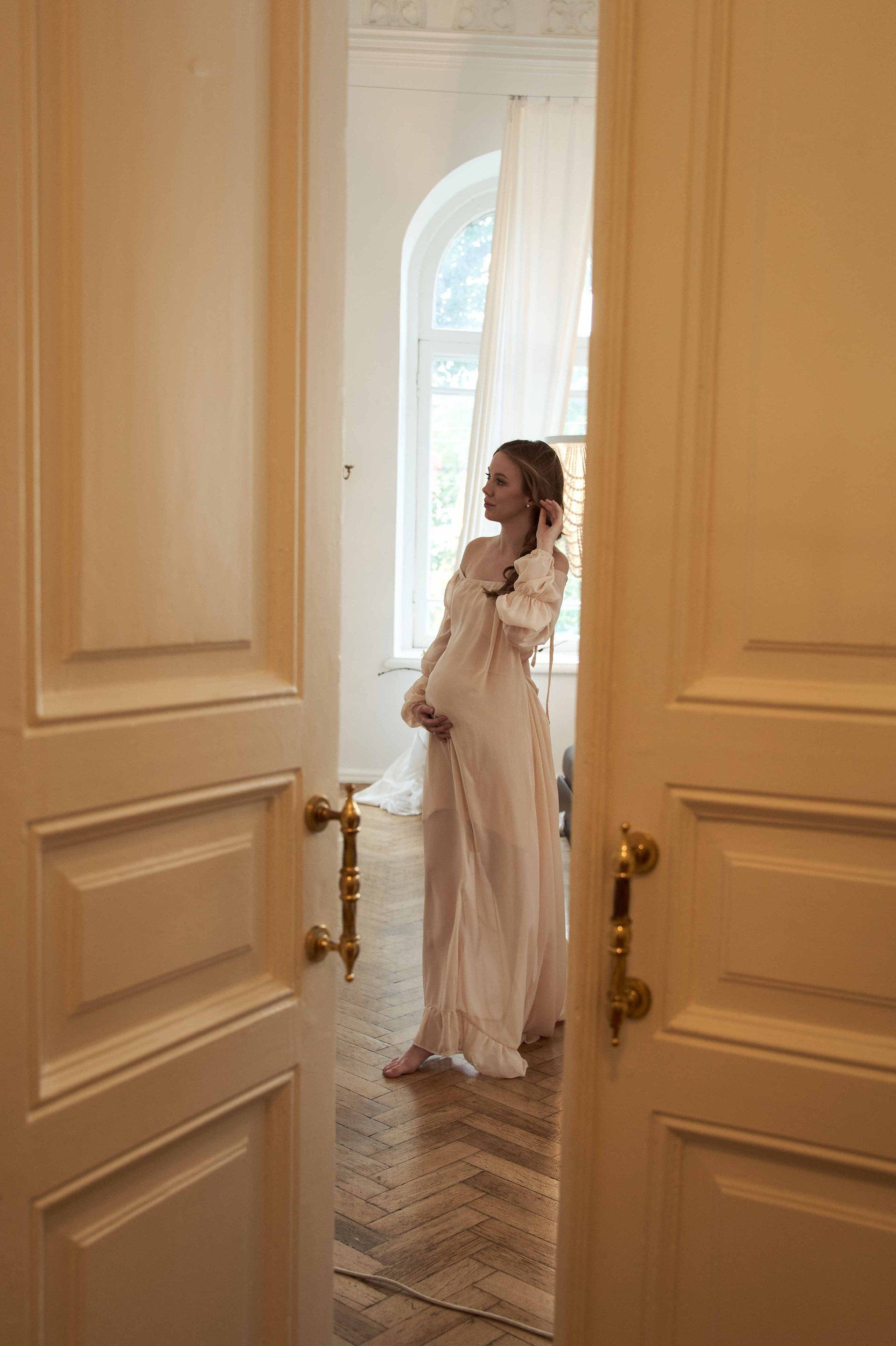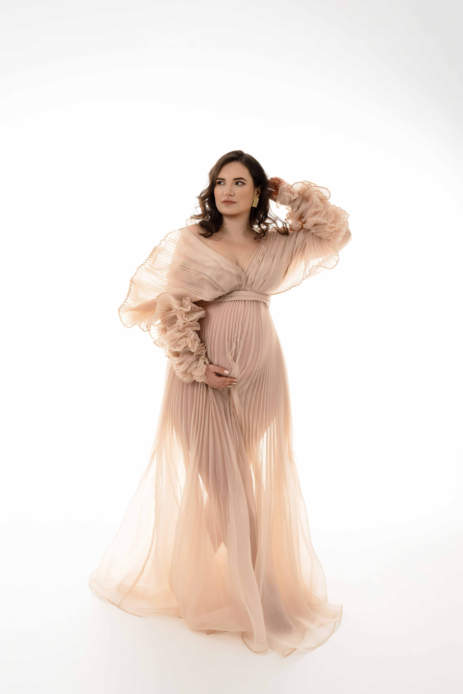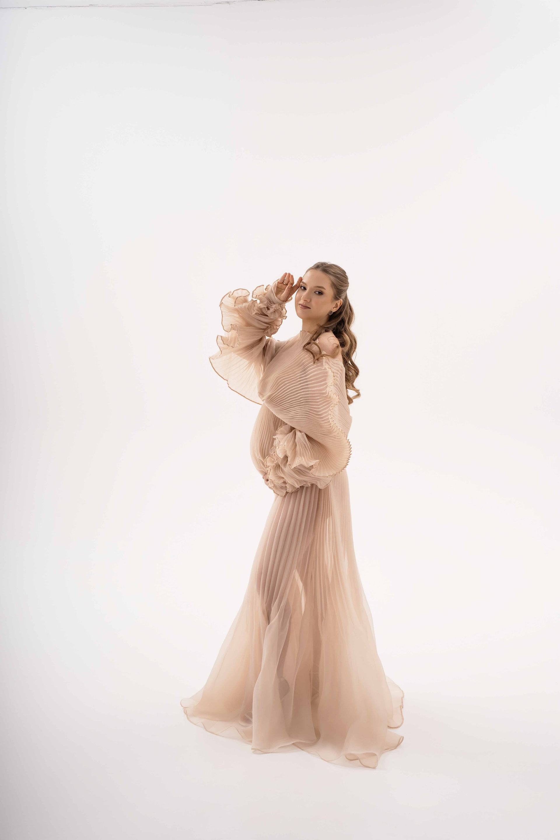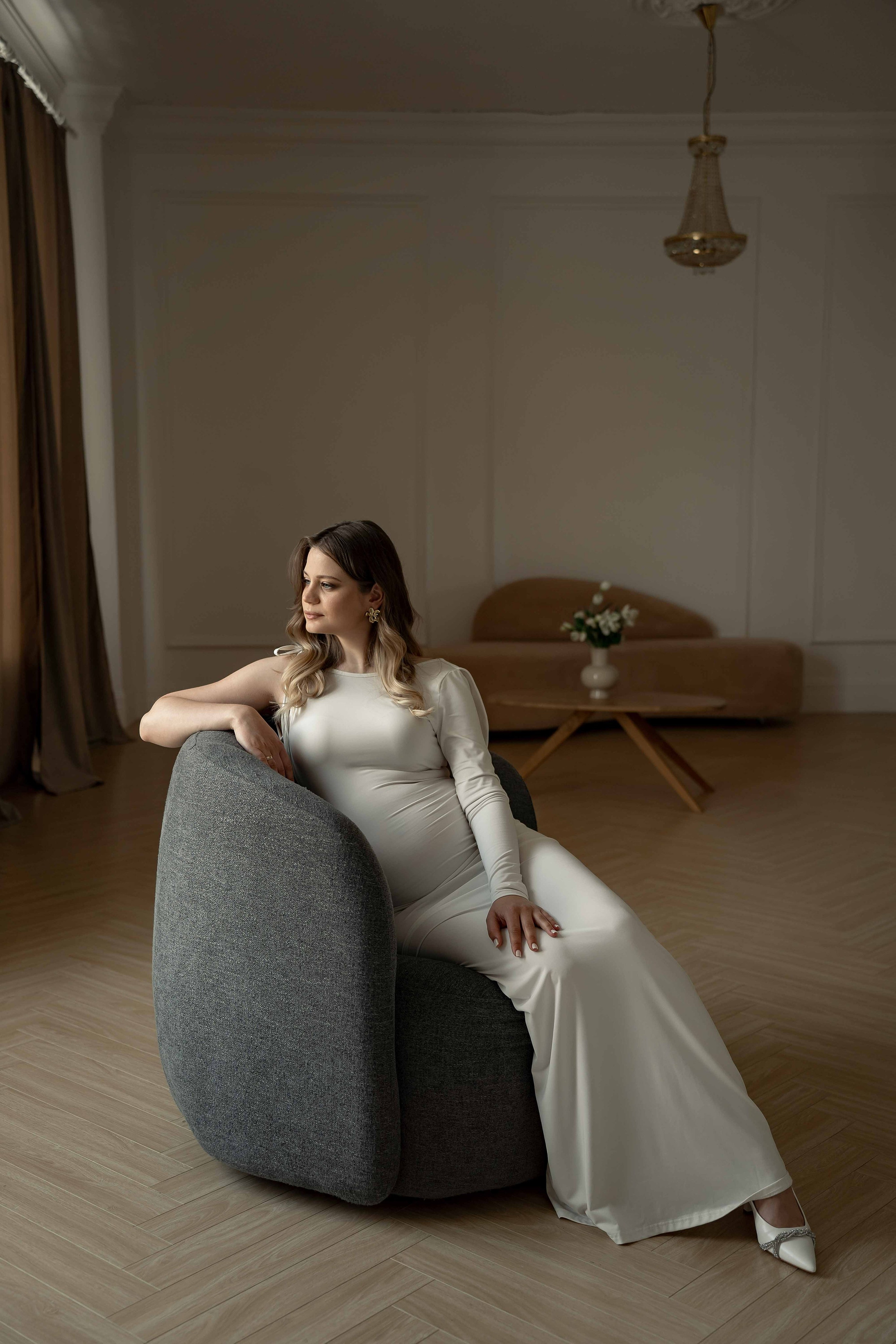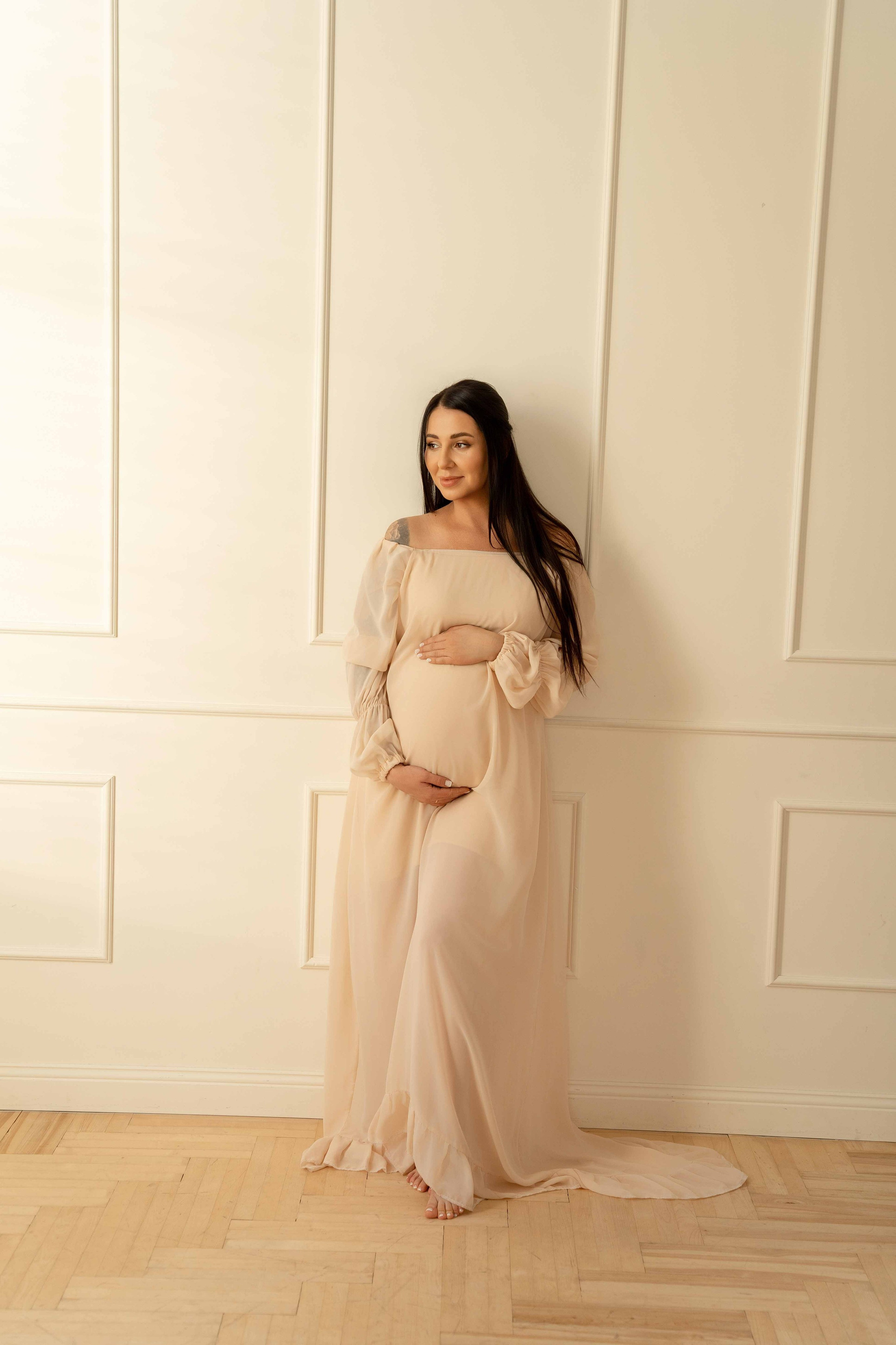Модель one size, с асимметрией рукавов: один рукав открыт, другой — закрыт, что делает образ особенно мягким и выразительным. При поддержке животика в кадре получаются очень нежные, трогательные фотографии.