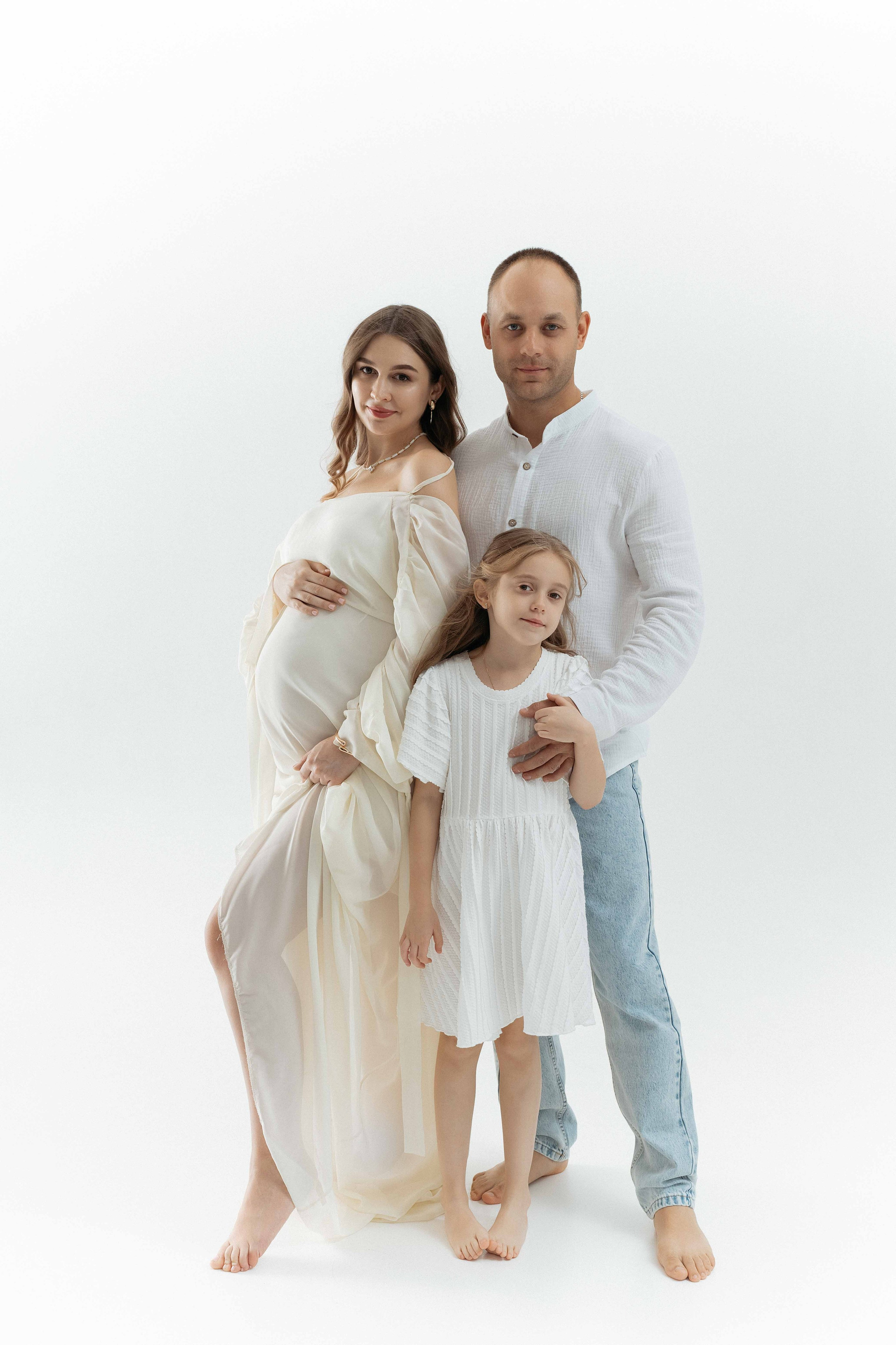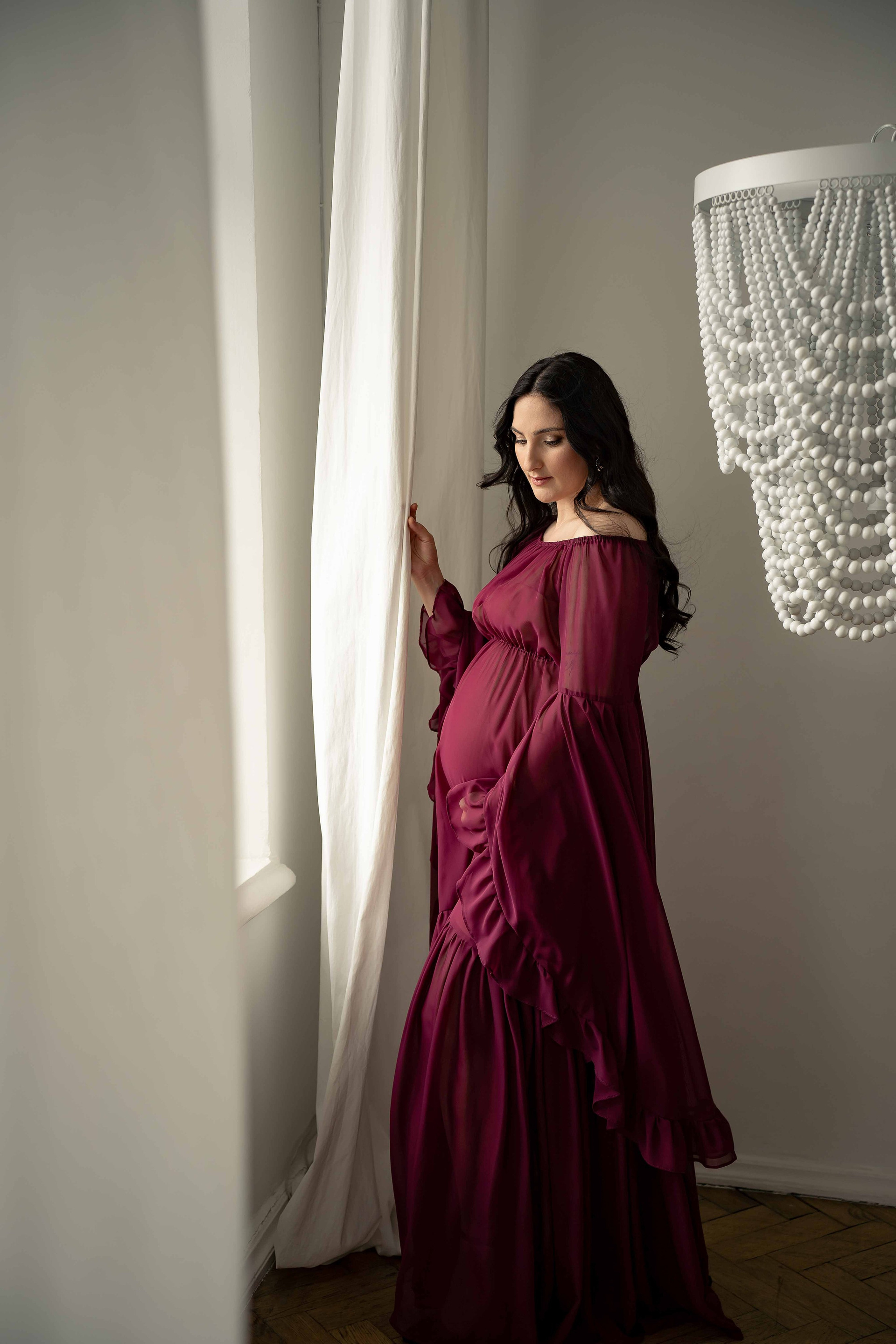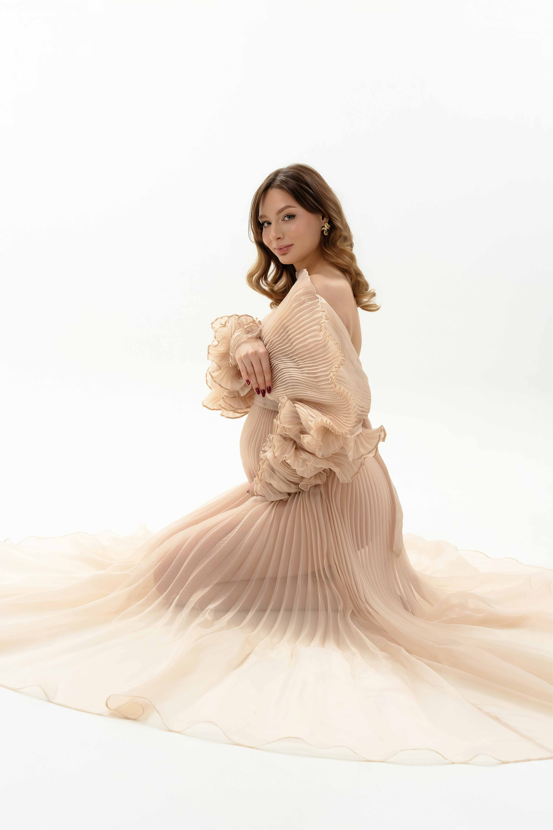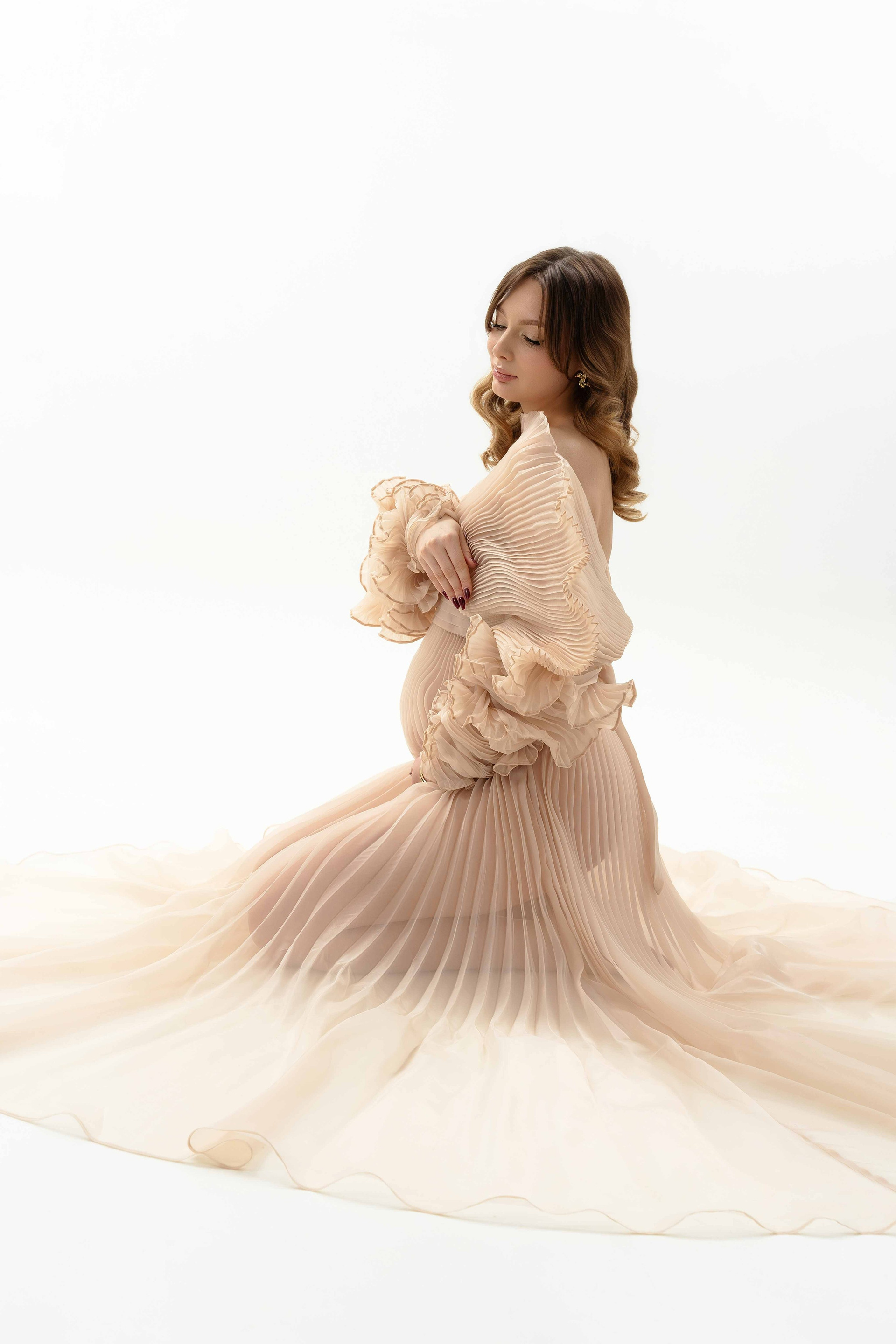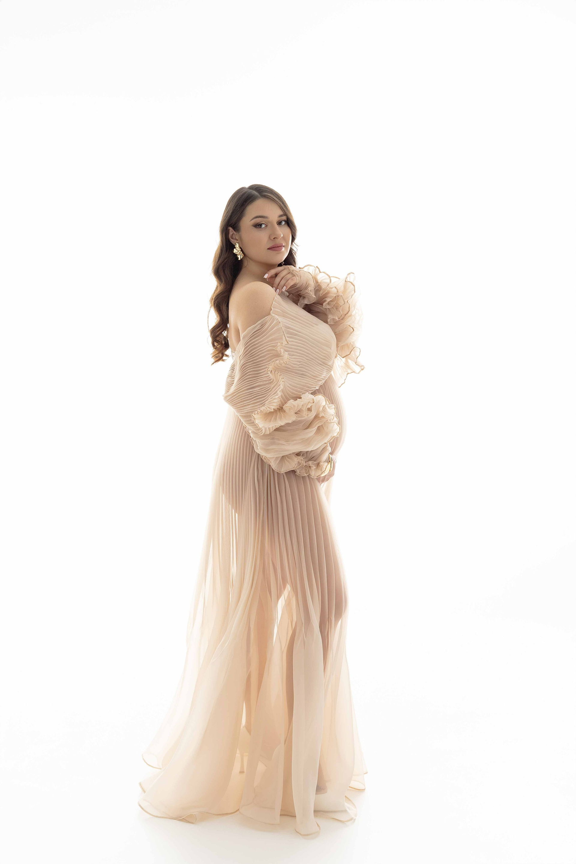Модель one size, с асимметрией рукавов: один рукав открыт, другой — закрыт, что делает образ особенно мягким и выразительным. При поддержке животика в кадре получаются очень нежные, трогательные фотографии.