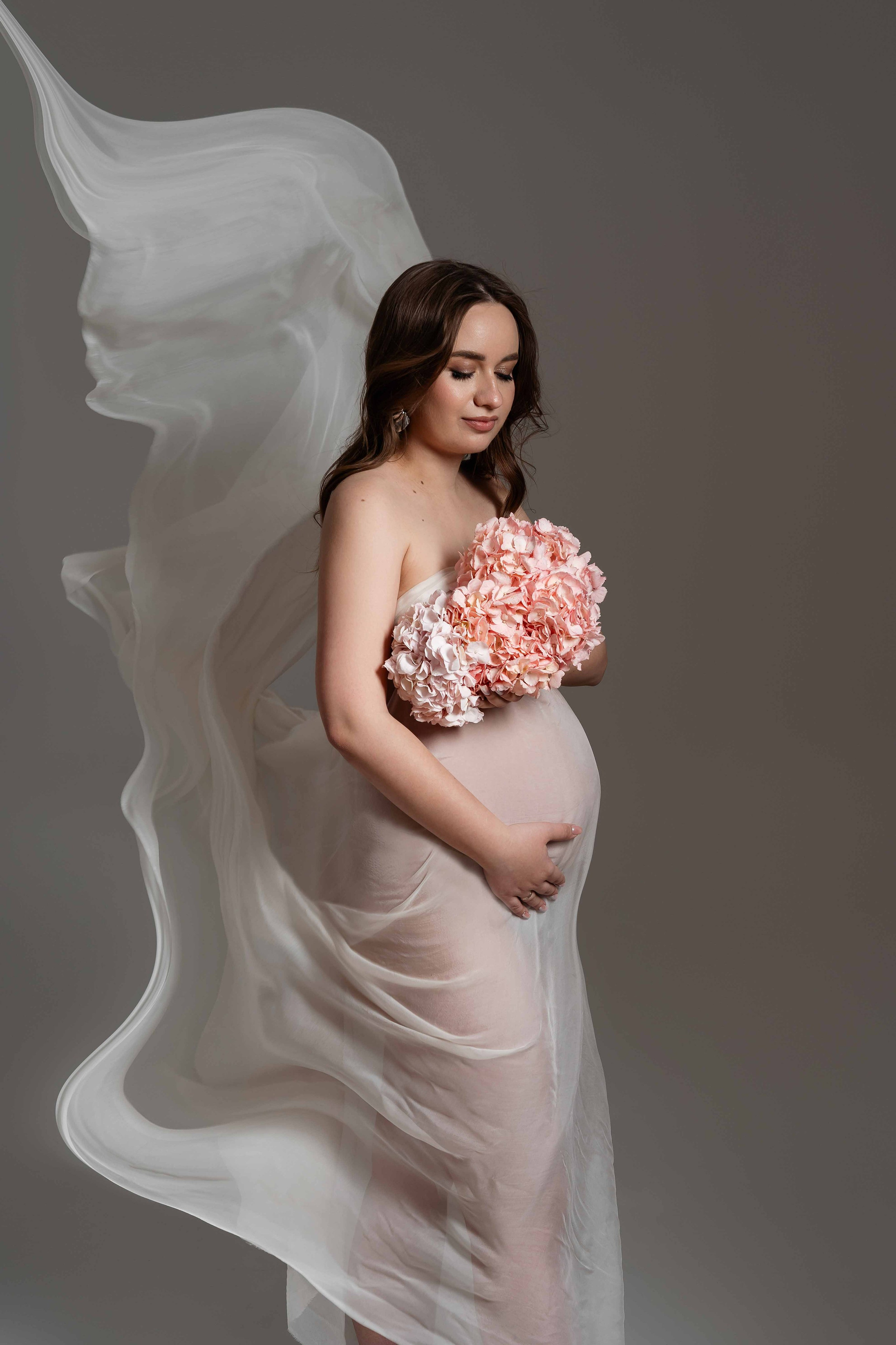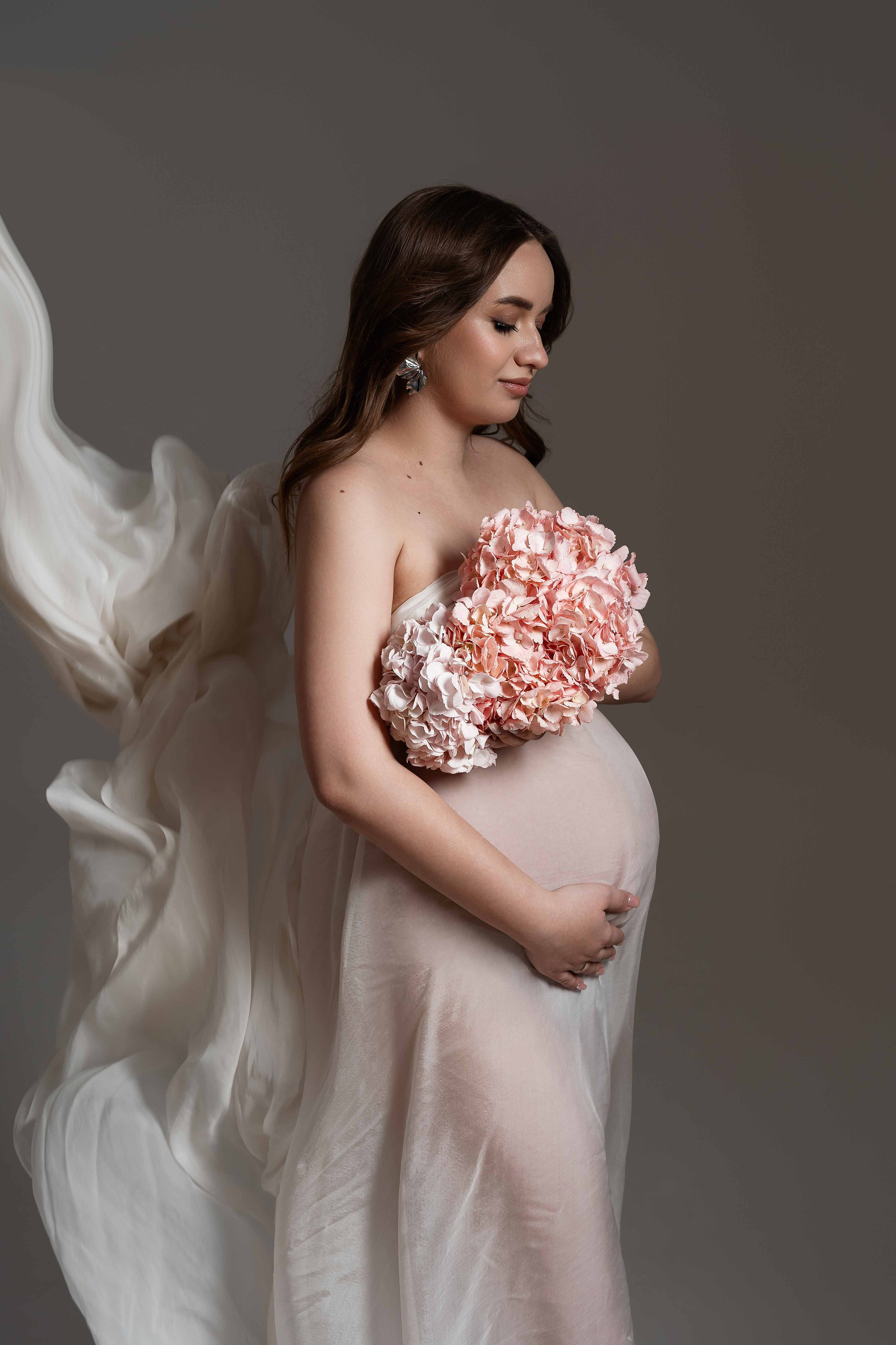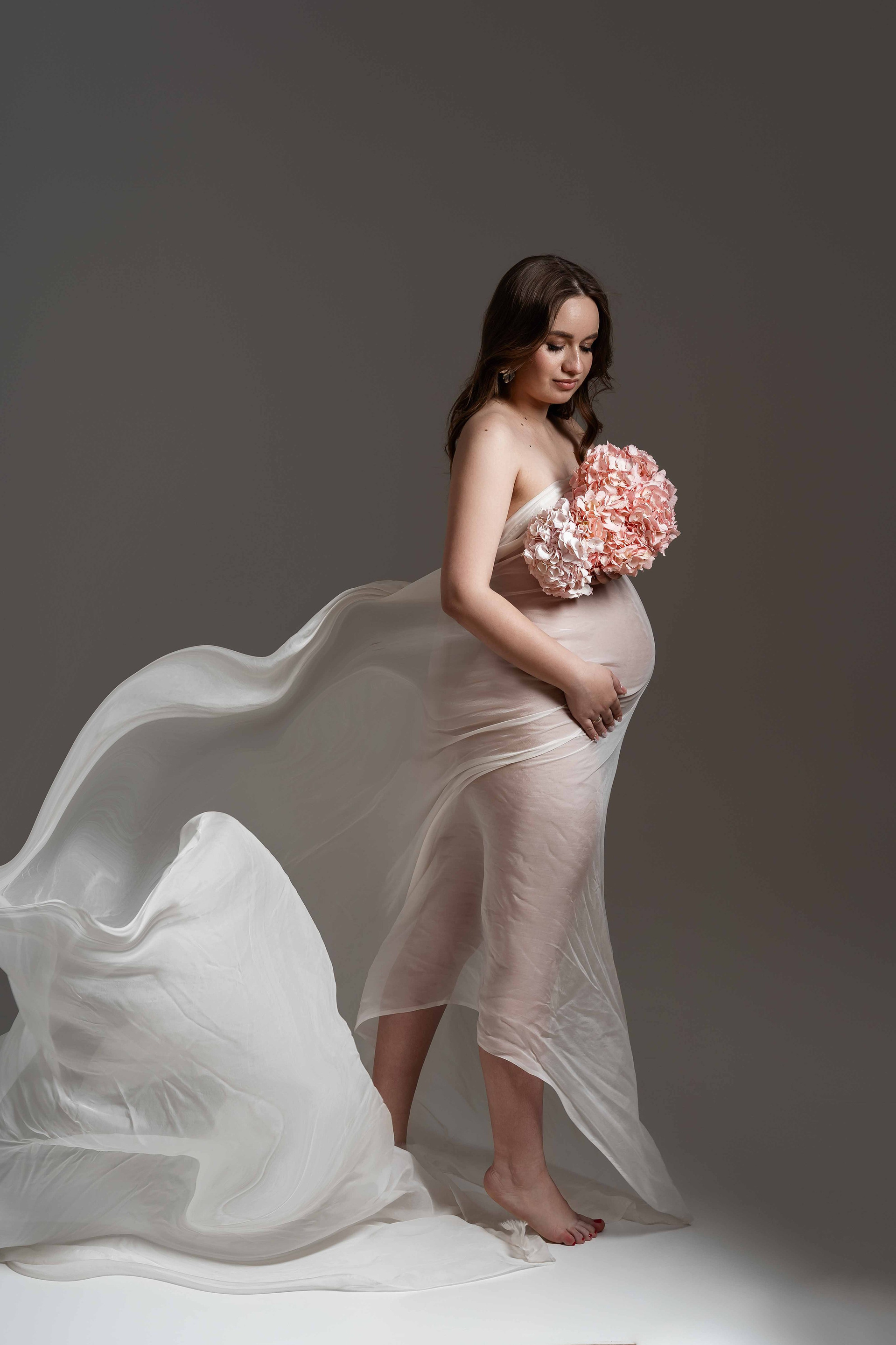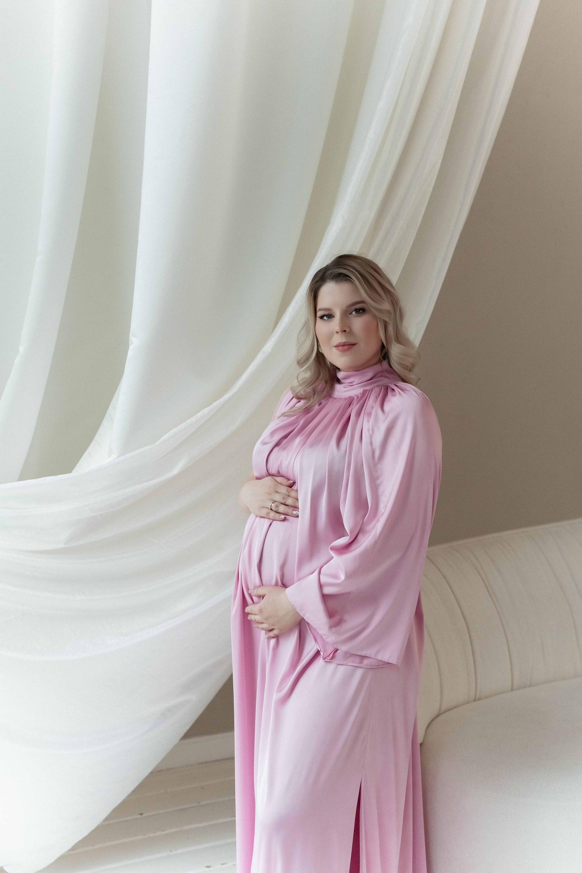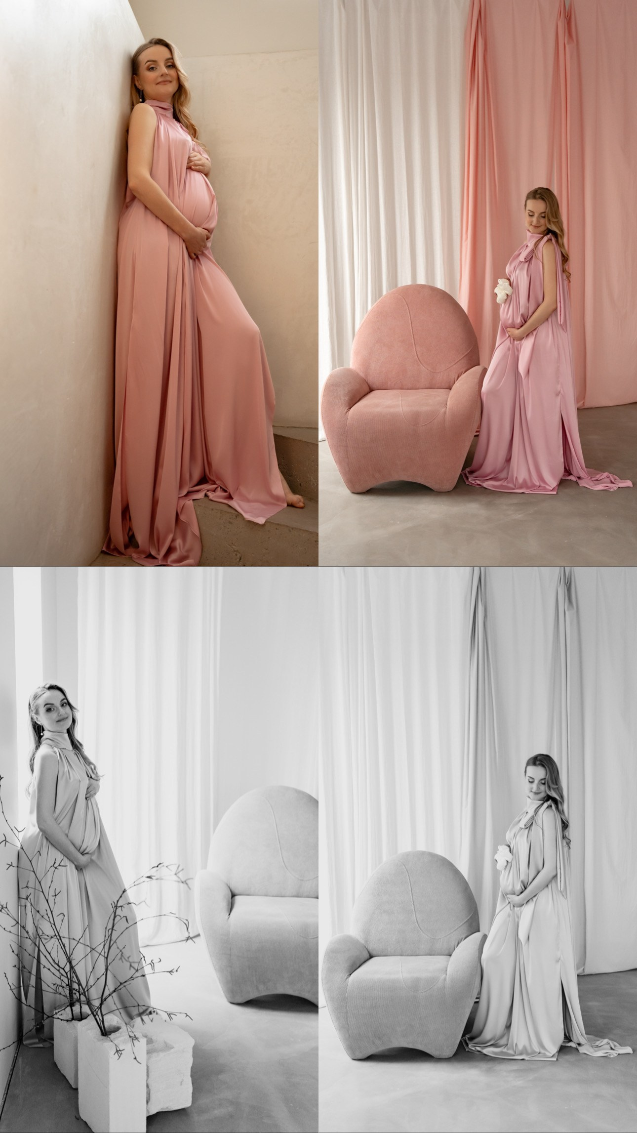 Розовая ткань мягко подчёркивает беременный животик, создавая нежный, чувственный визуал и атмосферу лёгкости в кадре. Этот образ всегда получается особенным и наполненным эмоциями.