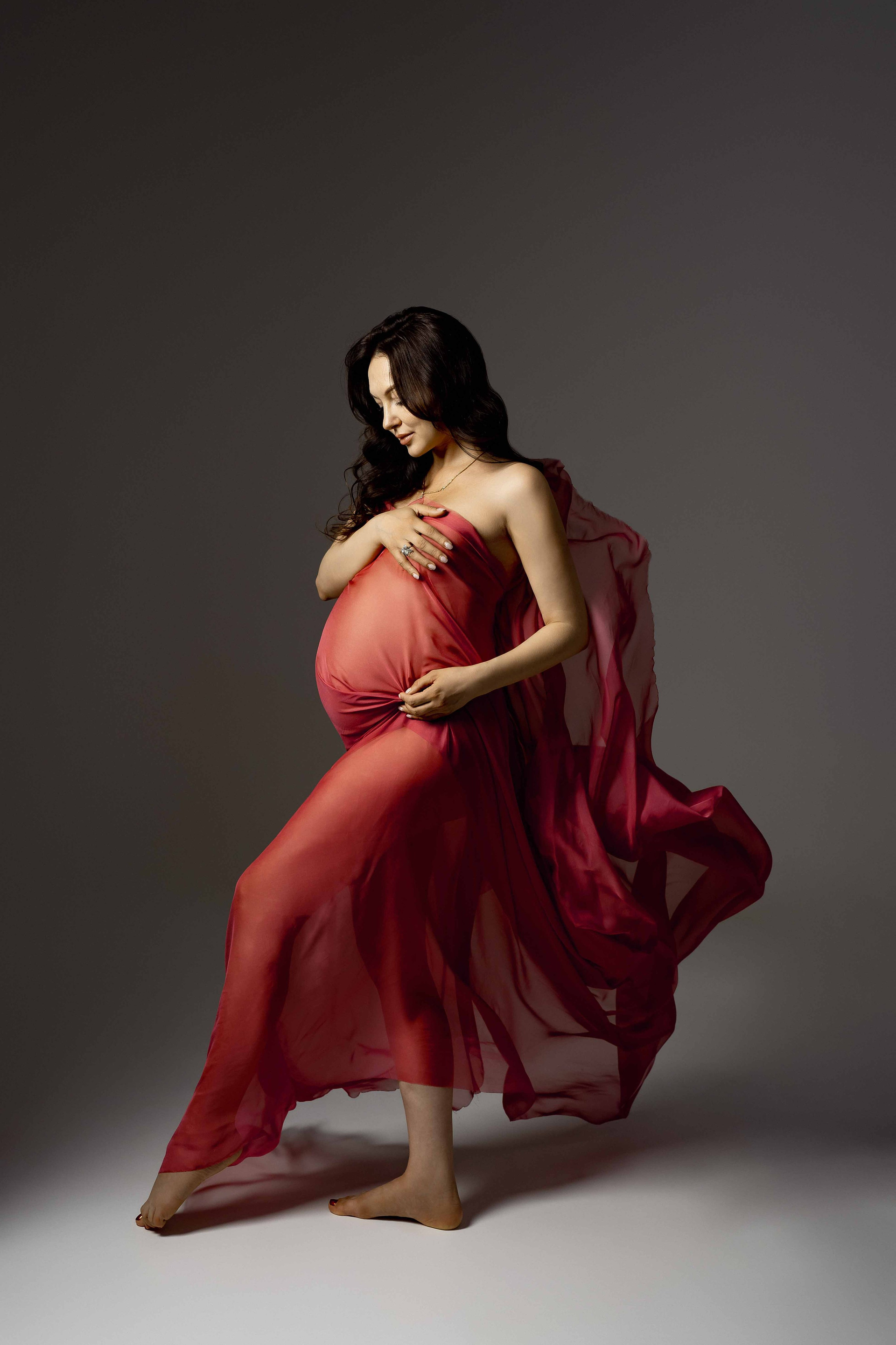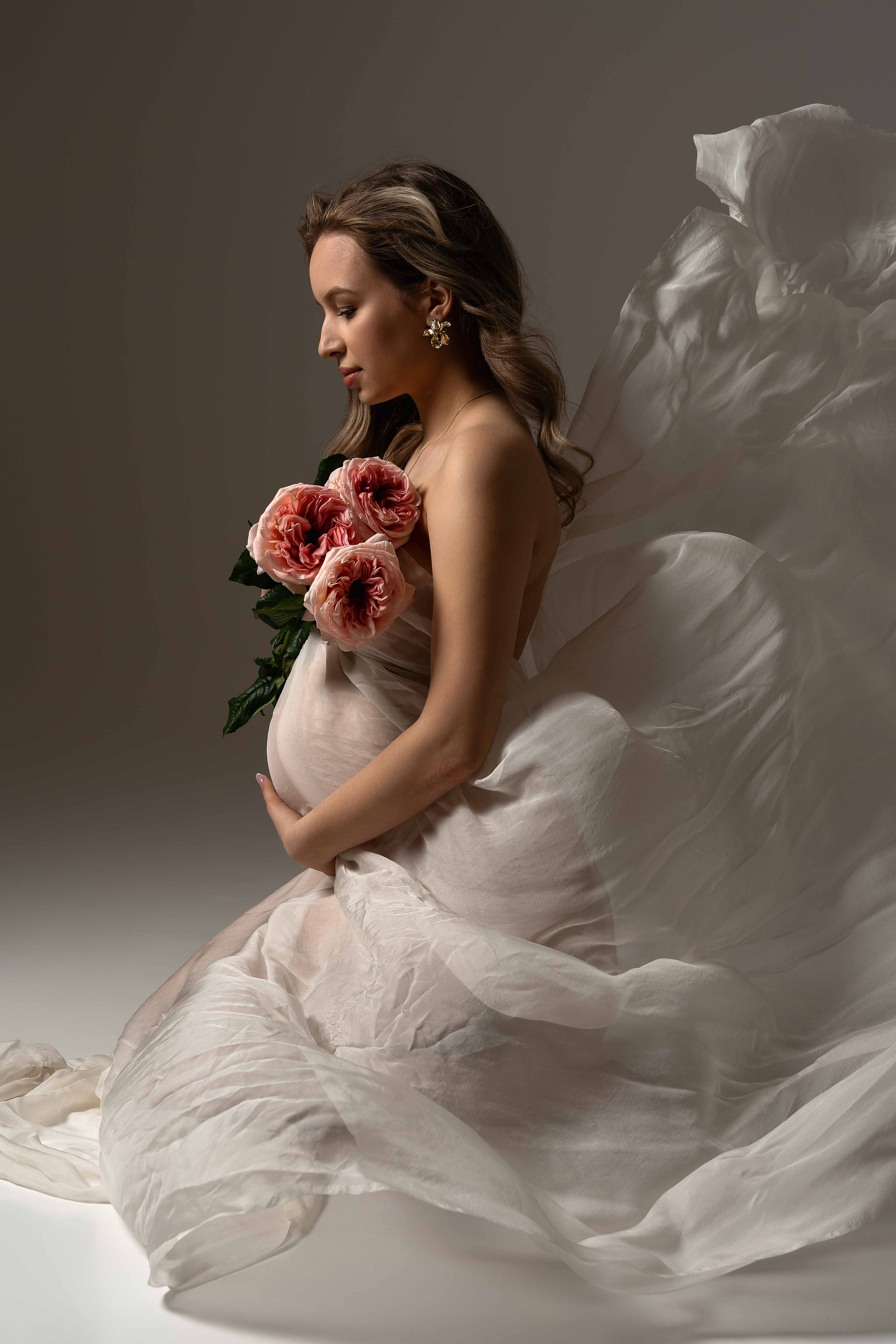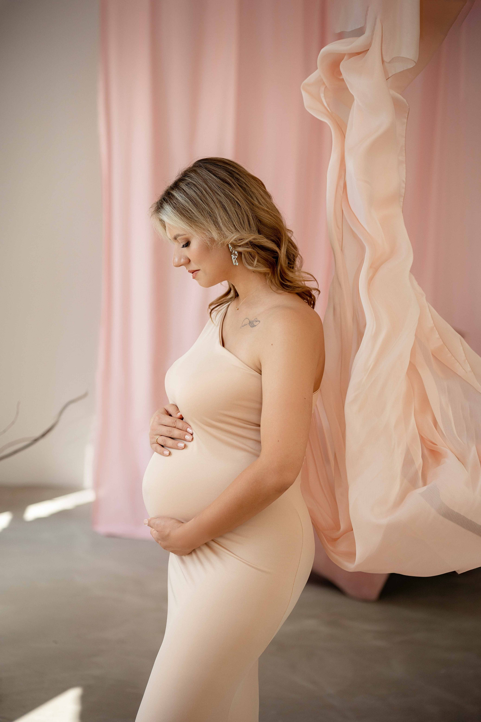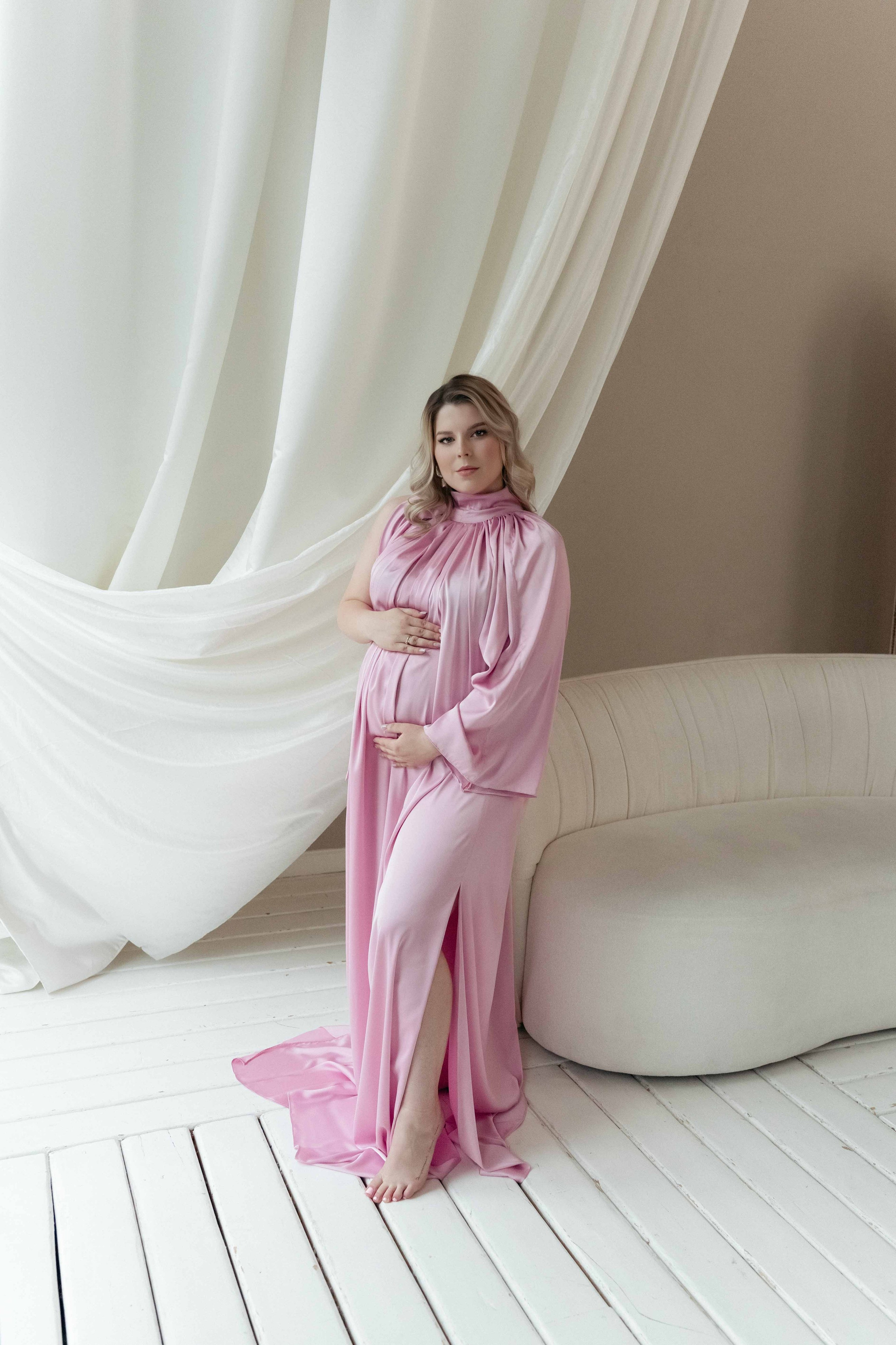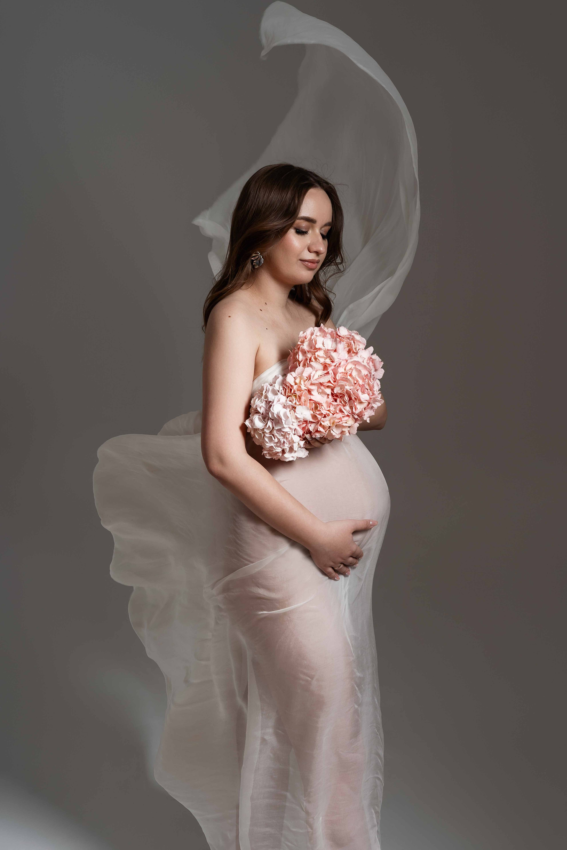 Розовая ткань мягко подчёркивает беременный животик, создавая нежный, чувственный визуал и атмосферу лёгкости в кадре. Этот образ всегда получается особенным и наполненным эмоциями.
