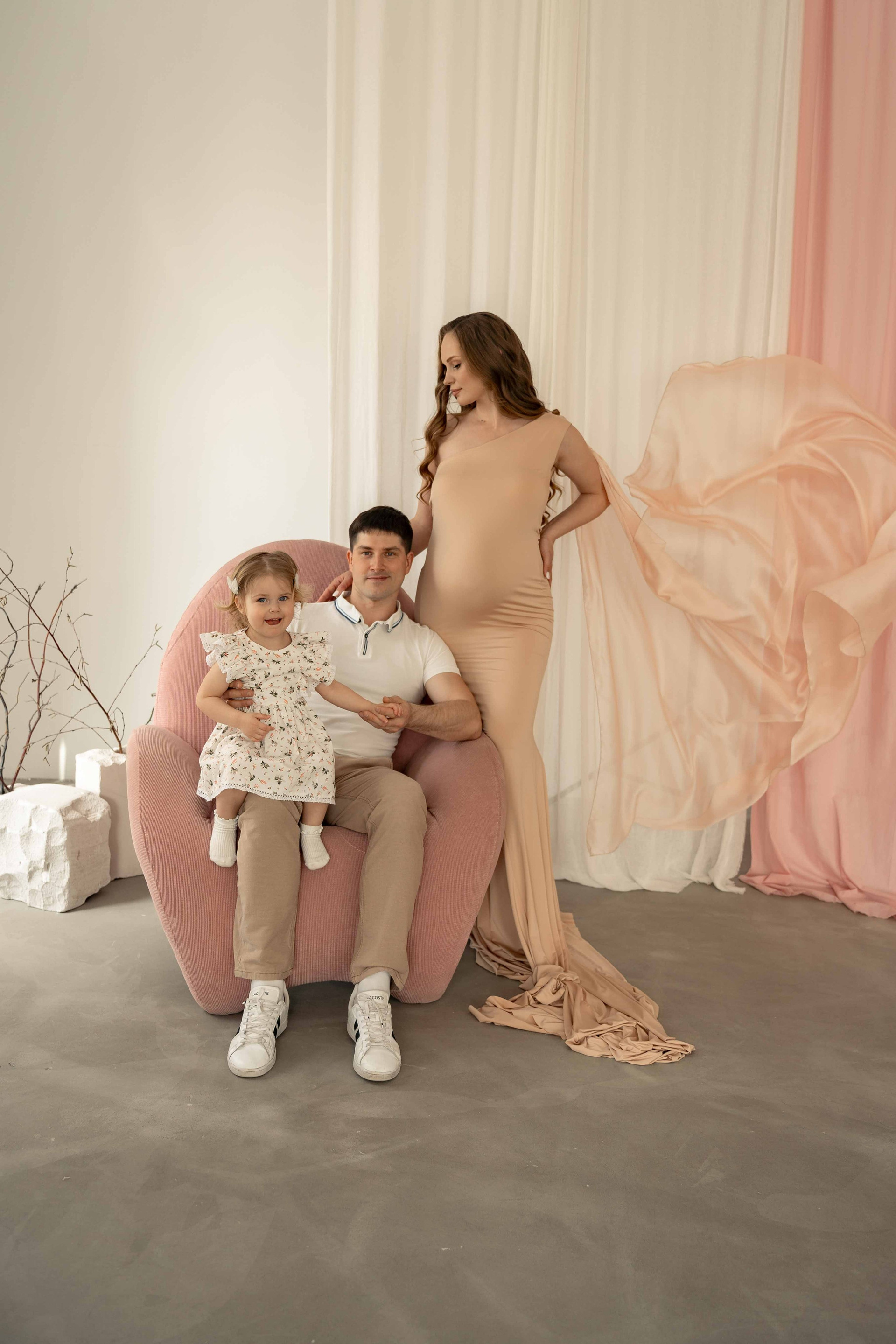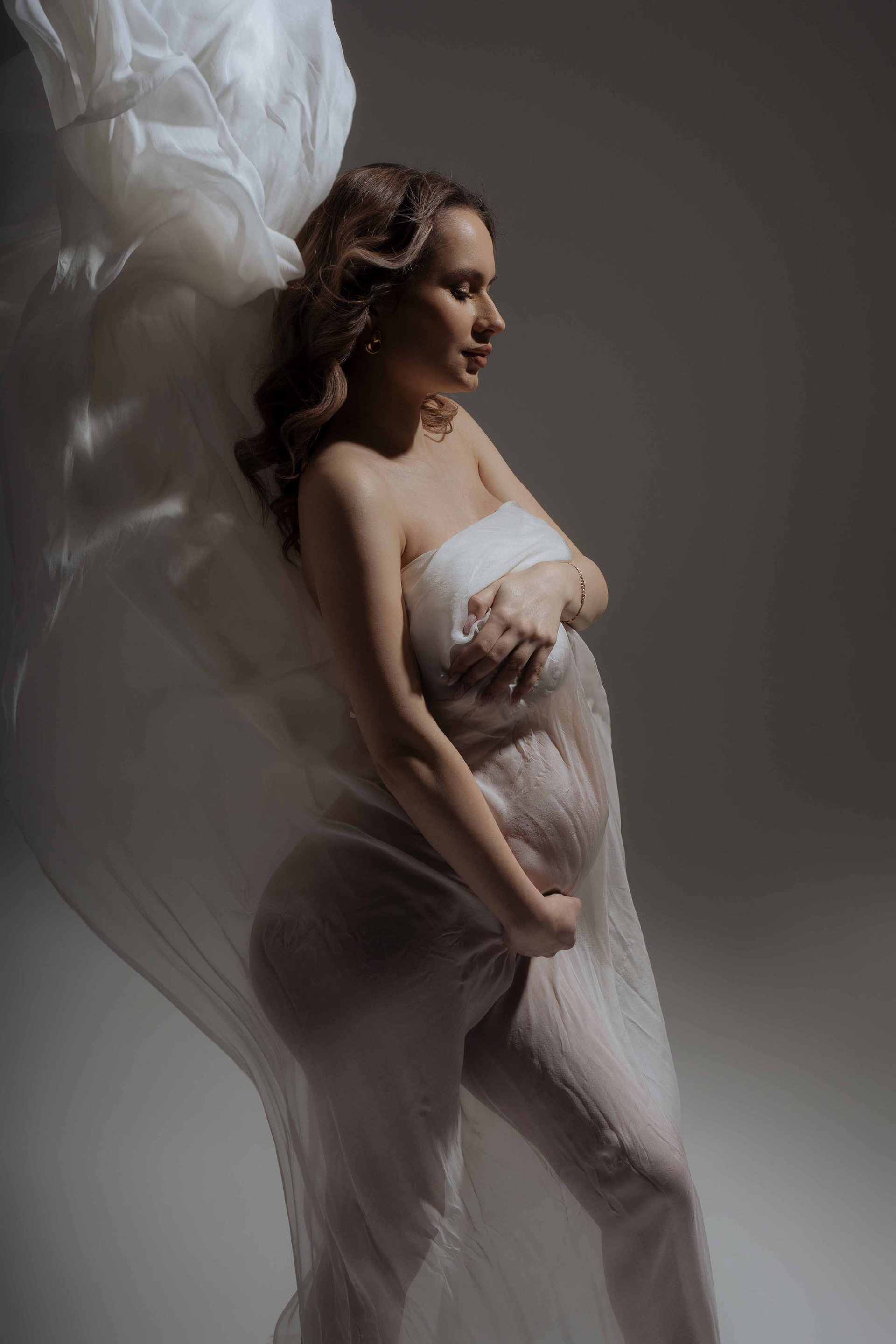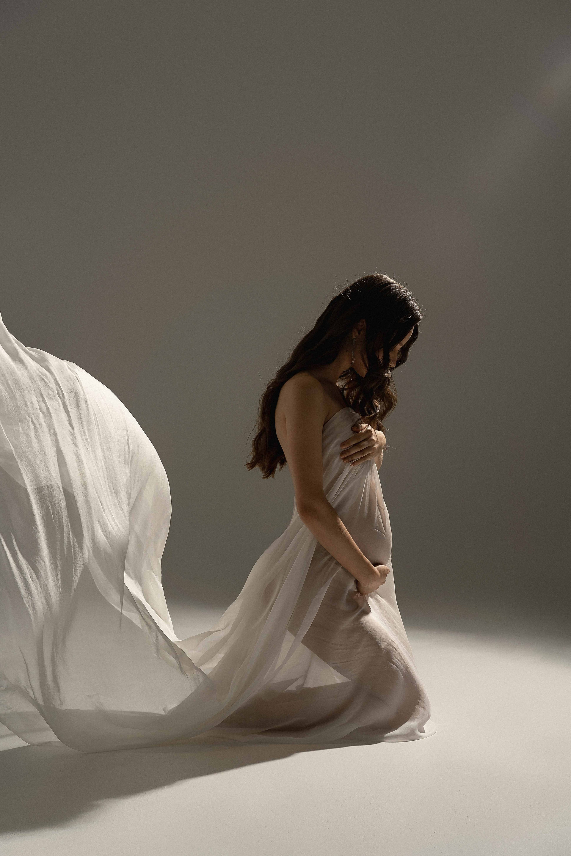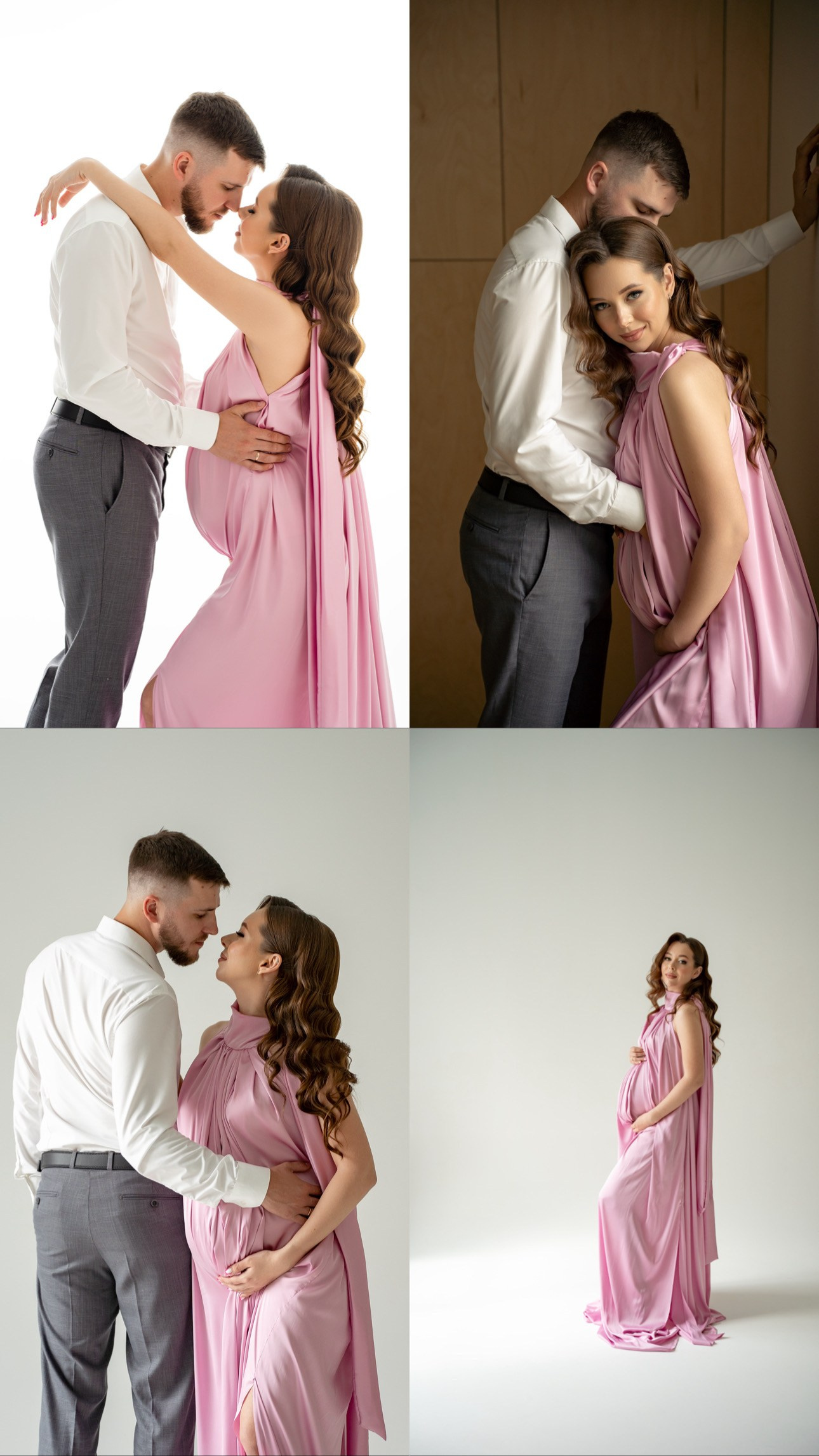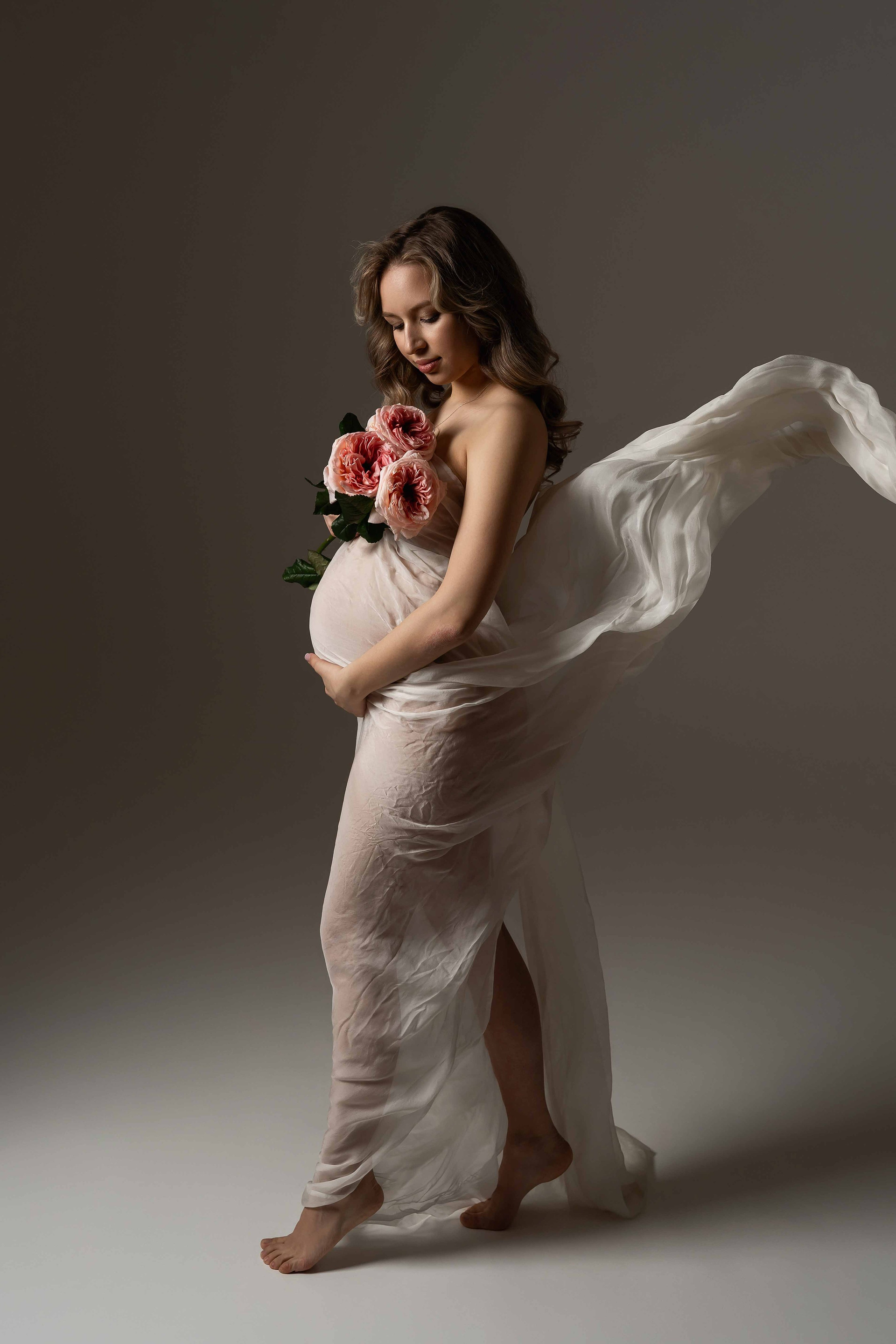 Розовая ткань мягко подчёркивает беременный животик, создавая нежный, чувственный визуал и атмосферу лёгкости в кадре. Этот образ всегда получается особенным и наполненным эмоциями.