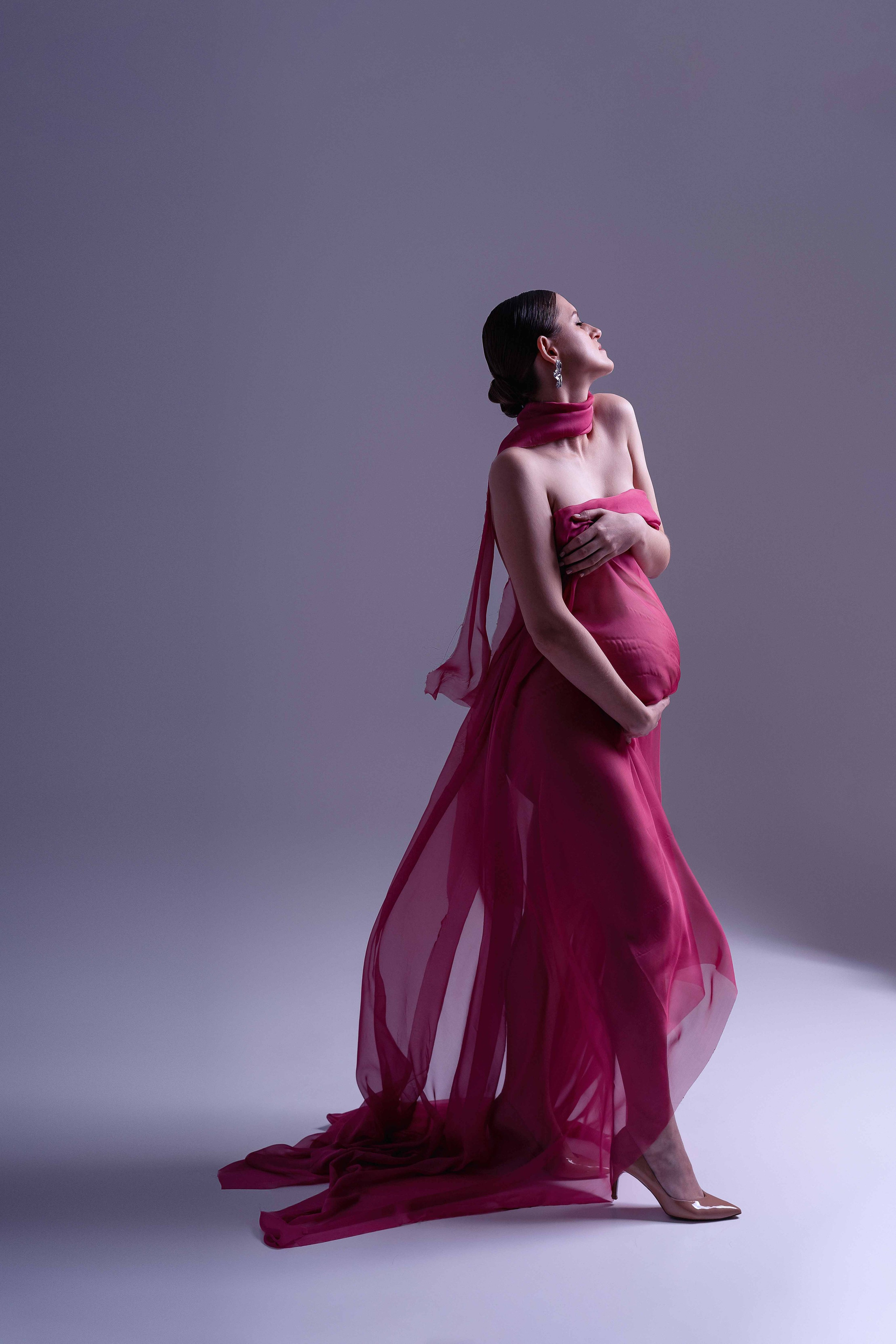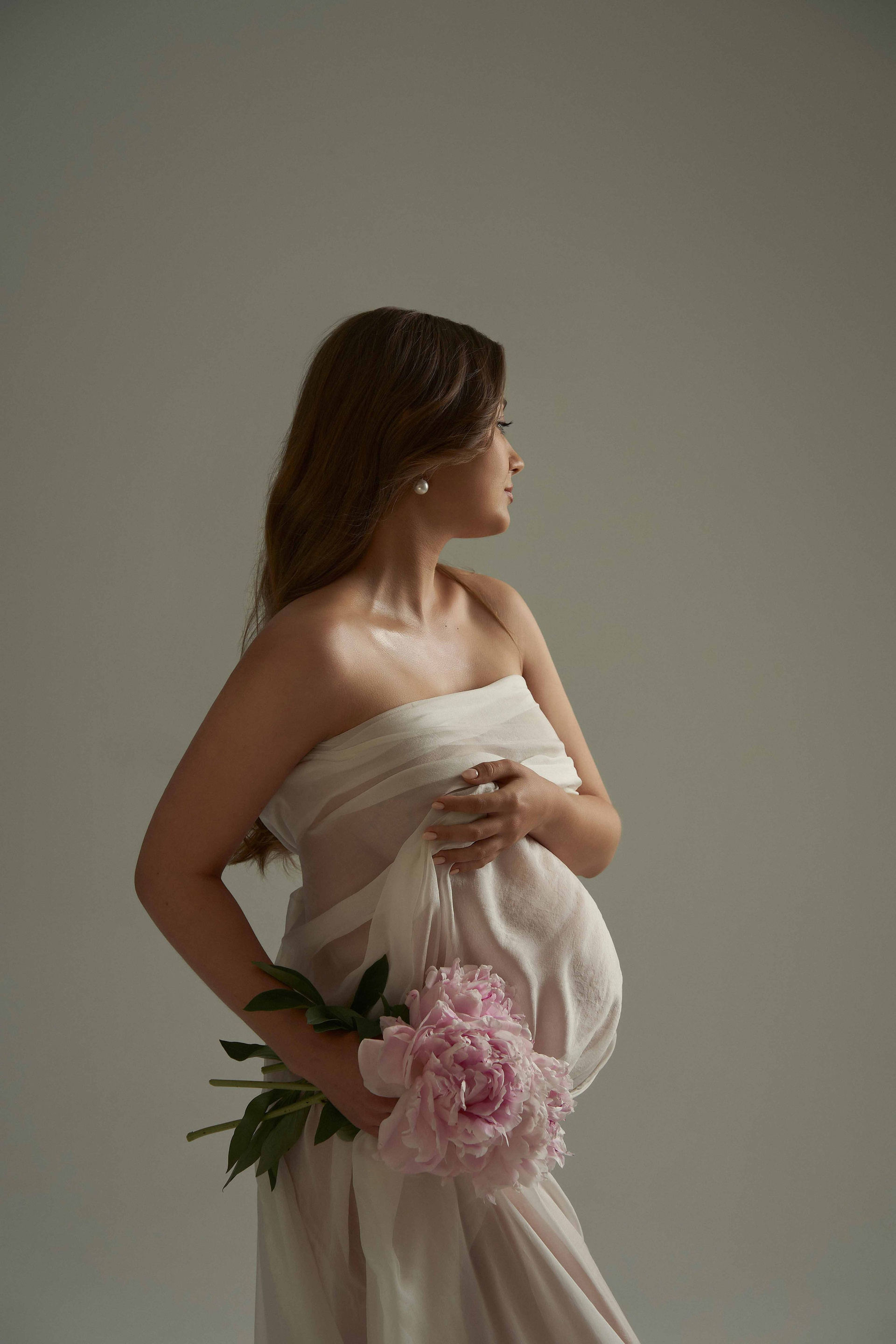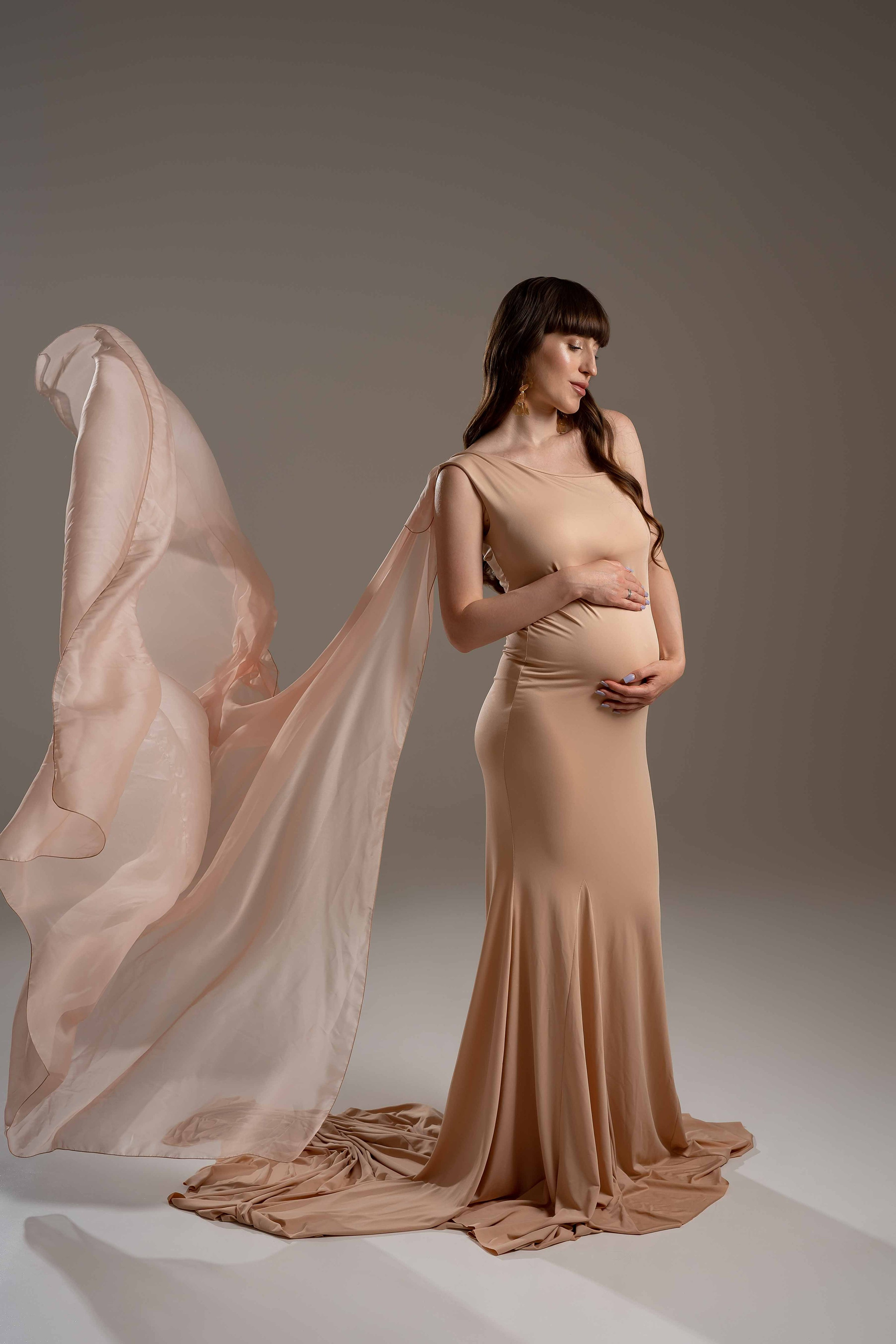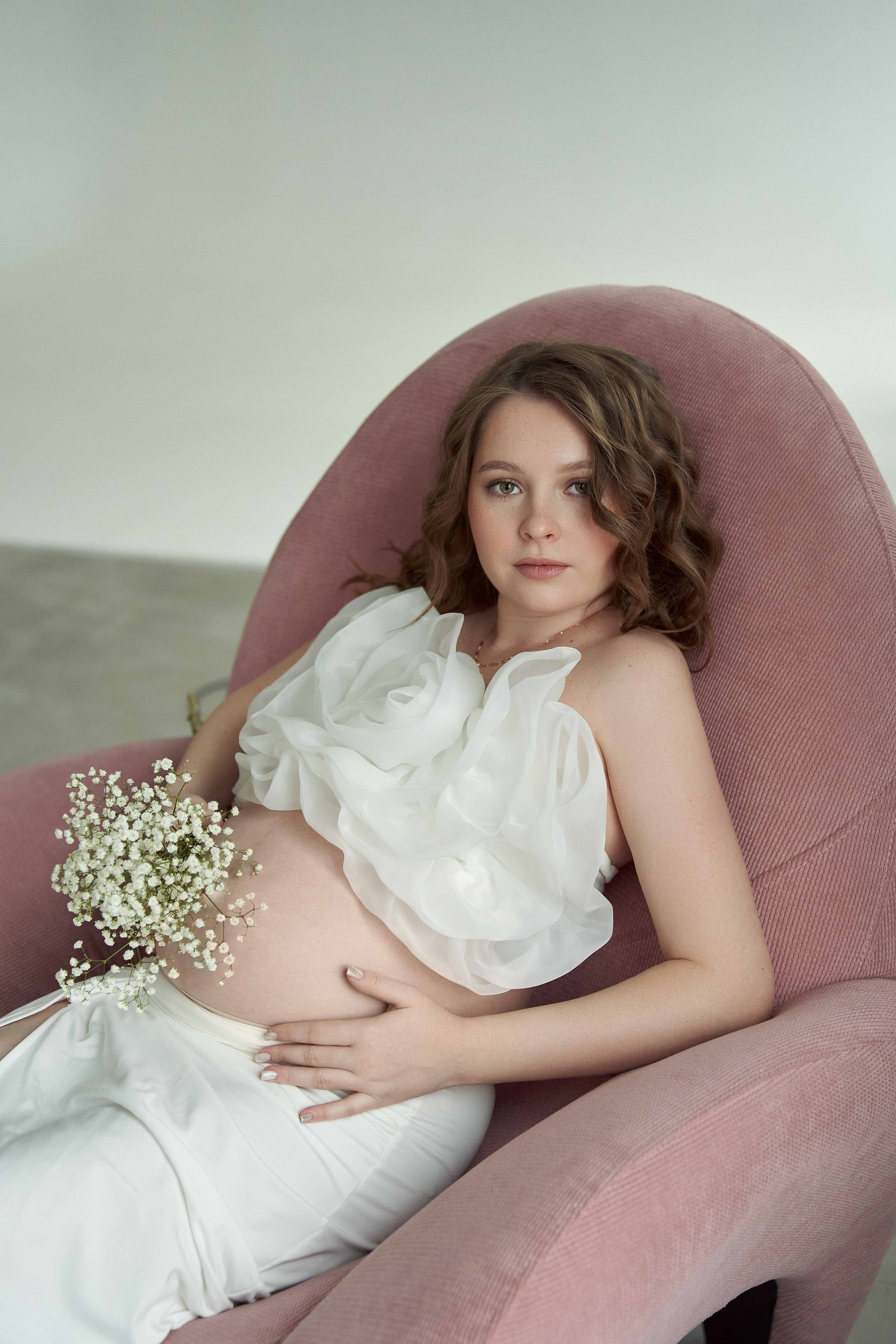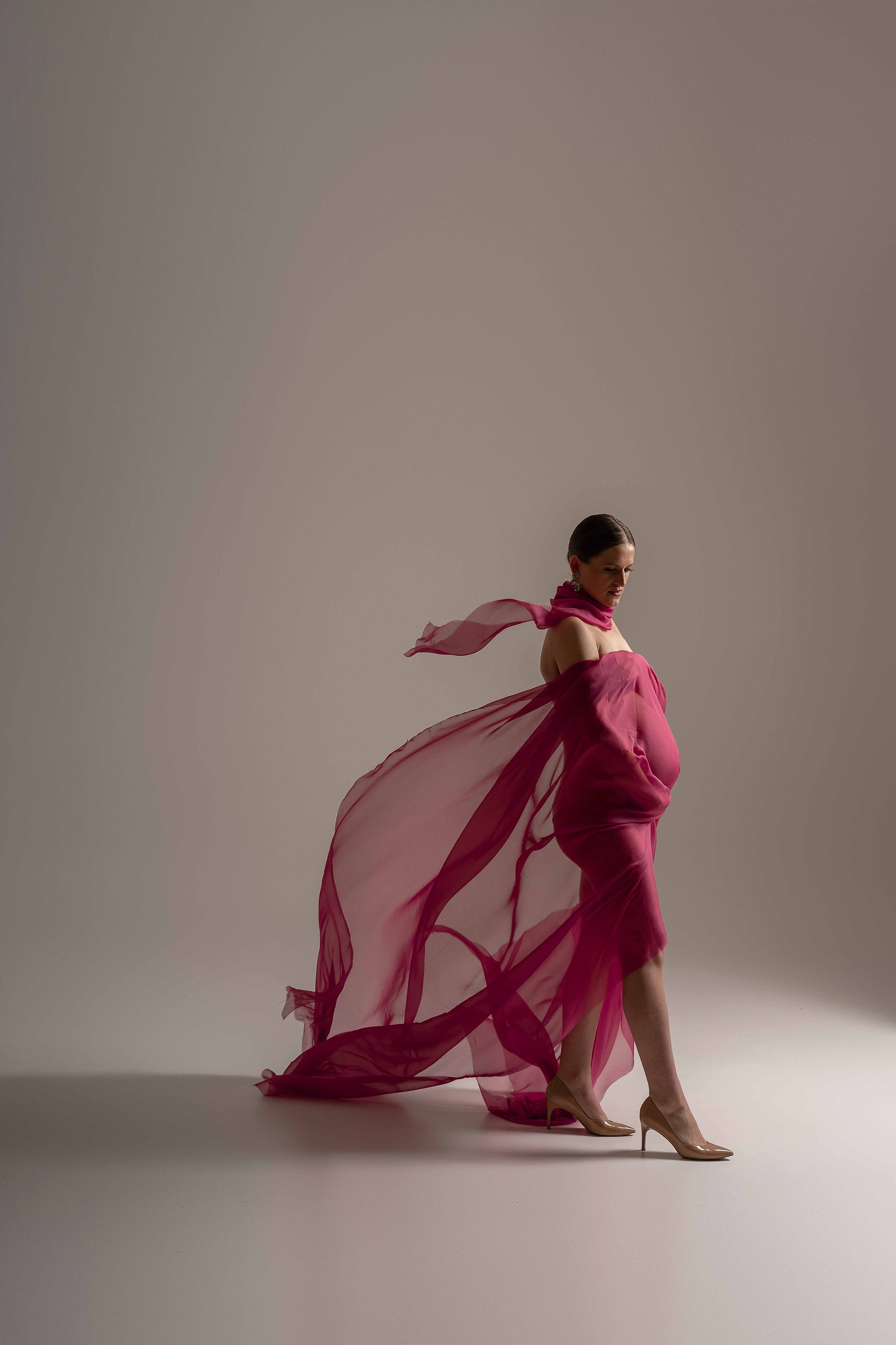 Розовая ткань мягко подчёркивает беременный животик, создавая нежный, чувственный визуал и атмосферу лёгкости в кадре. Этот образ всегда получается особенным и наполненным эмоциями.