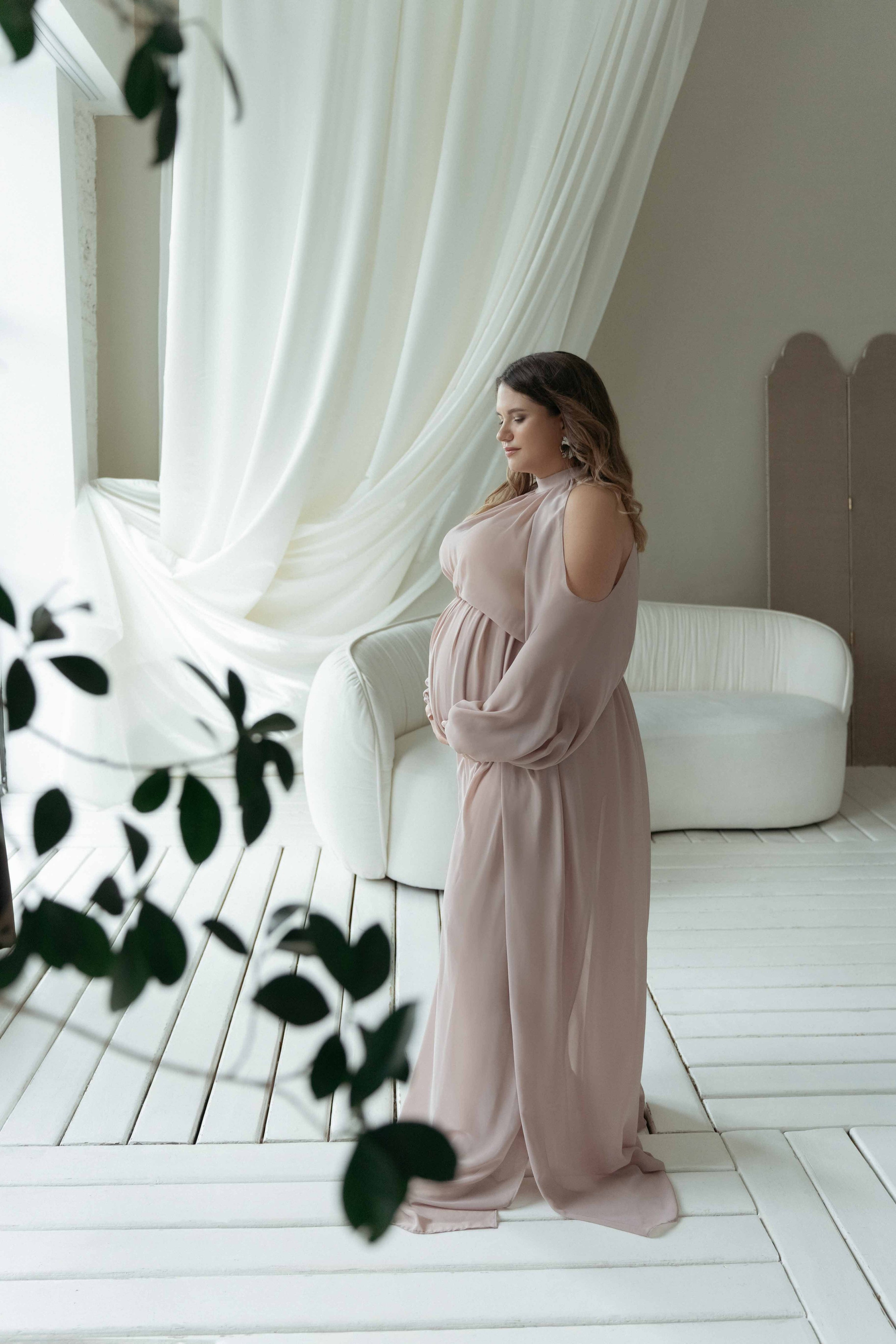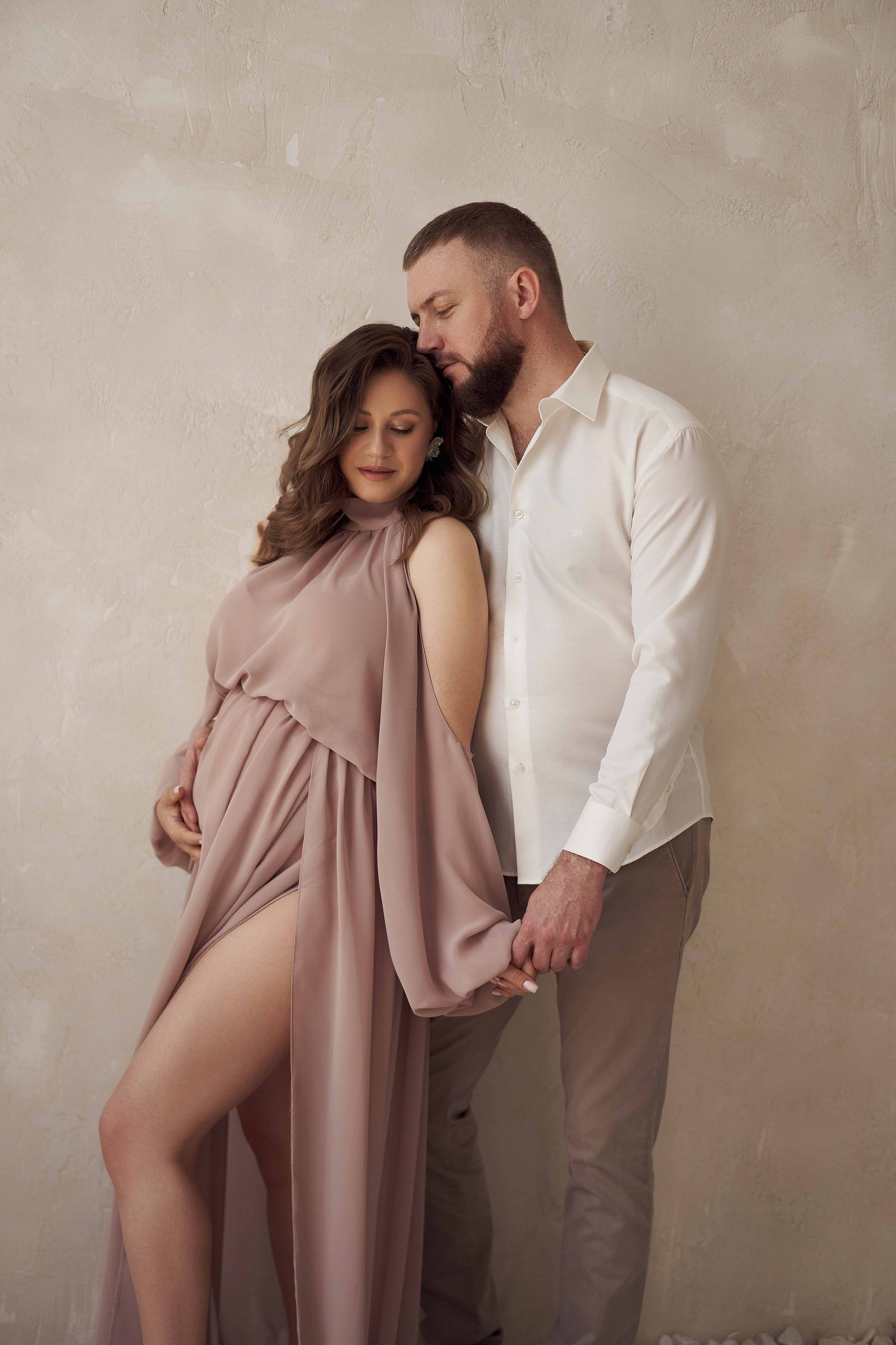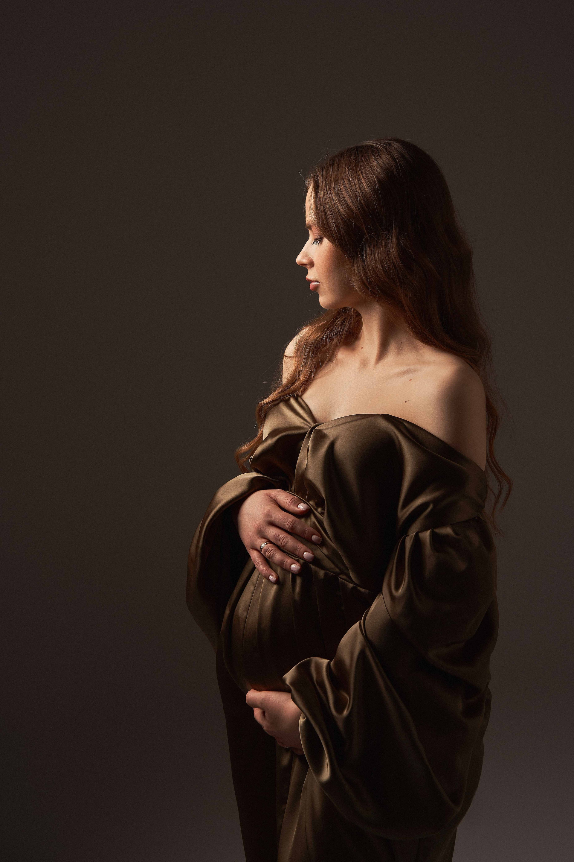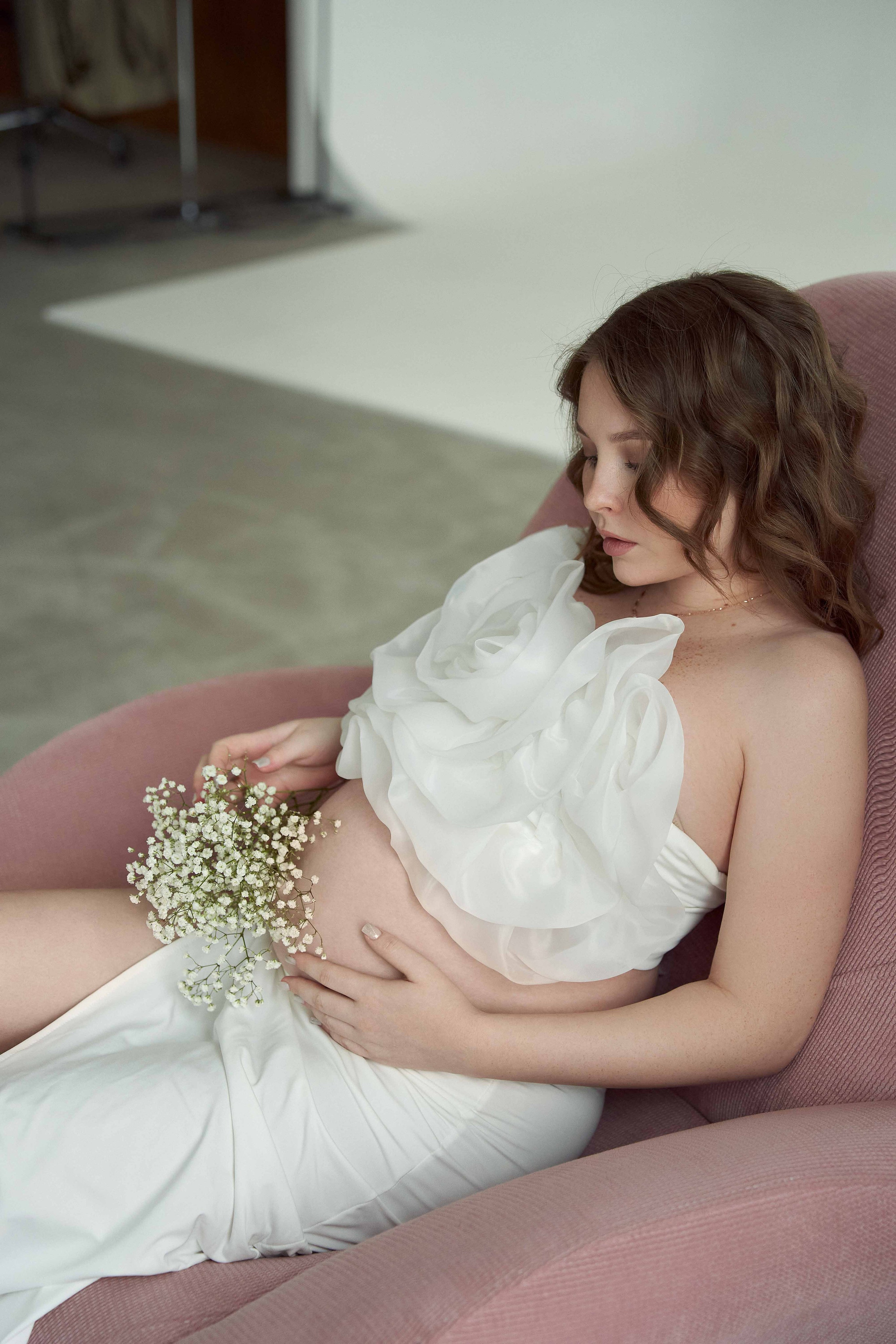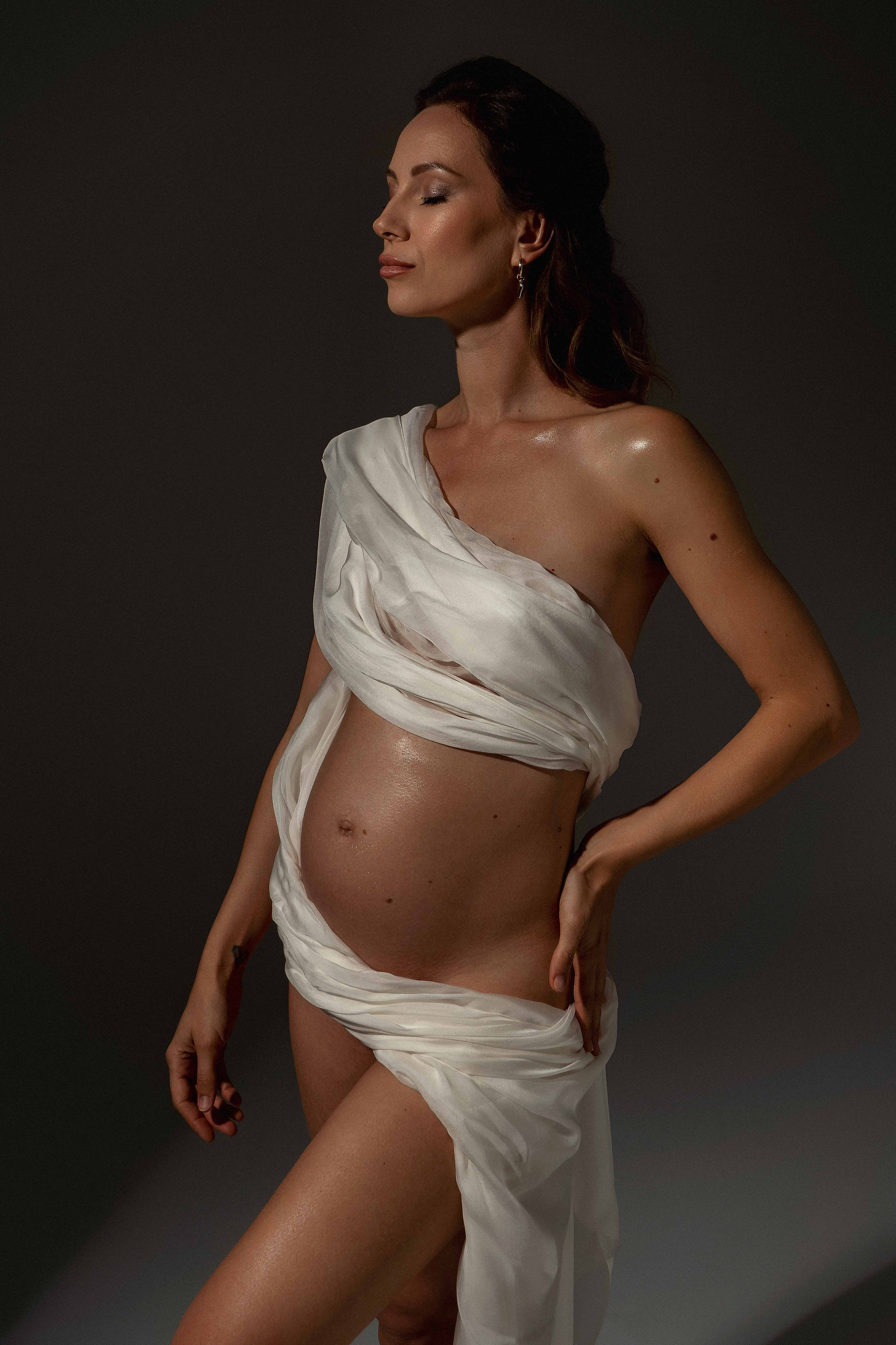Розовая ткань мягко подчёркивает беременный животик, создавая нежный, чувственный визуал и атмосферу лёгкости в кадре. Этот образ всегда получается особенным и наполненным эмоциями.