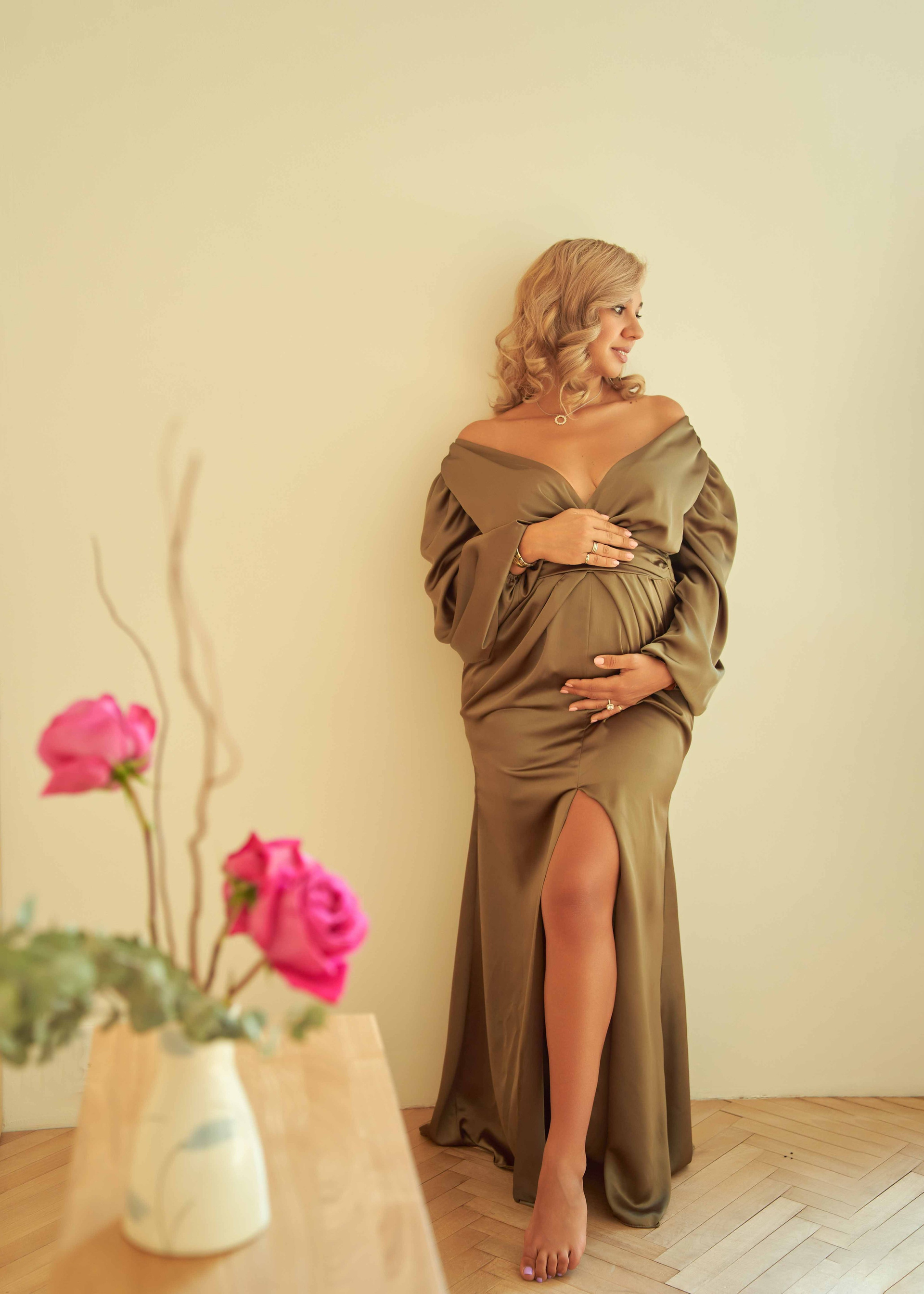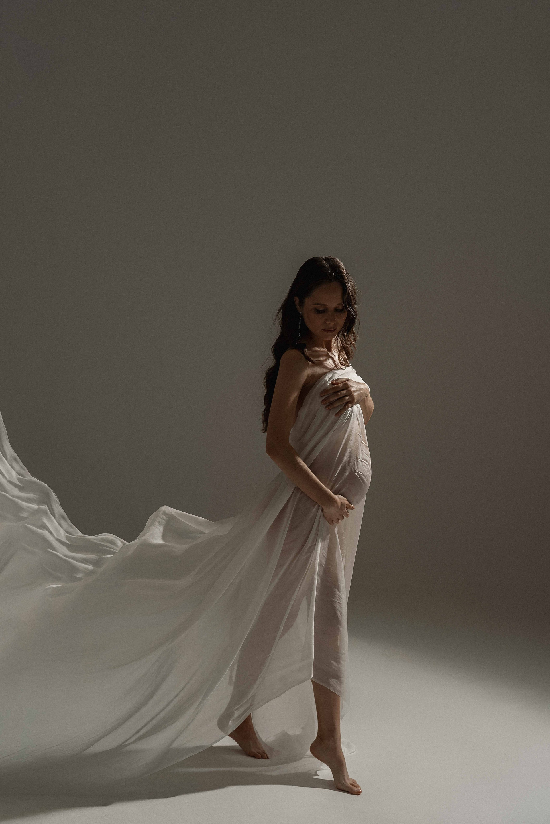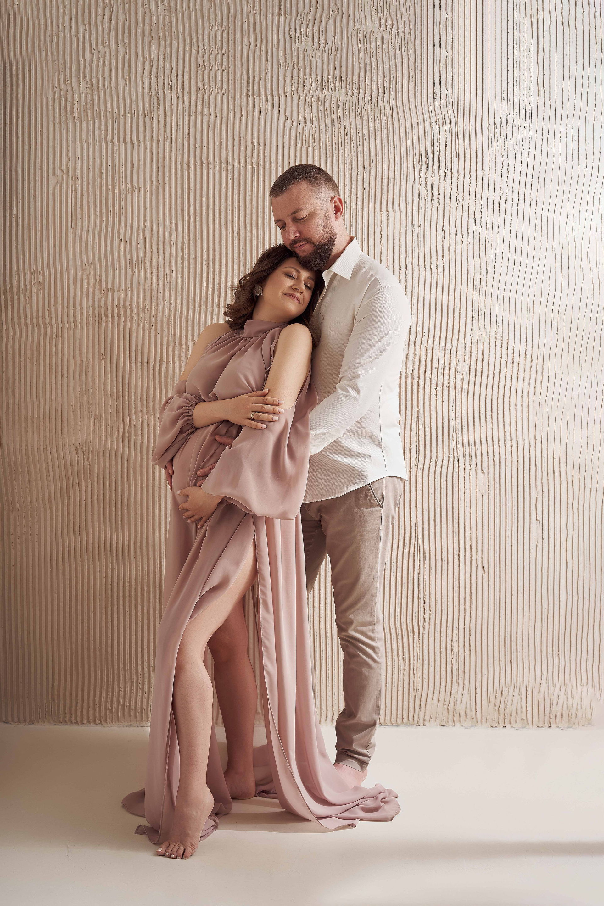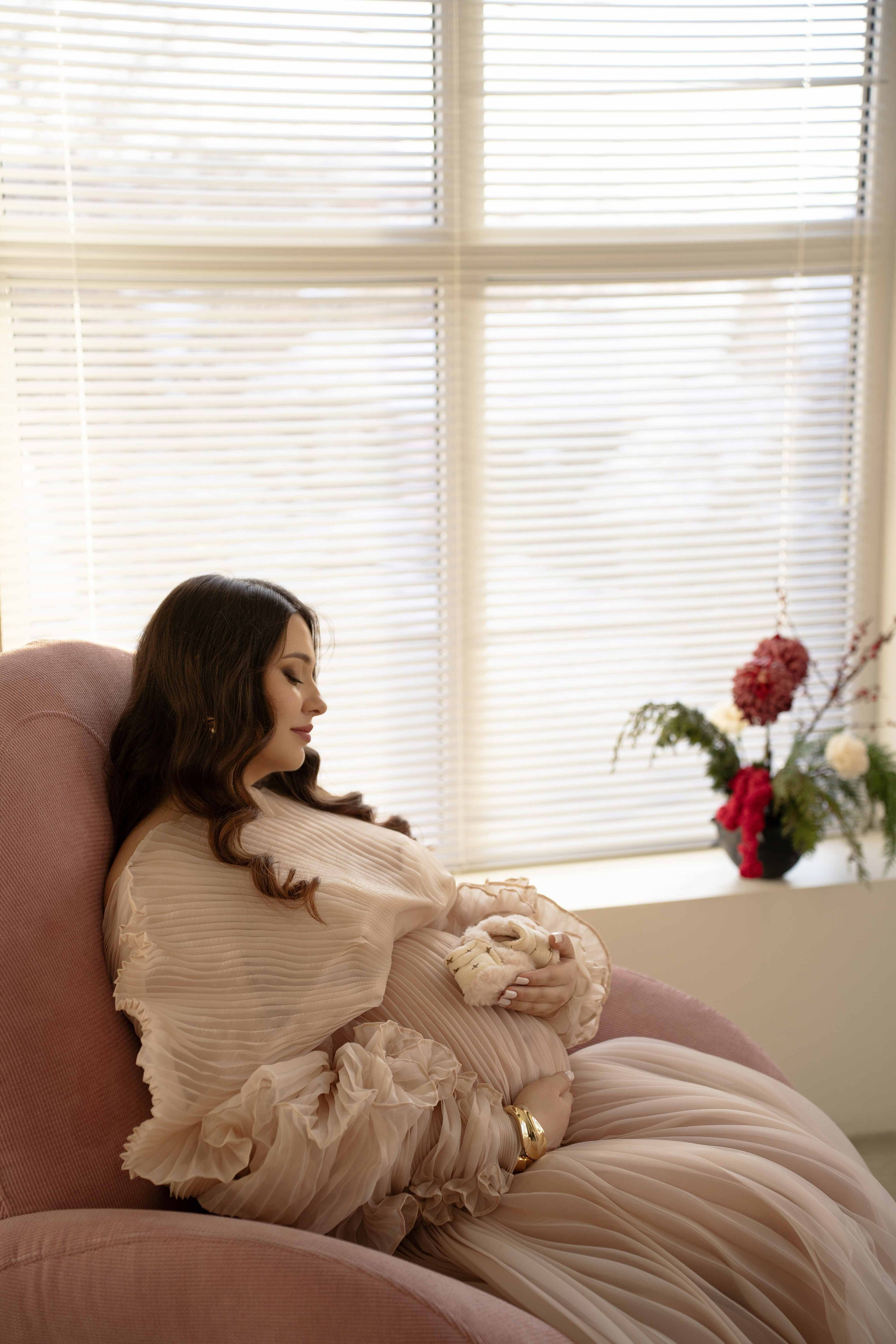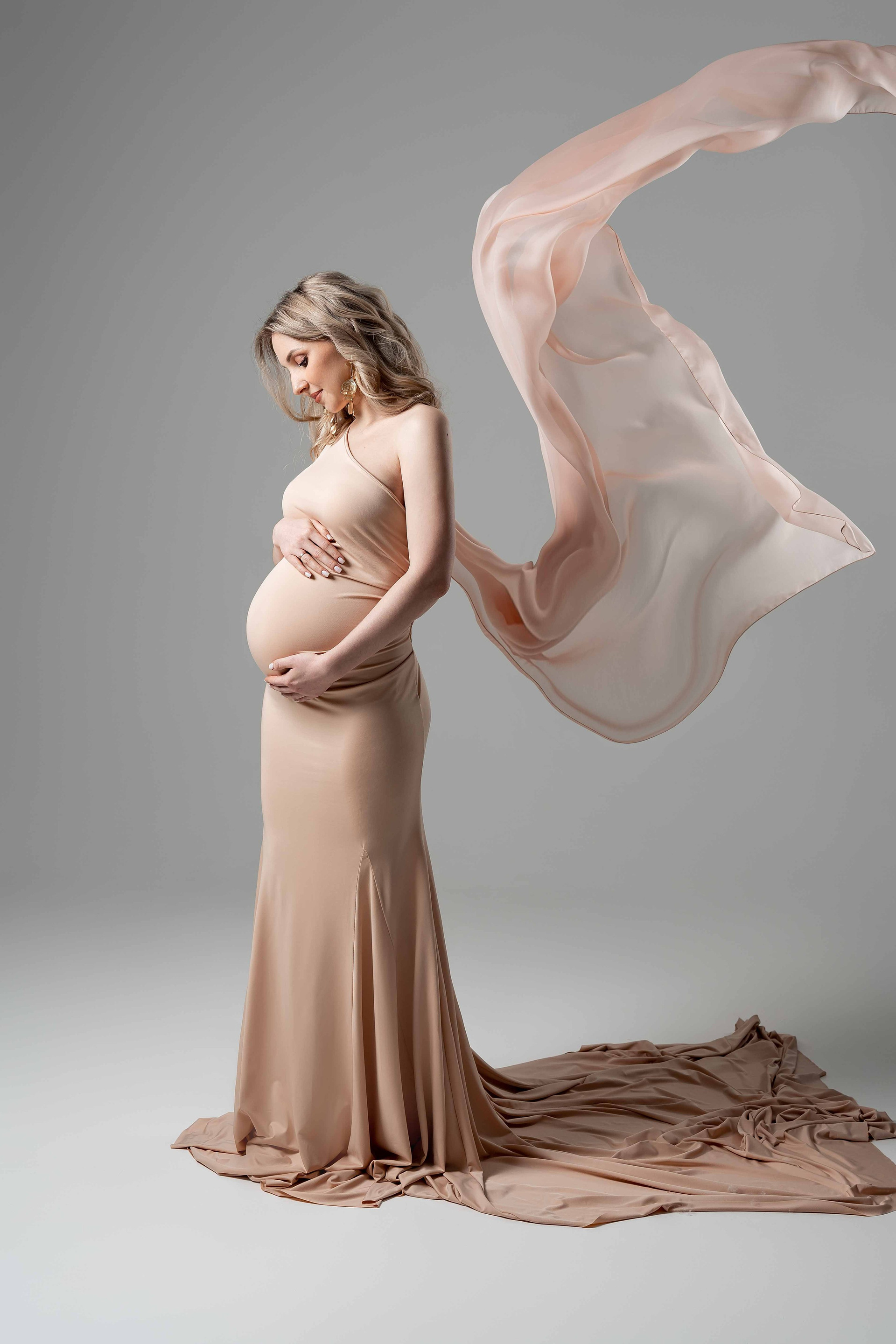 Розовая ткань мягко подчёркивает беременный животик, создавая нежный, чувственный визуал и атмосферу лёгкости в кадре. Этот образ всегда получается особенным и наполненным эмоциями.