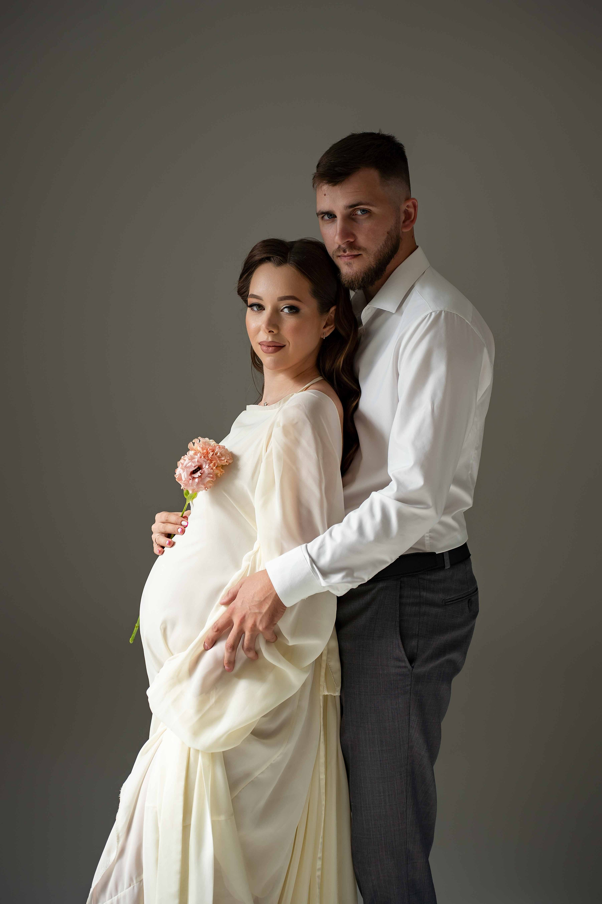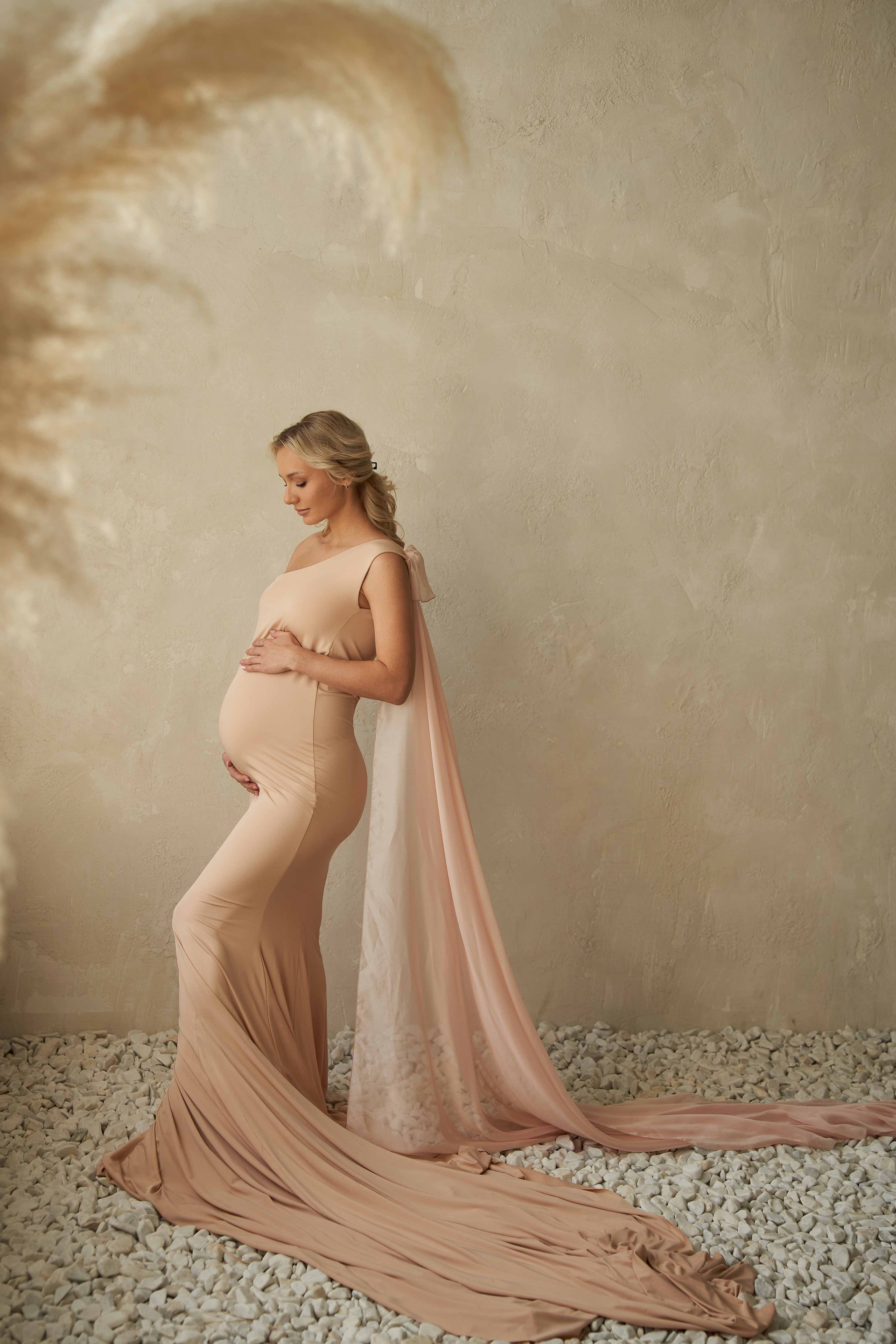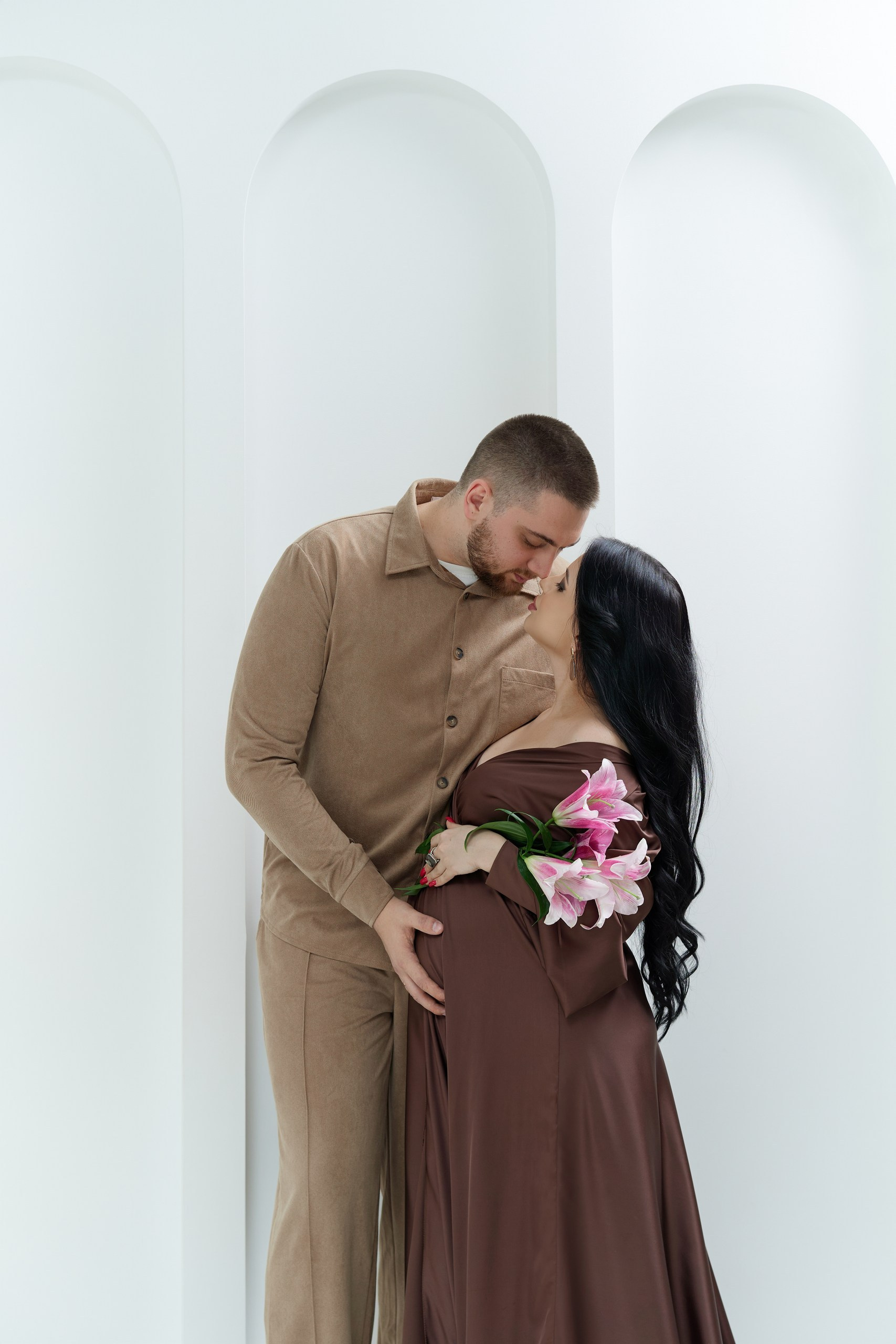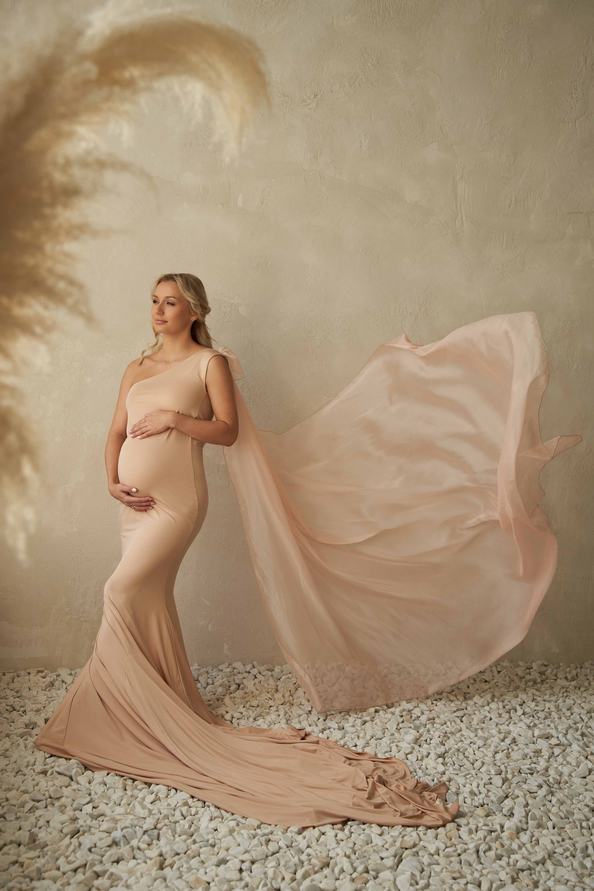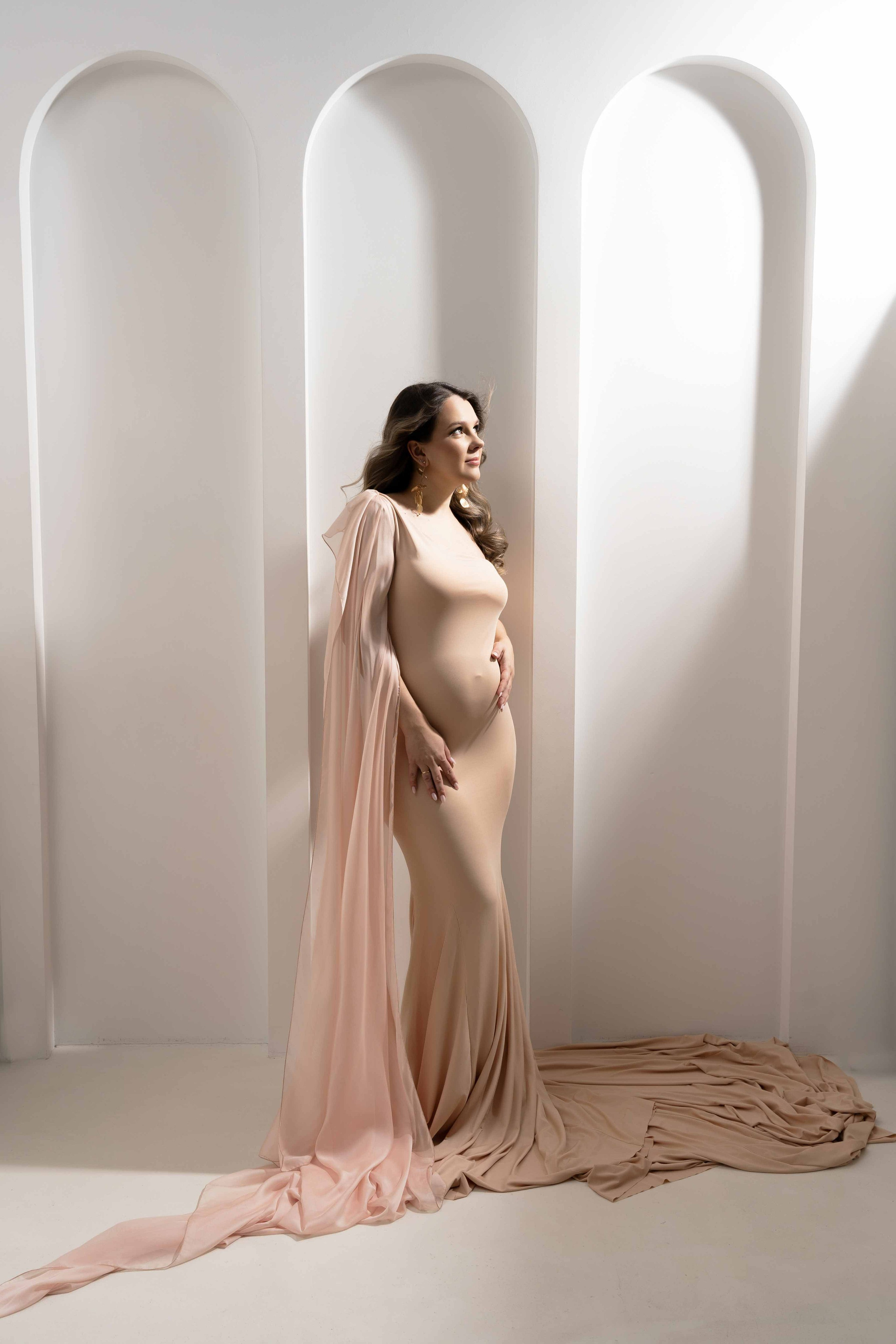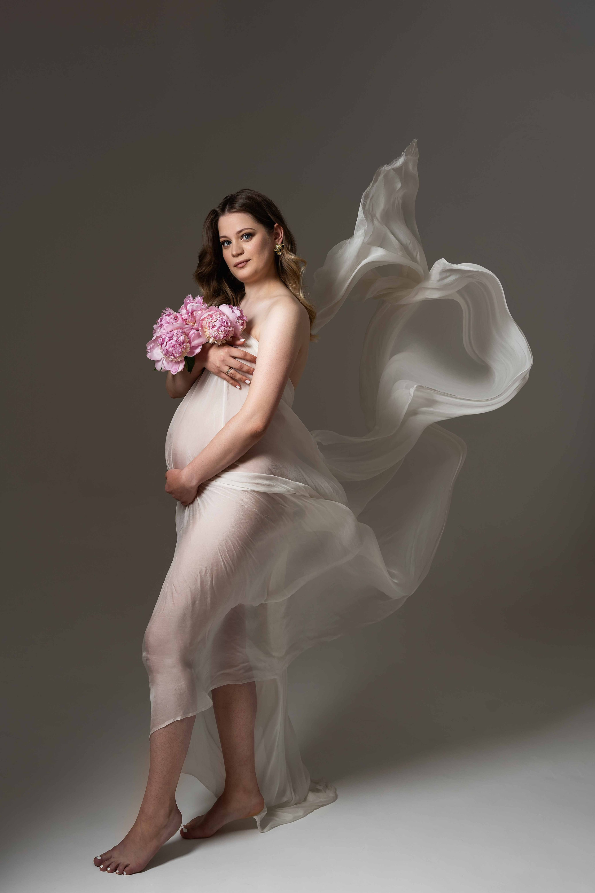 Розовая ткань мягко подчёркивает беременный животик, создавая нежный, чувственный визуал и атмосферу лёгкости в кадре. Этот образ всегда получается особенным и наполненным эмоциями.