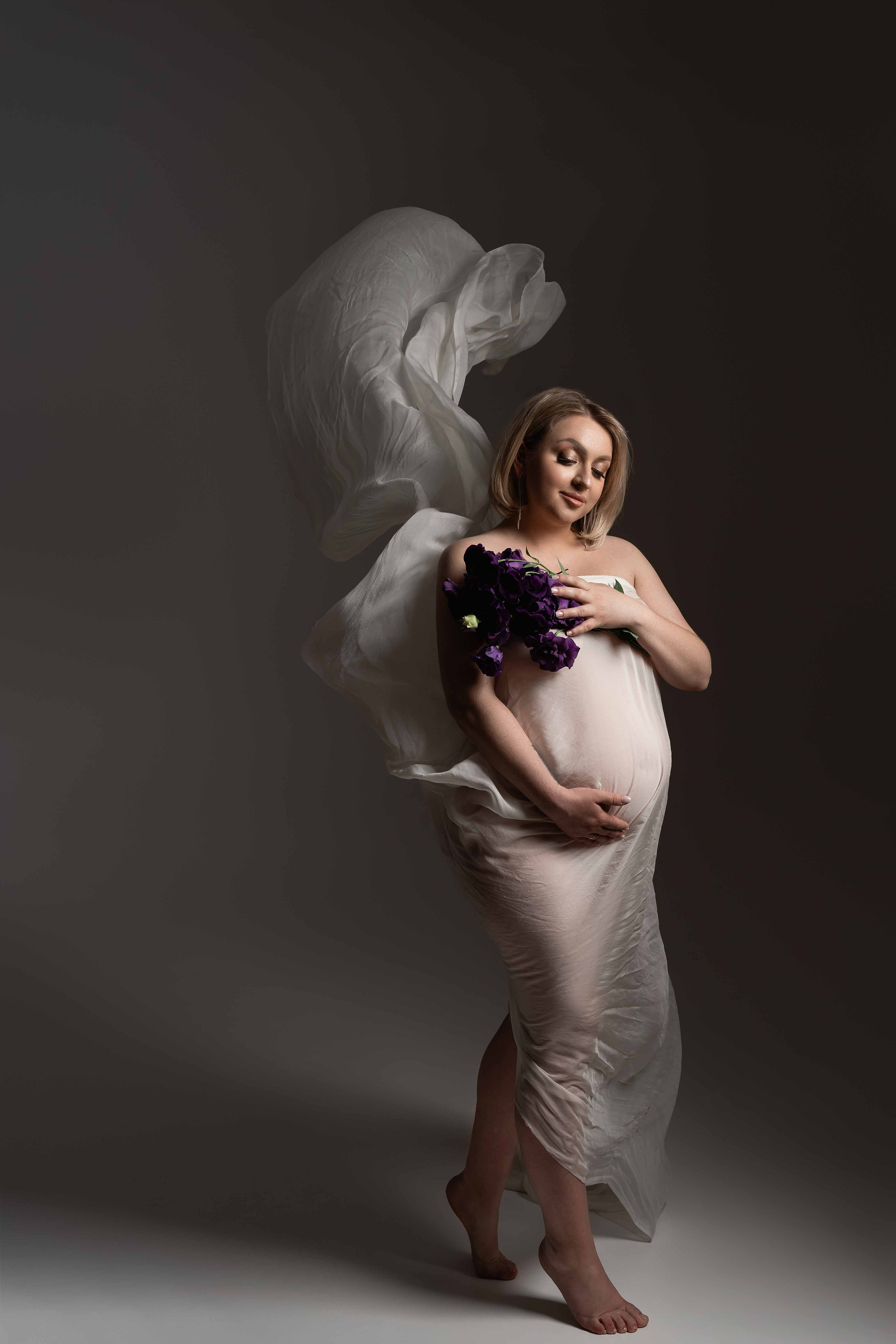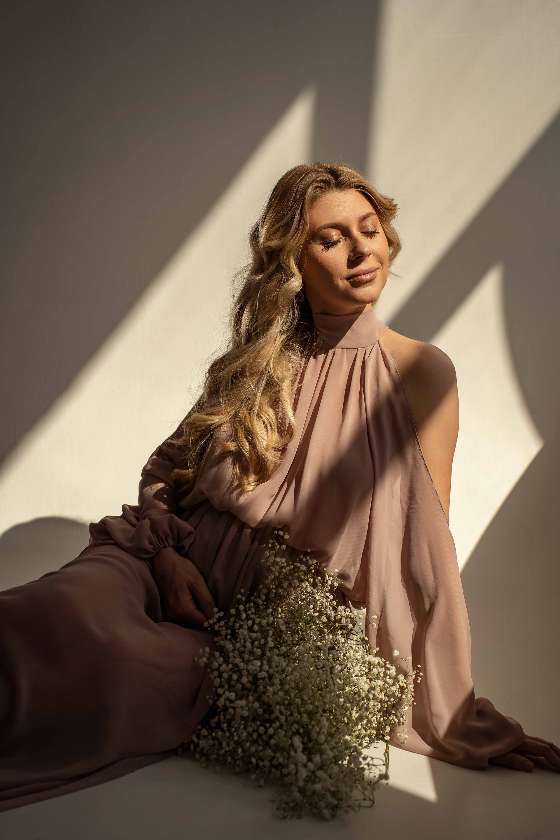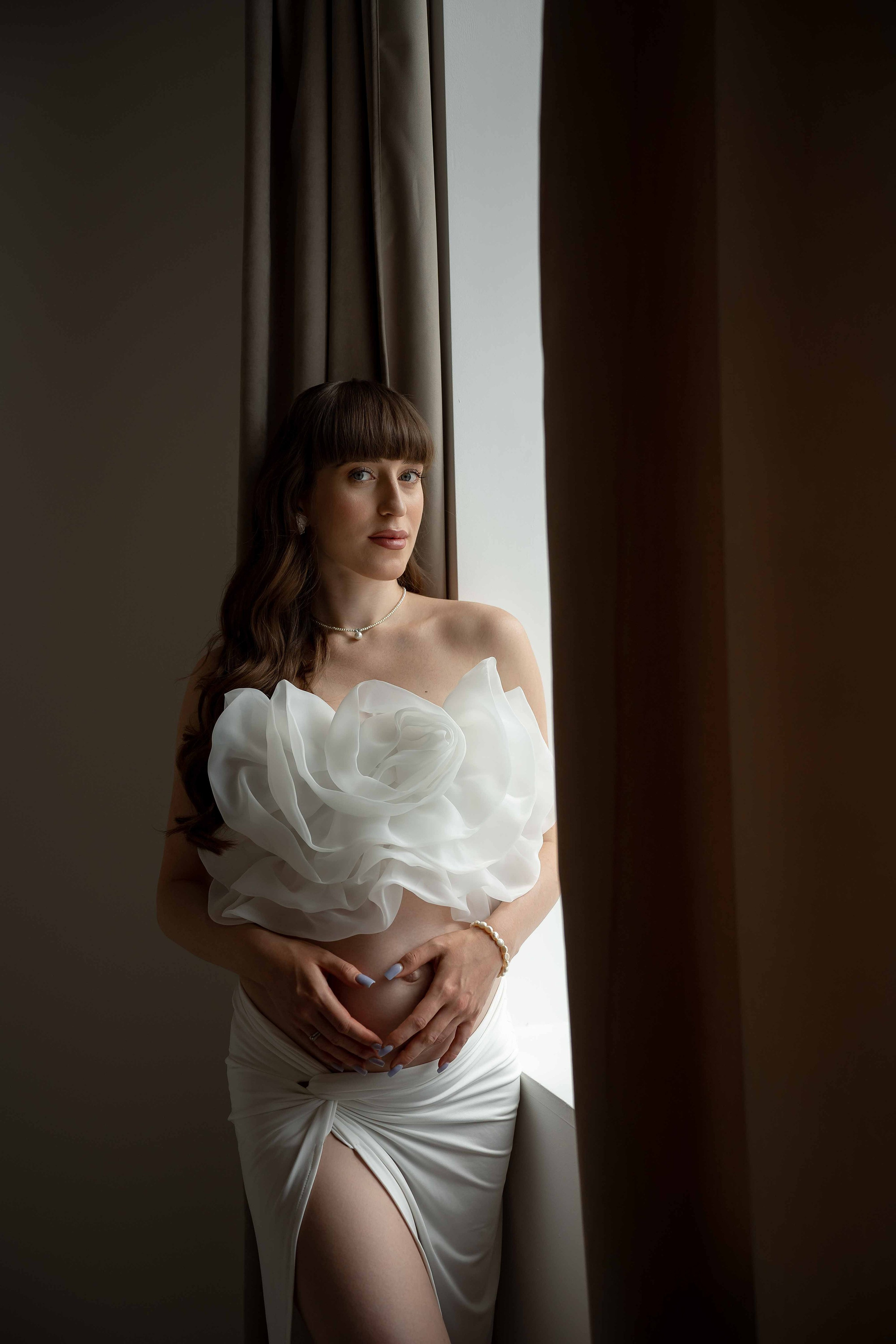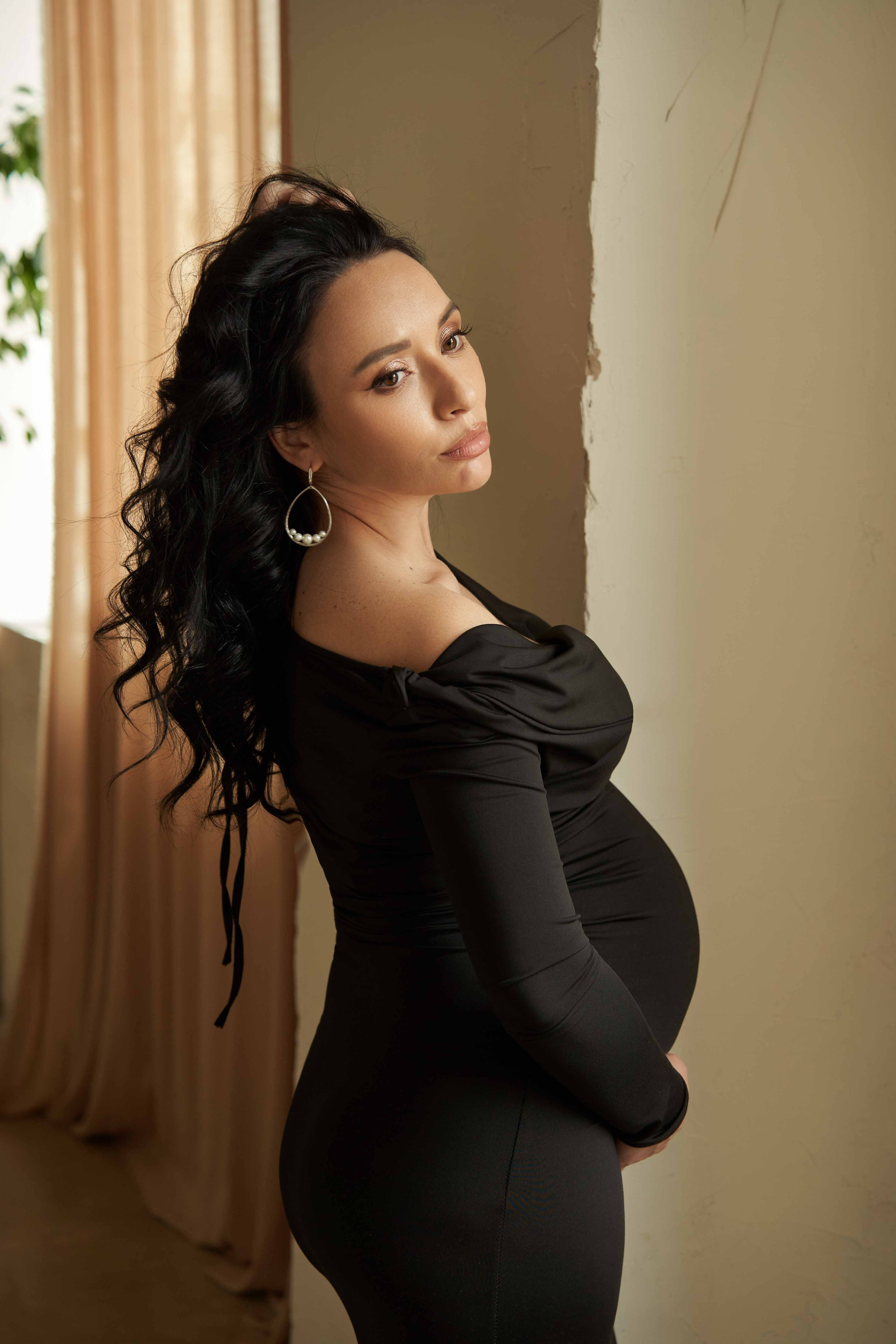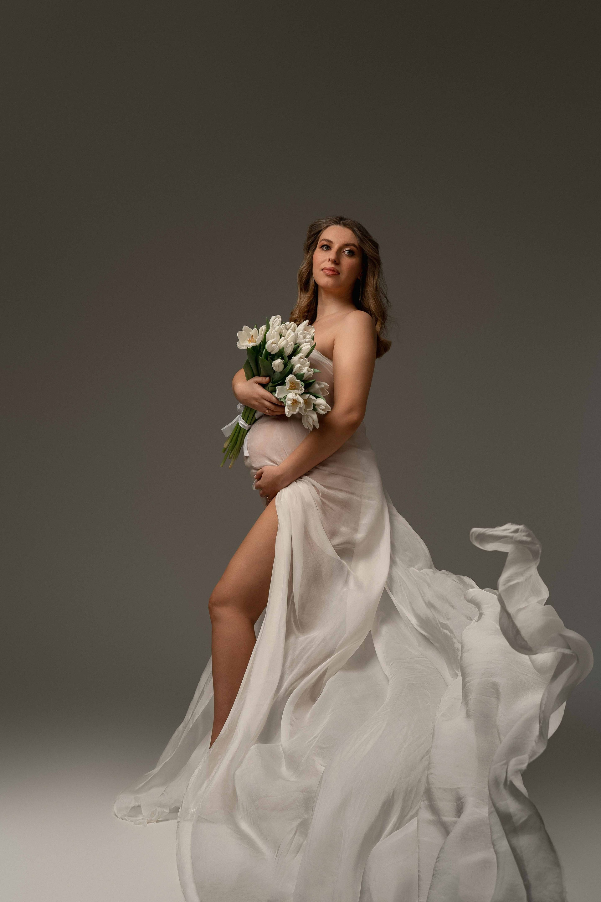 Розовая ткань мягко подчёркивает беременный животик, создавая нежный, чувственный визуал и атмосферу лёгкости в кадре. Этот образ всегда получается особенным и наполненным эмоциями.