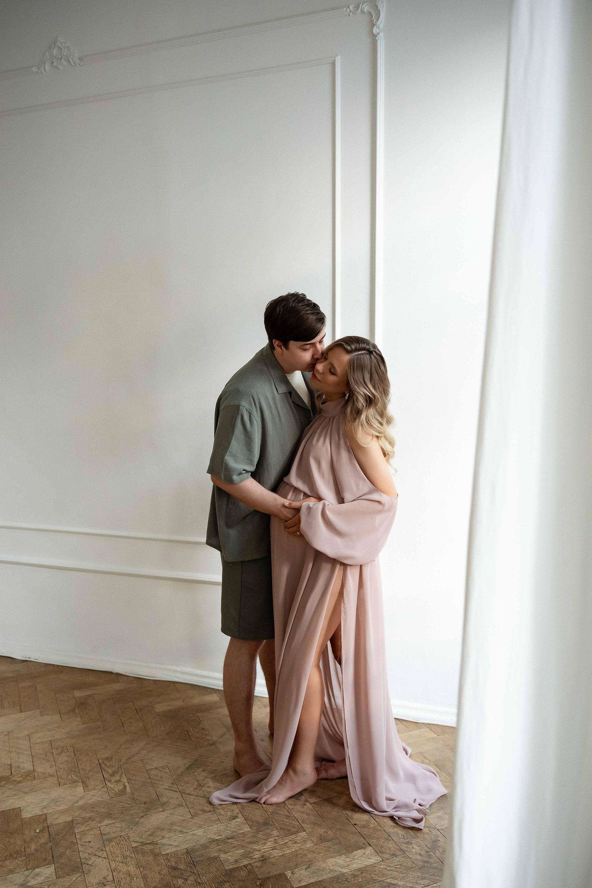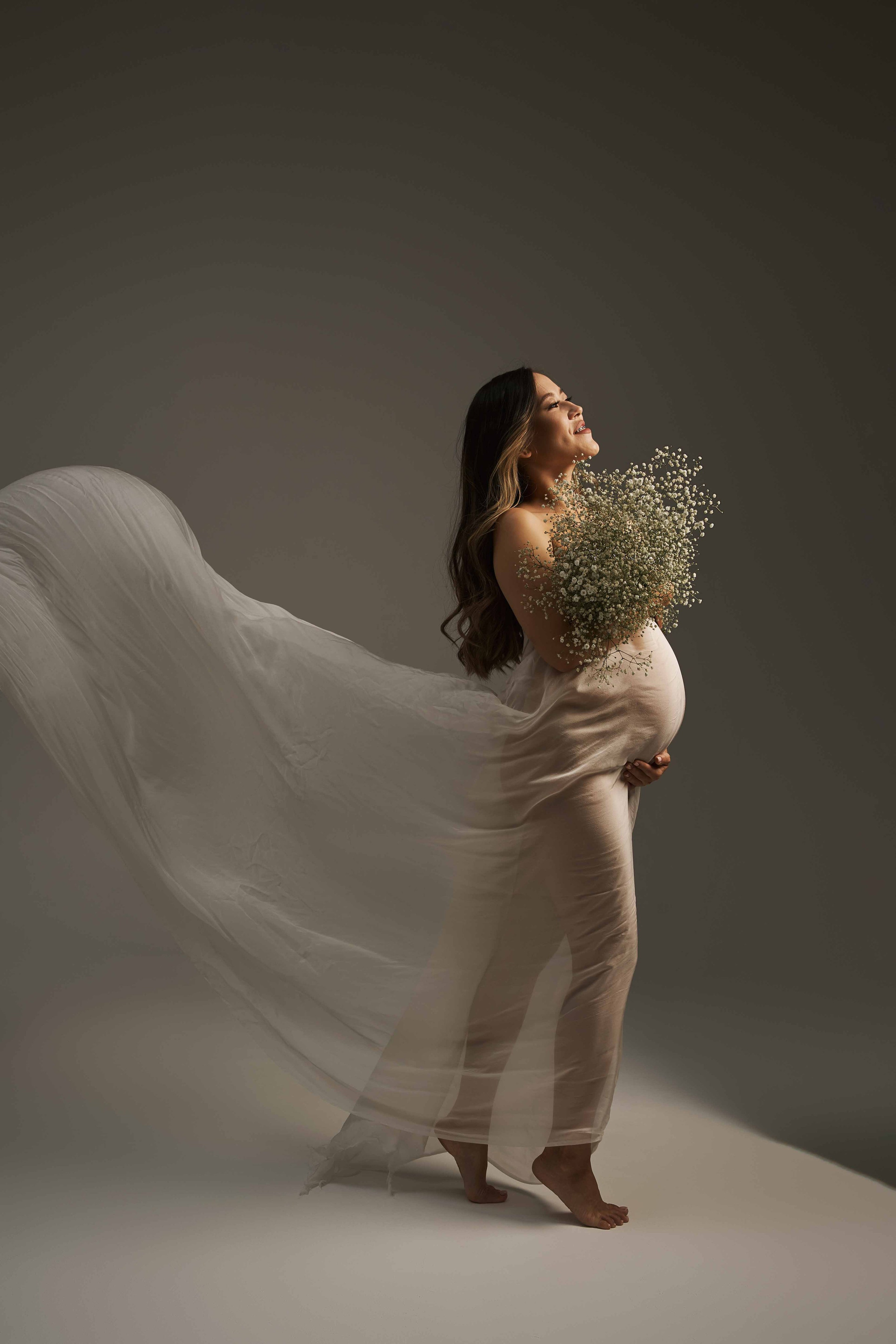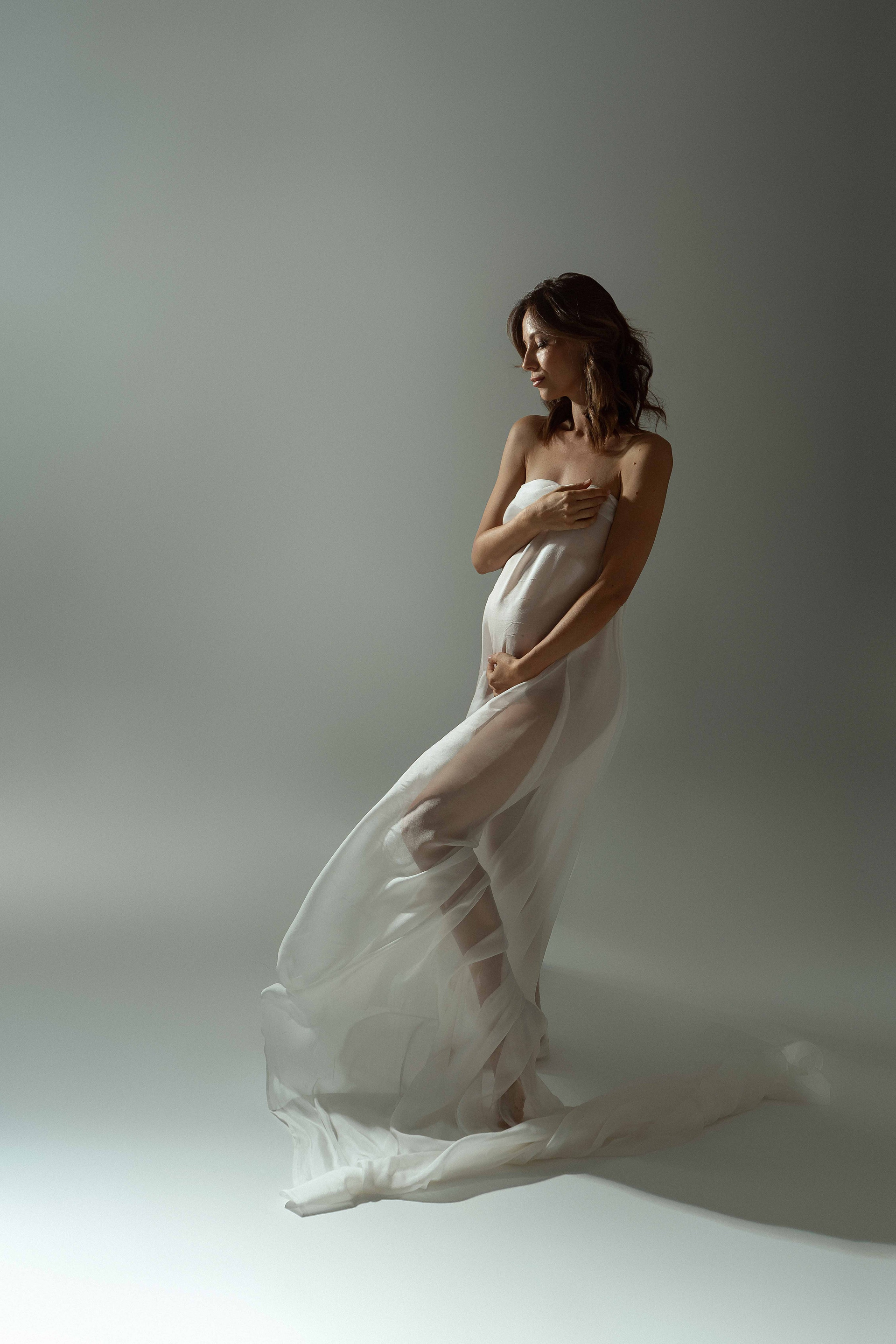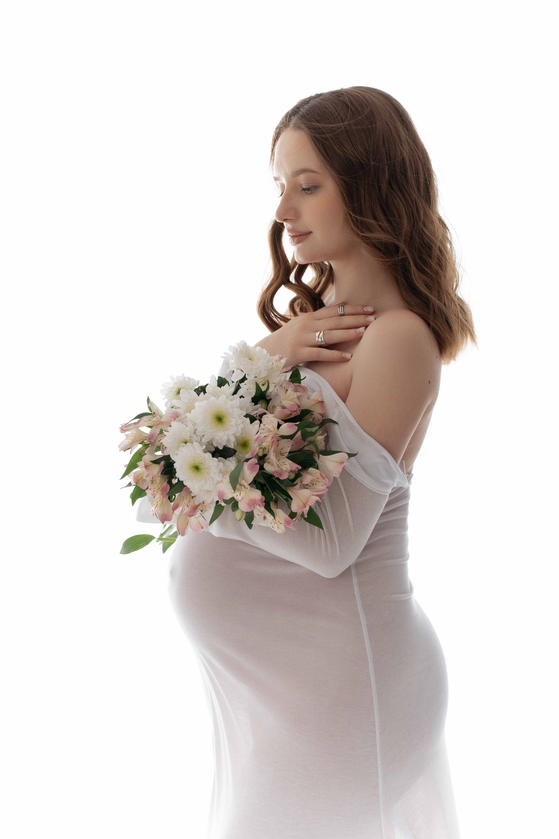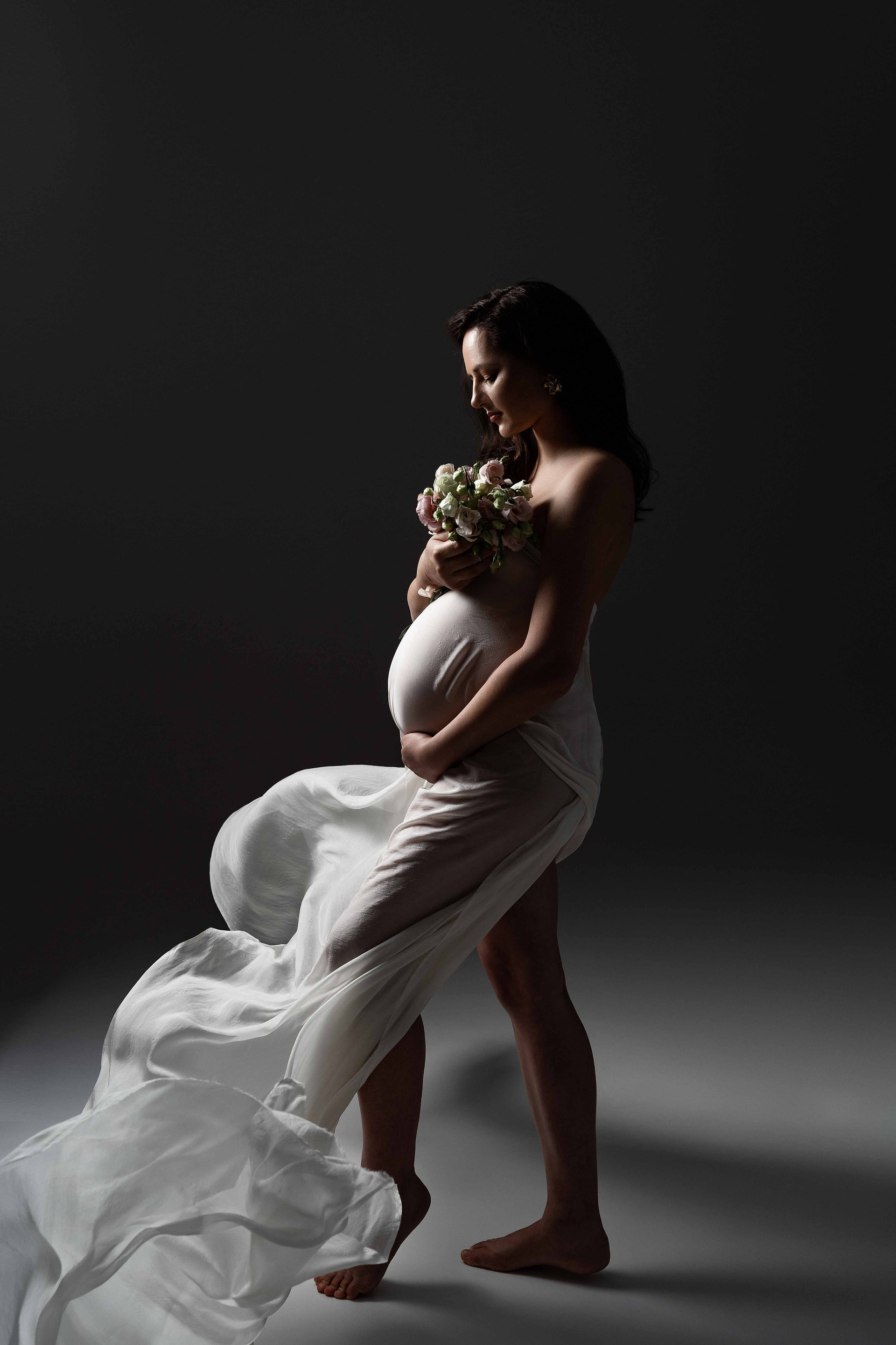 Розовая ткань мягко подчёркивает беременный животик, создавая нежный, чувственный визуал и атмосферу лёгкости в кадре. Этот образ всегда получается особенным и наполненным эмоциями.