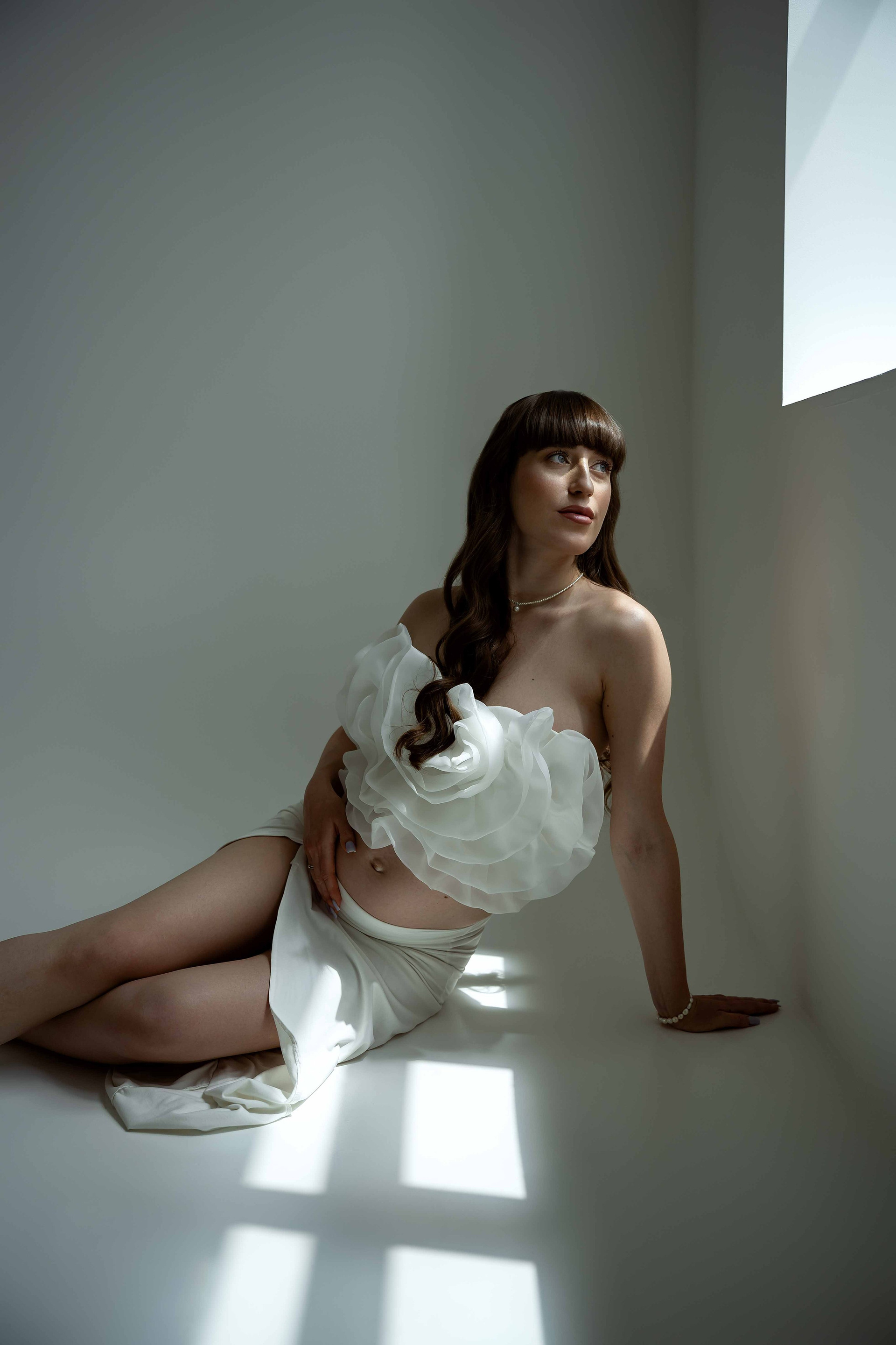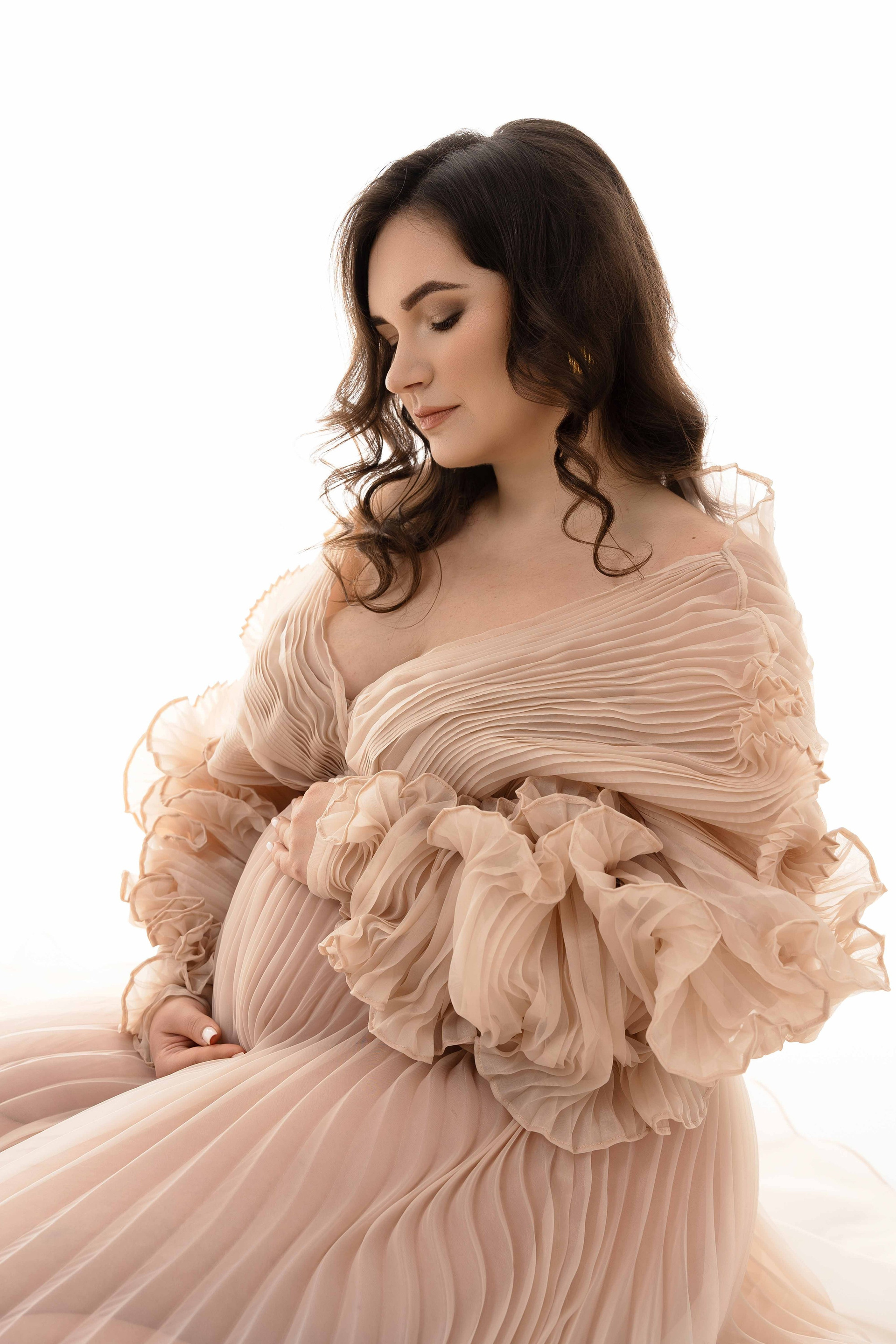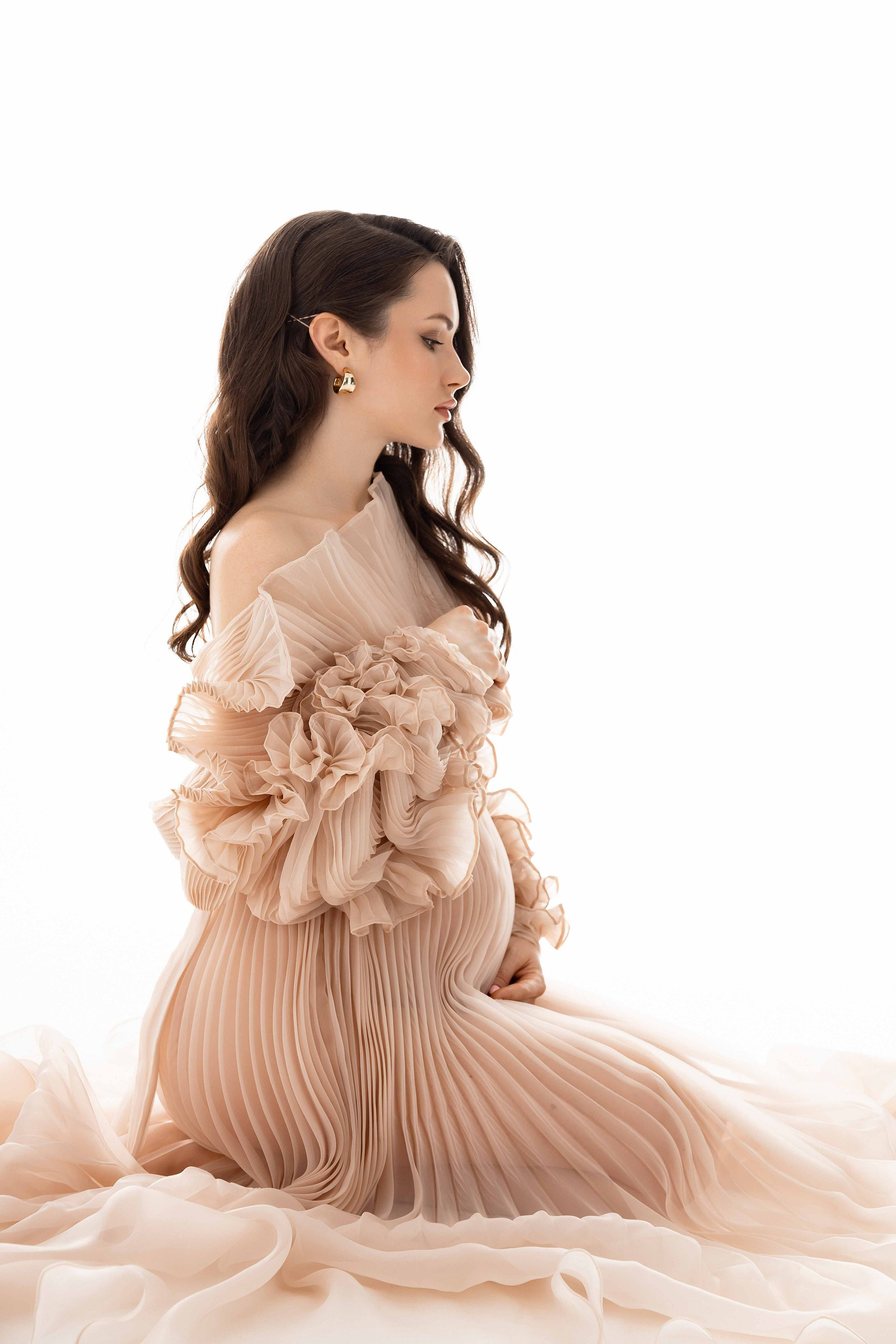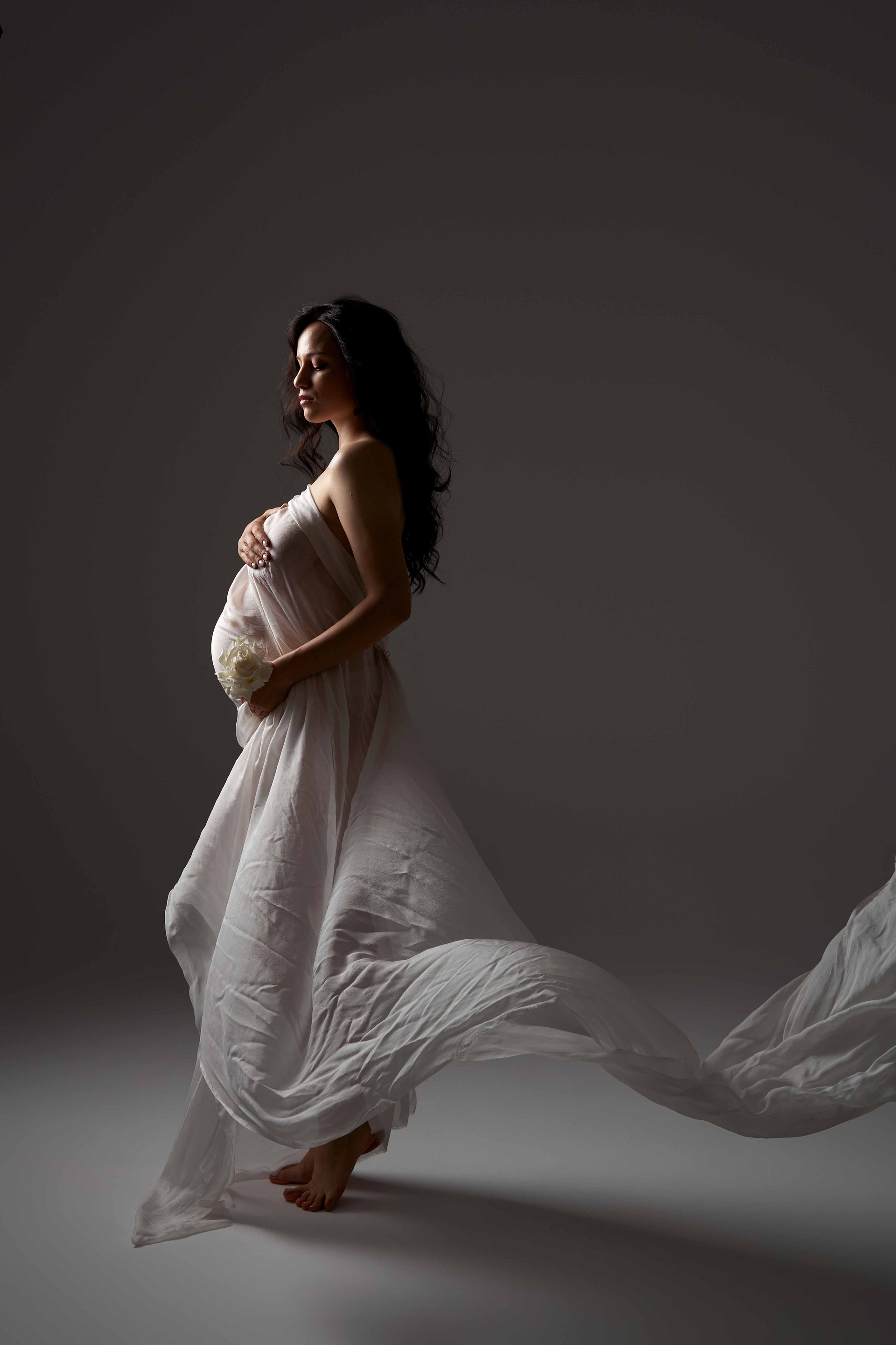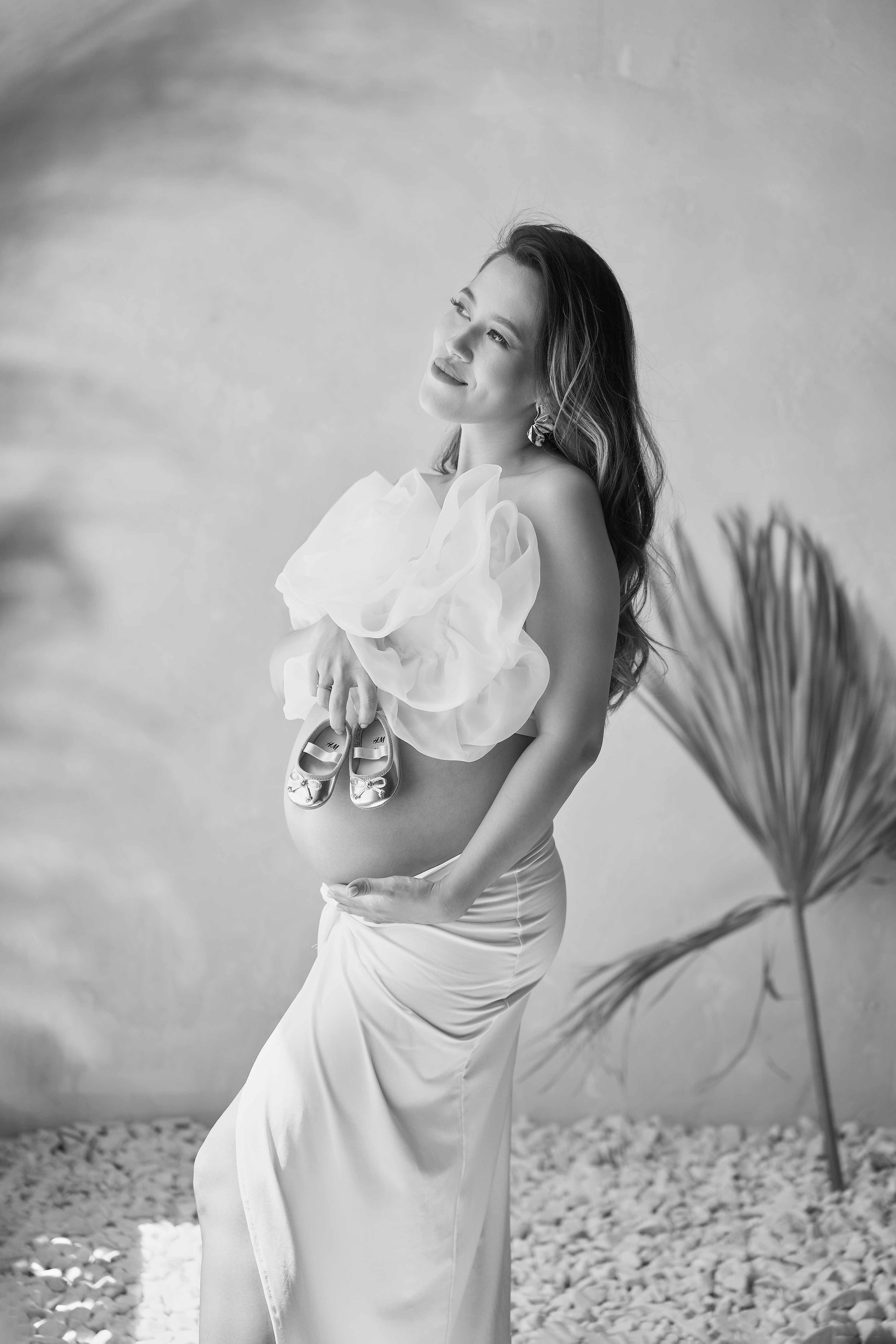 Розовая ткань мягко подчёркивает беременный животик, создавая нежный, чувственный визуал и атмосферу лёгкости в кадре. Этот образ всегда получается особенным и наполненным эмоциями.