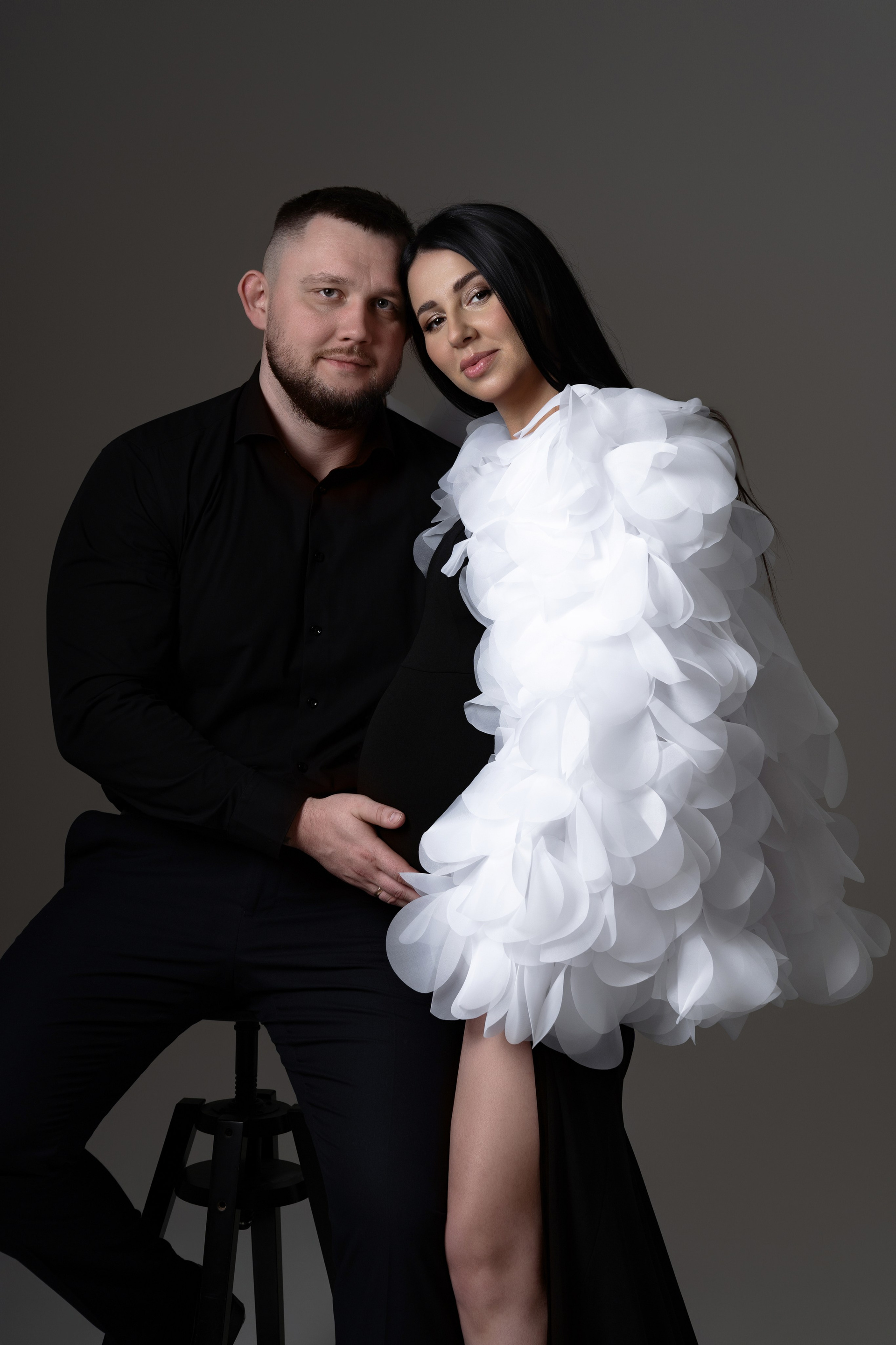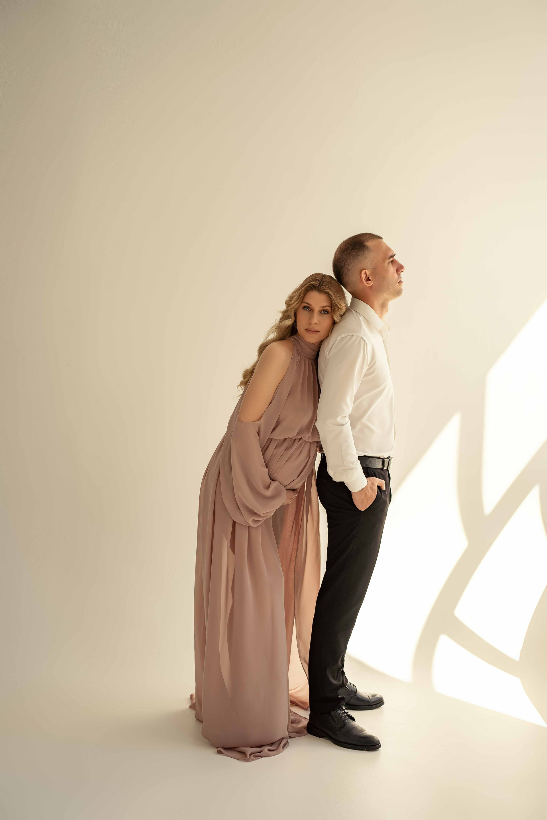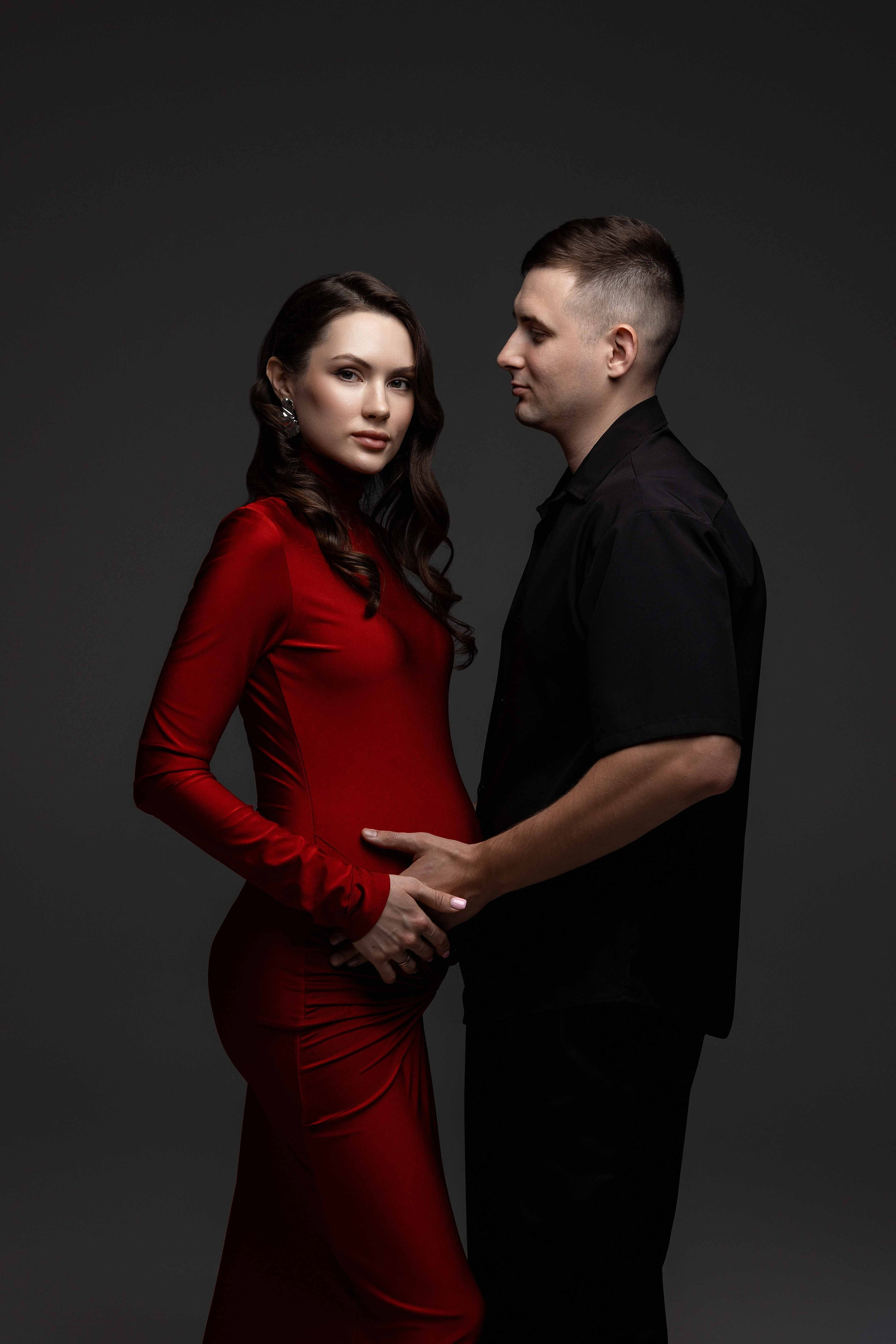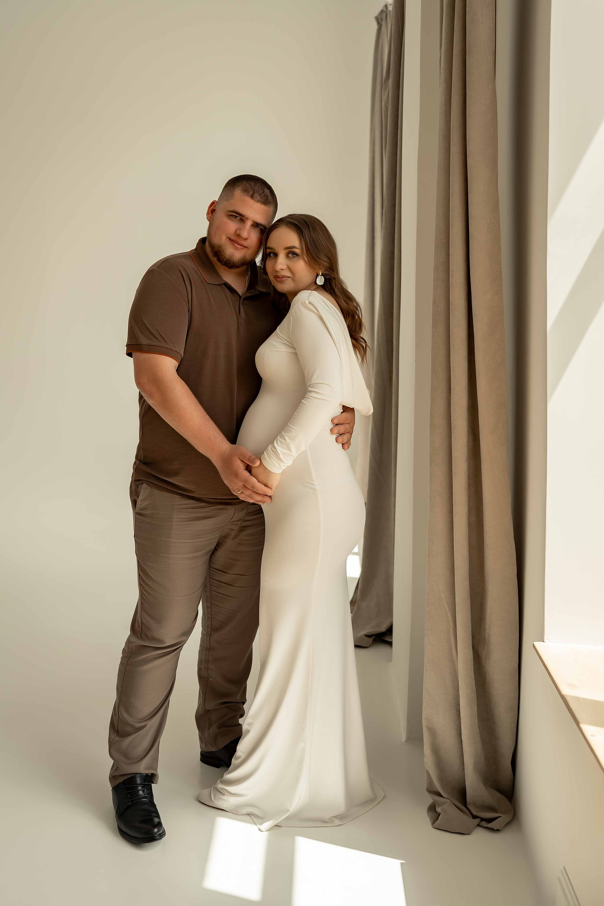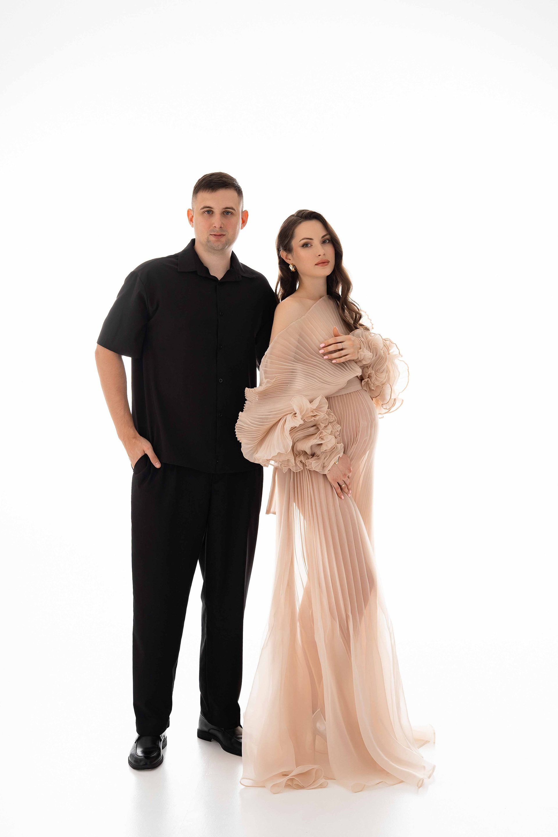 Модель красиво подчёркивает фигуру, подходит для размеров 44–46 и эффектно смотрится в студийной съёмке. Особенно гармонично раскрывается в парной съёмке — в сочетании с супругом в тёмной одежде образ выглядит стильным и цельным.