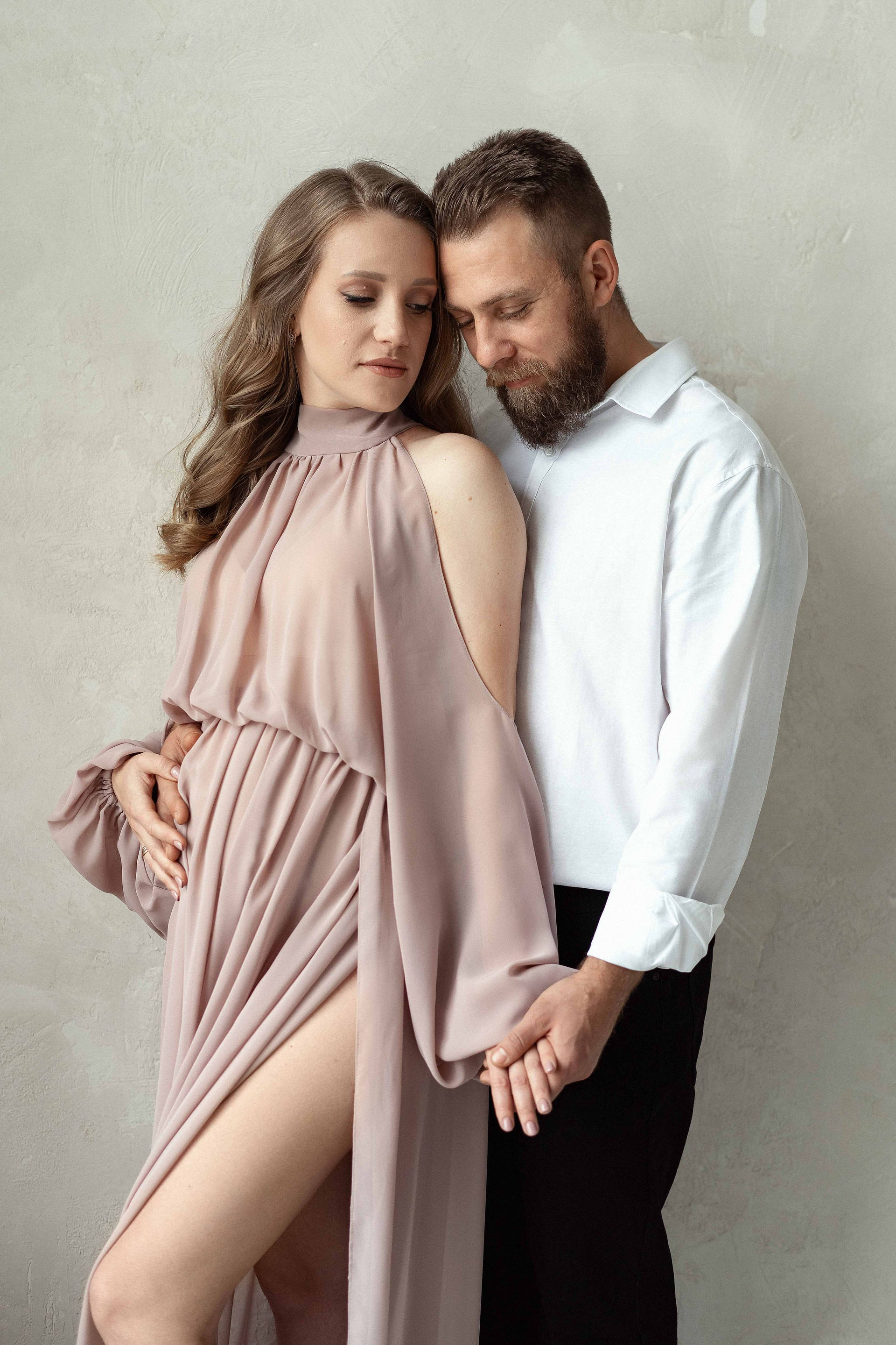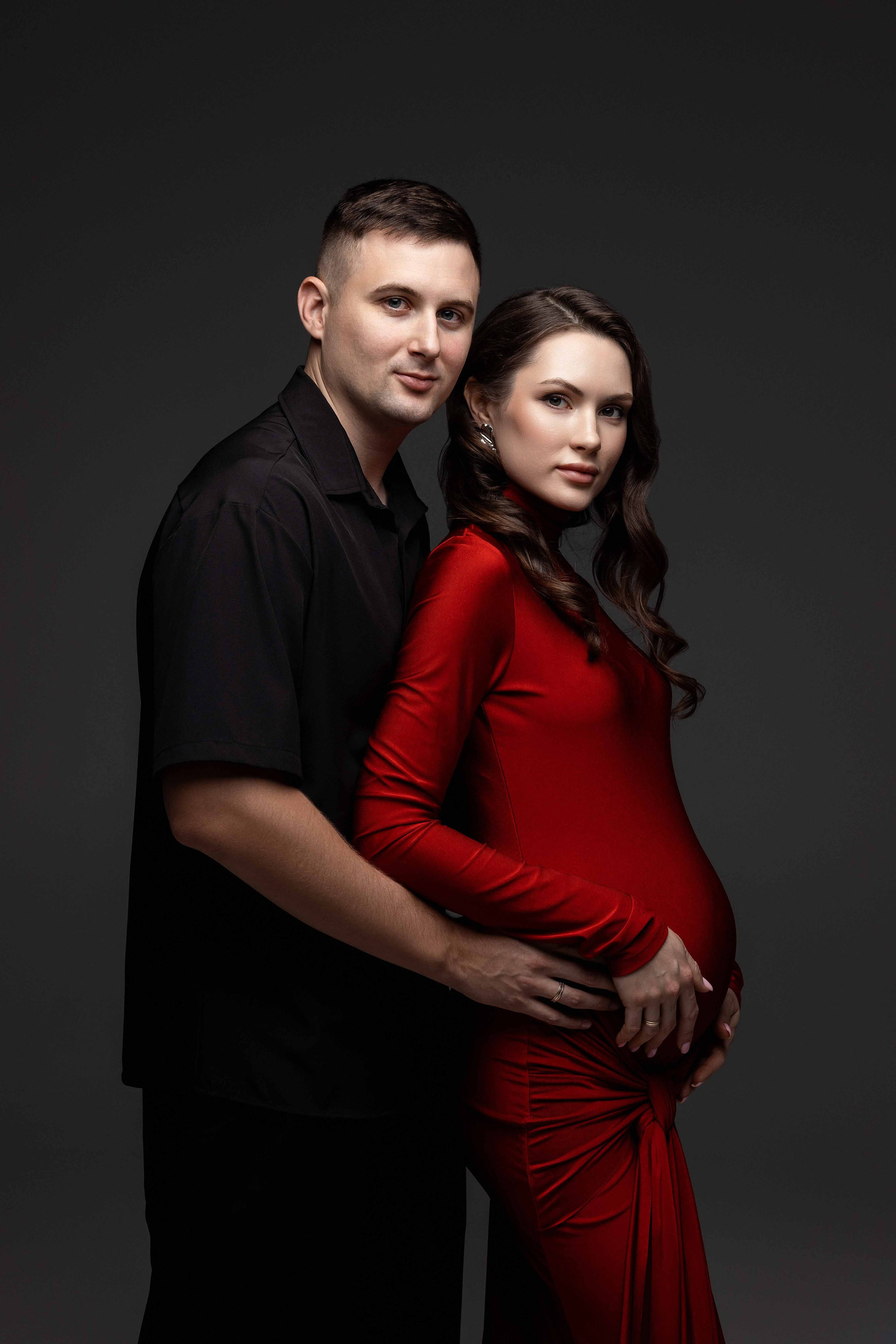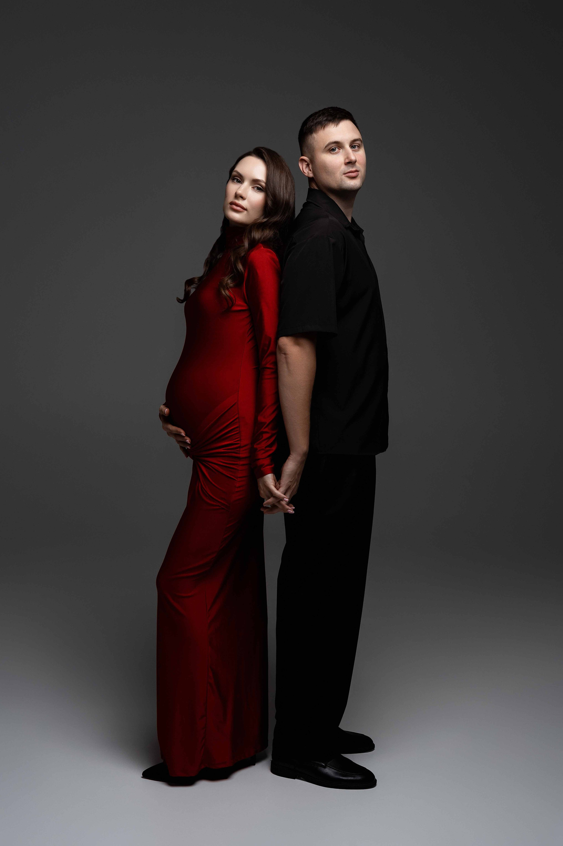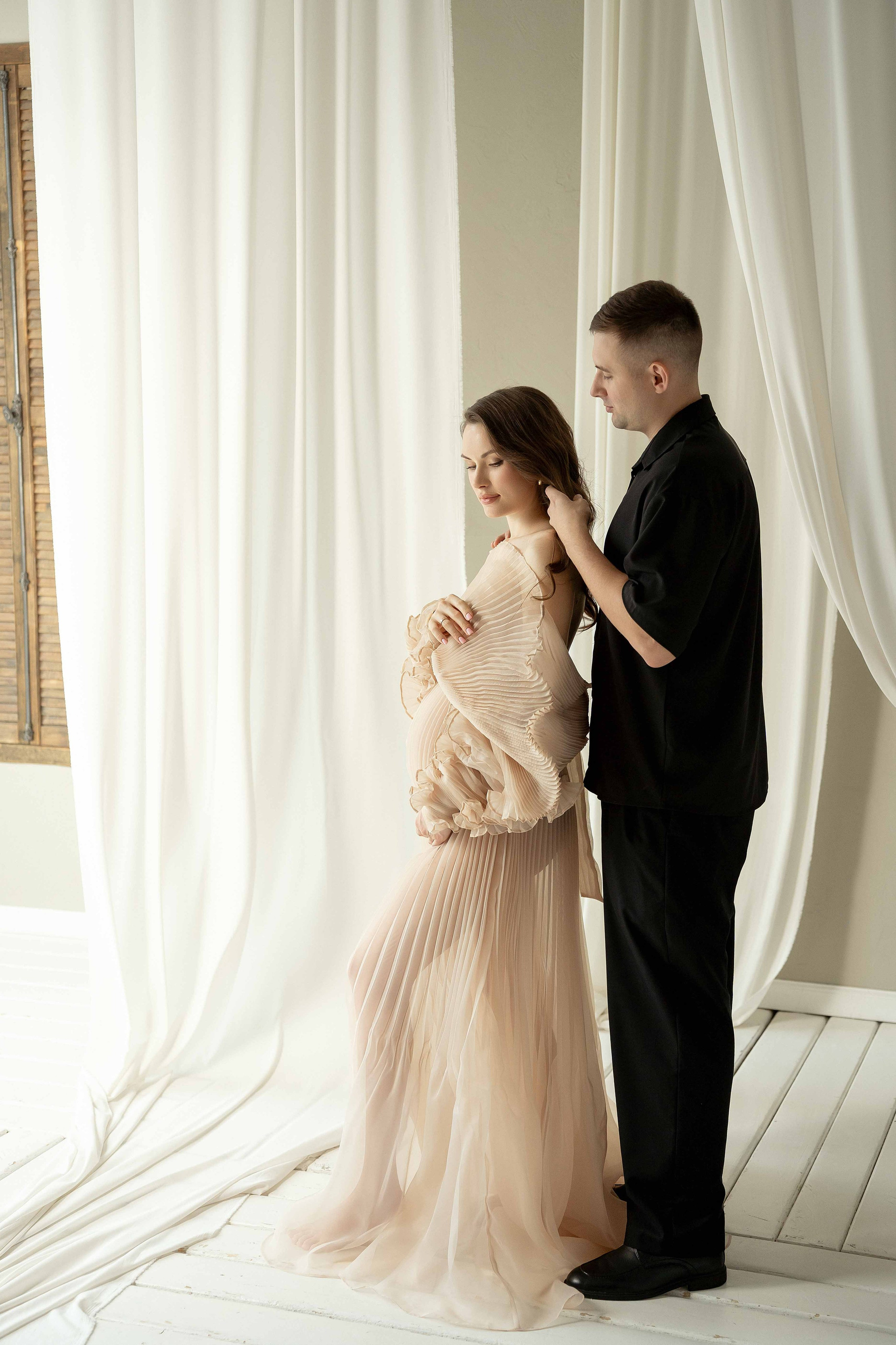 Модель красиво подчёркивает фигуру, подходит для размеров 44–46 и эффектно смотрится в студийной съёмке. Особенно гармонично раскрывается в парной съёмке — в сочетании с супругом в тёмной одежде образ выглядит стильным и цельным.