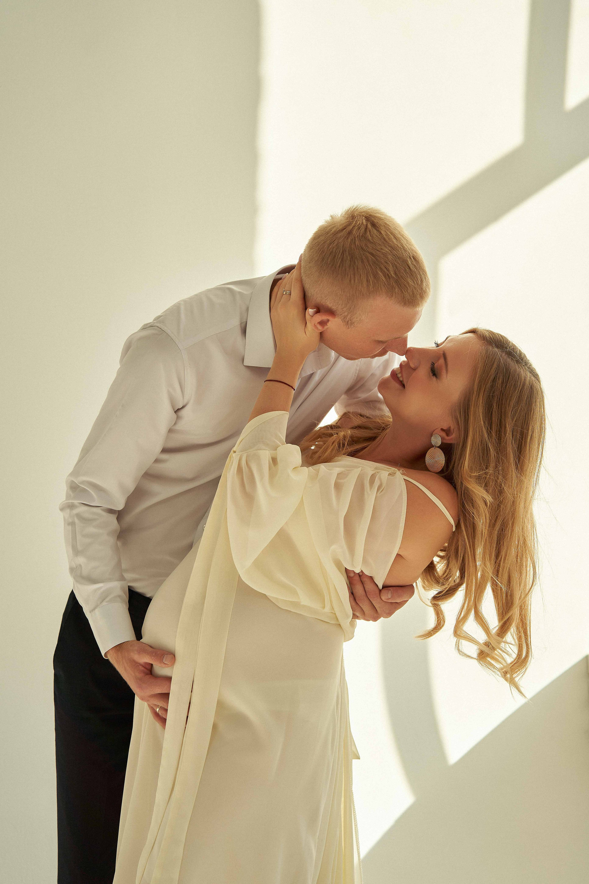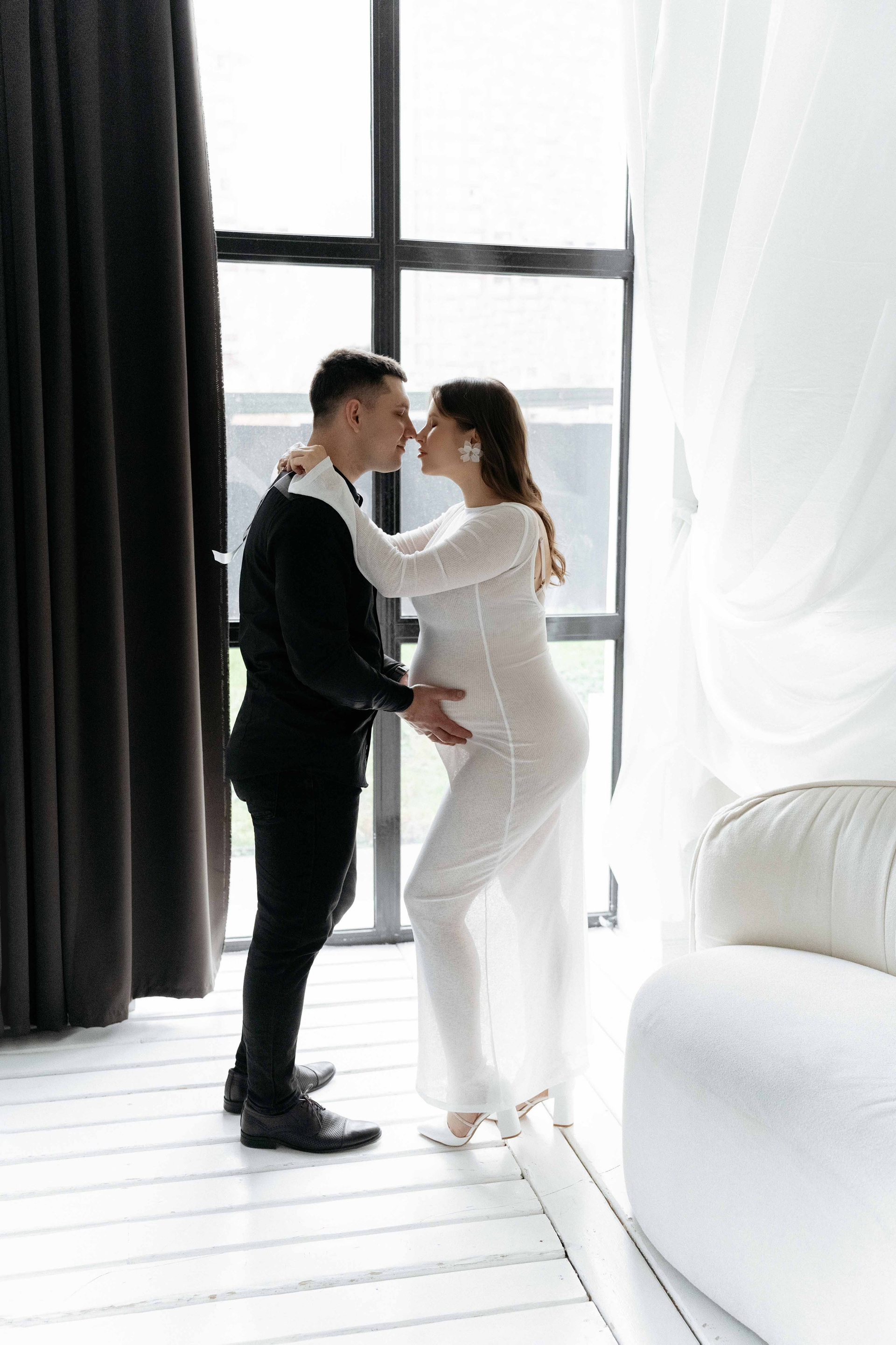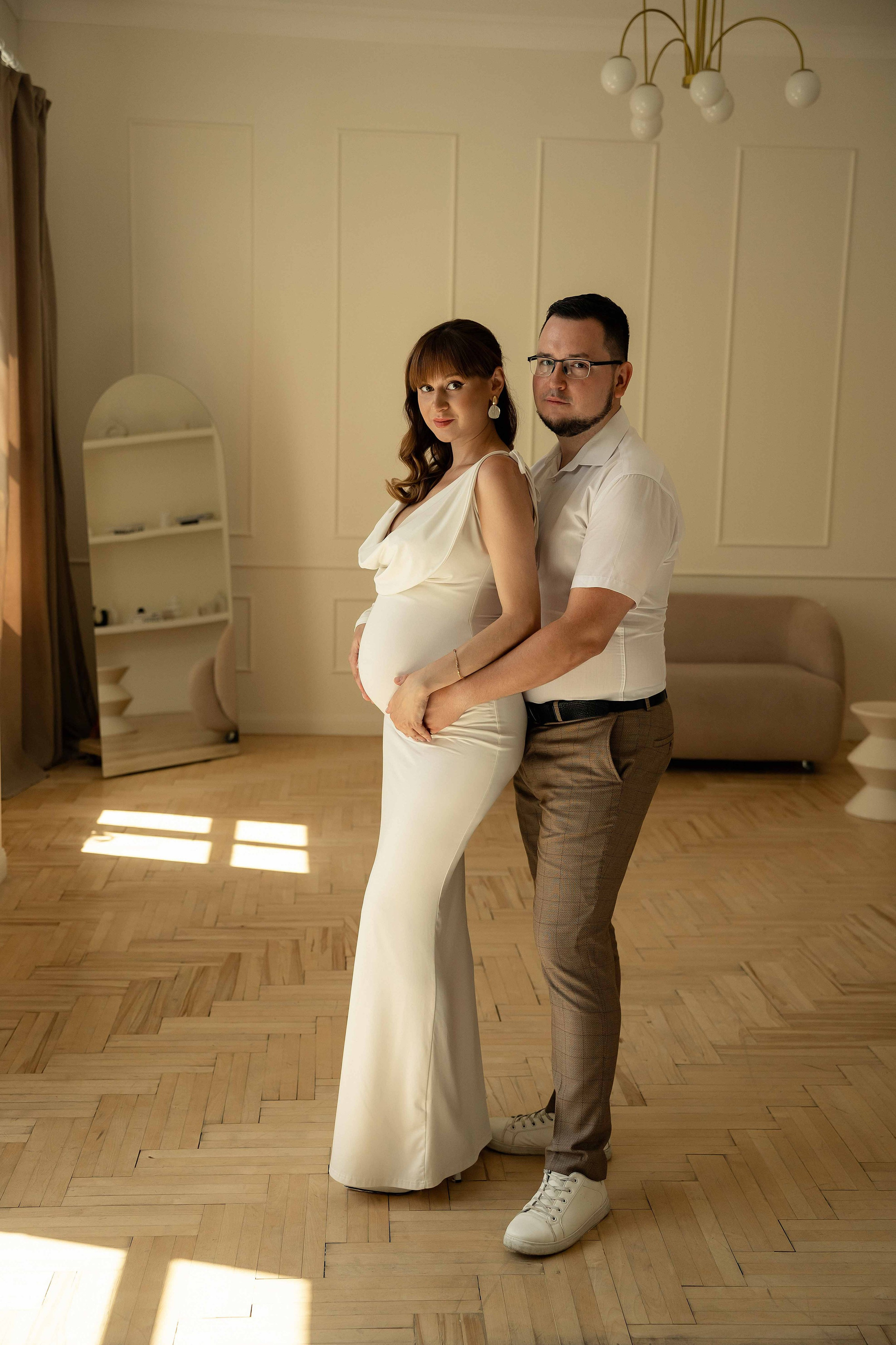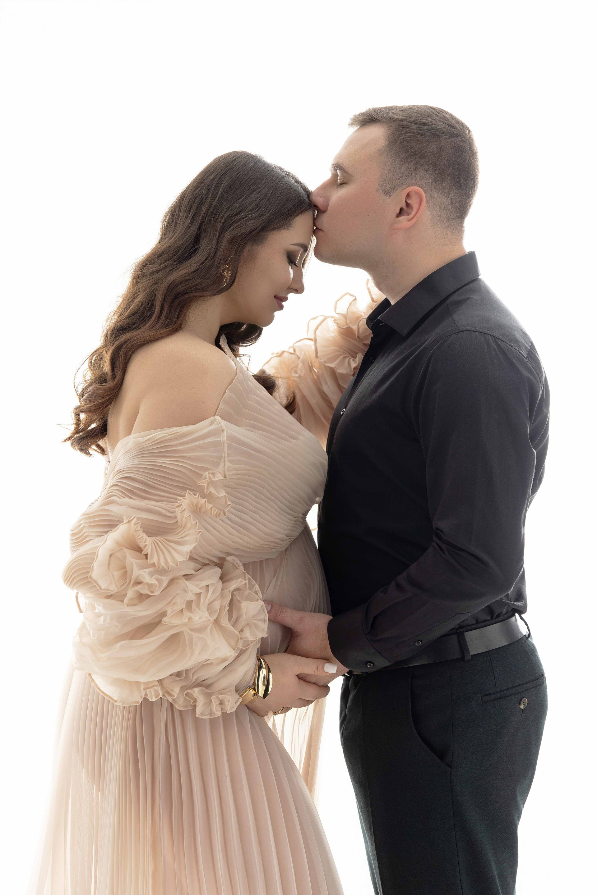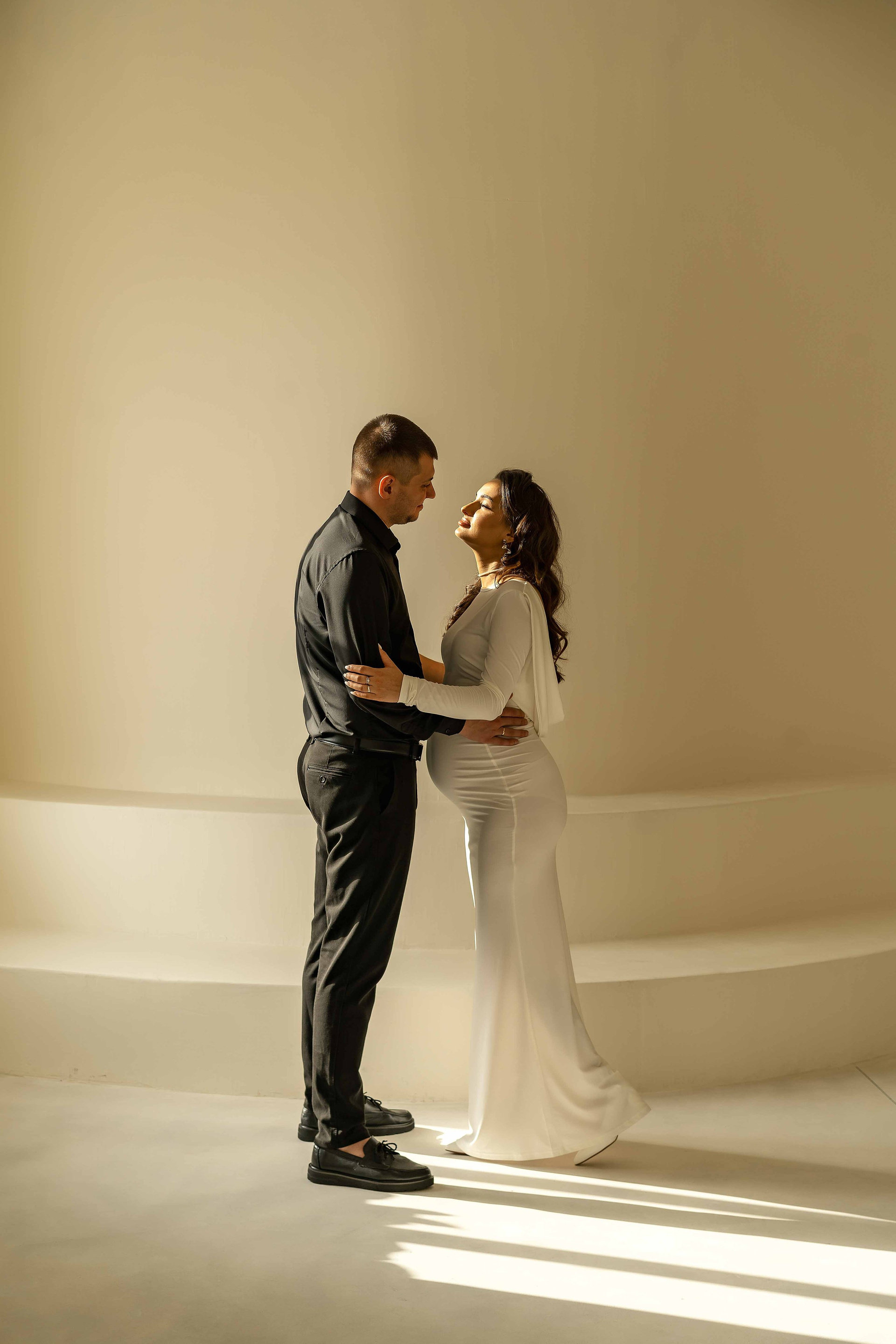 Модель красиво подчёркивает фигуру, подходит для размеров 44–46 и эффектно смотрится в студийной съёмке. Особенно гармонично раскрывается в парной съёмке — в сочетании с супругом в тёмной одежде образ выглядит стильным и цельным.