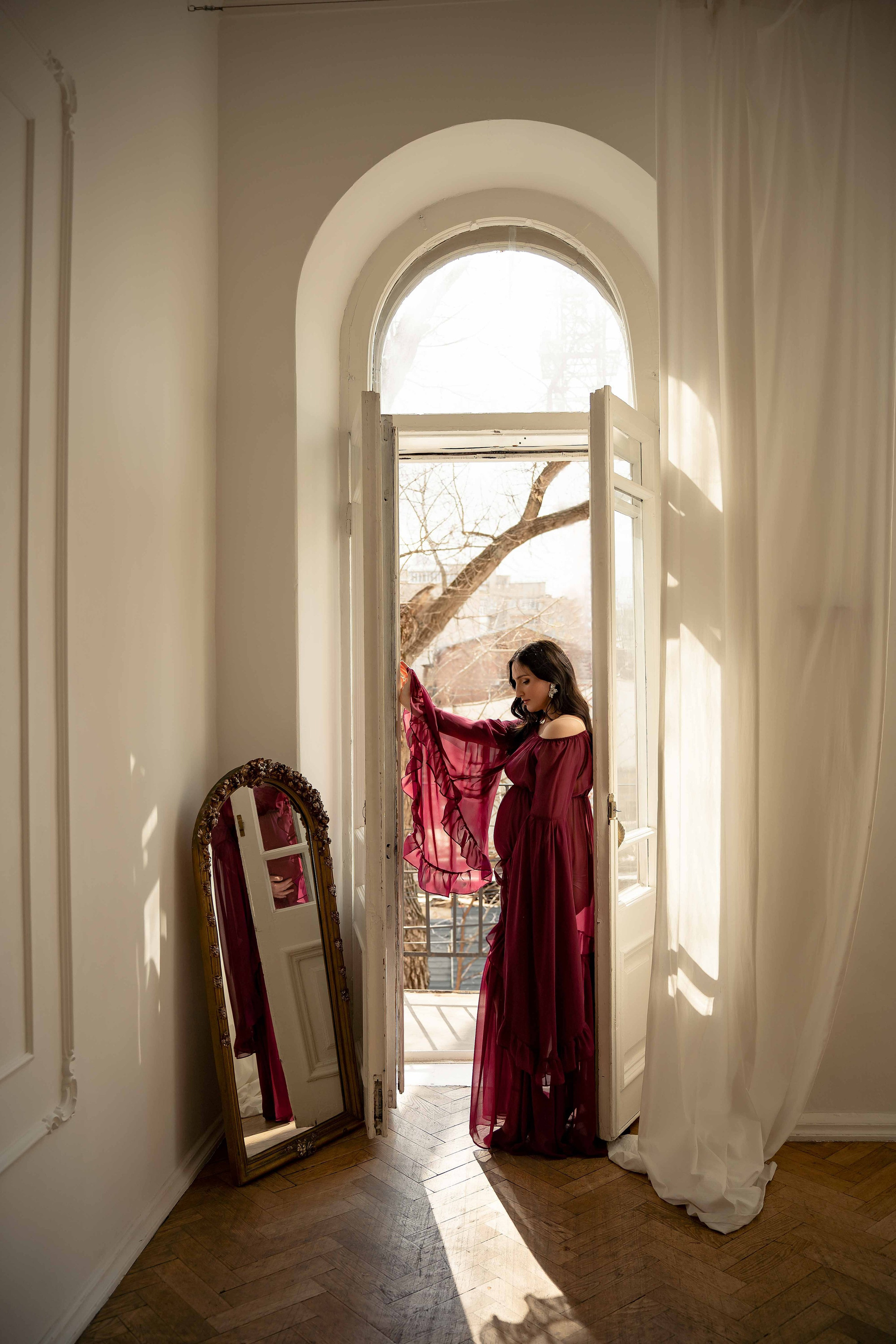 Платье насыщенного винного оттенка с открытыми плечами и объёмными рукавами, создающими выразительный и очень эффектный силуэт.