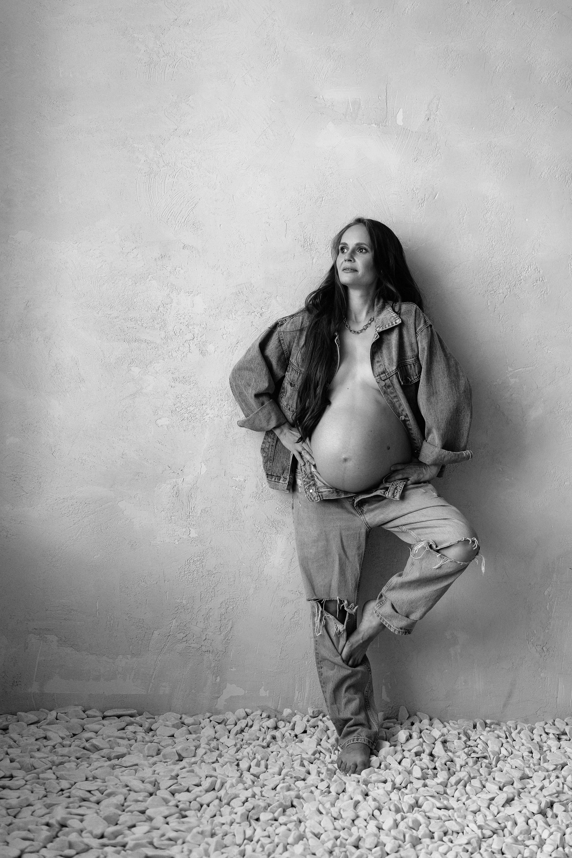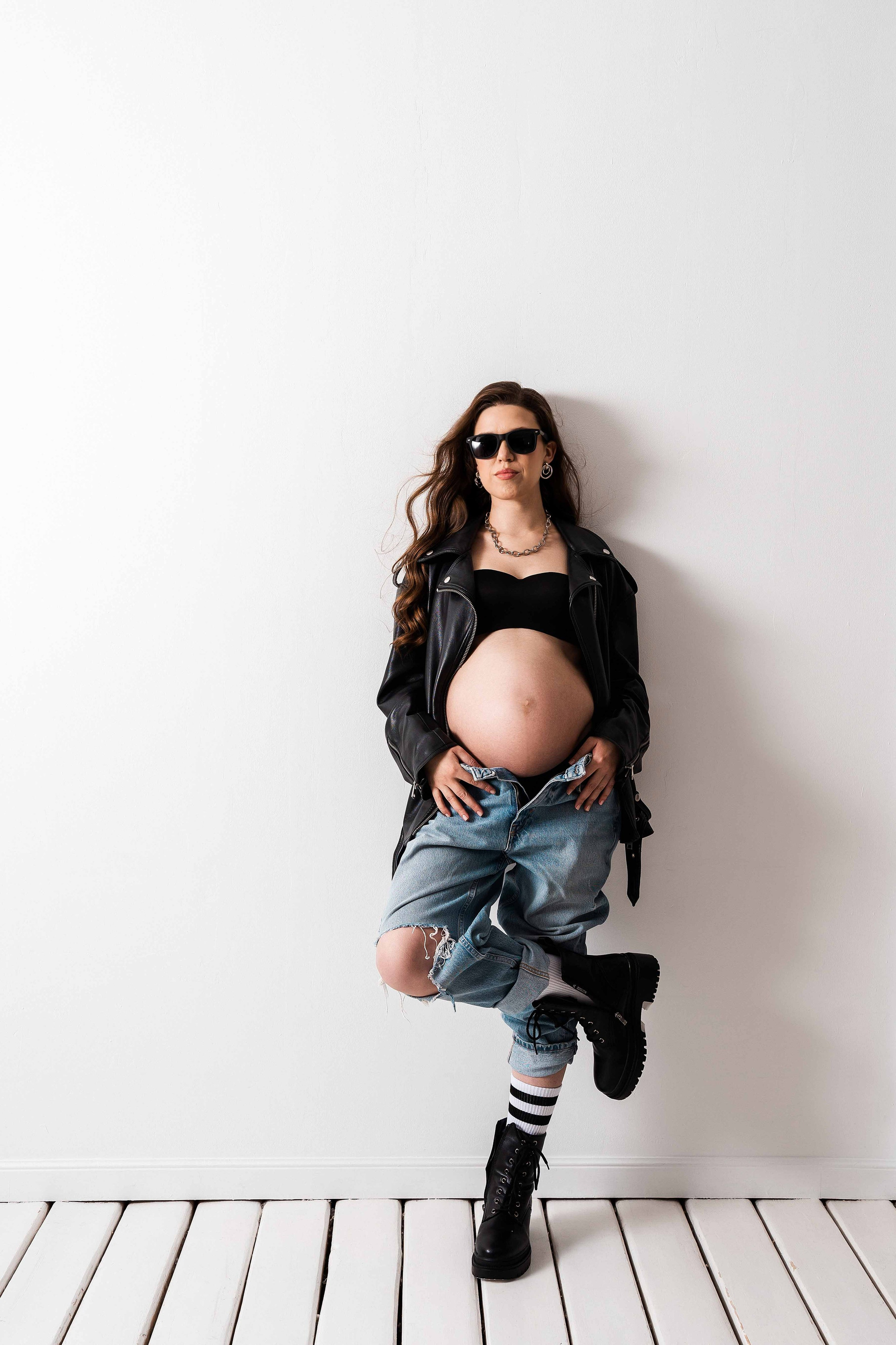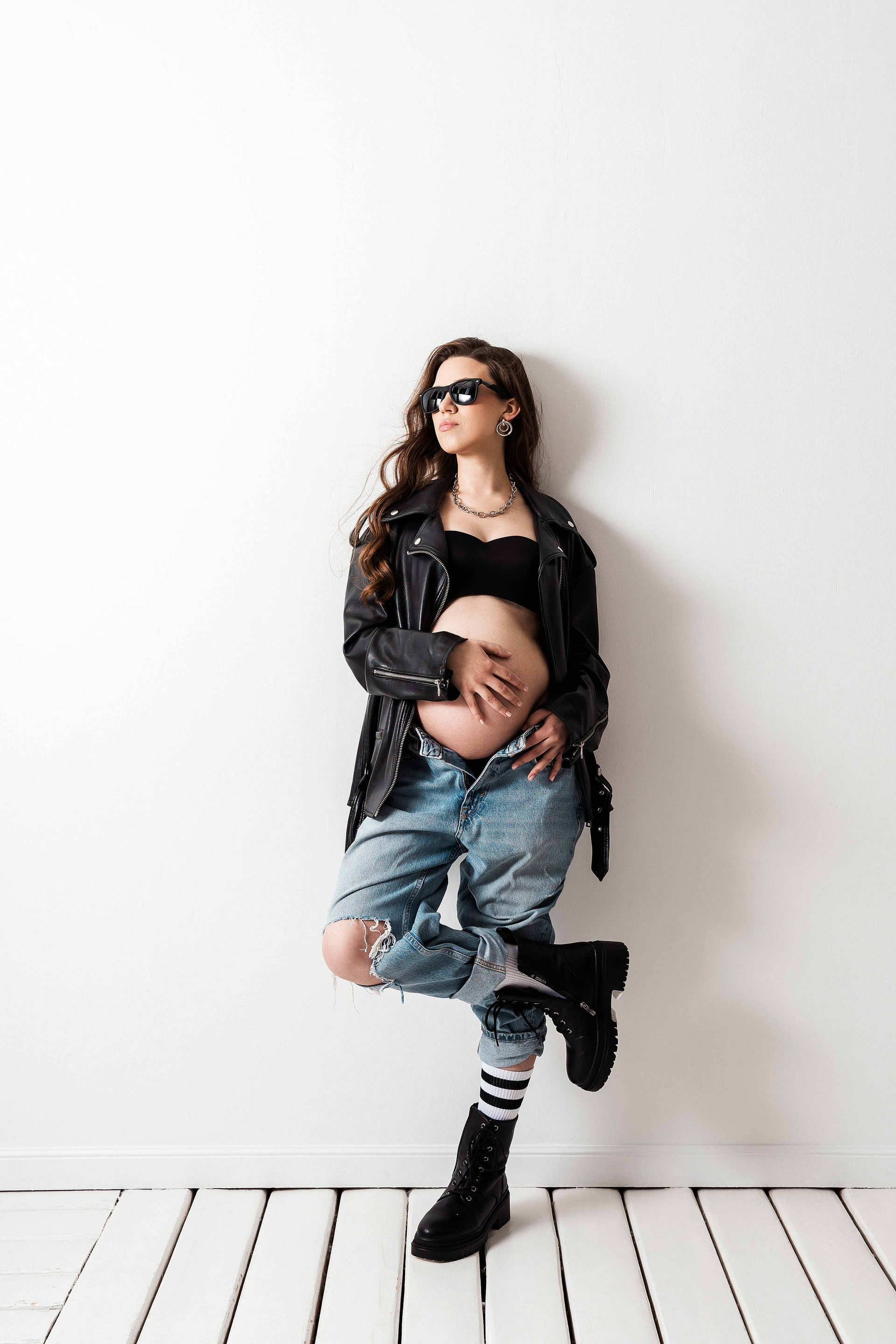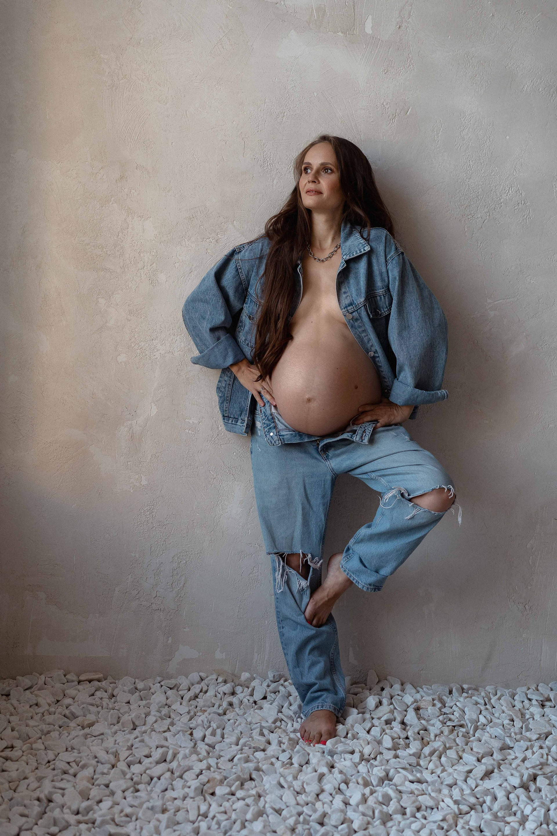 В комплекте — джинсы до 46–48 размера и джинсовая рубашка, которые красиво садятся по фигуре и подчёркивают форму животика. Подтяжки добавляют образу выразительность и особенно гармонично смотрятся в сочетании с рубашкой.Образ легко дополняется парной съёмкой — если супруг тоже в джинсах, кадры смотрятся цельно и очень эстетично. В наличии также есть кожаная куртка, чёрный кроп-топ и топ-бандо для смены настроения и вариативности съёмки.