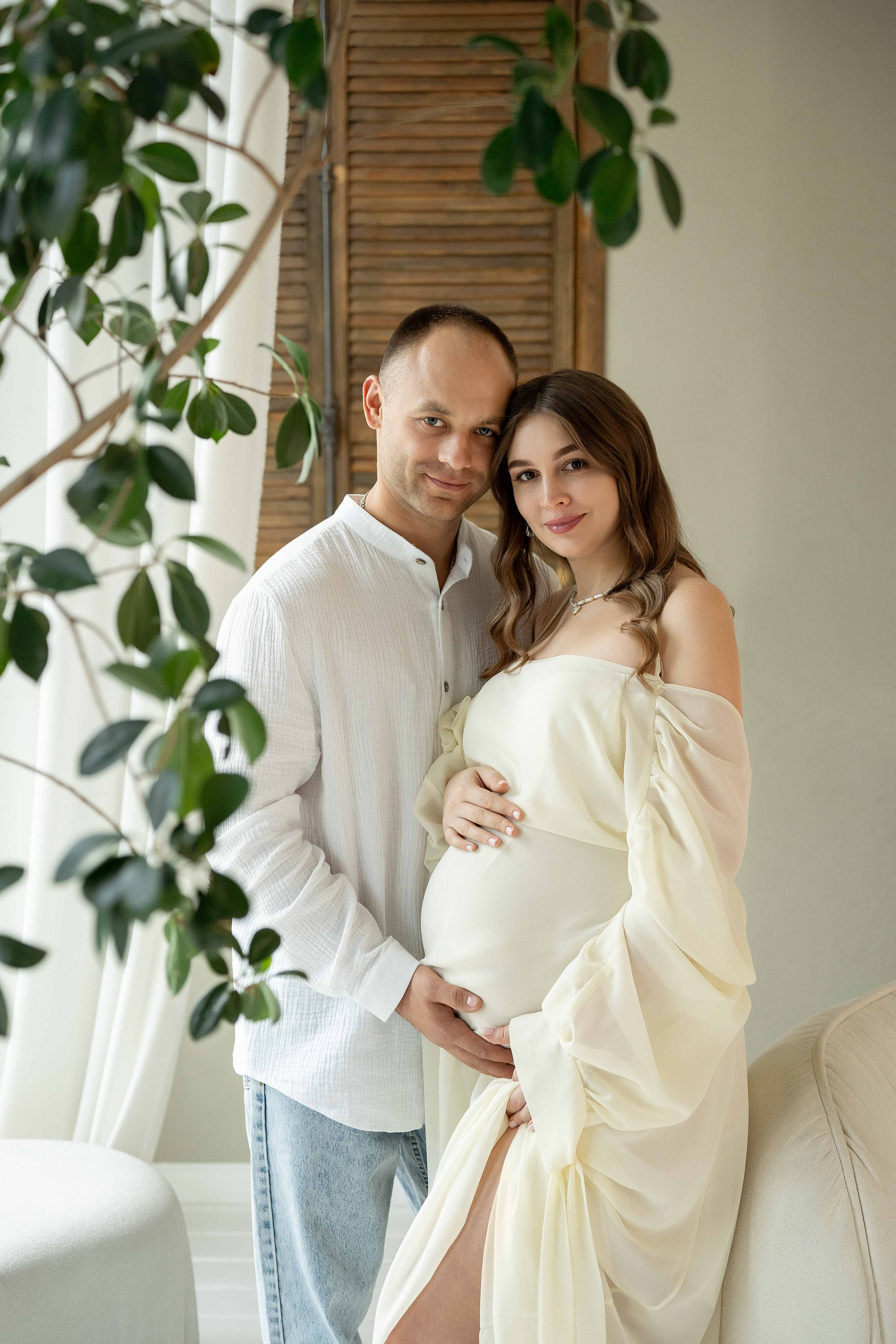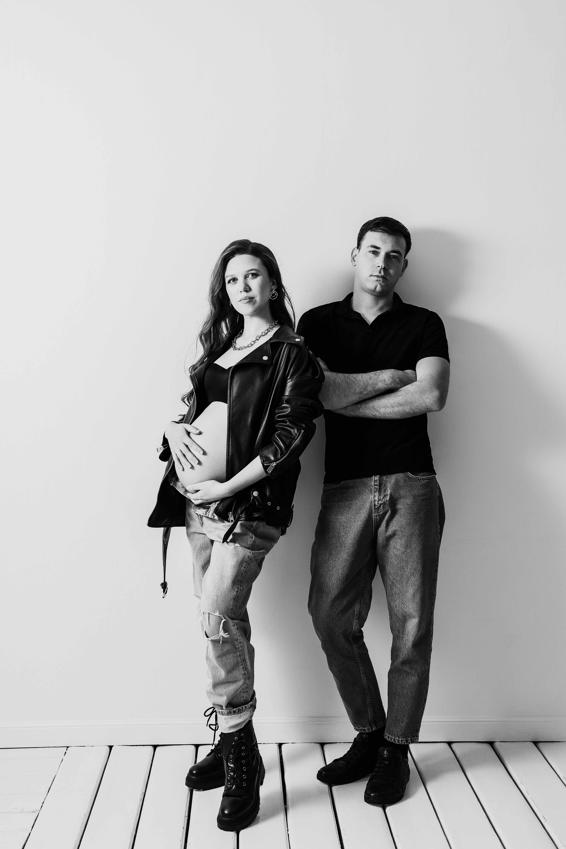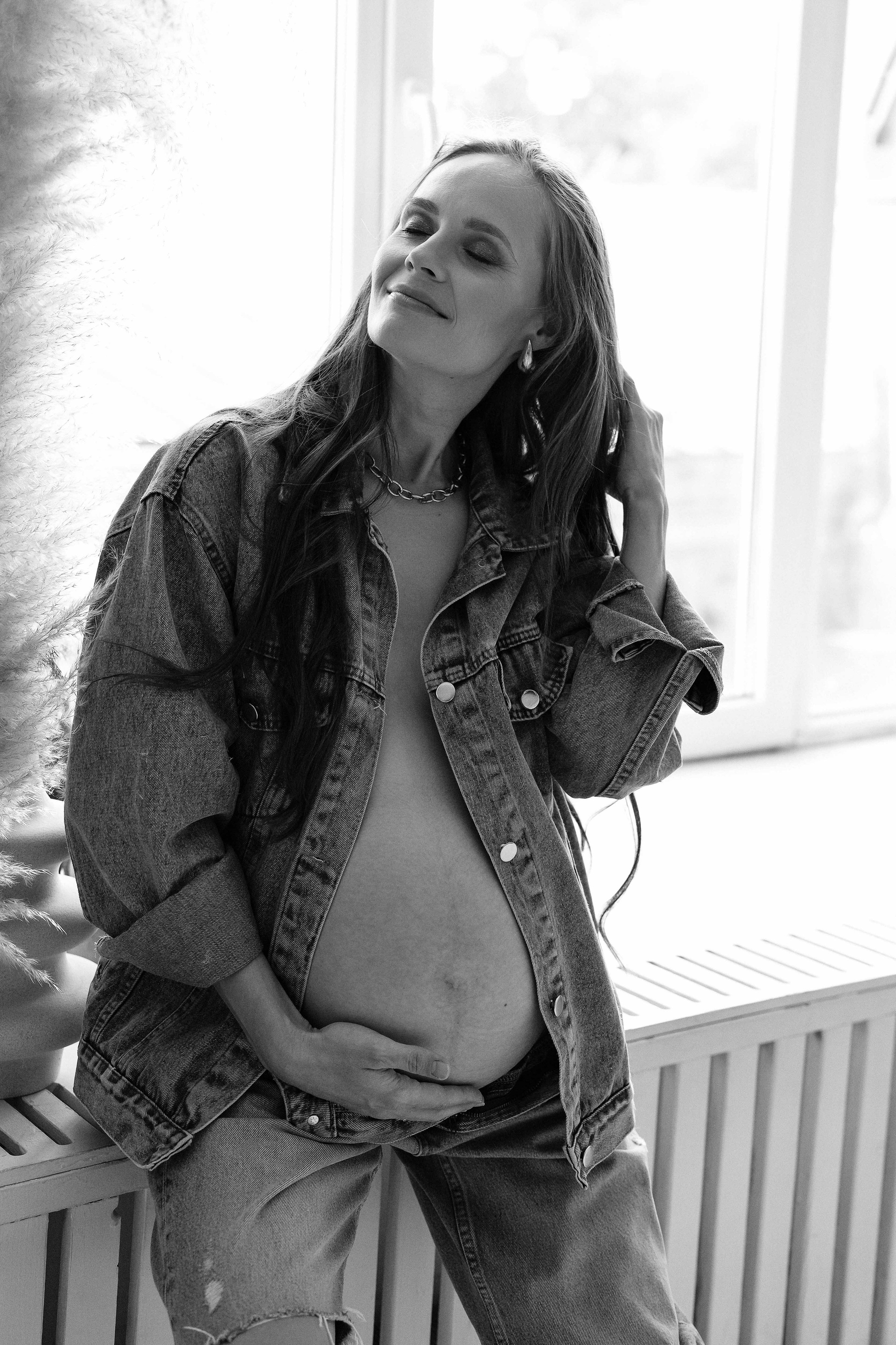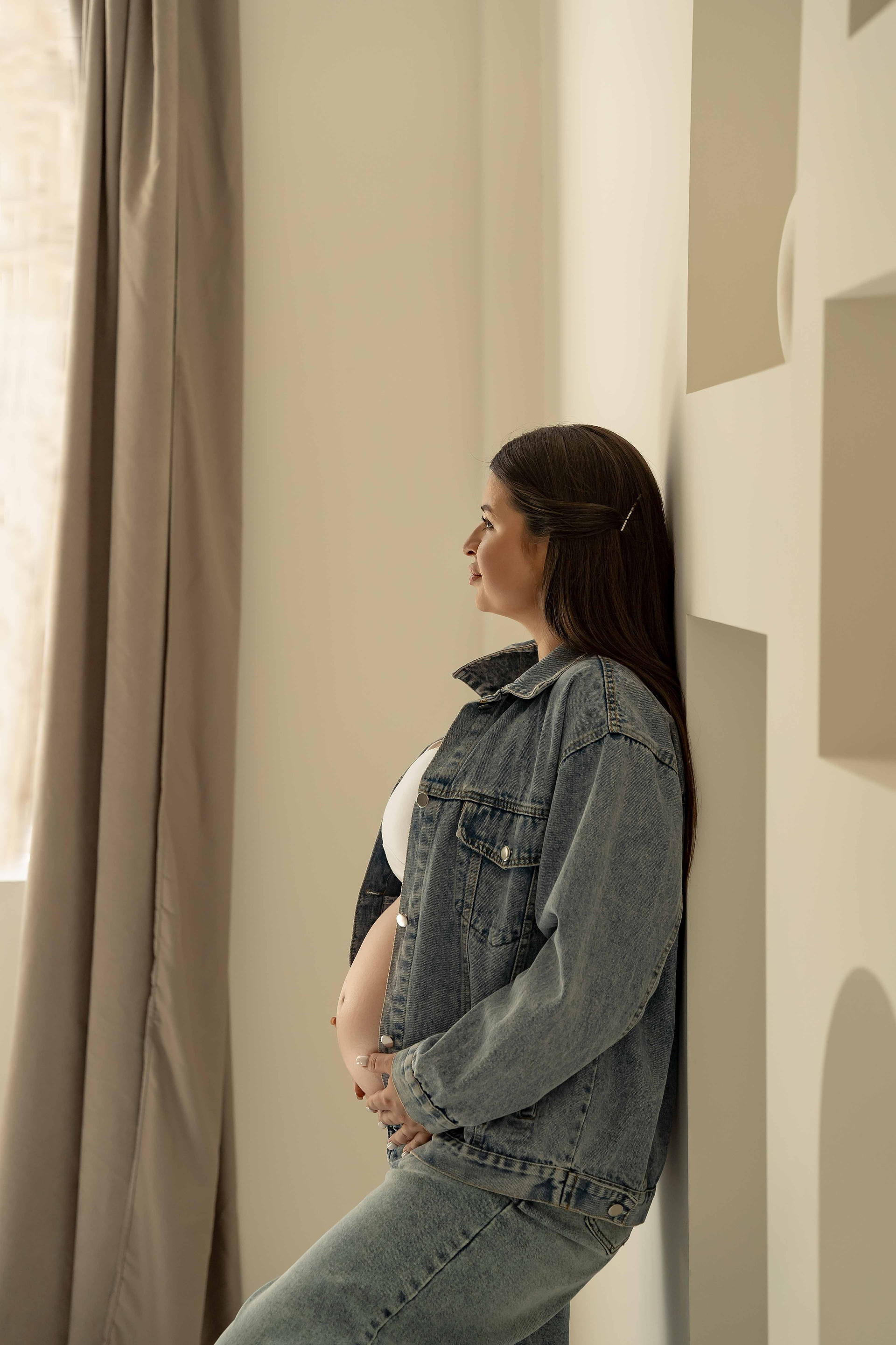 В комплекте — джинсы до 46–48 размера и джинсовая рубашка, которые красиво садятся по фигуре и подчёркивают форму животика. Подтяжки добавляют образу выразительность и особенно гармонично смотрятся в сочетании с рубашкой.Образ легко дополняется парной съёмкой — если супруг тоже в джинсах, кадры смотрятся цельно и очень эстетично. В наличии также есть кожаная куртка, чёрный кроп-топ и топ-бандо для смены настроения и вариативности съёмки.