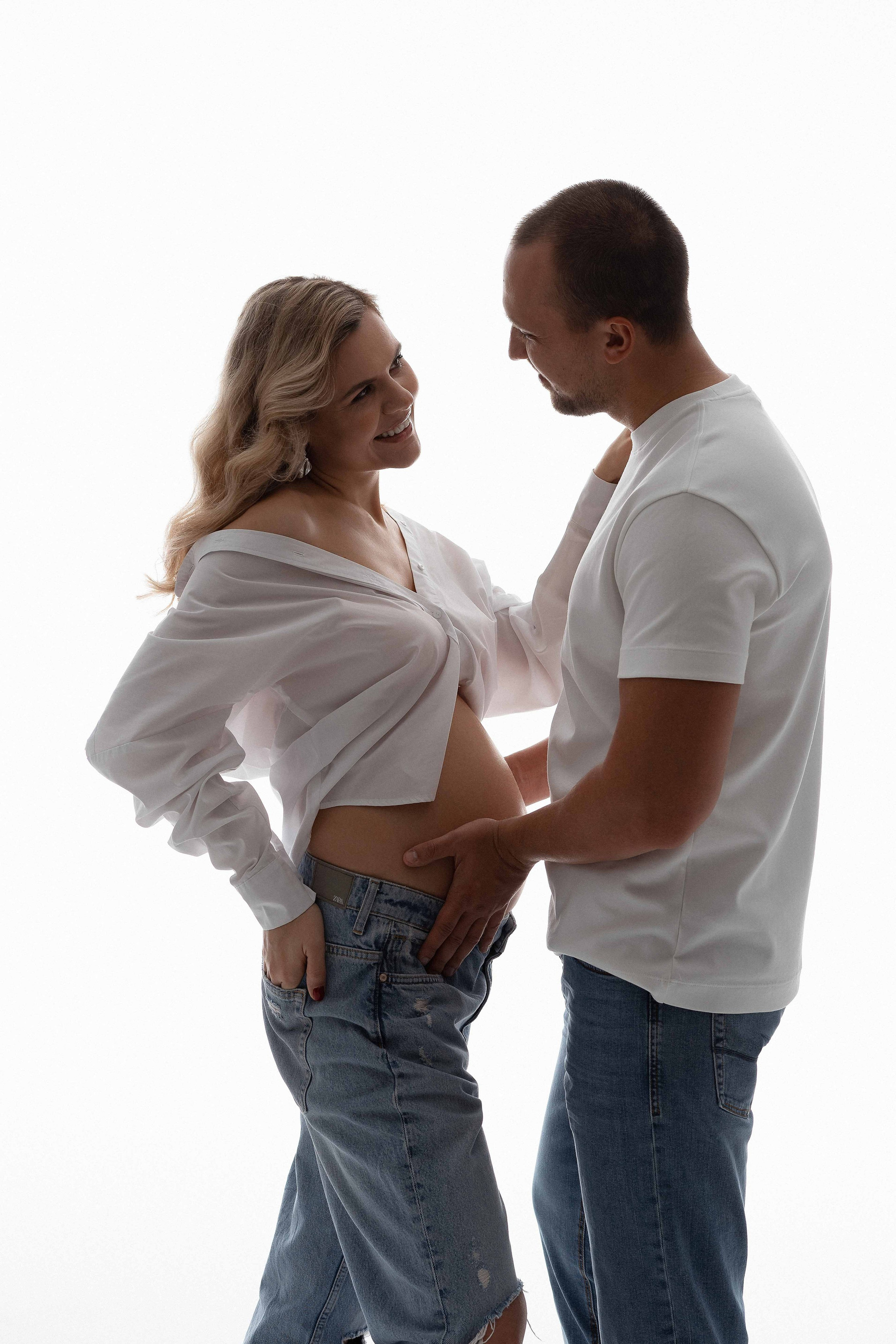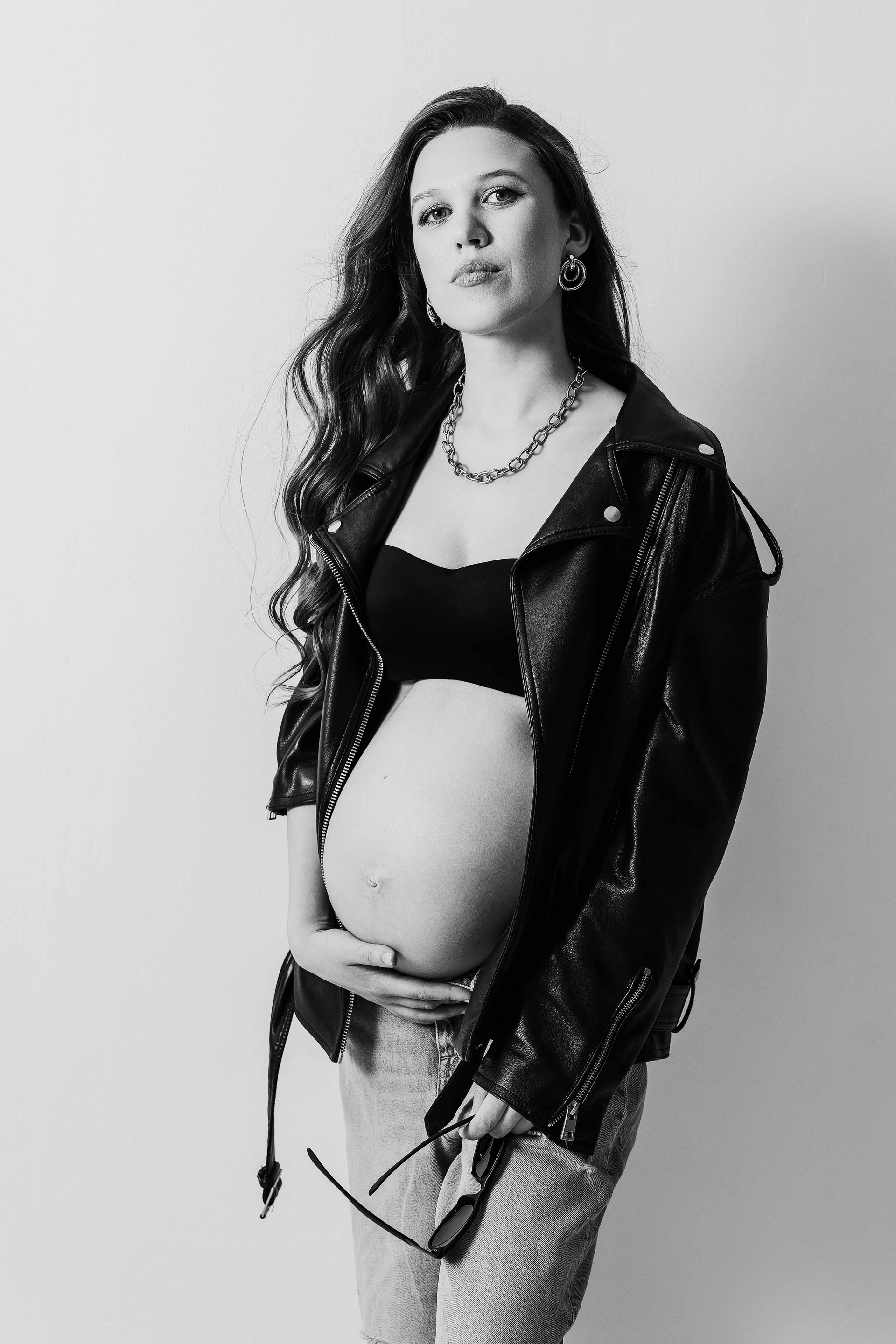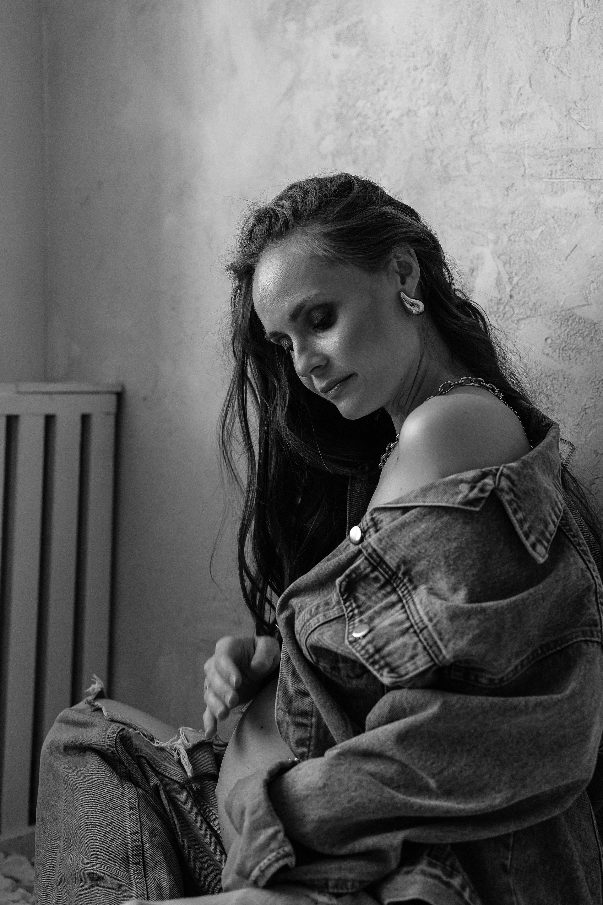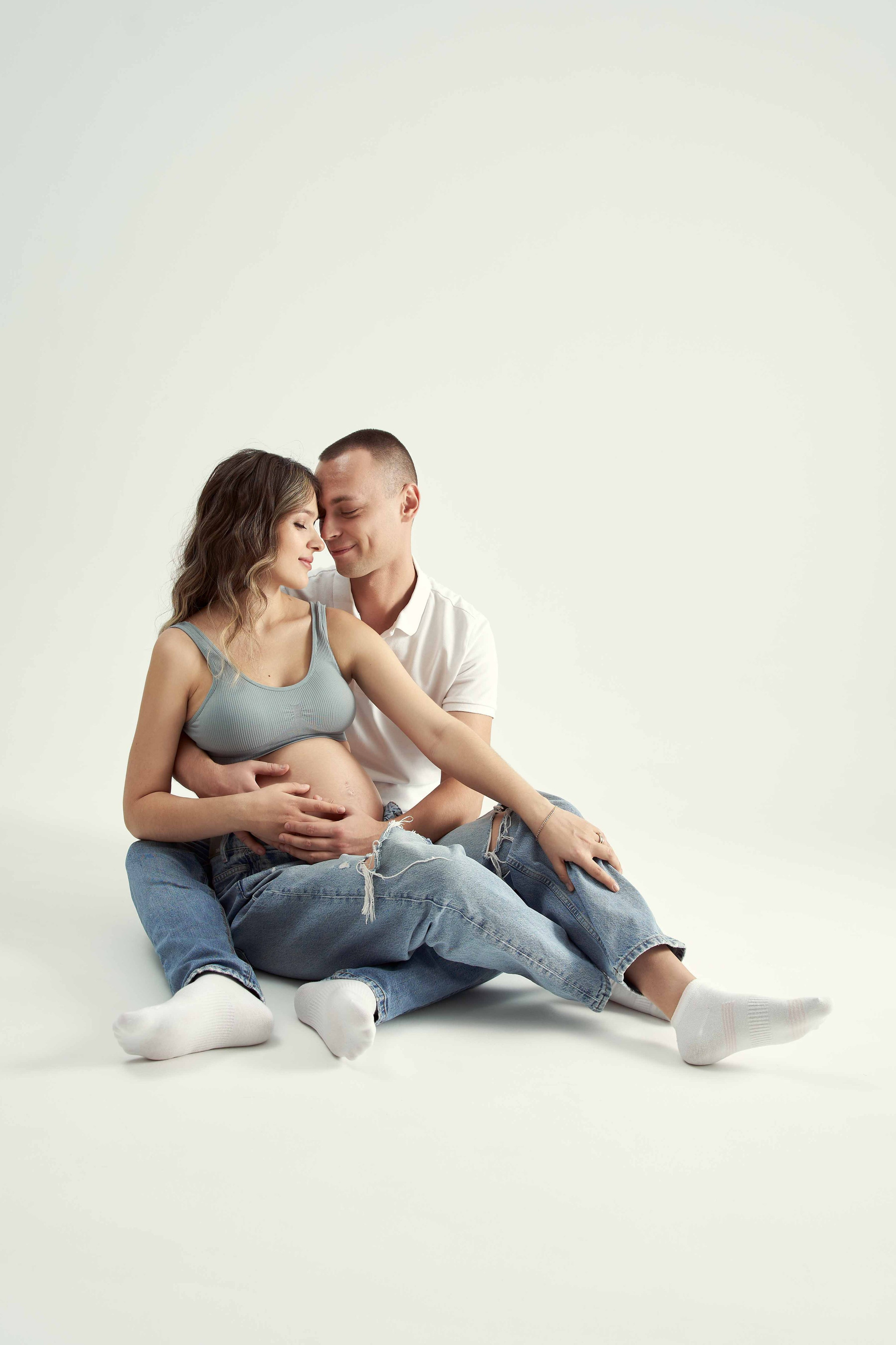 В комплекте — джинсы до 46–48 размера и джинсовая рубашка, которые красиво садятся по фигуре и подчёркивают форму животика. Подтяжки добавляют образу выразительность и особенно гармонично смотрятся в сочетании с рубашкой.Образ легко дополняется парной съёмкой — если супруг тоже в джинсах, кадры смотрятся цельно и очень эстетично. В наличии также есть кожаная куртка, чёрный кроп-топ и топ-бандо для смены настроения и вариативности съёмки.