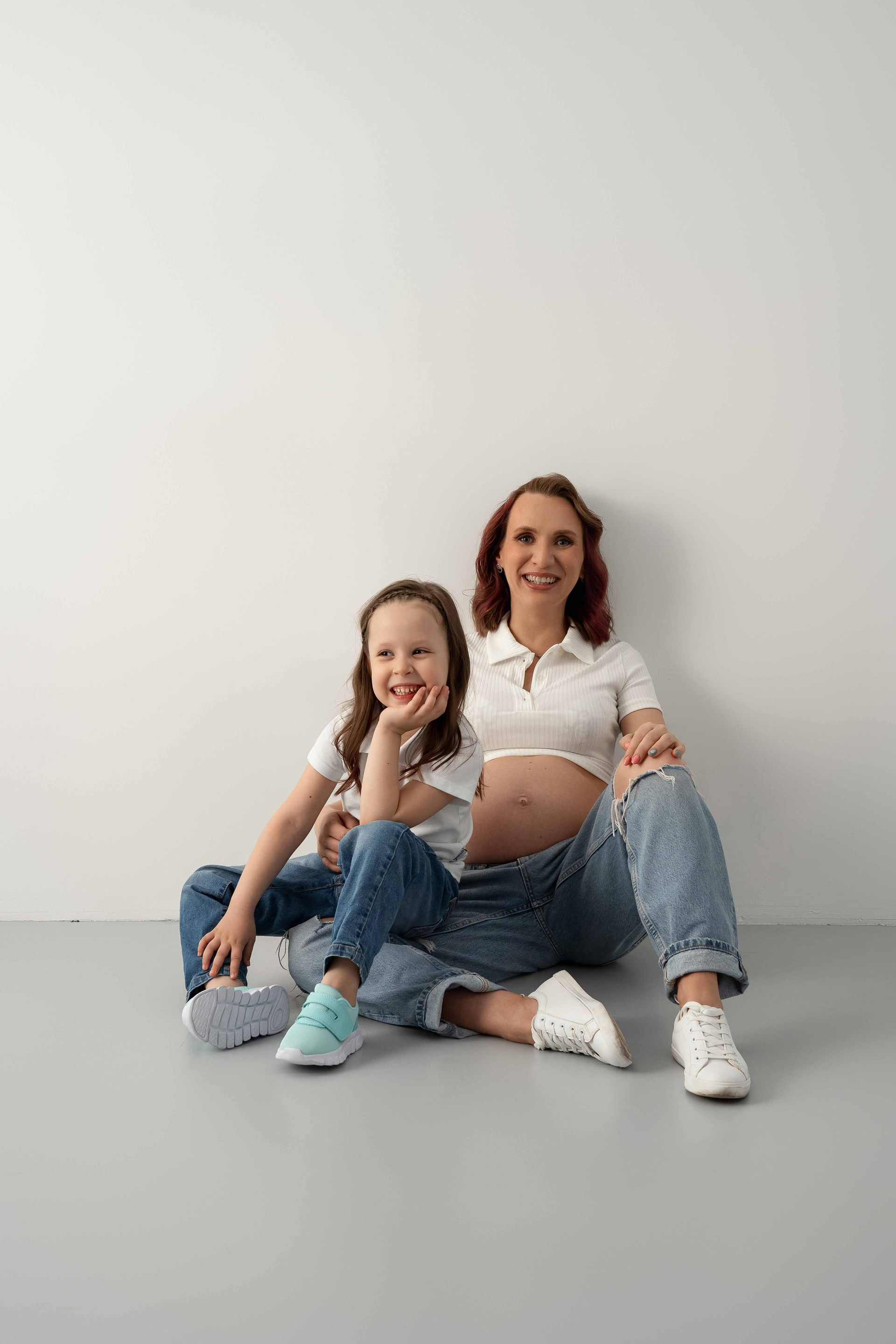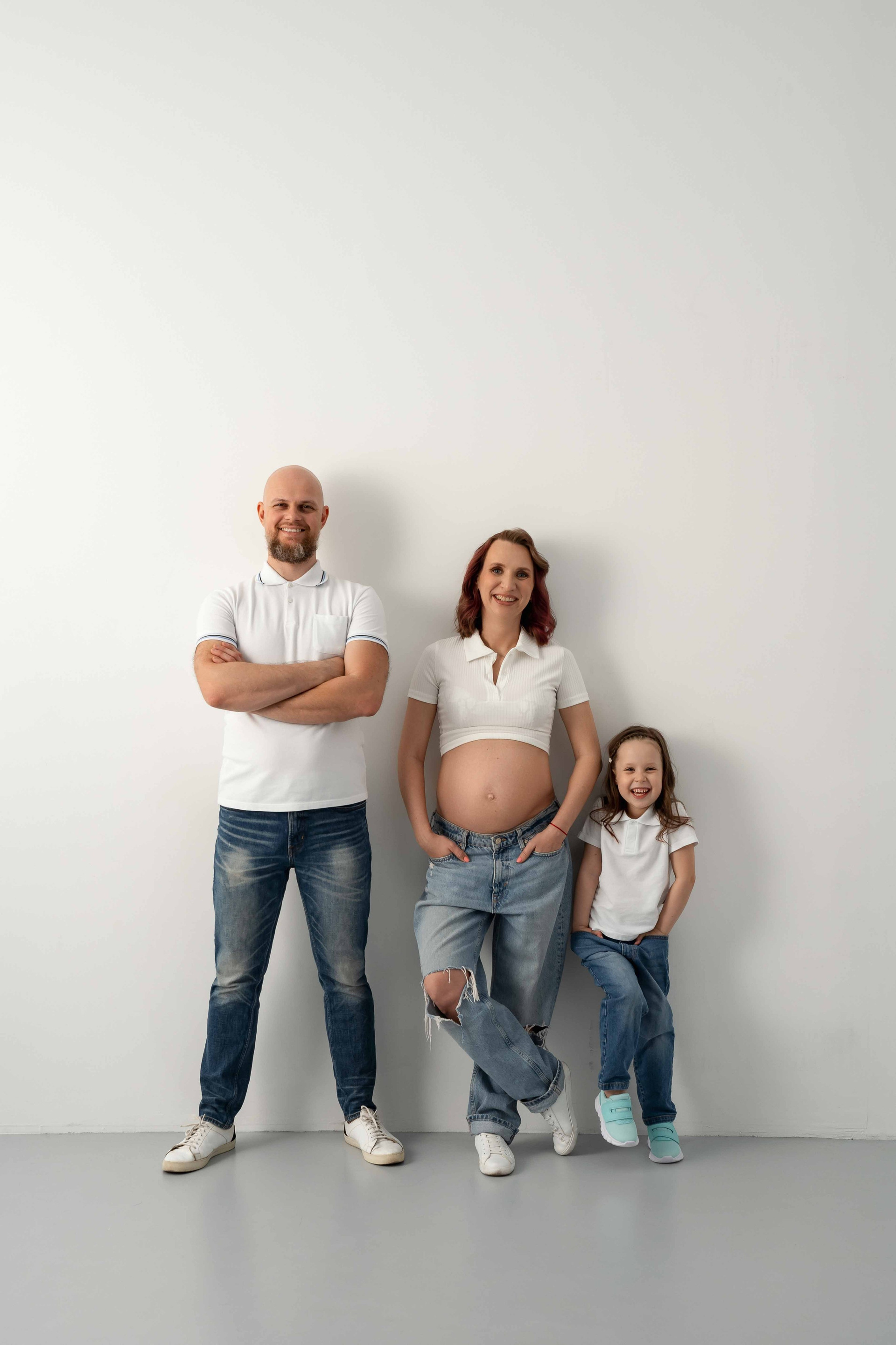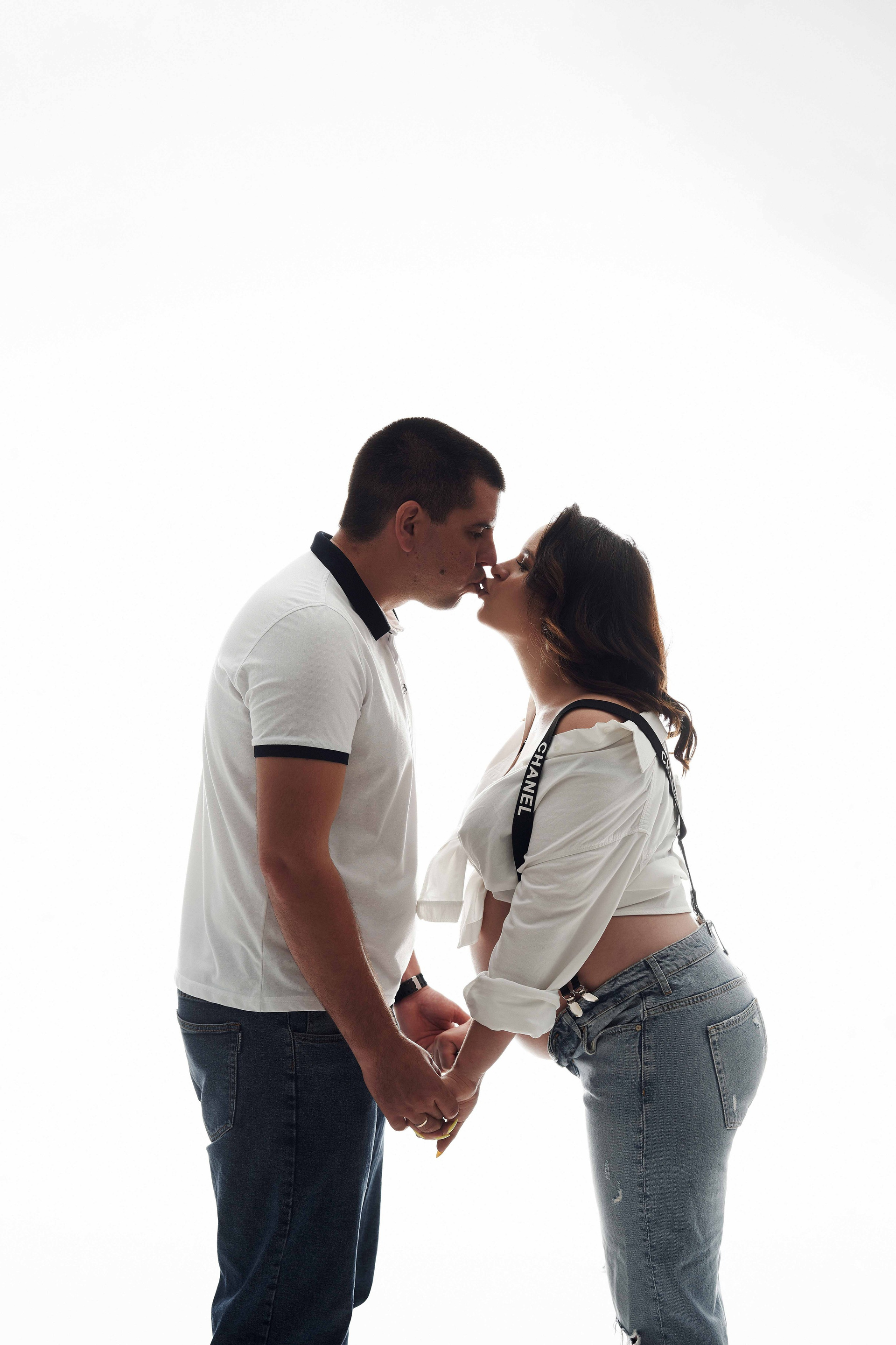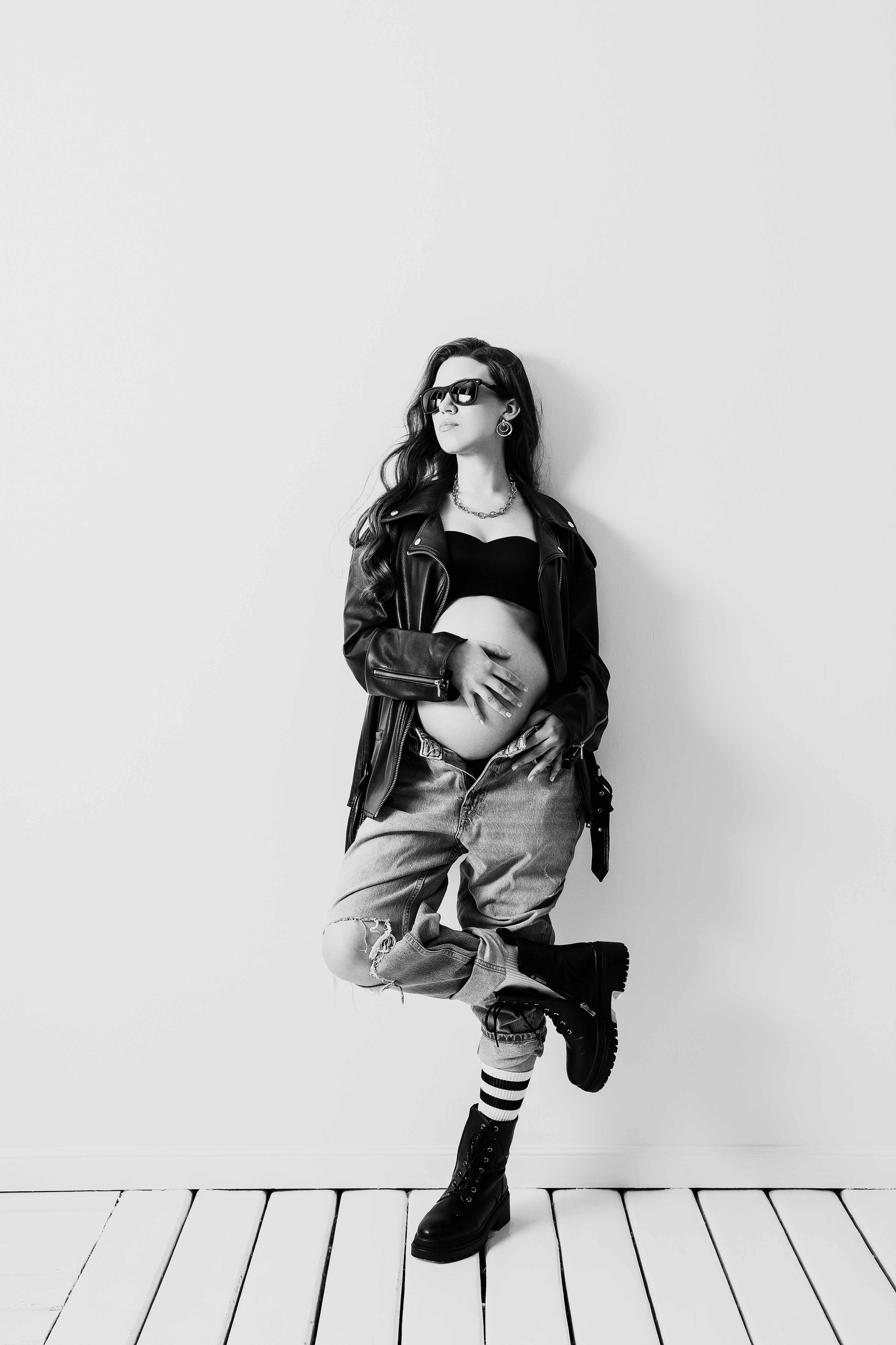 В комплекте — джинсы до 46–48 размера и джинсовая рубашка, которые красиво садятся по фигуре и подчёркивают форму животика. Подтяжки добавляют образу выразительность и особенно гармонично смотрятся в сочетании с рубашкой.Образ легко дополняется парной съёмкой — если супруг тоже в джинсах, кадры смотрятся цельно и очень эстетично. В наличии также есть кожаная куртка, чёрный кроп-топ и топ-бандо для смены настроения и вариативности съёмки.
