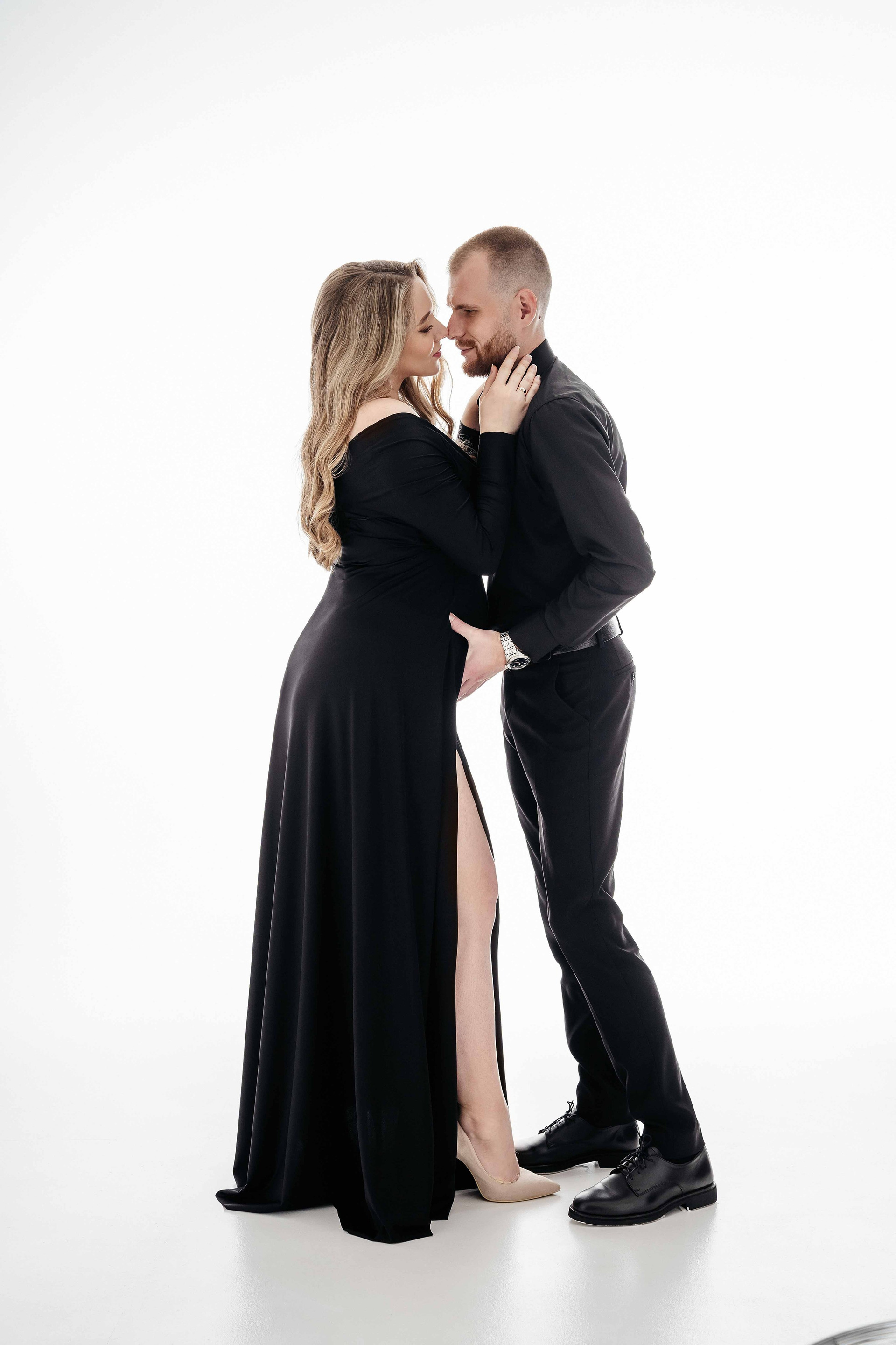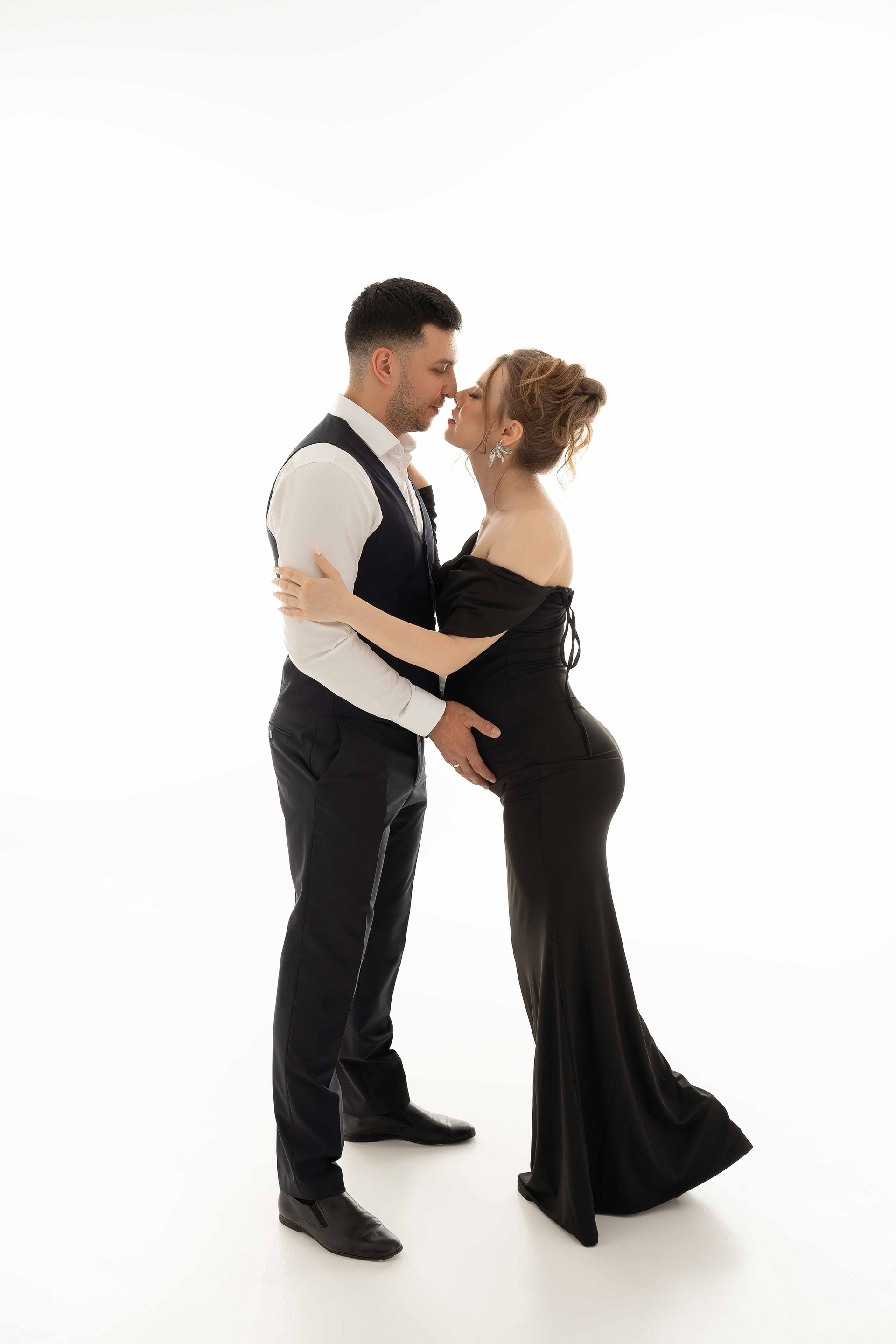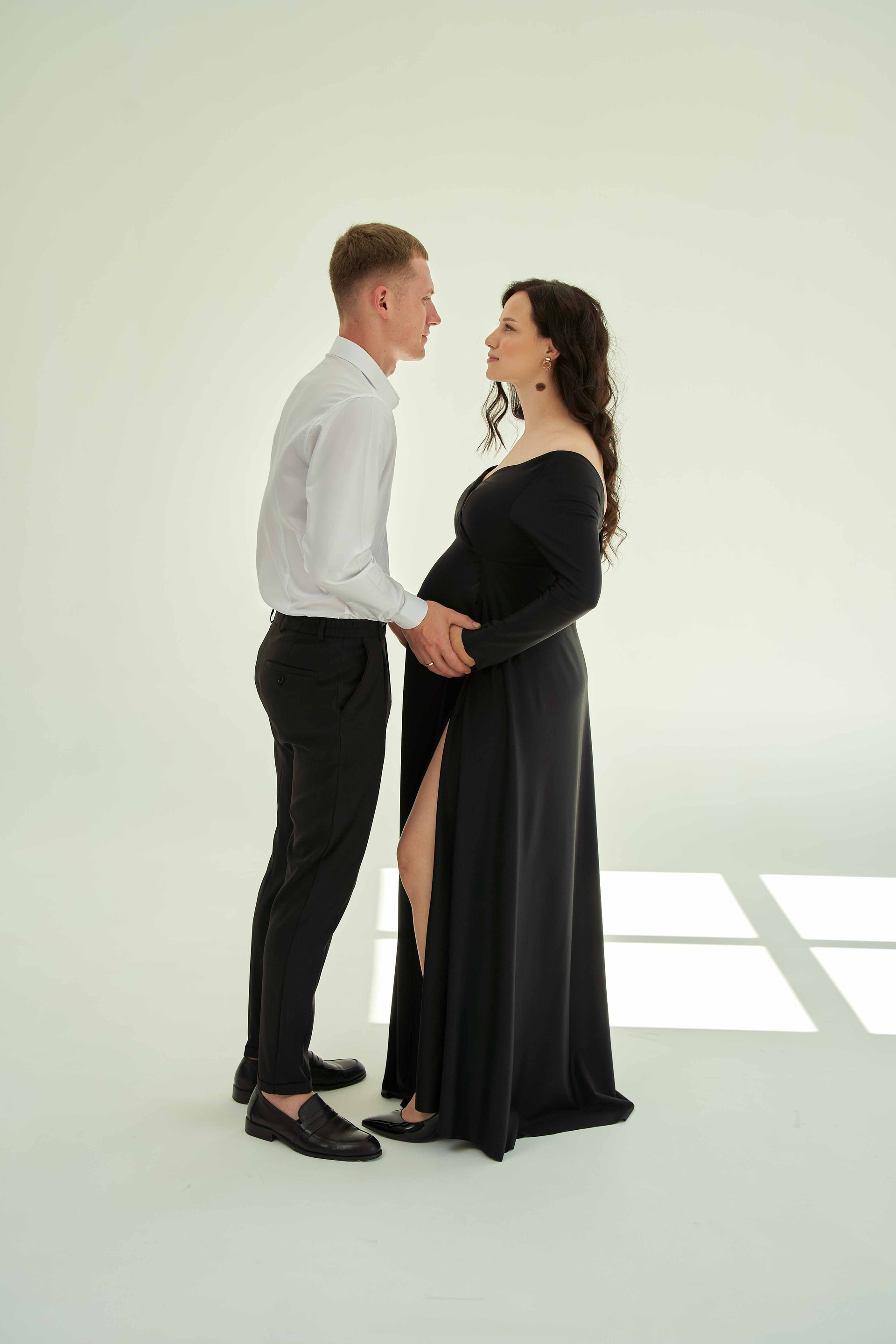 Модель эффектно смотрится в кадре, особенно в парной съёмке, когда супруг также одет в чёрную одежду. Платье подходит до 46 размера и создаёт выразительный, стильный образ.