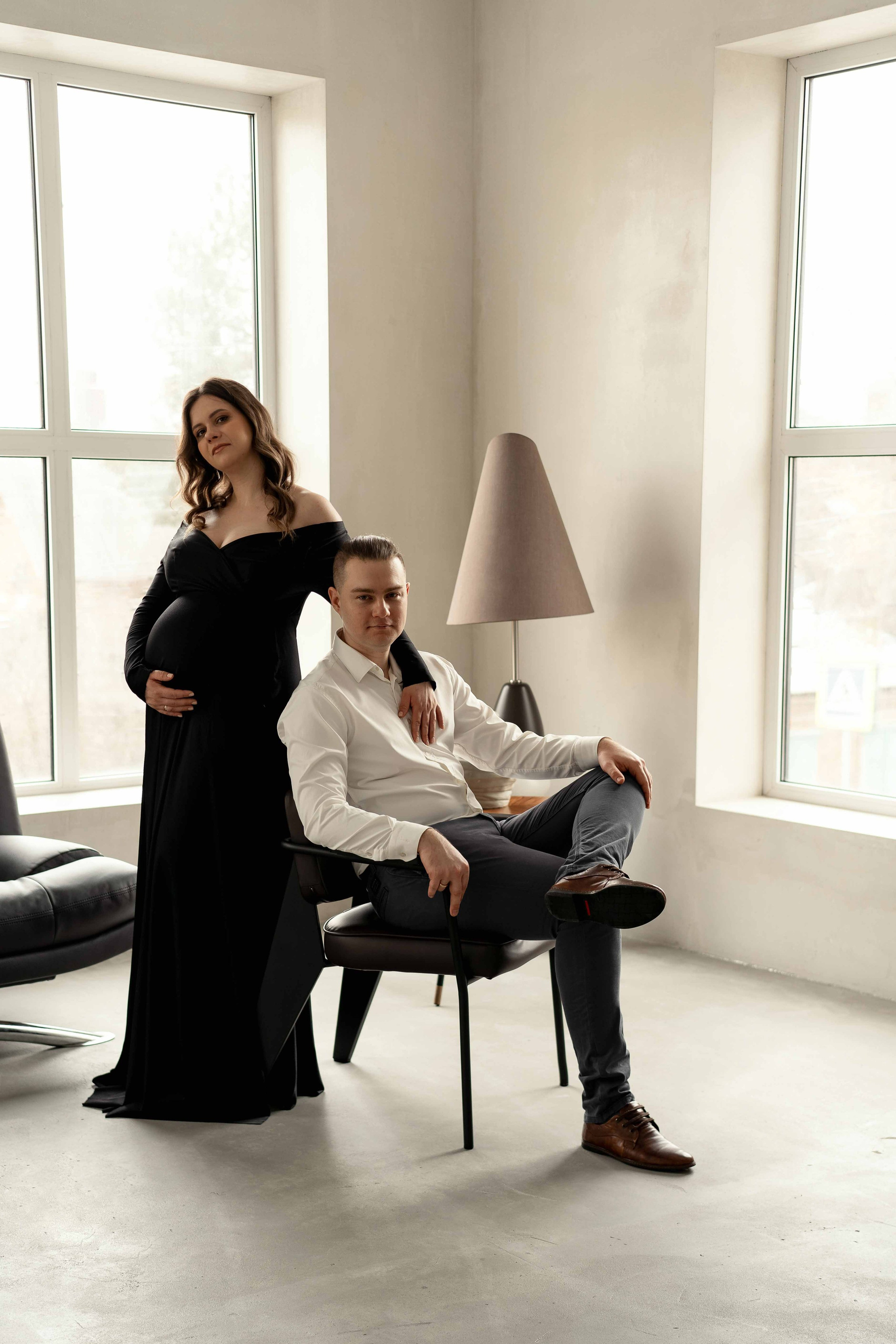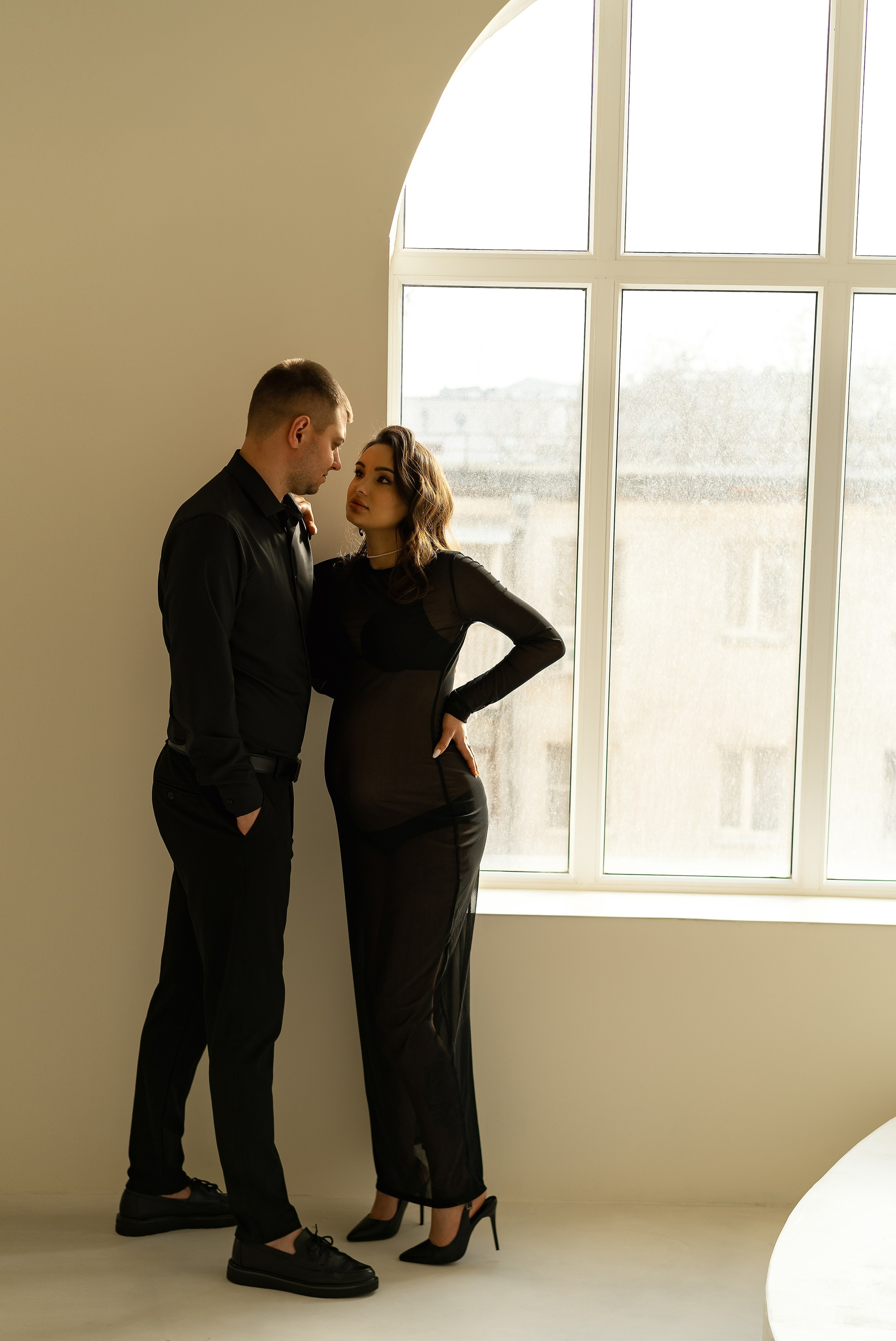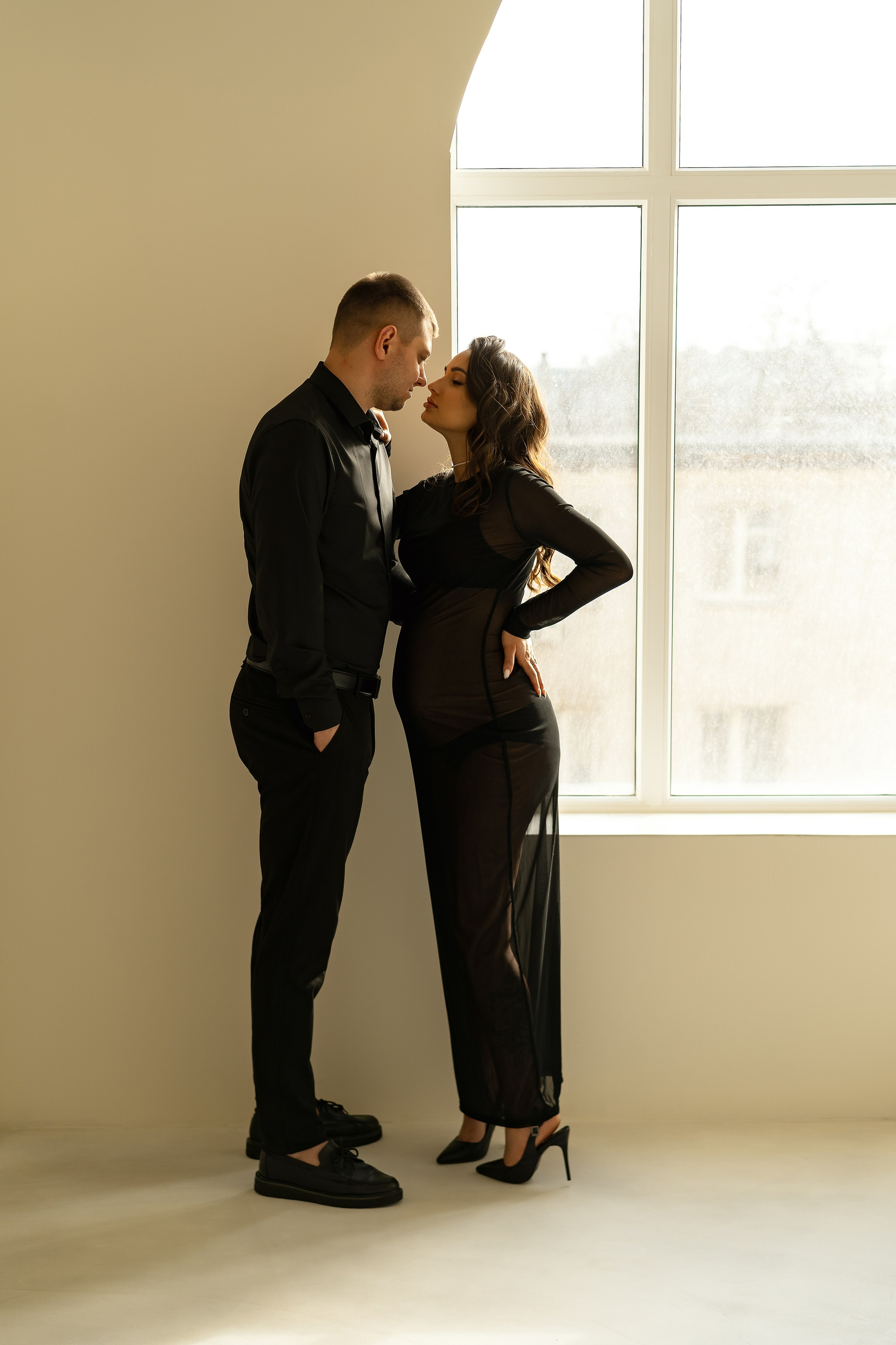Модель эффектно смотрится в кадре, особенно в парной съёмке, когда супруг также одет в чёрную одежду. Платье подходит до 46 размера и создаёт выразительный, стильный образ.