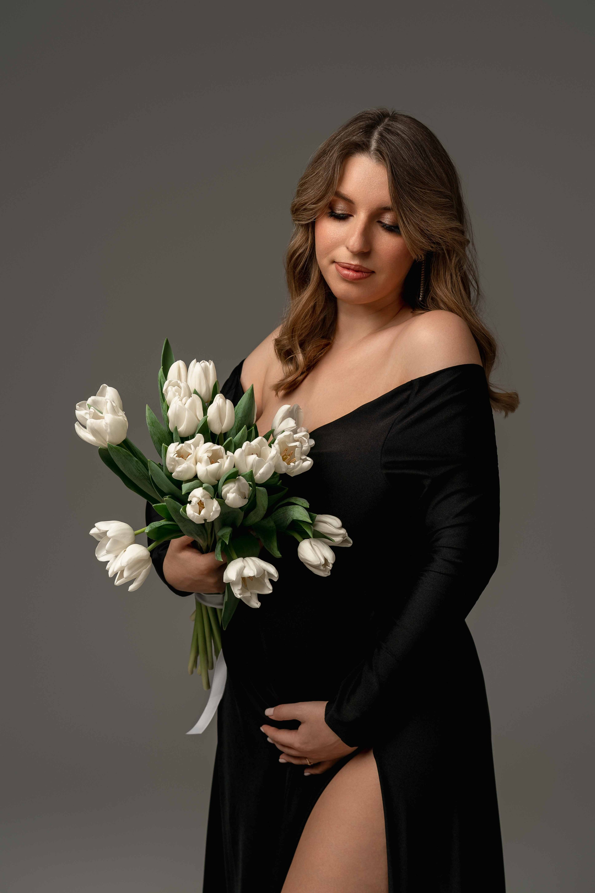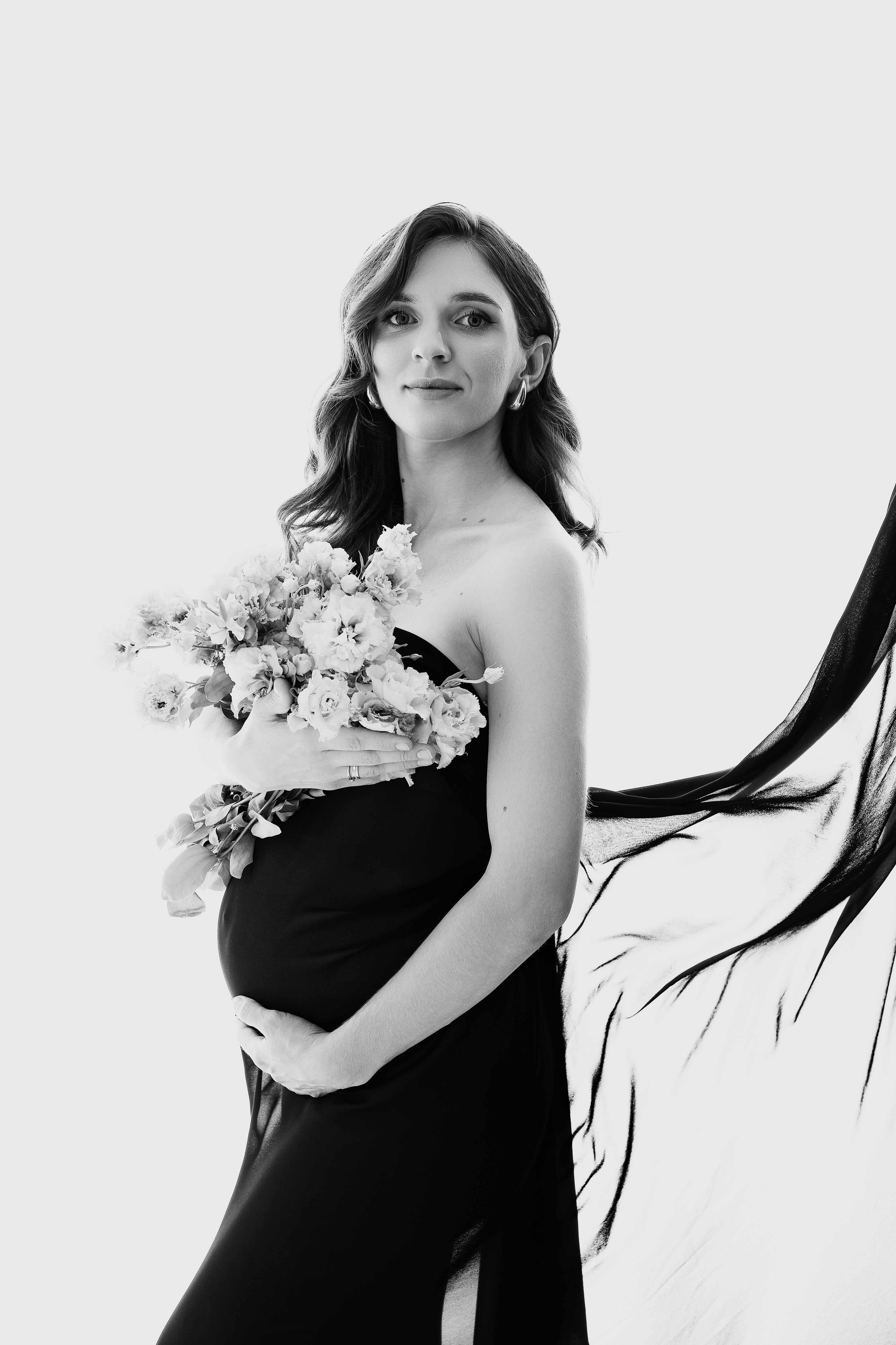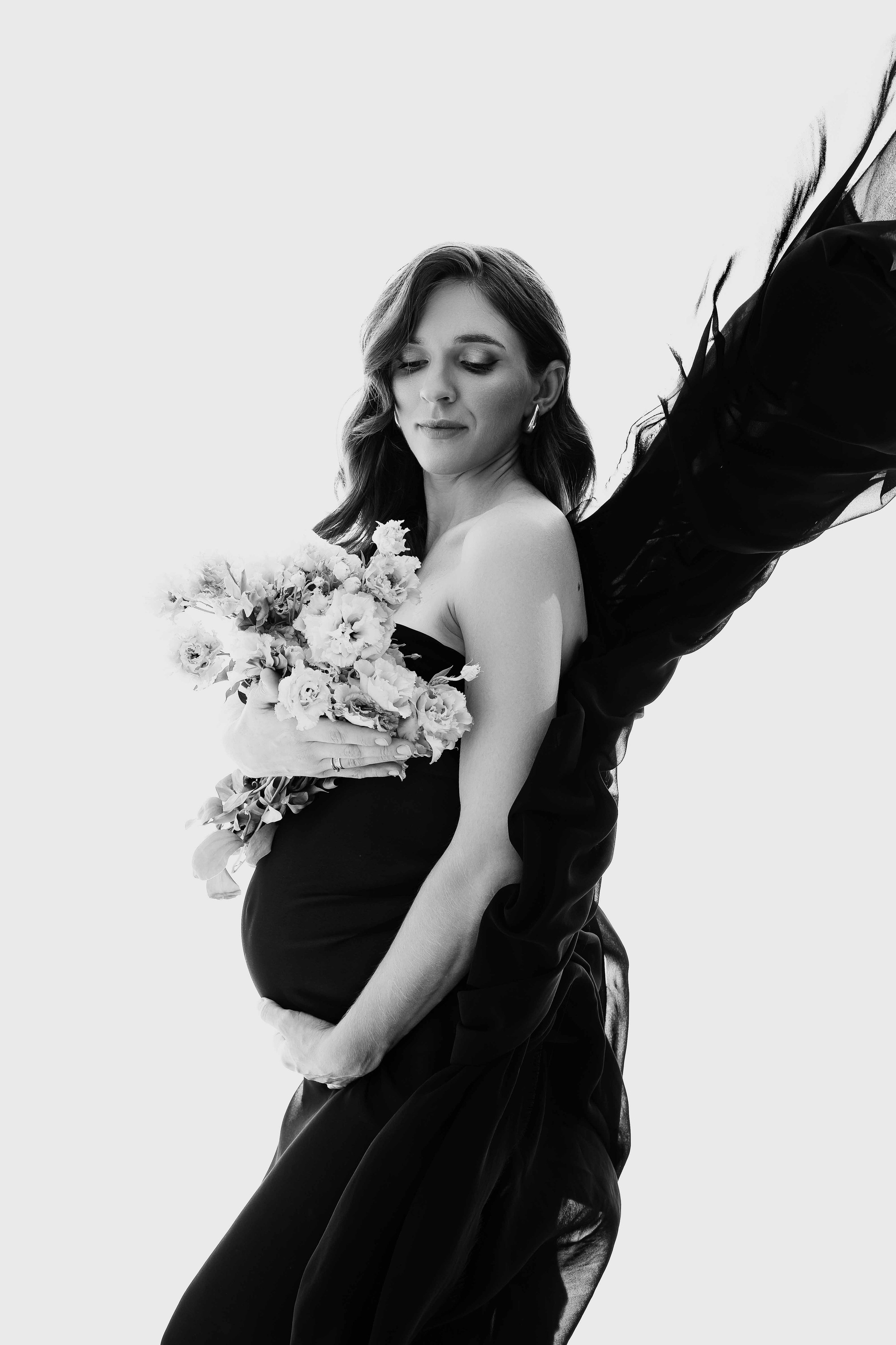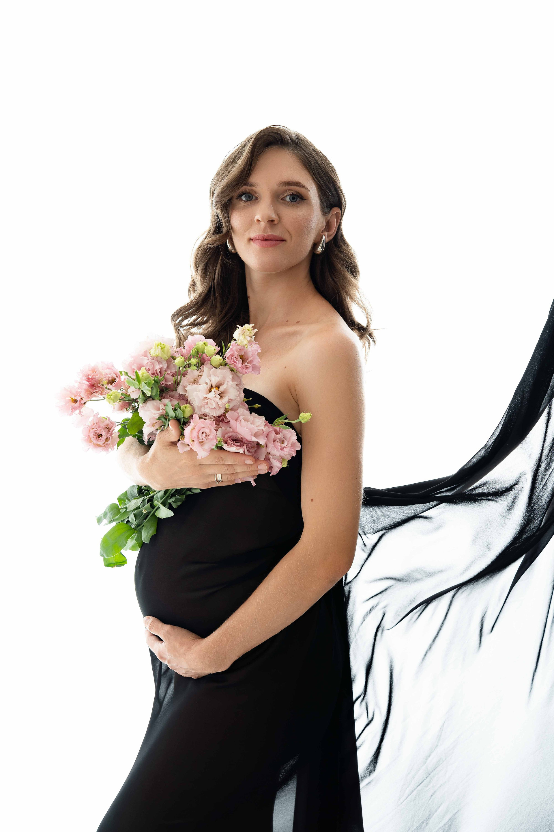 Чёрная ткань красиво подчёркивает беременный животик, создавая выразительный и очень эстетичный визуал. В сочетании с цветами в кадре получаются по-настоящему впечатляющие фотографии — именно те снимки, которые хочется печатать в большом формате и украшать ими интерьер своего дома.