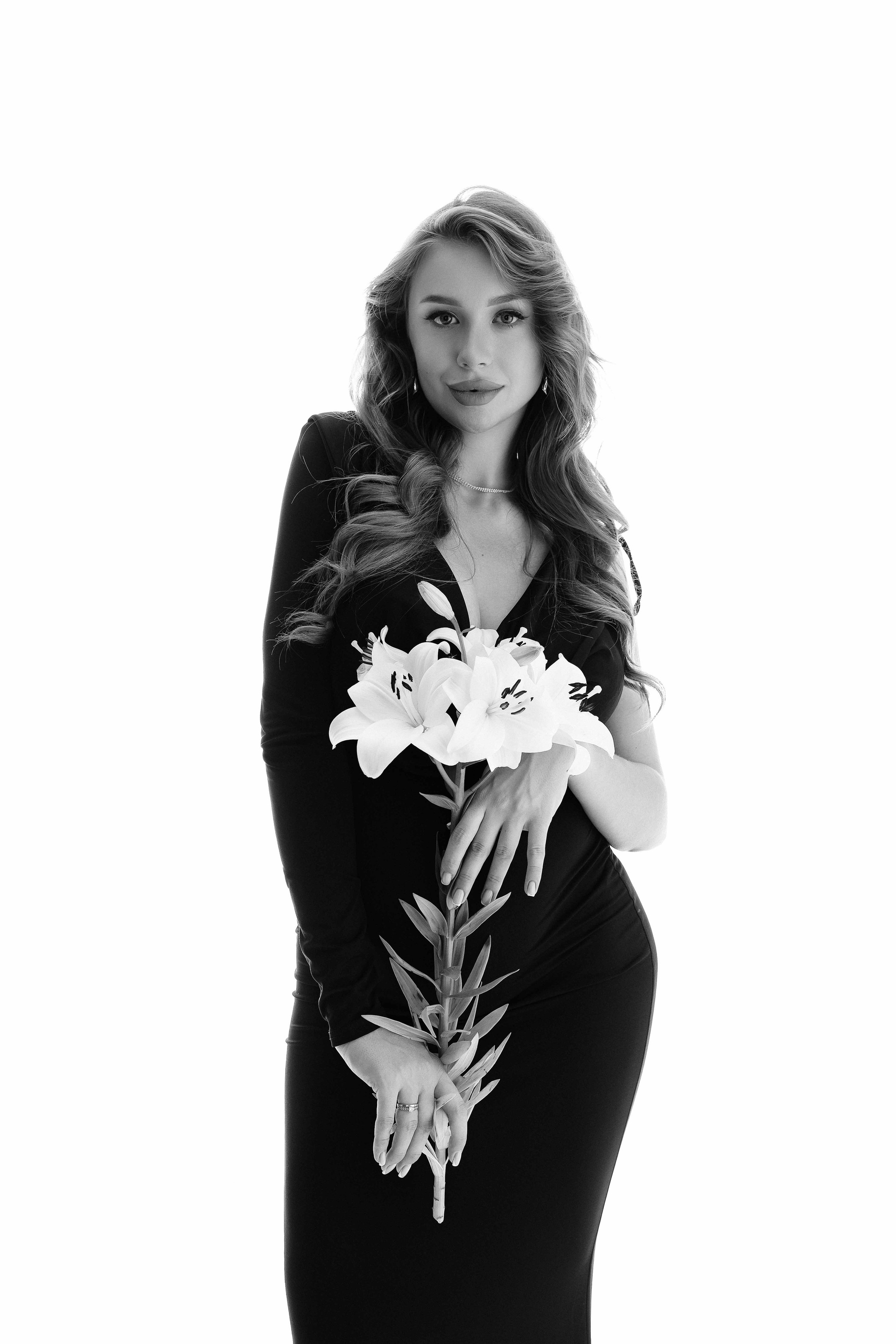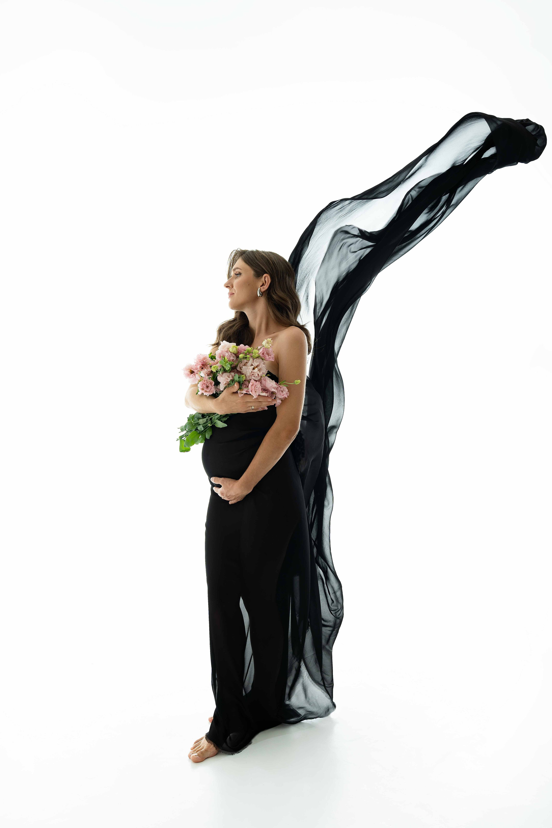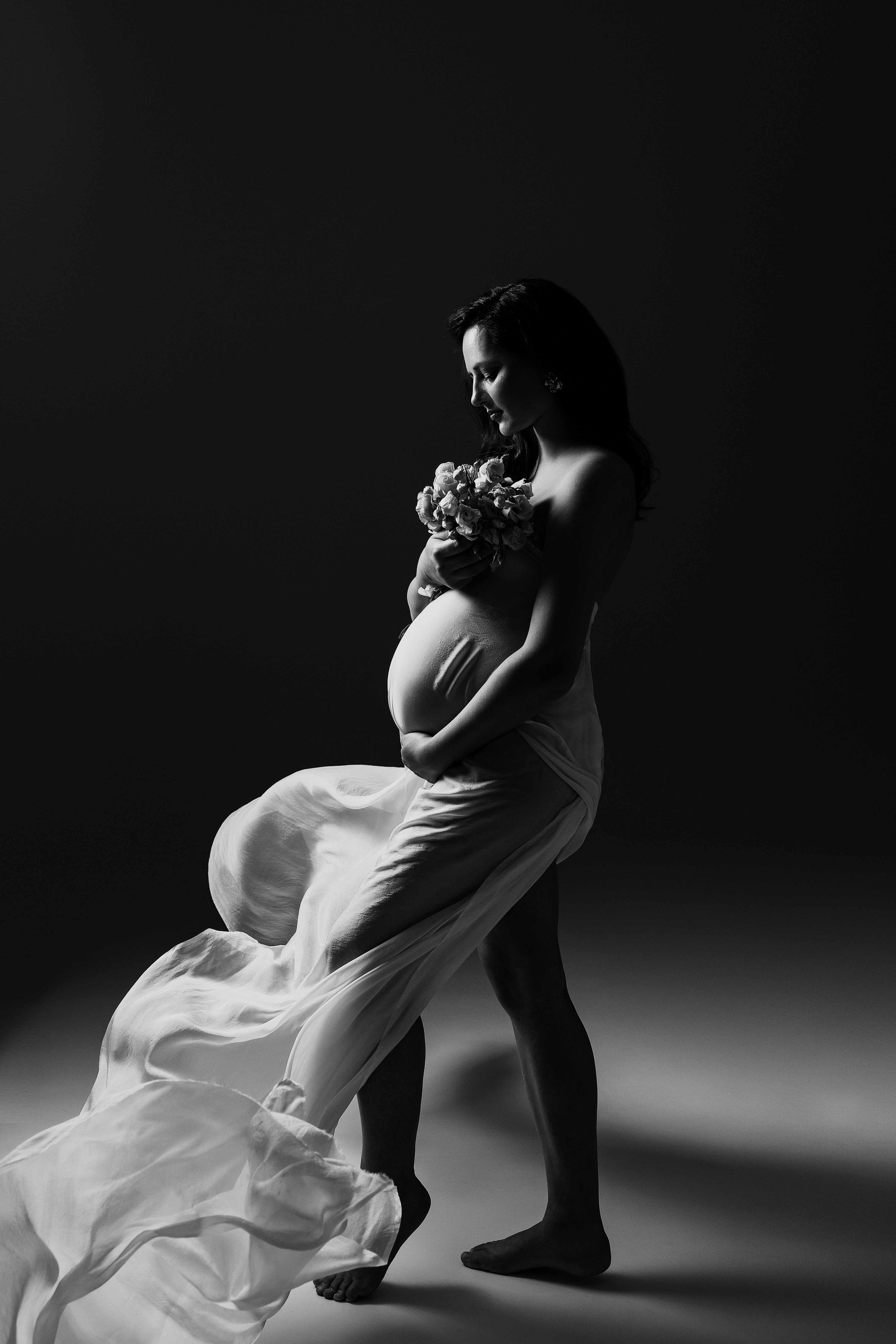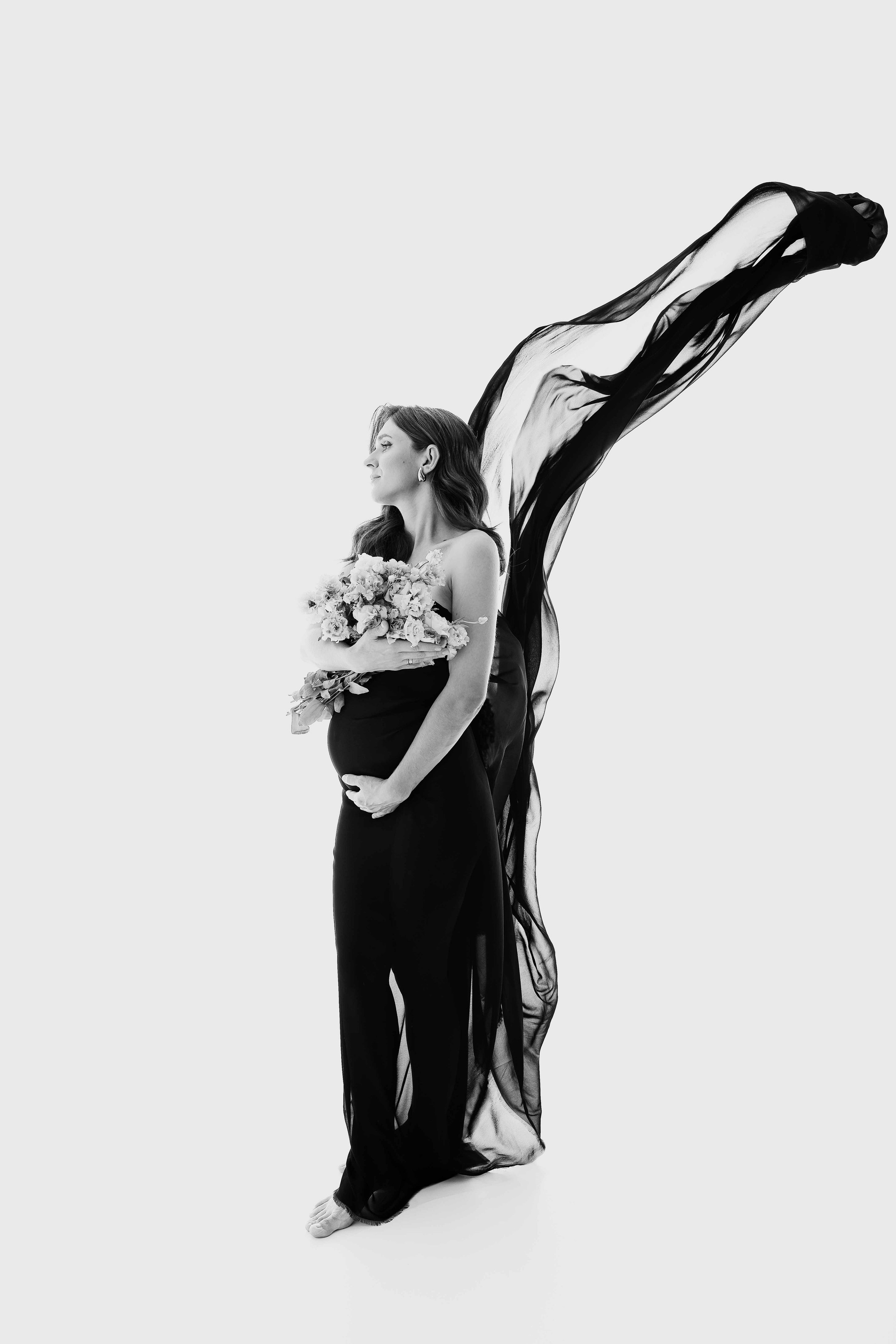 Чёрная ткань красиво подчёркивает беременный животик, создавая выразительный и очень эстетичный визуал. В сочетании с цветами в кадре получаются по-настоящему впечатляющие фотографии — именно те снимки, которые хочется печатать в большом формате и украшать ими интерьер своего дома.