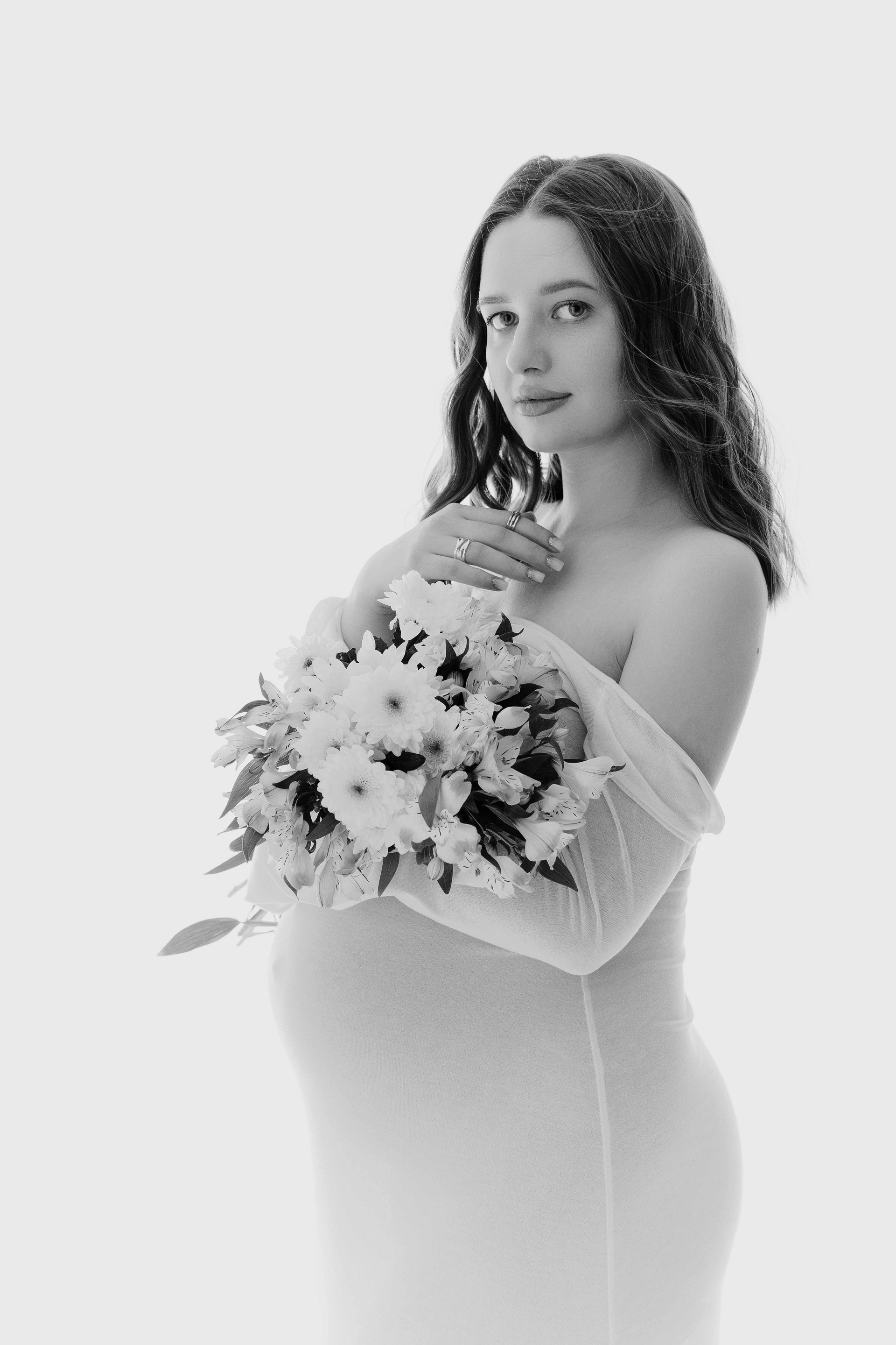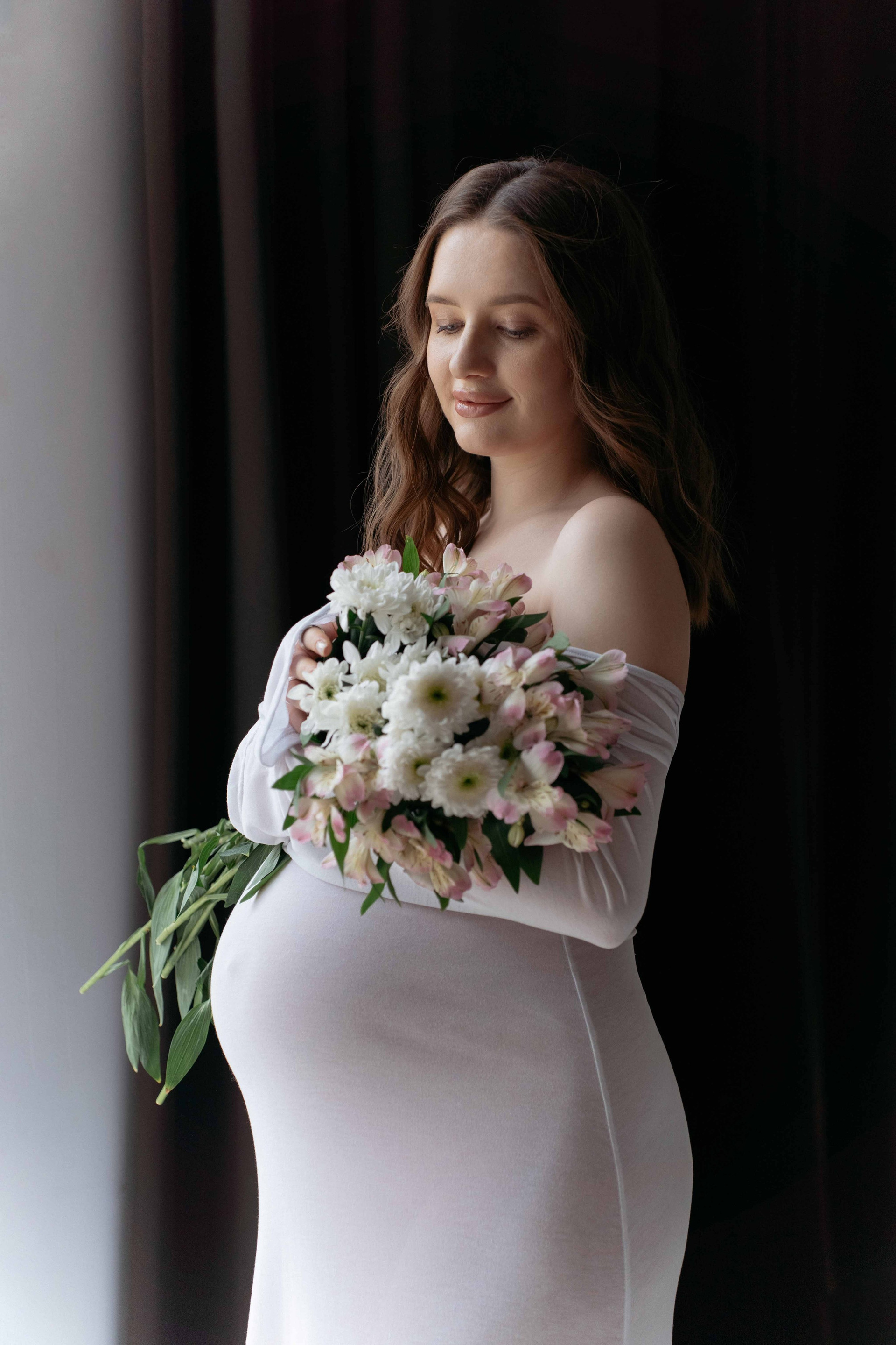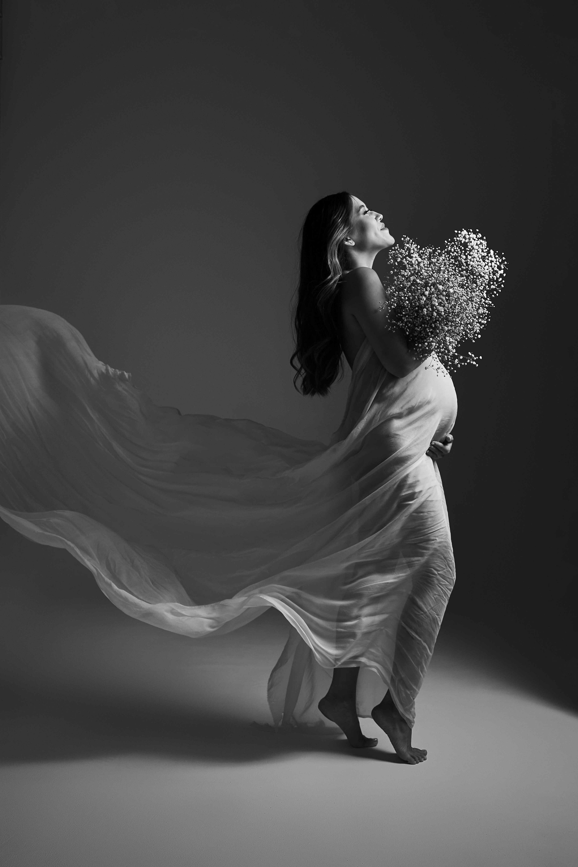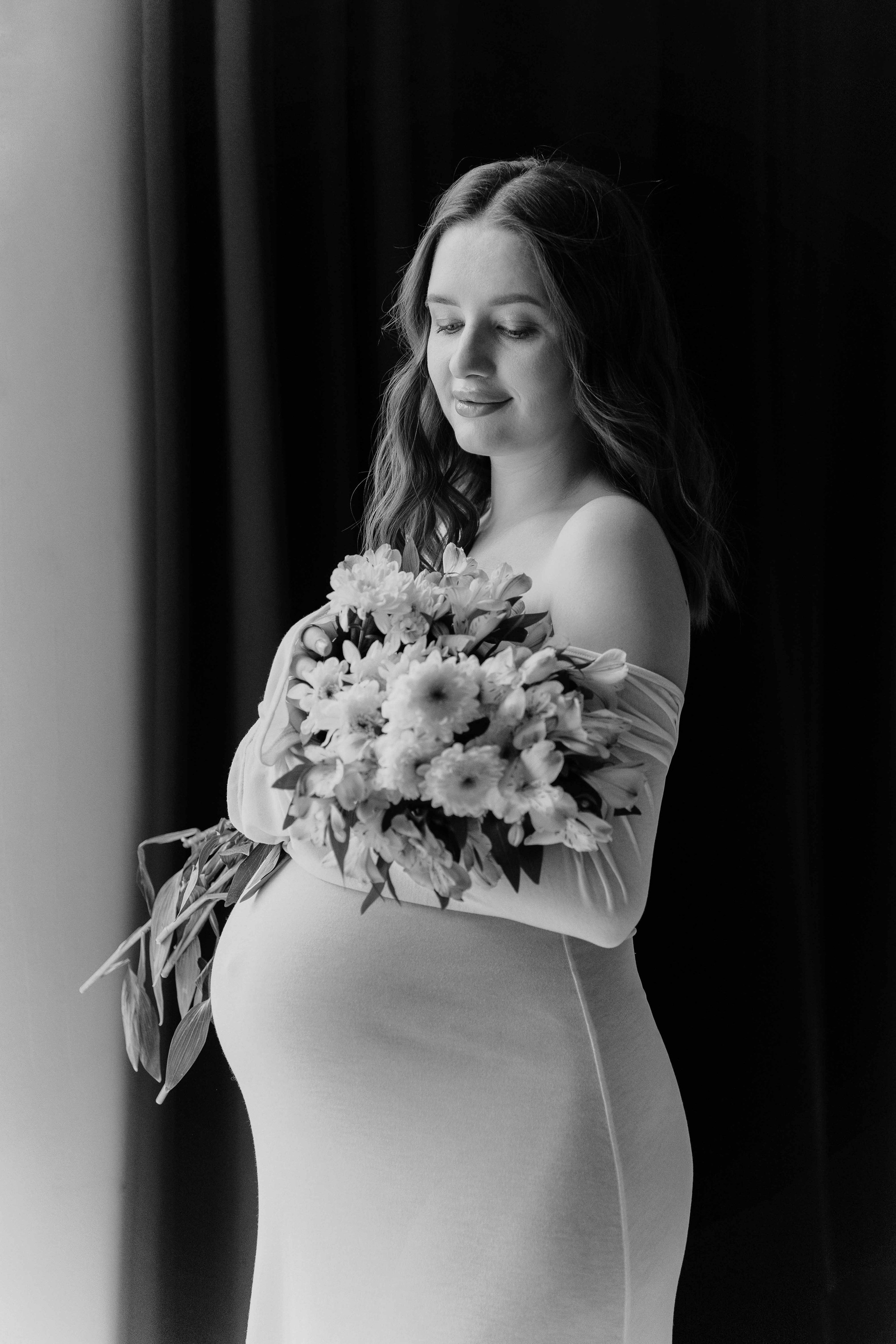 Чёрная ткань красиво подчёркивает беременный животик, создавая выразительный и очень эстетичный визуал. В сочетании с цветами в кадре получаются по-настоящему впечатляющие фотографии — именно те снимки, которые хочется печатать в большом формате и украшать ими интерьер своего дома.