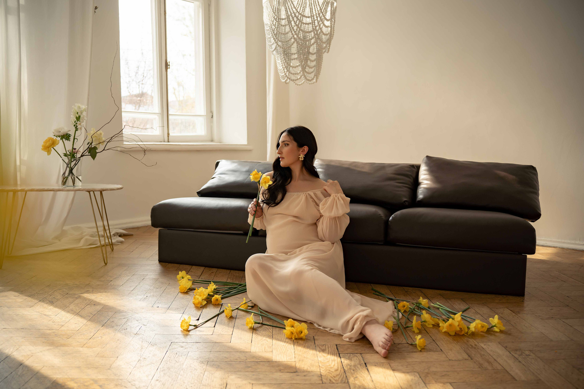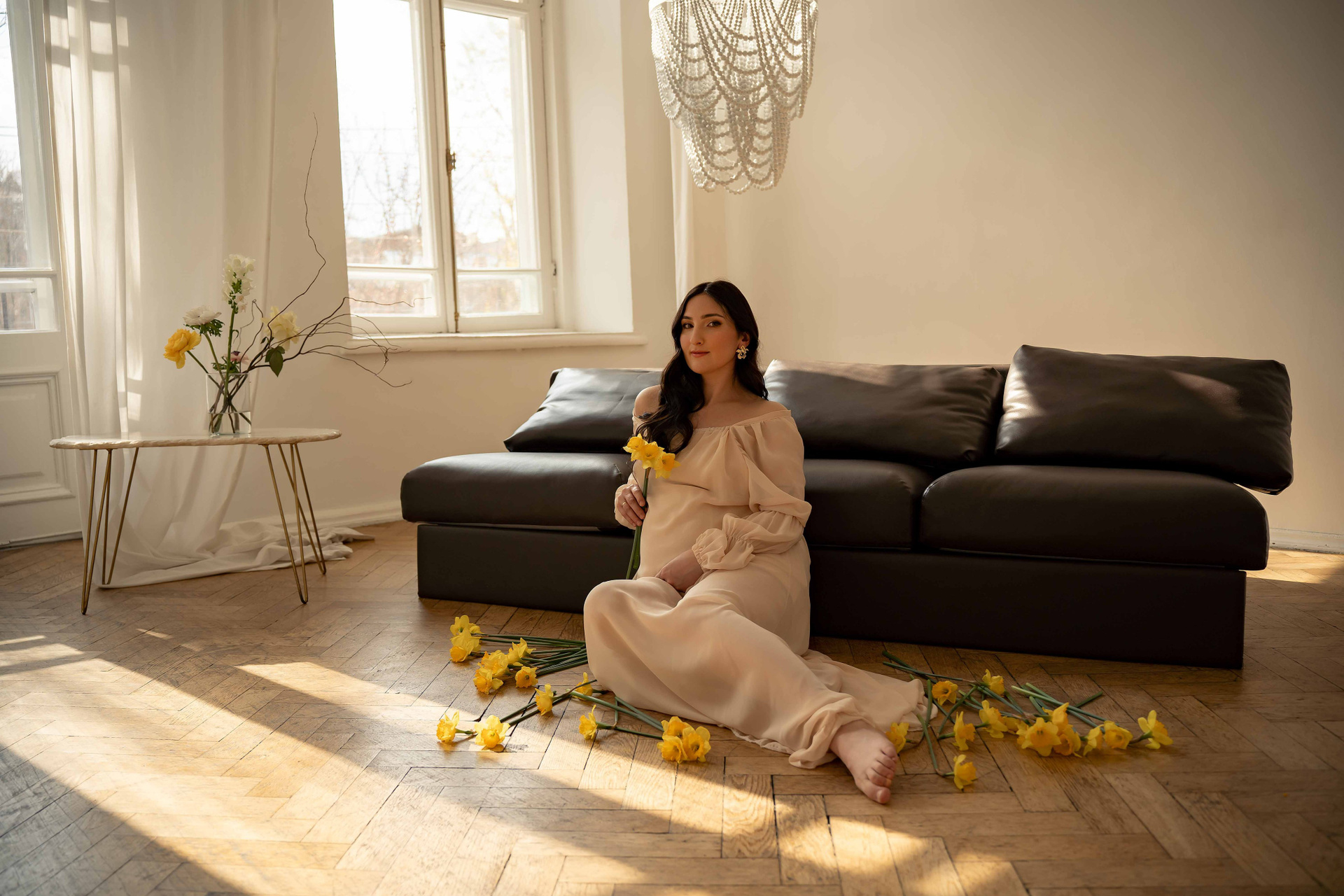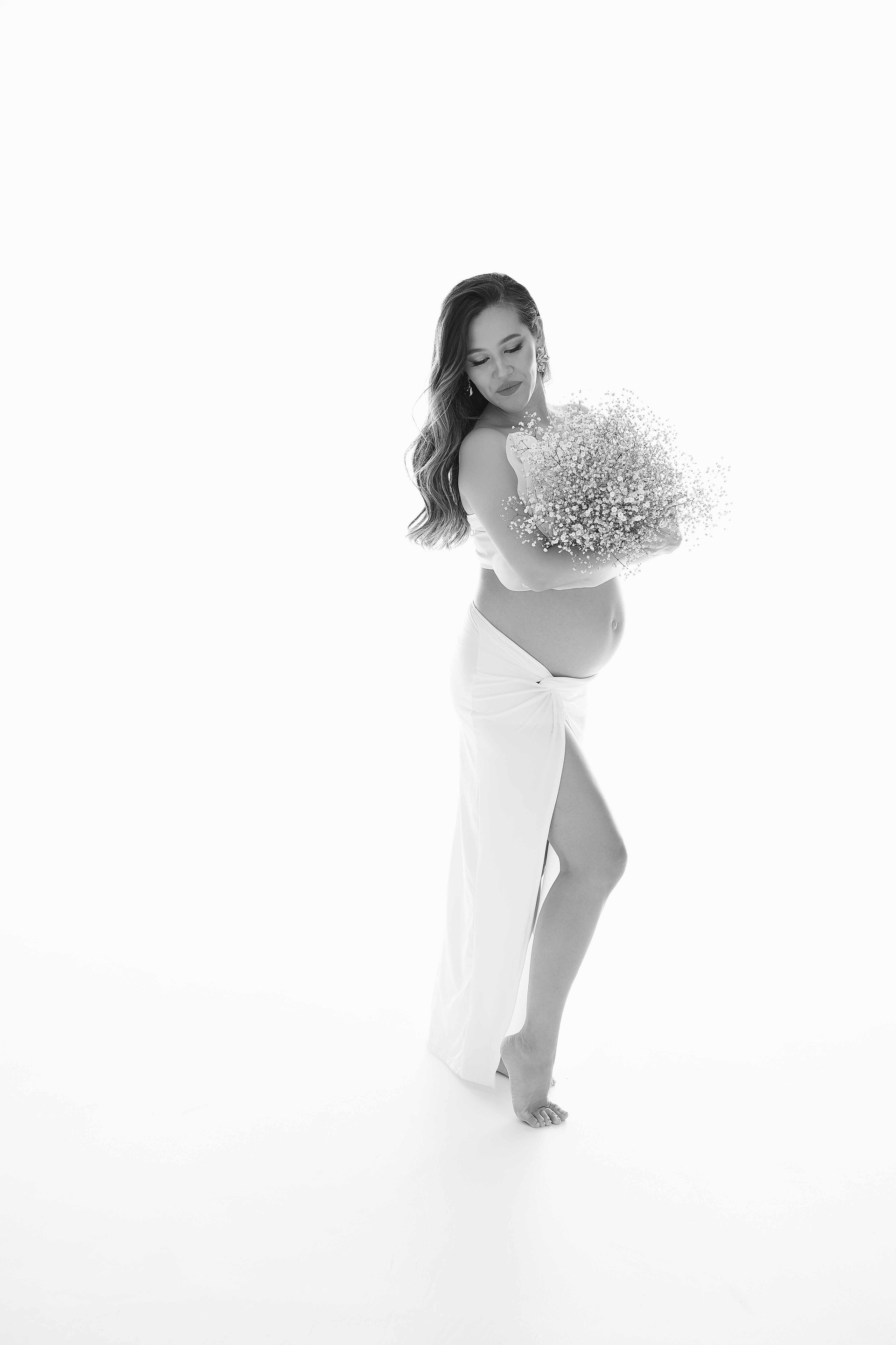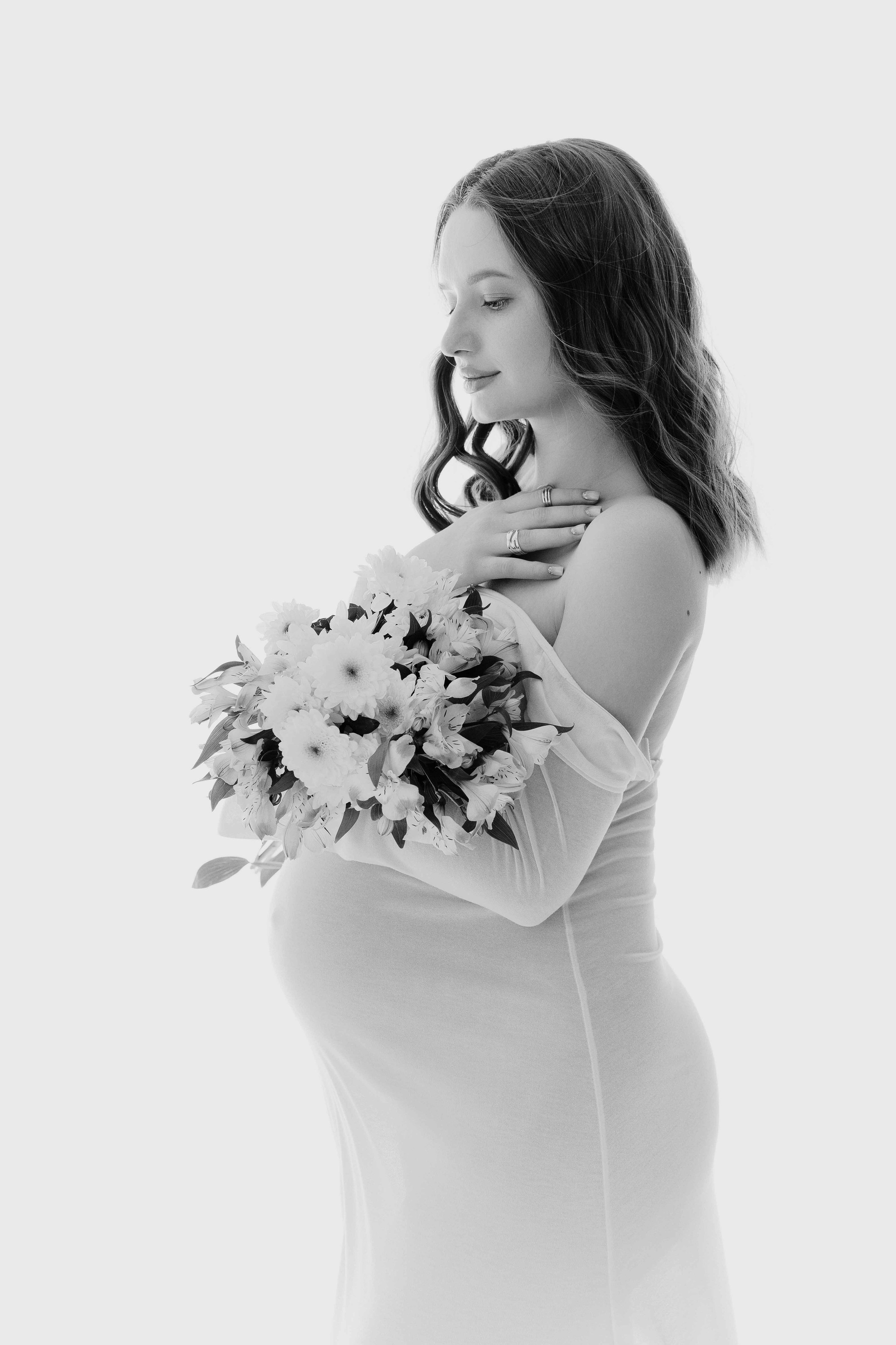 Чёрная ткань красиво подчёркивает беременный животик, создавая выразительный и очень эстетичный визуал. В сочетании с цветами в кадре получаются по-настоящему впечатляющие фотографии — именно те снимки, которые хочется печатать в большом формате и украшать ими интерьер своего дома.