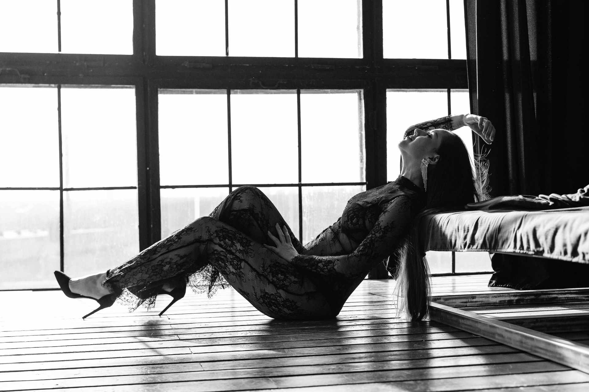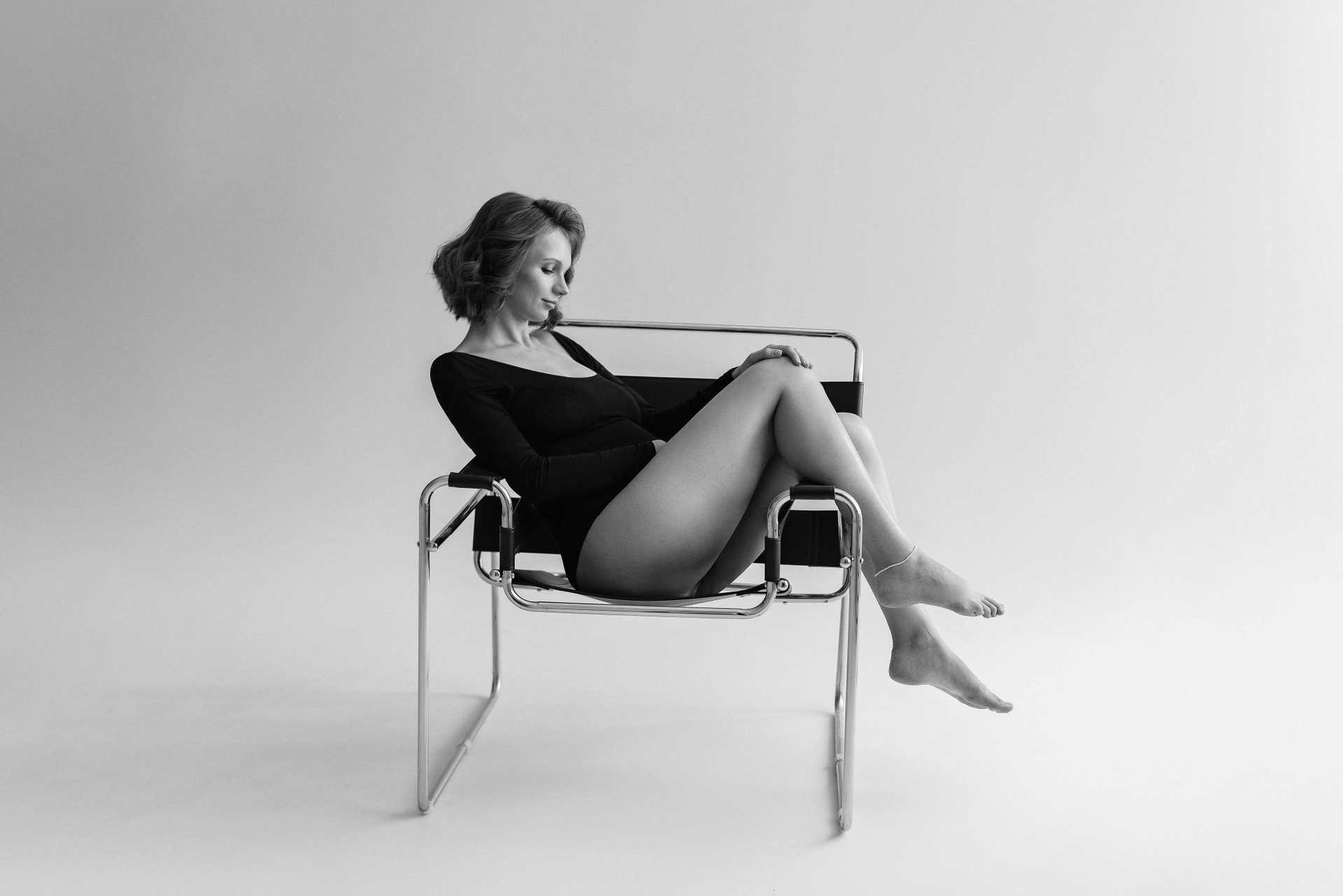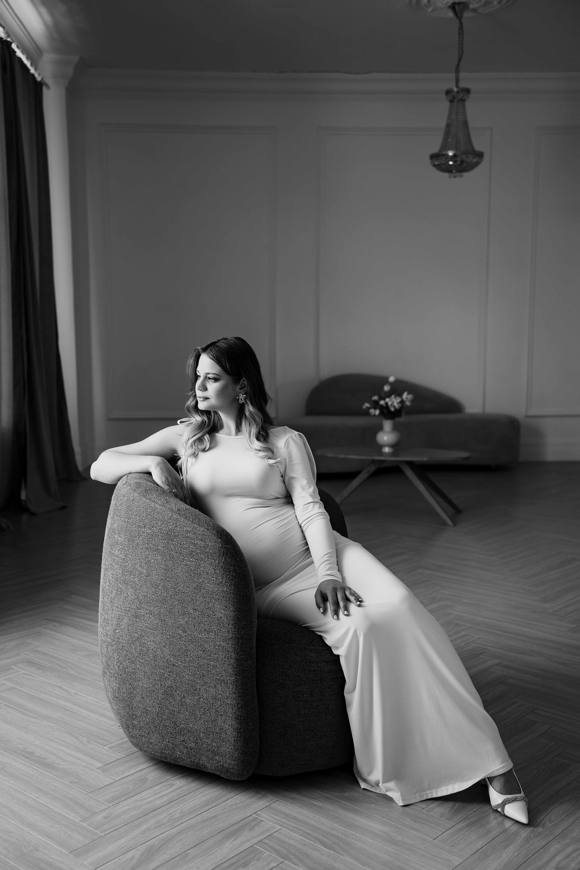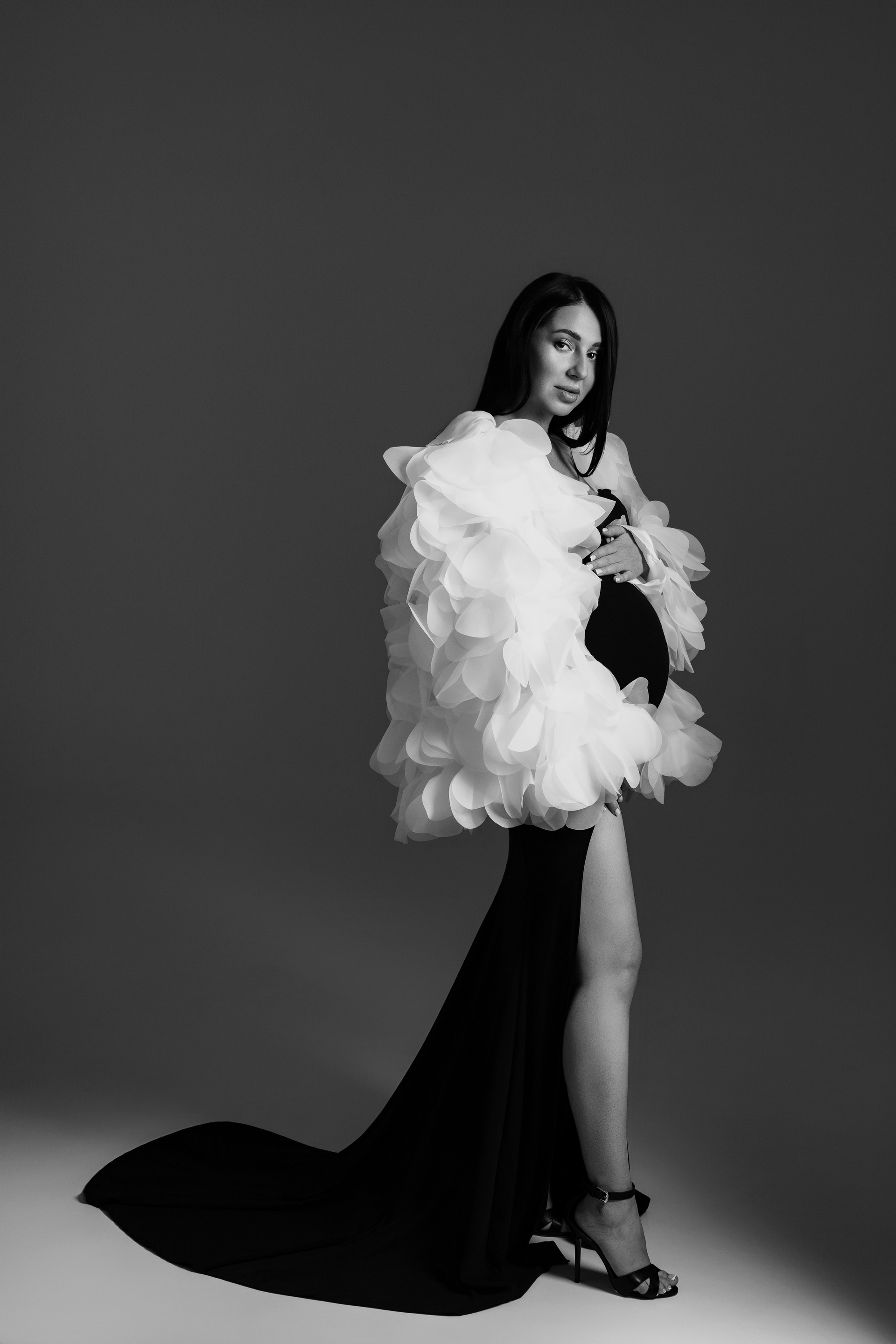 Модель отлично смотрится на девушках 42–46 размера и позволяет создавать стильные, выразительные кадры. Образ можно дополнить колготками с узором или в горошек, чёрными трусиками для беременного животика и обувью на каблуке — так съёмка получается особенно акцентной и интересной.